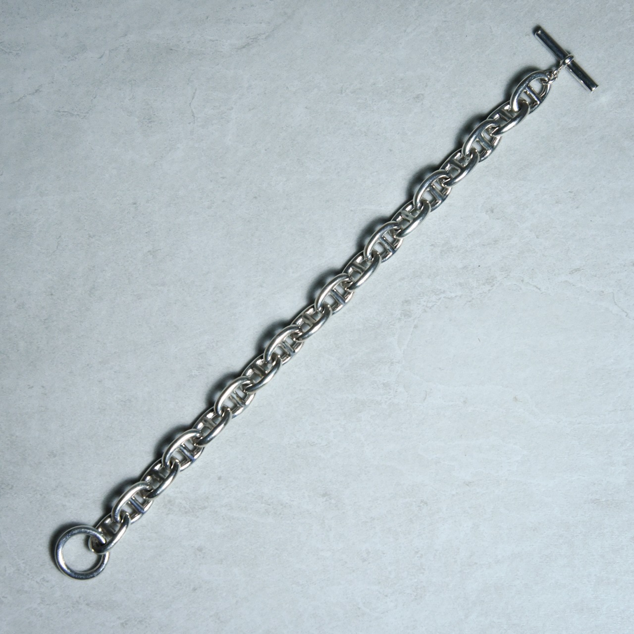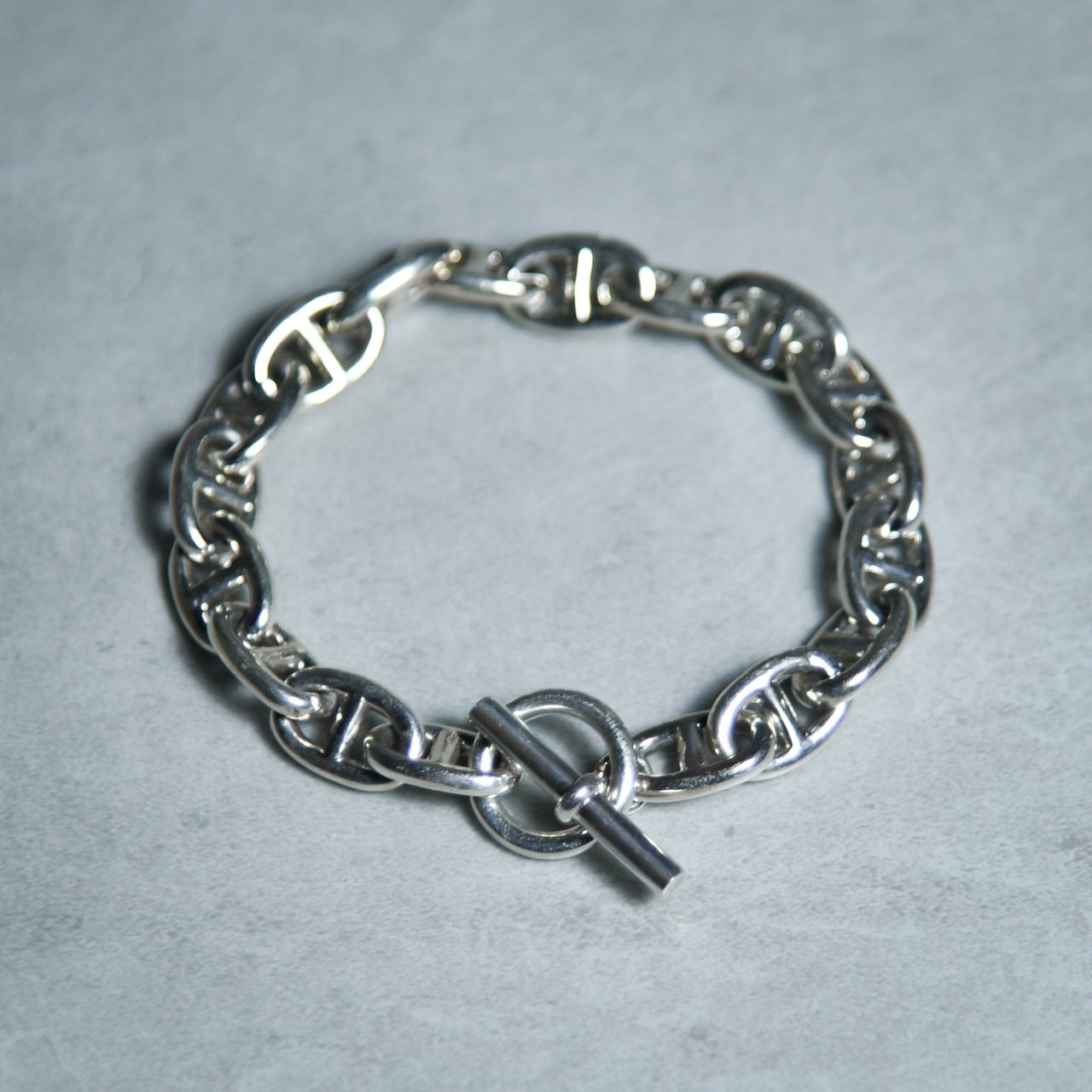アンカーチェーンをオーバルのコマで連結したデザイン性の高いブレスレット。