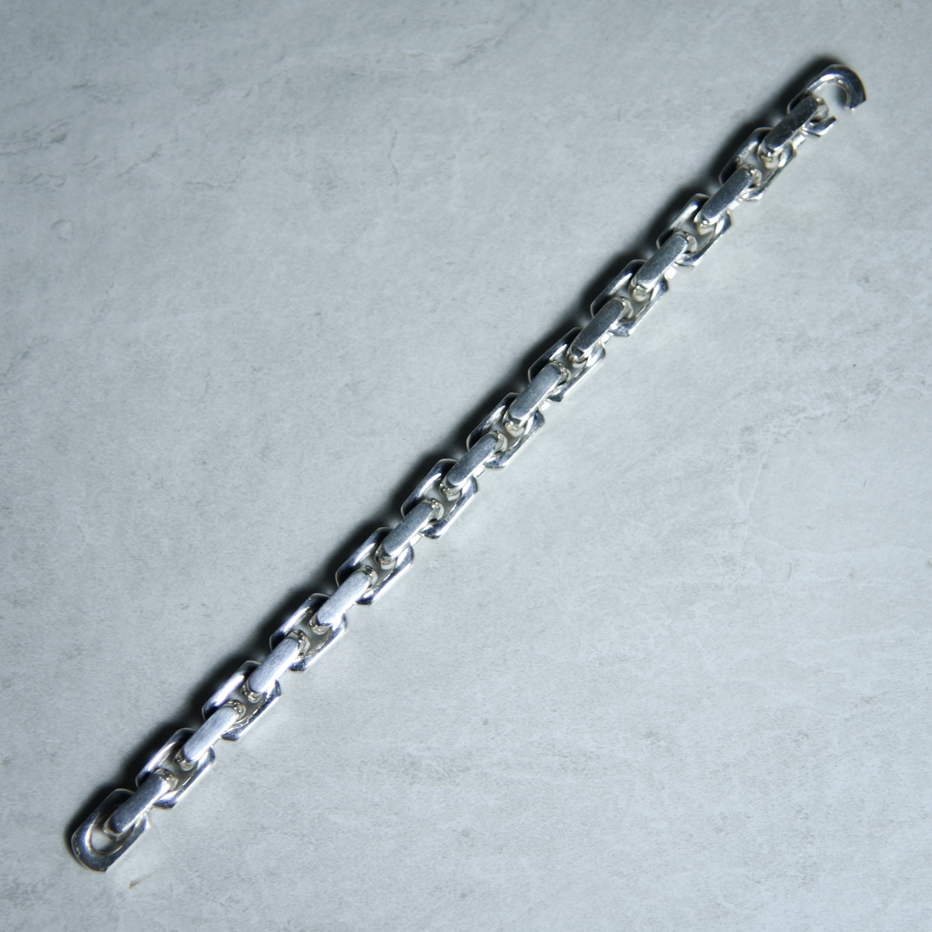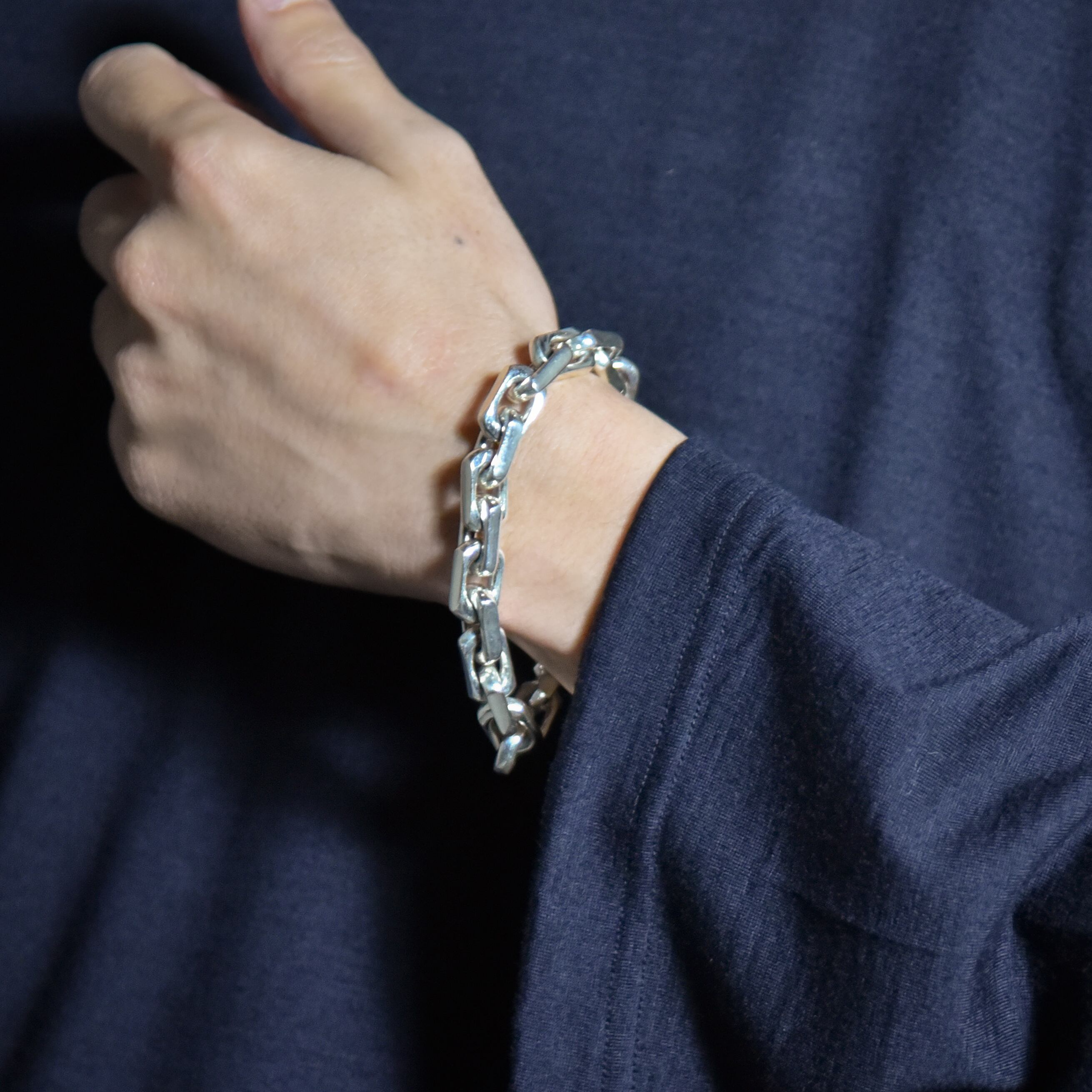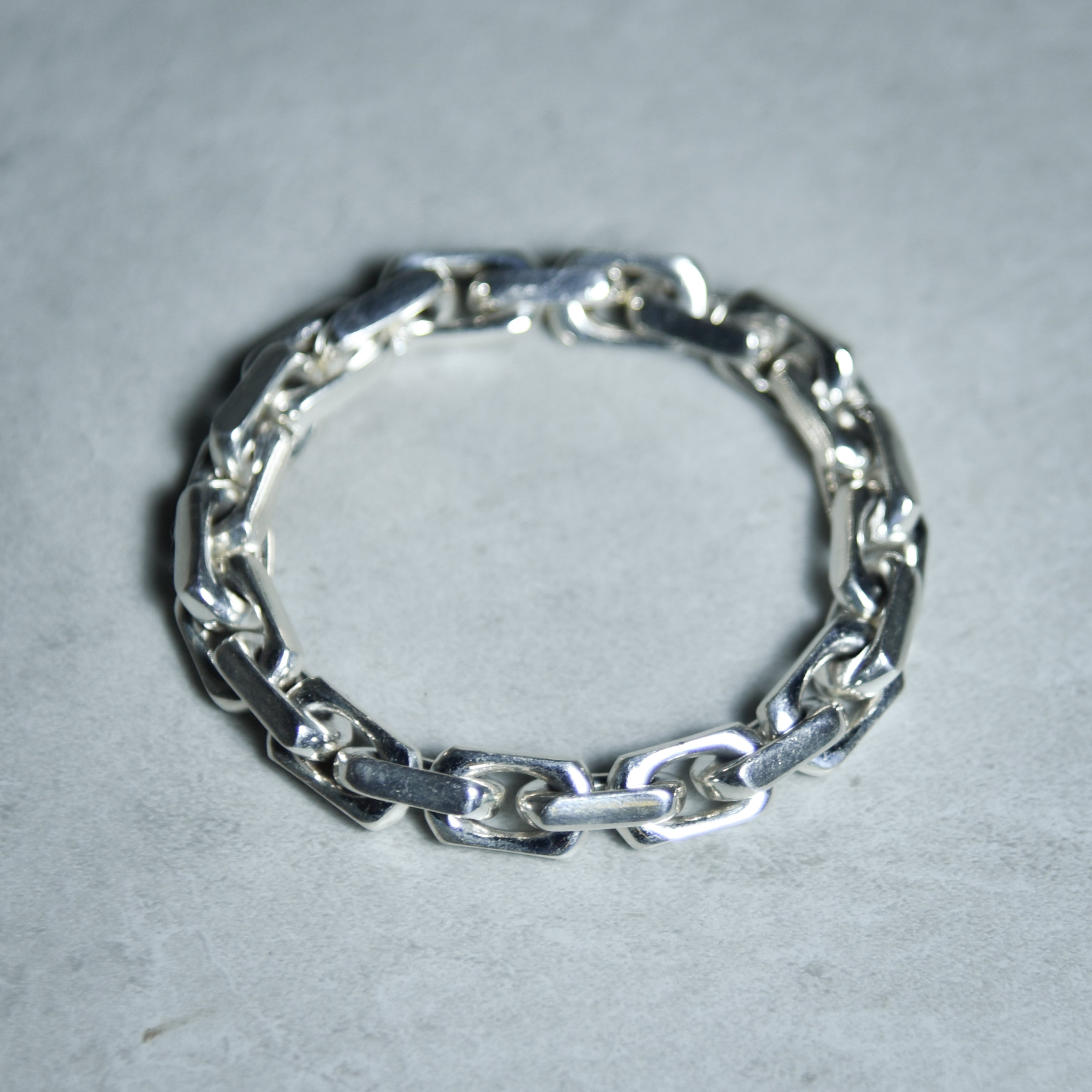 一部が平面になっている重量感のあるオーバルリングから構成されるデザインは力強さと流れるような美しさのあるブレスレットです。