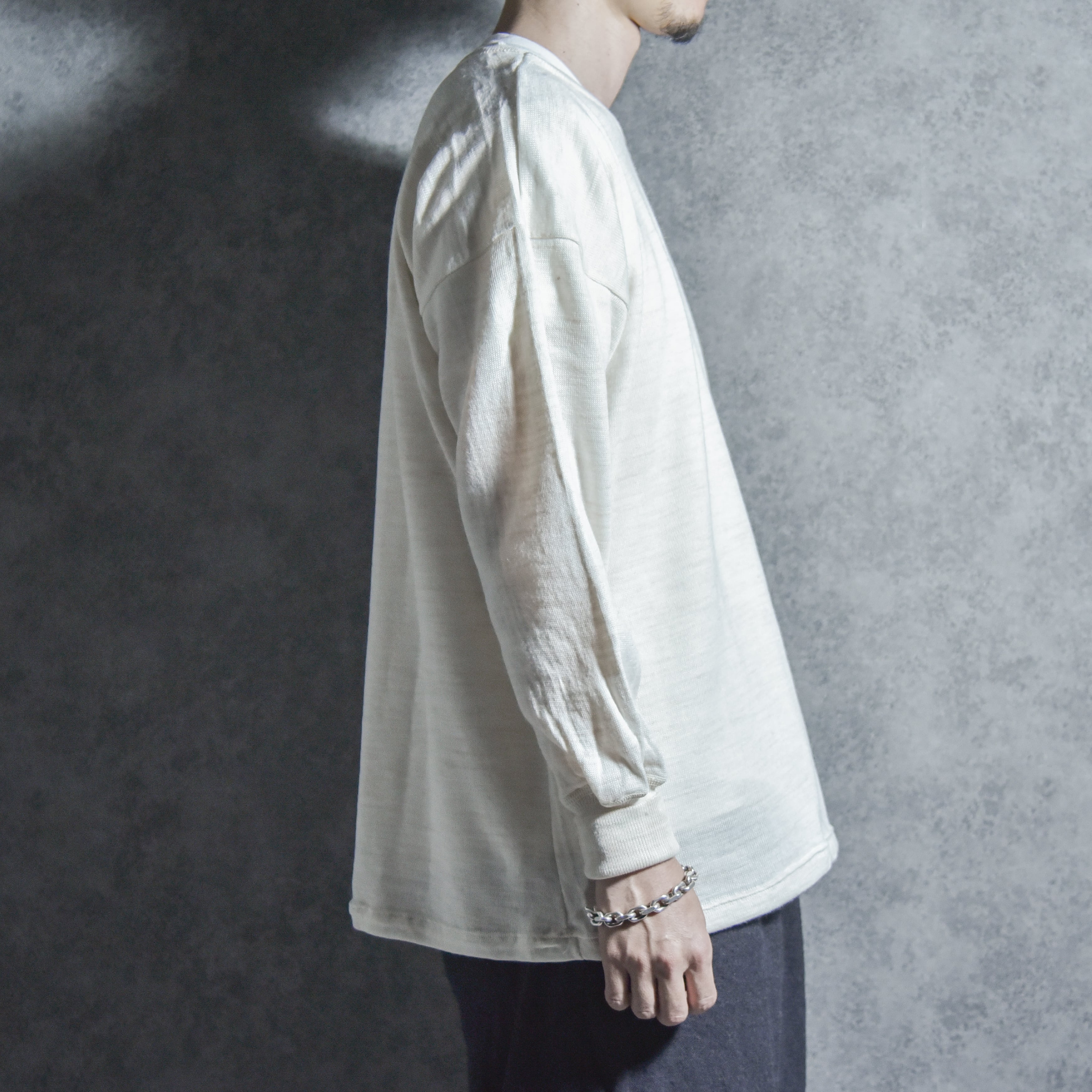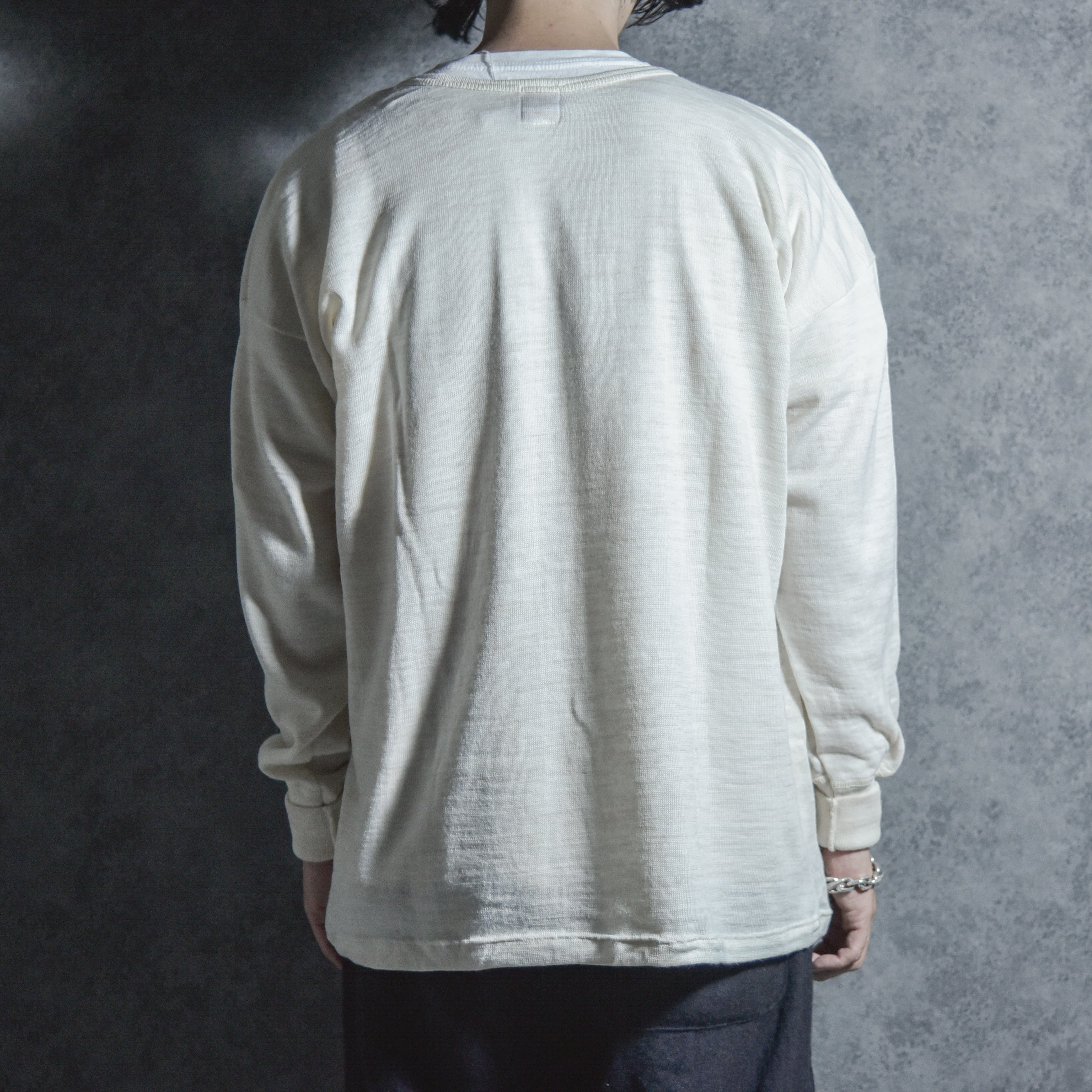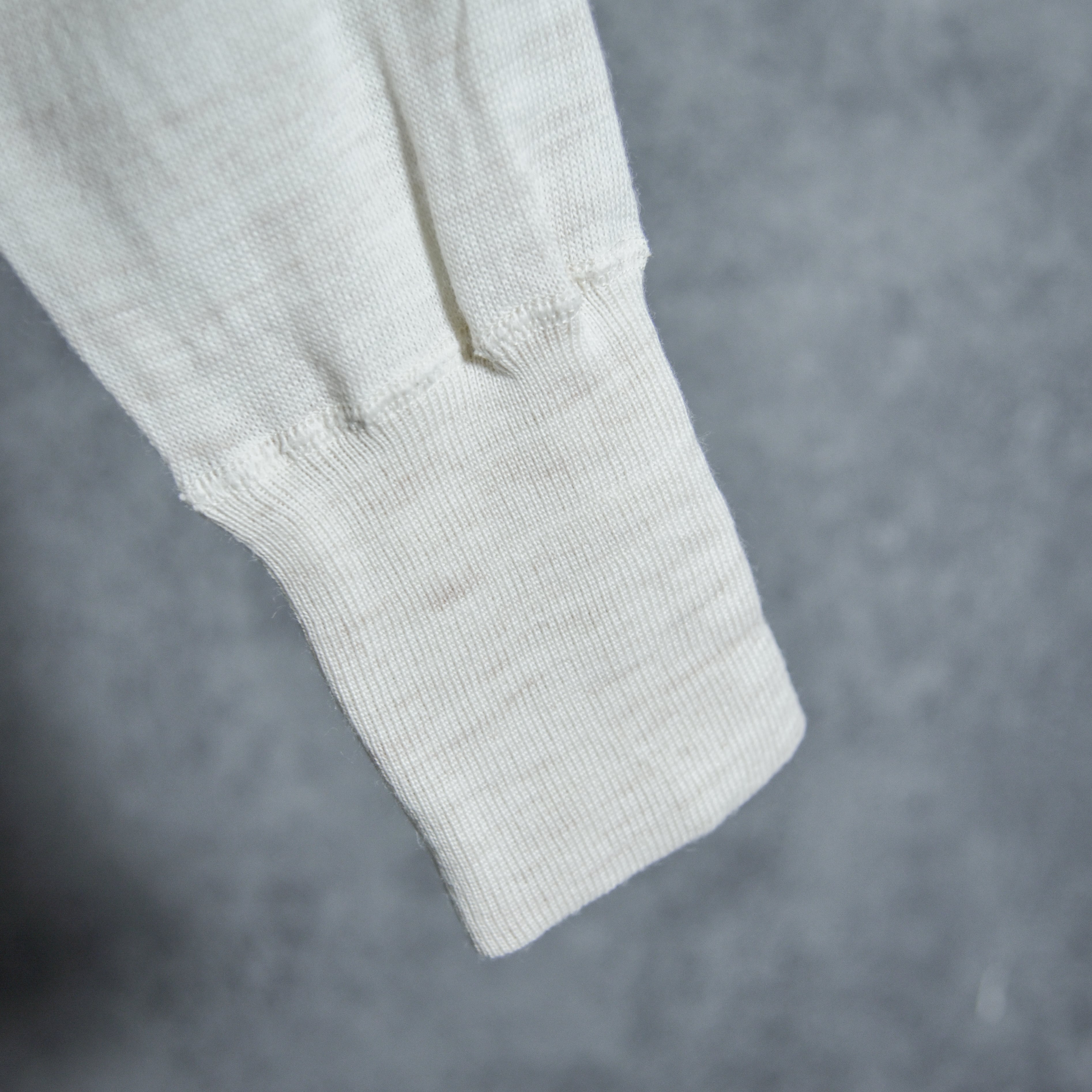 ディテールは非常にシンプルですが、細幅のバインダーネックや、やや長めの袖口のリブなど、ヴィンテージならではの雰囲気があります。
