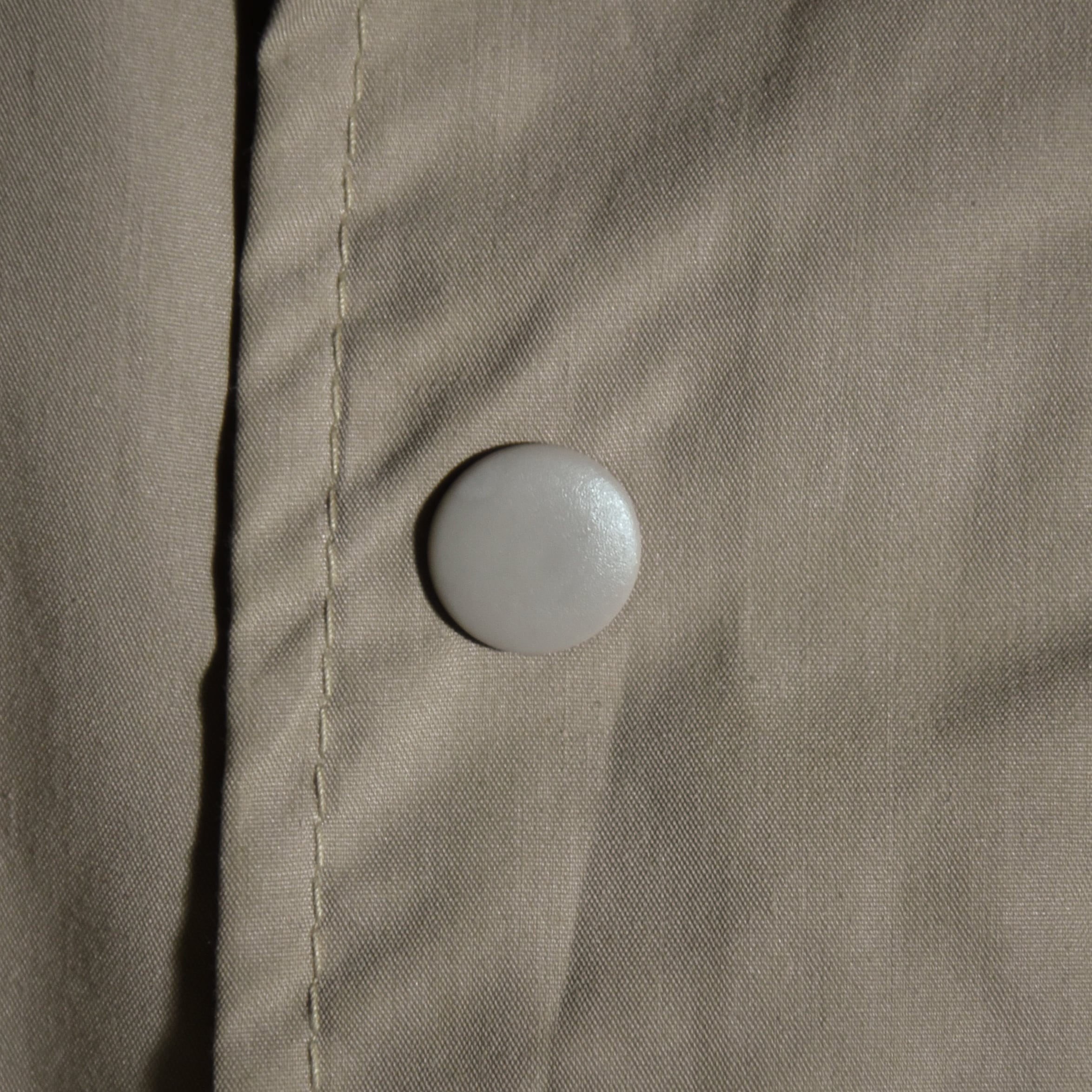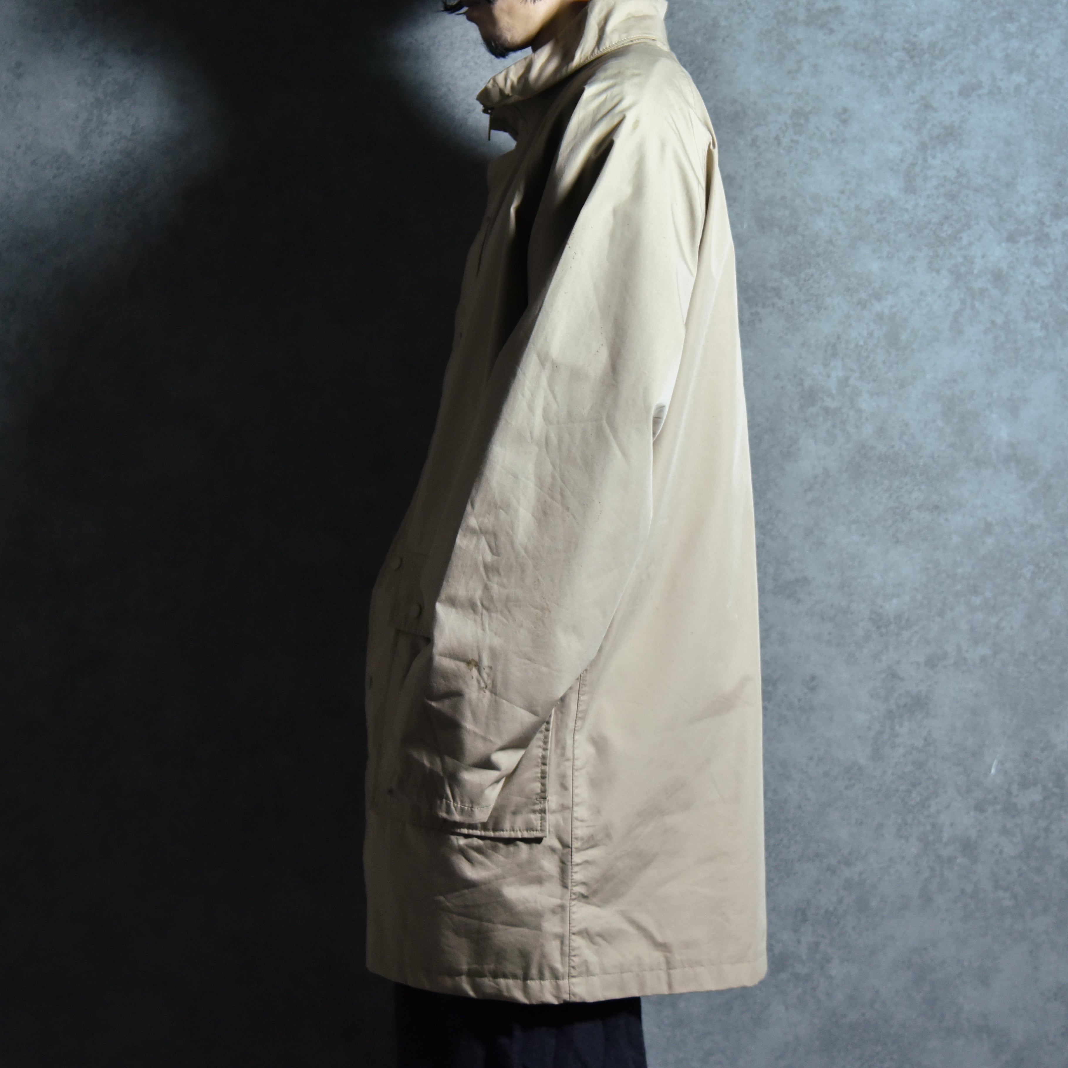 ラグランスリーブの袖付はいわゆる一枚袖の仕様となっており、着用時の肩の収まりが良く綺麗なシルエット、コットン混紡のポリエステル素材は60/40クロスよりはポリエステル混率が高く滑らかな素材感でバルマカーンコートをギアにしたような印象のアイテム。