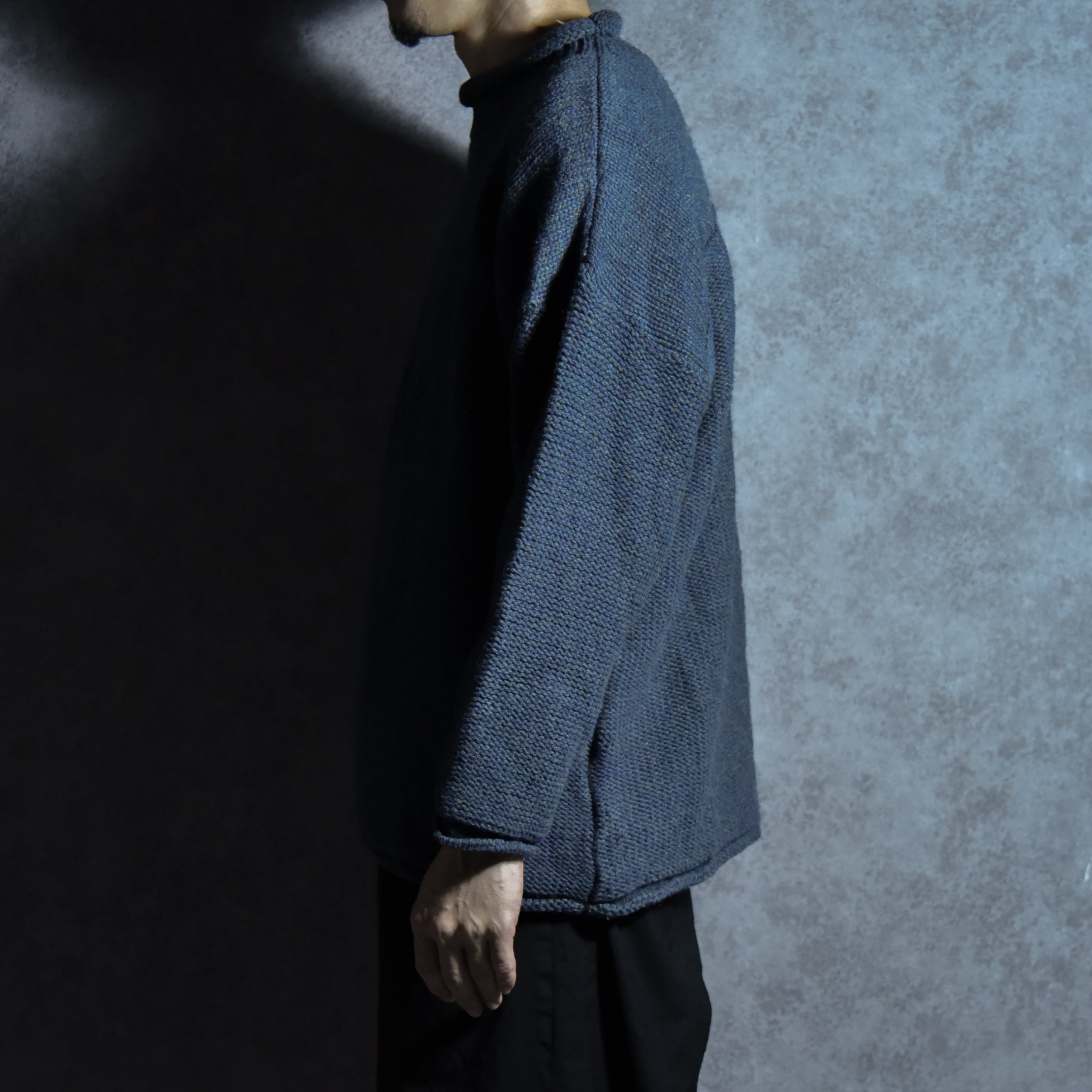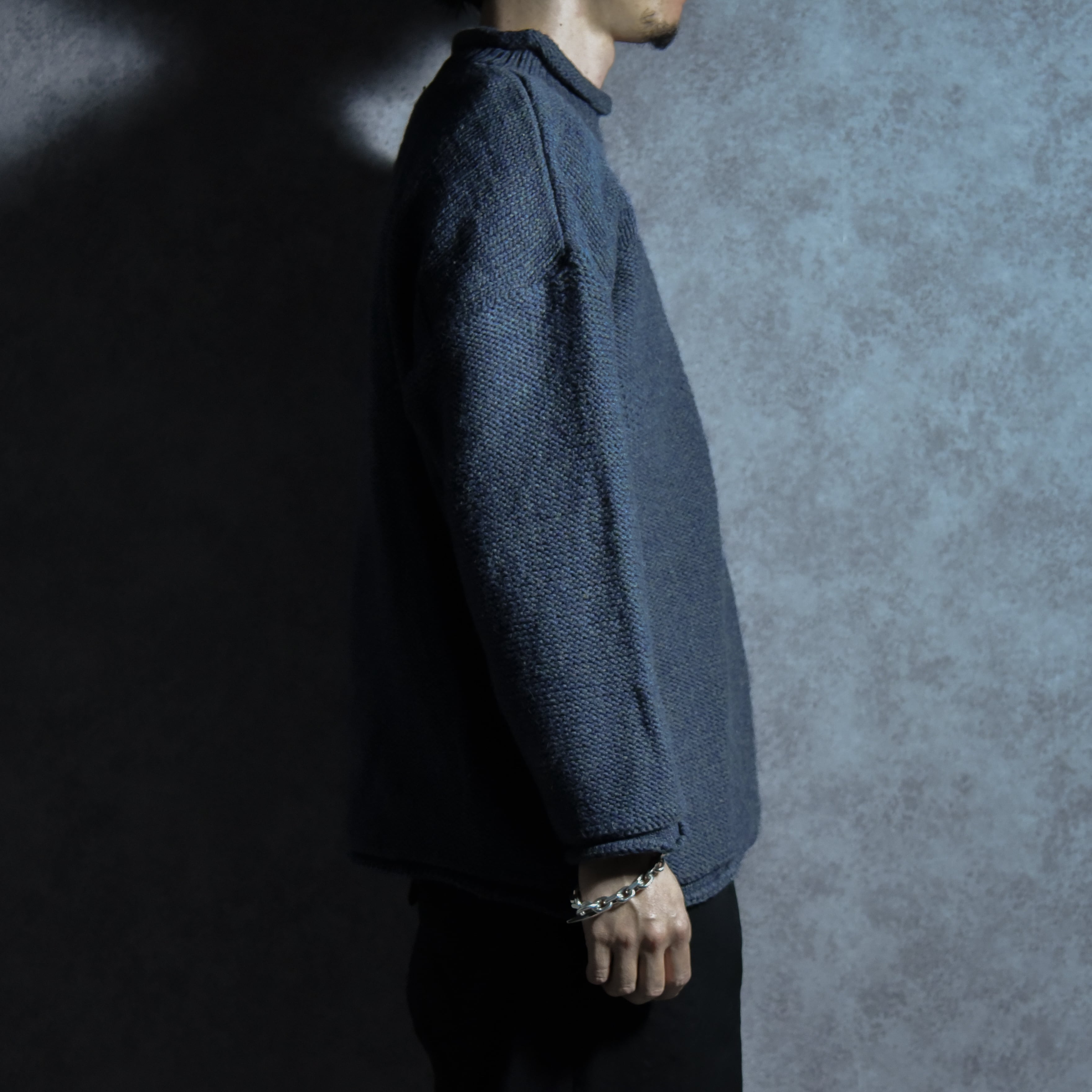 首元はリブから編み地を切り替えて自然と巻かれたロールネックという仕様で、袖口と裾も同様にロールさせたオーセンティックかつキャッチーなディテールに。