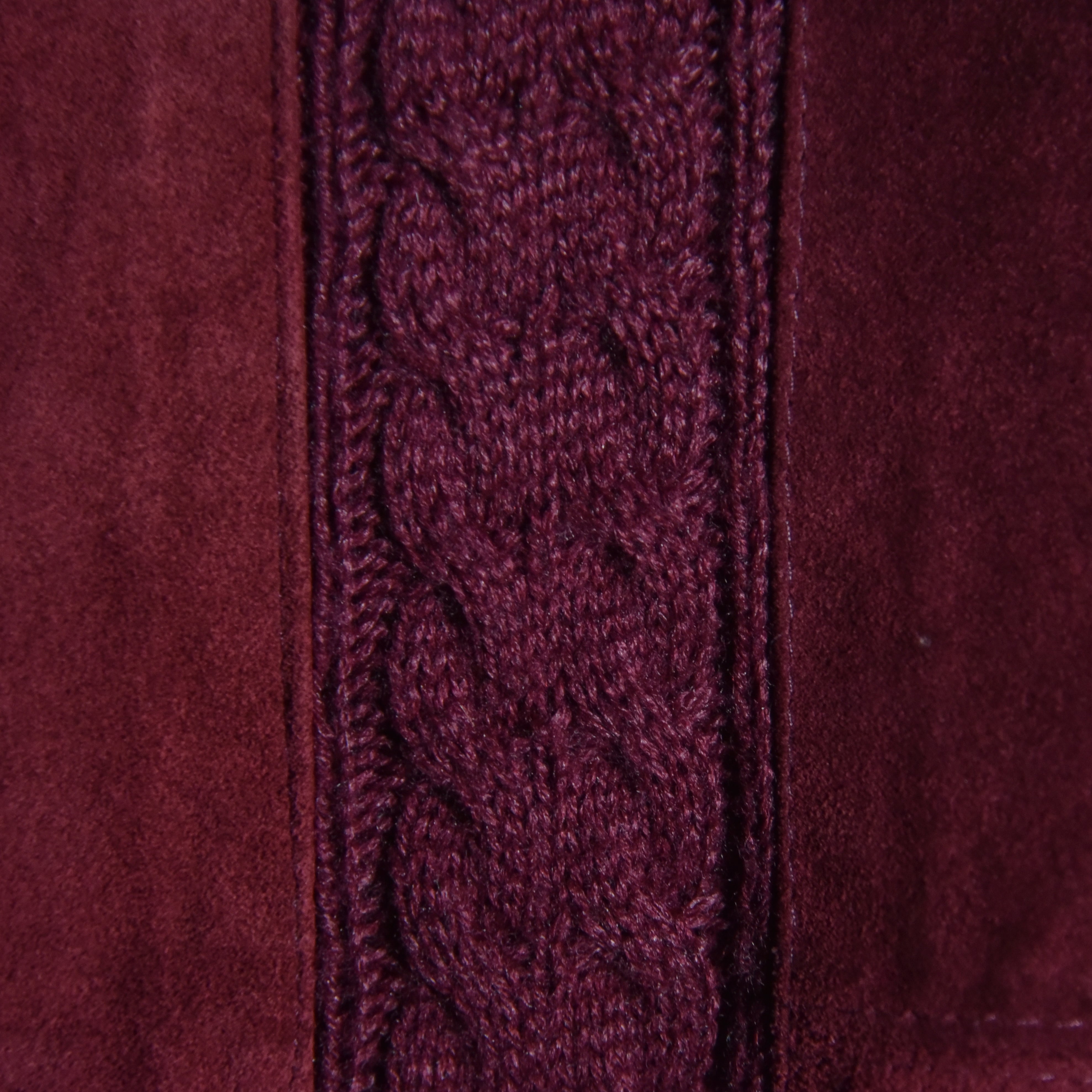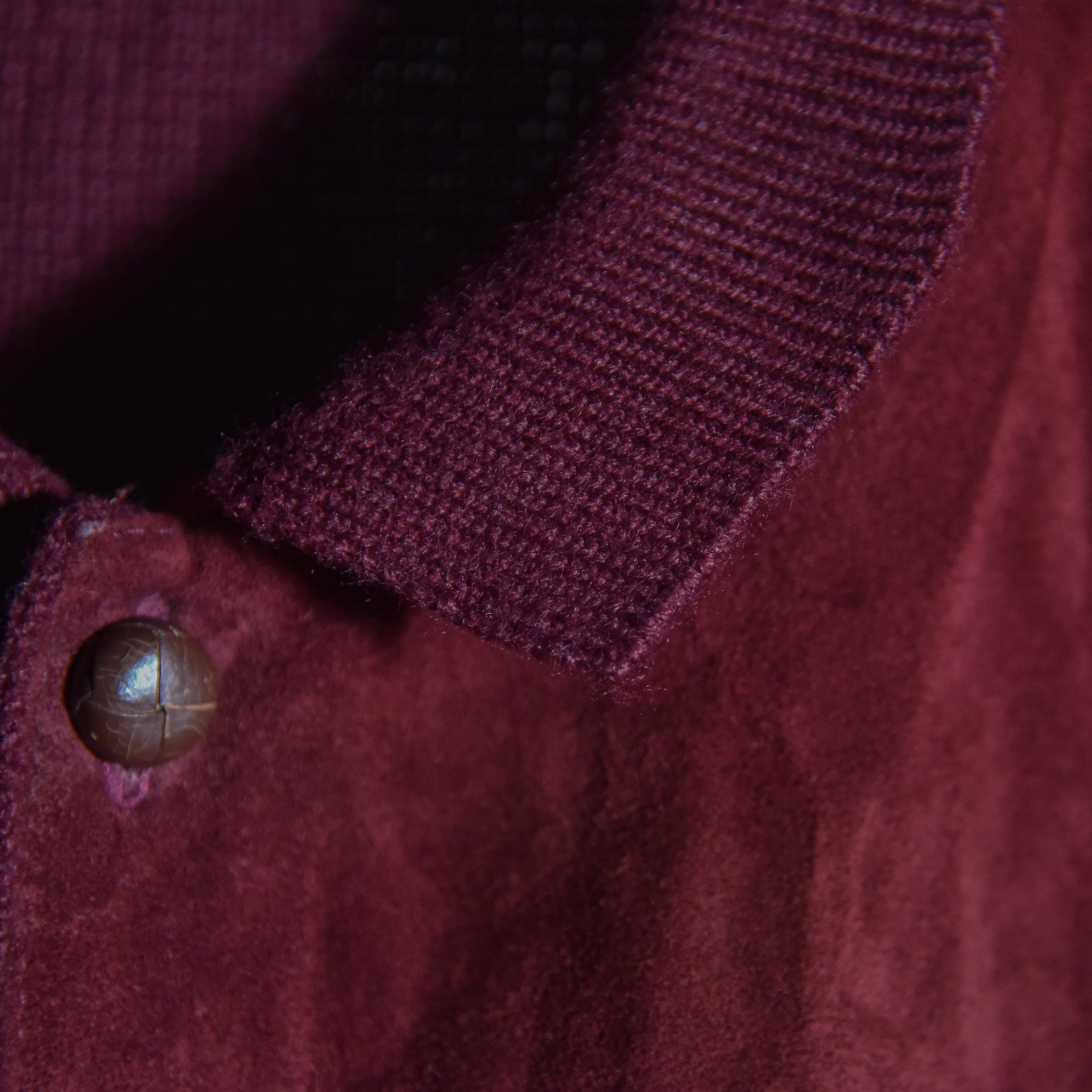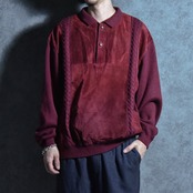レザーとウールニットを切り替えたポロ型のセーターで、レザー部分は柔らかさのある上質なスエード、ニット部分はおそらくウールかウールアクリルで、天竺、リブ、ケーブル編みを駆使した、イタリアらしいセンスの光る非常に凝った作りに。