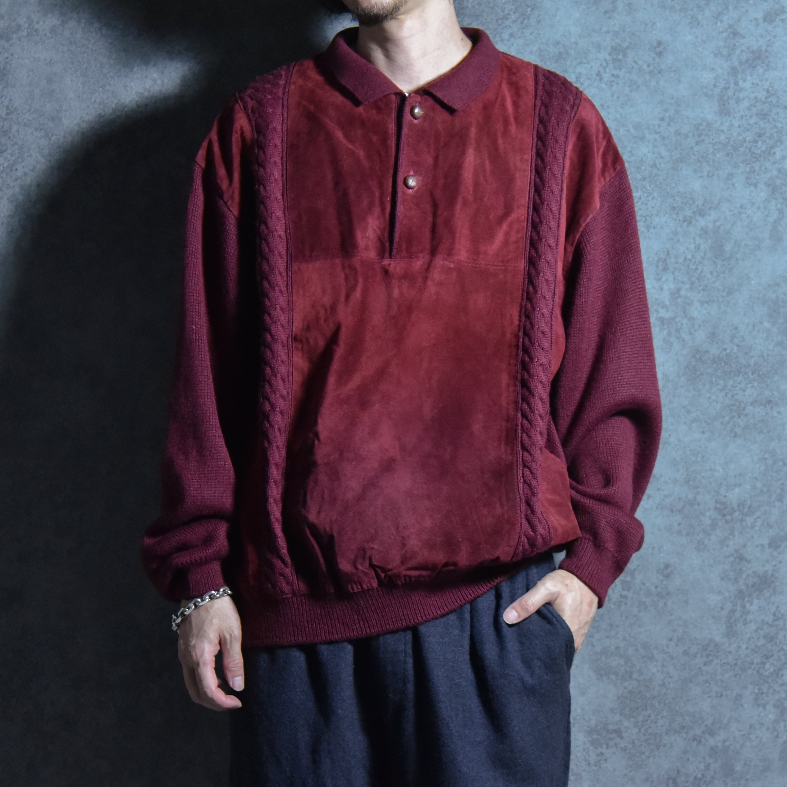 Italia Leather Wool Knit Polo Shirts イタリア製 レザー×ウール 切り替え ニット ポロシャツ 長袖