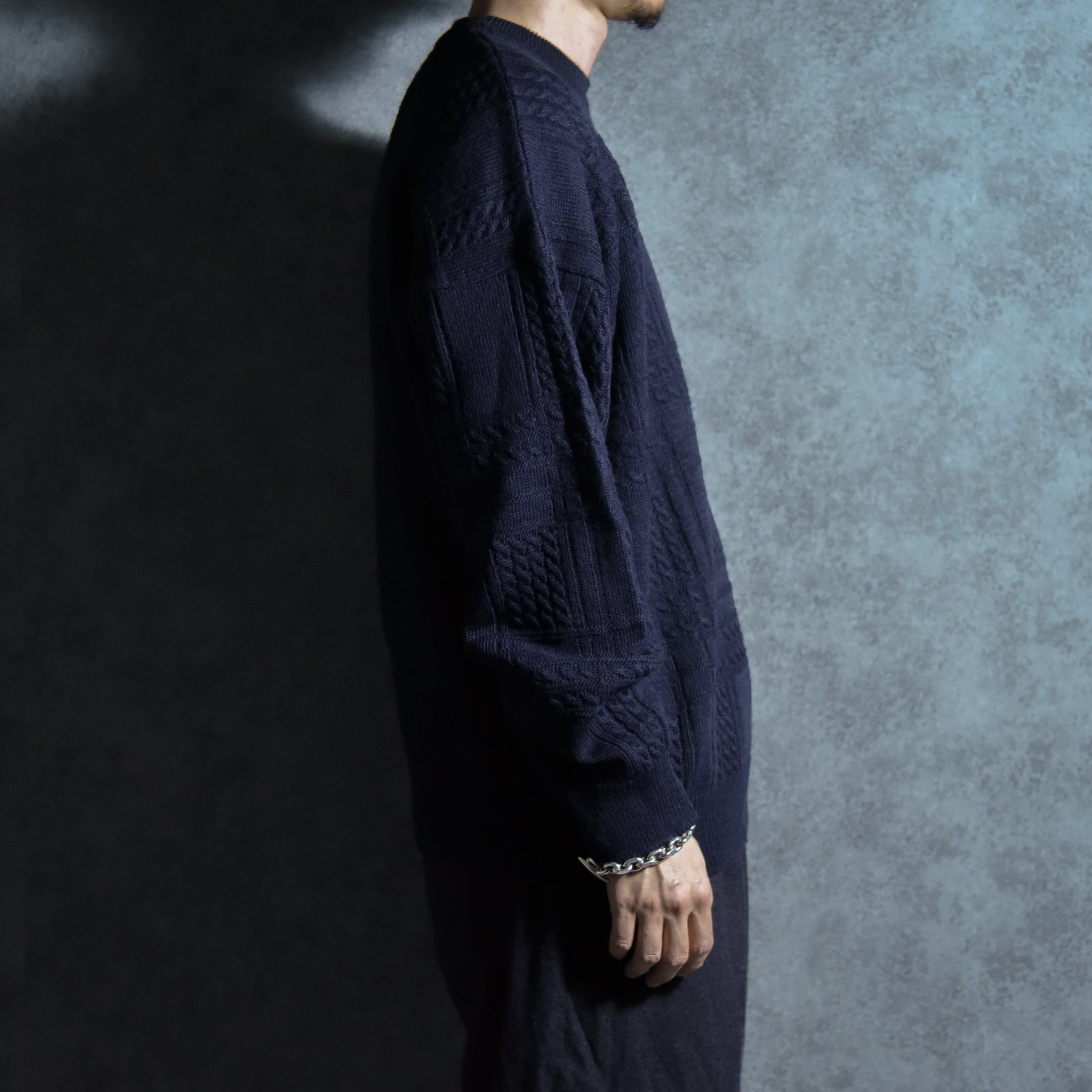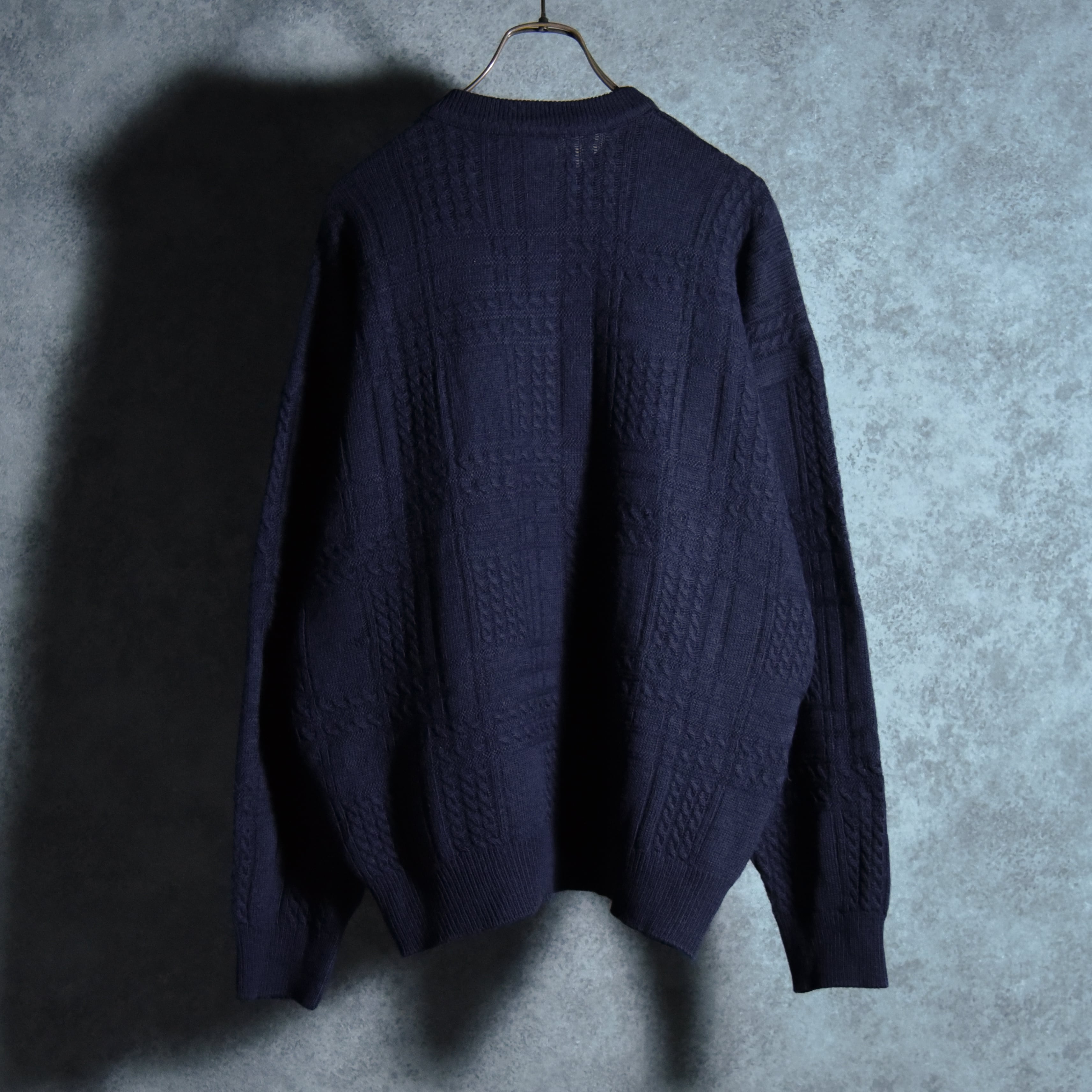ウィンドウペンとケーブルを組み合わせたようなセンスのいい編み地が特徴で、素材もウールとアクリルが約半分ずつ混紡されているため、ウールの温かみとアクリルの安定性を兼ね備えた実用的な組成の一着。