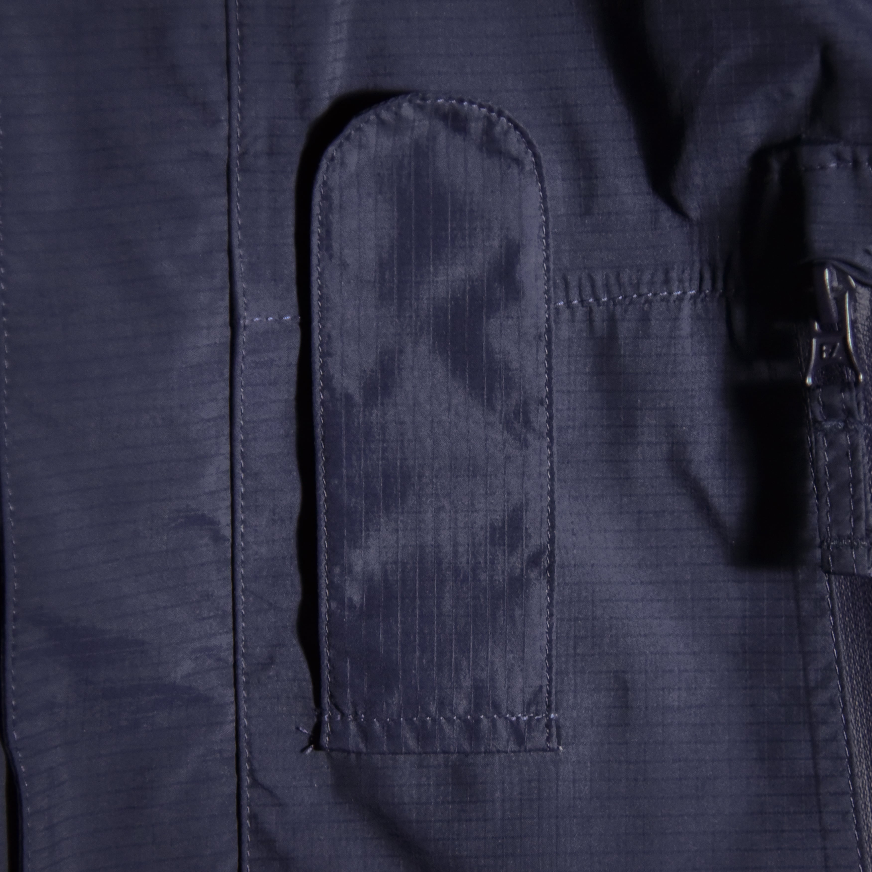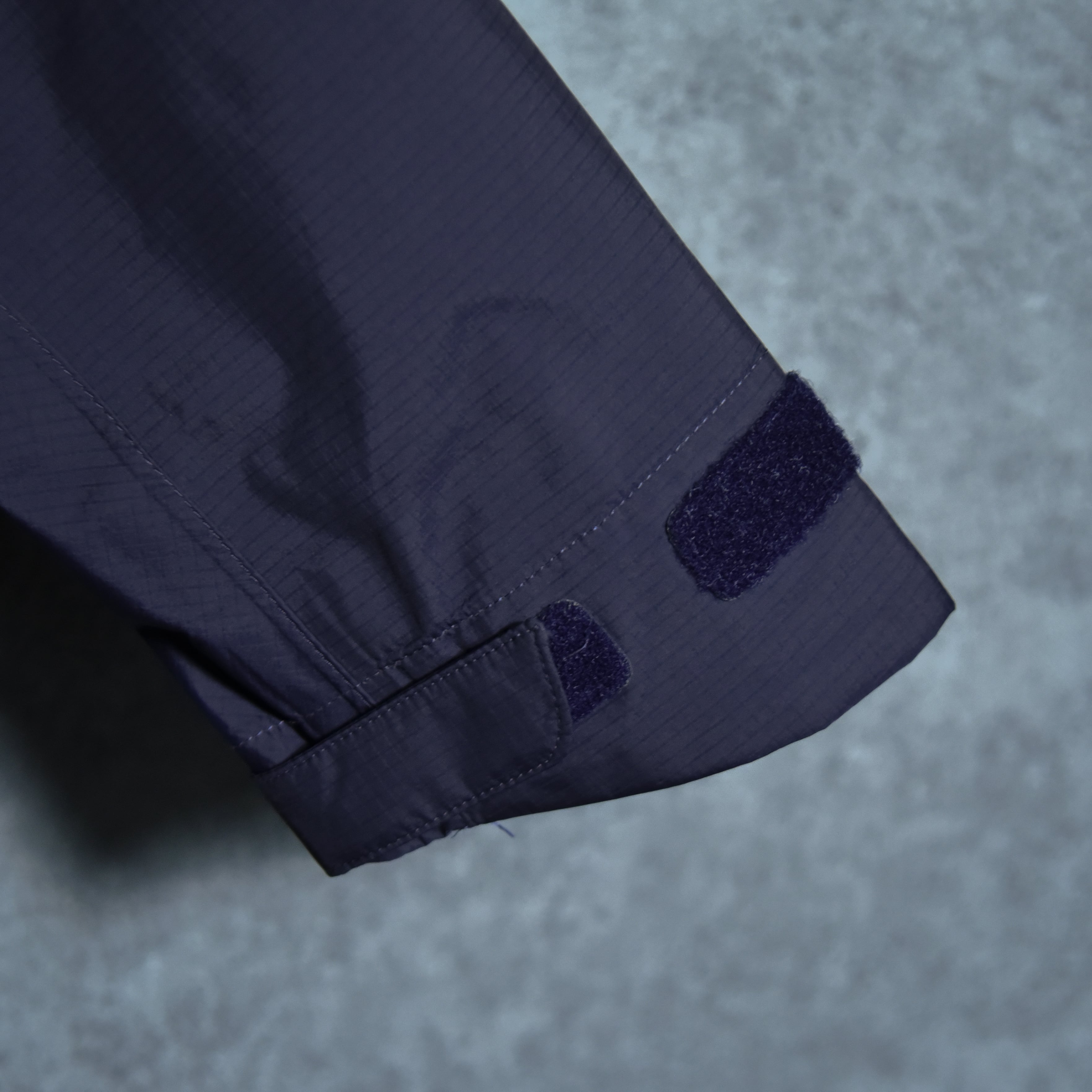 フロントとサイドポケット、袖のシガーポケット、そして脇下の通気を確保するベンチレーションには、全て防水性の高い止水ジップが使われており、フロントのウィンドガードや袖口のベルクロタブ、裾のエラスティックドローコードにより風雨を完全にシャットアウトしてくれます。