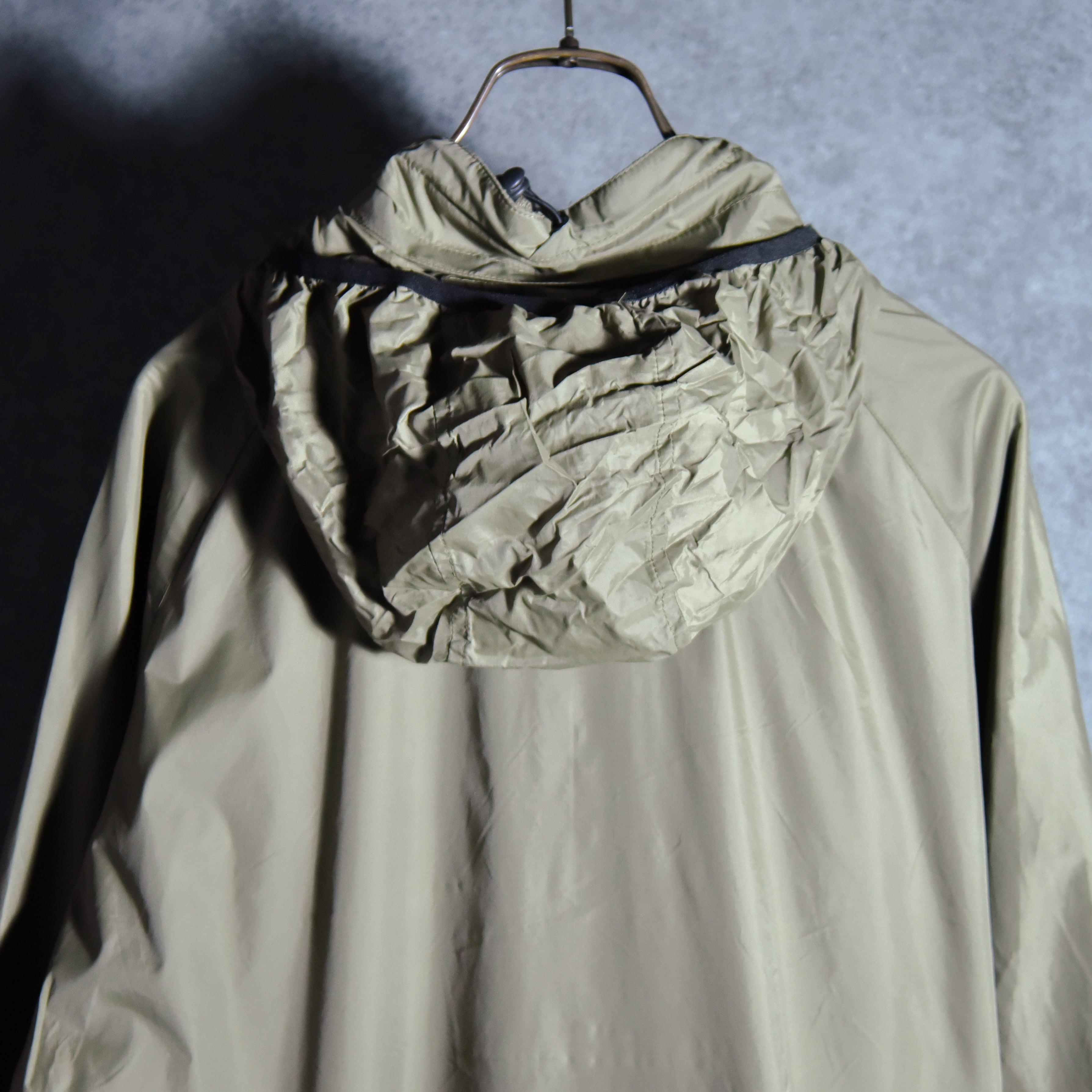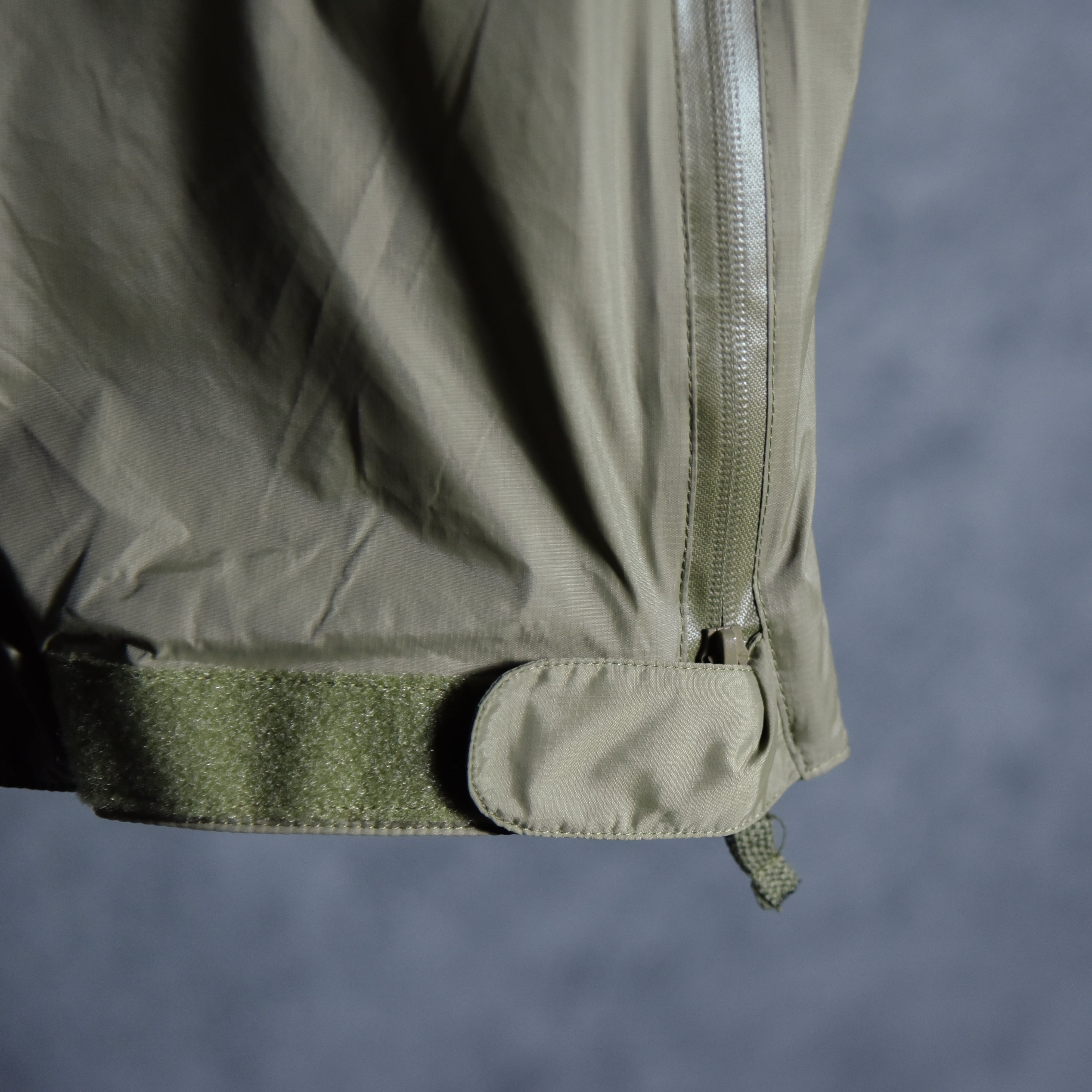 さらに裾や袖口はベルクロで締めることができ、袖は所謂一枚袖のラグランスリーブ、脇にはジップのベンチレーションがあり、襟に折り畳み収納できるフードが入っているなど、機能性を突き詰めたディテールフルな一着です。