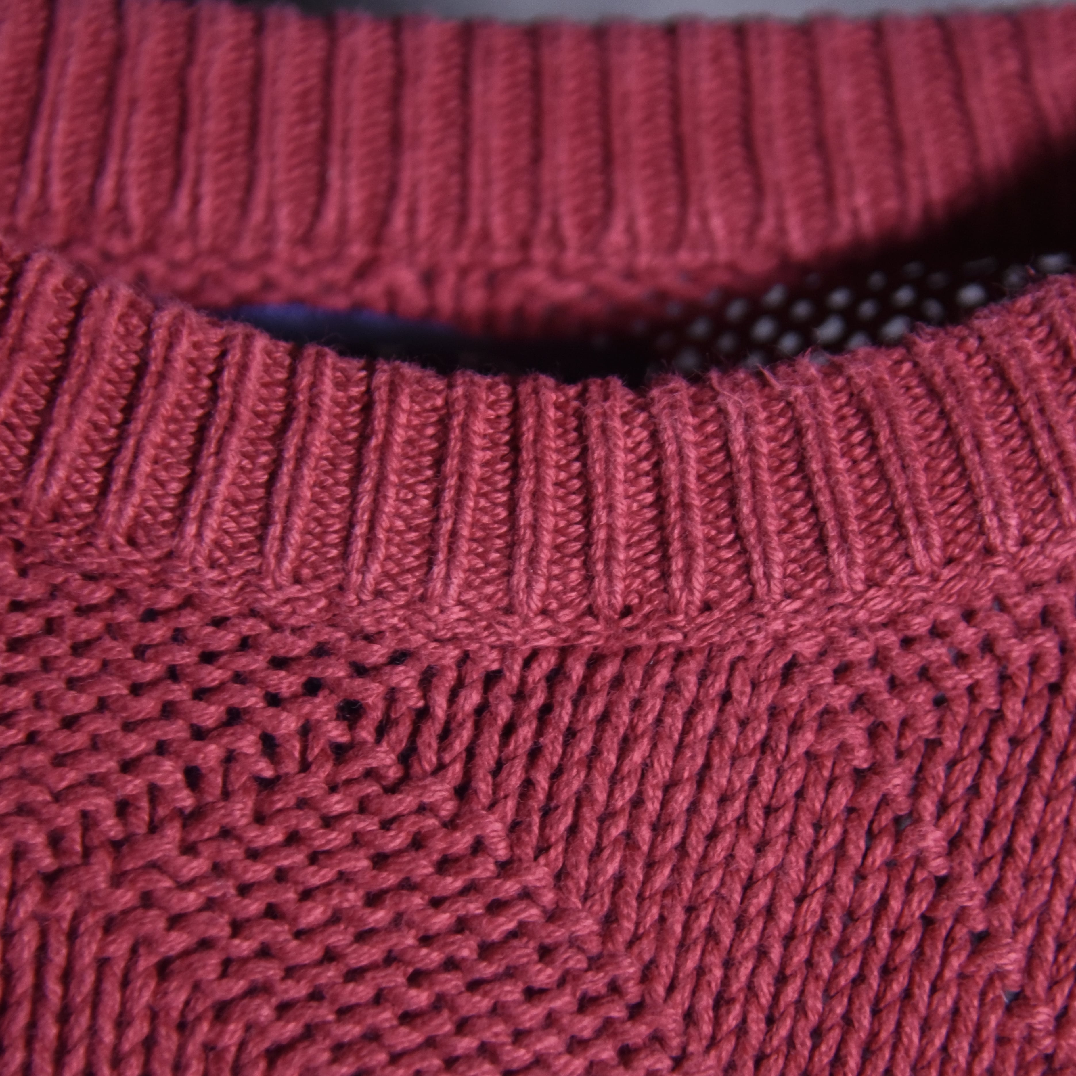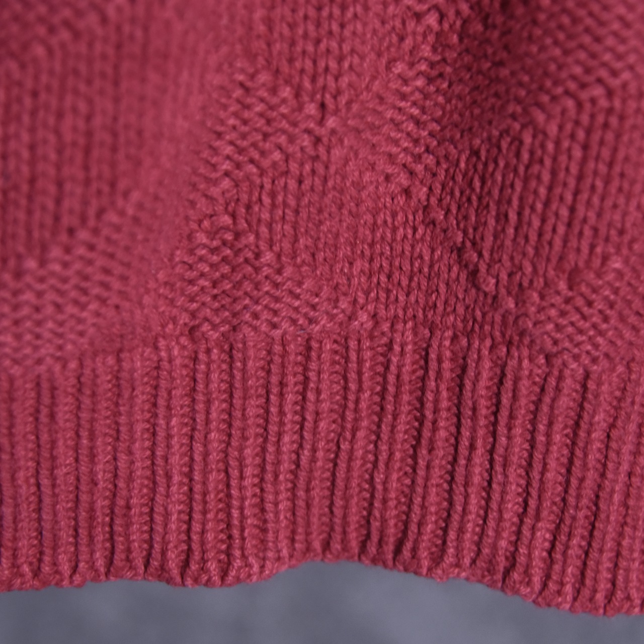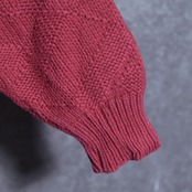 規則的な格子柄を編み地で表現した無地ライクな使い勝手のいい一着で、襟や裾、袖口は厚みのあるリブが配され、セーターながらスウェットのようなカジュアルさも兼ね備えたユーティリティなアイテムです。
