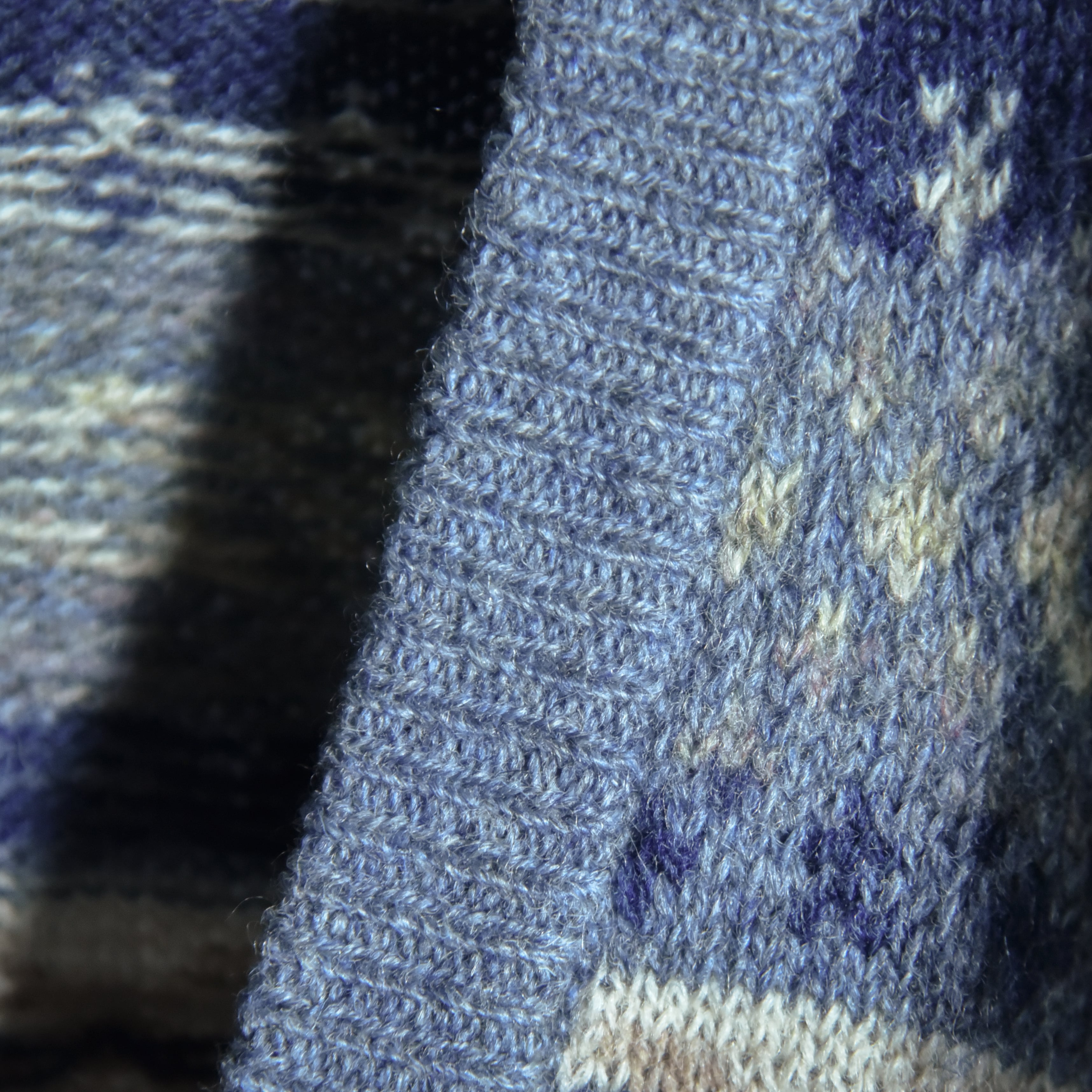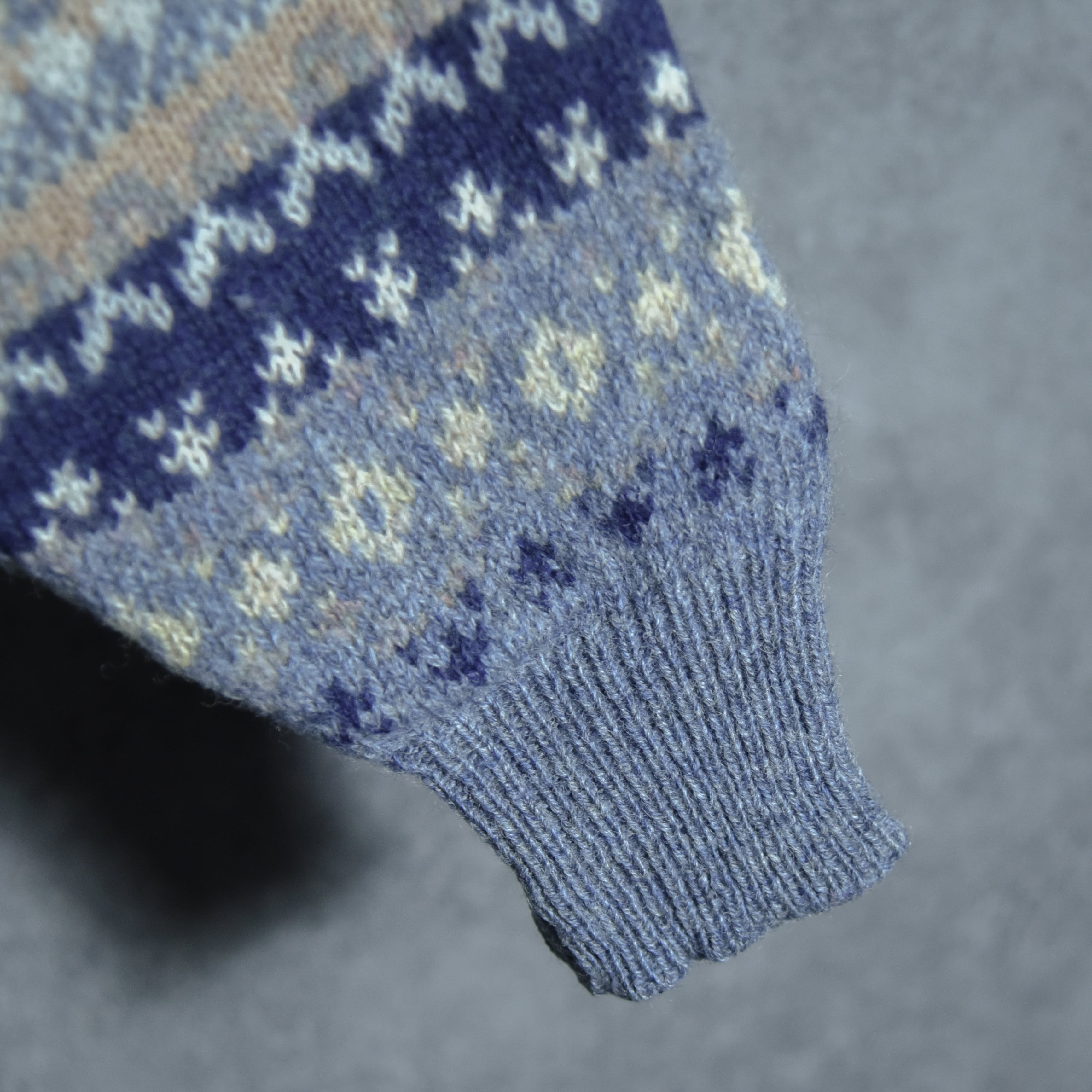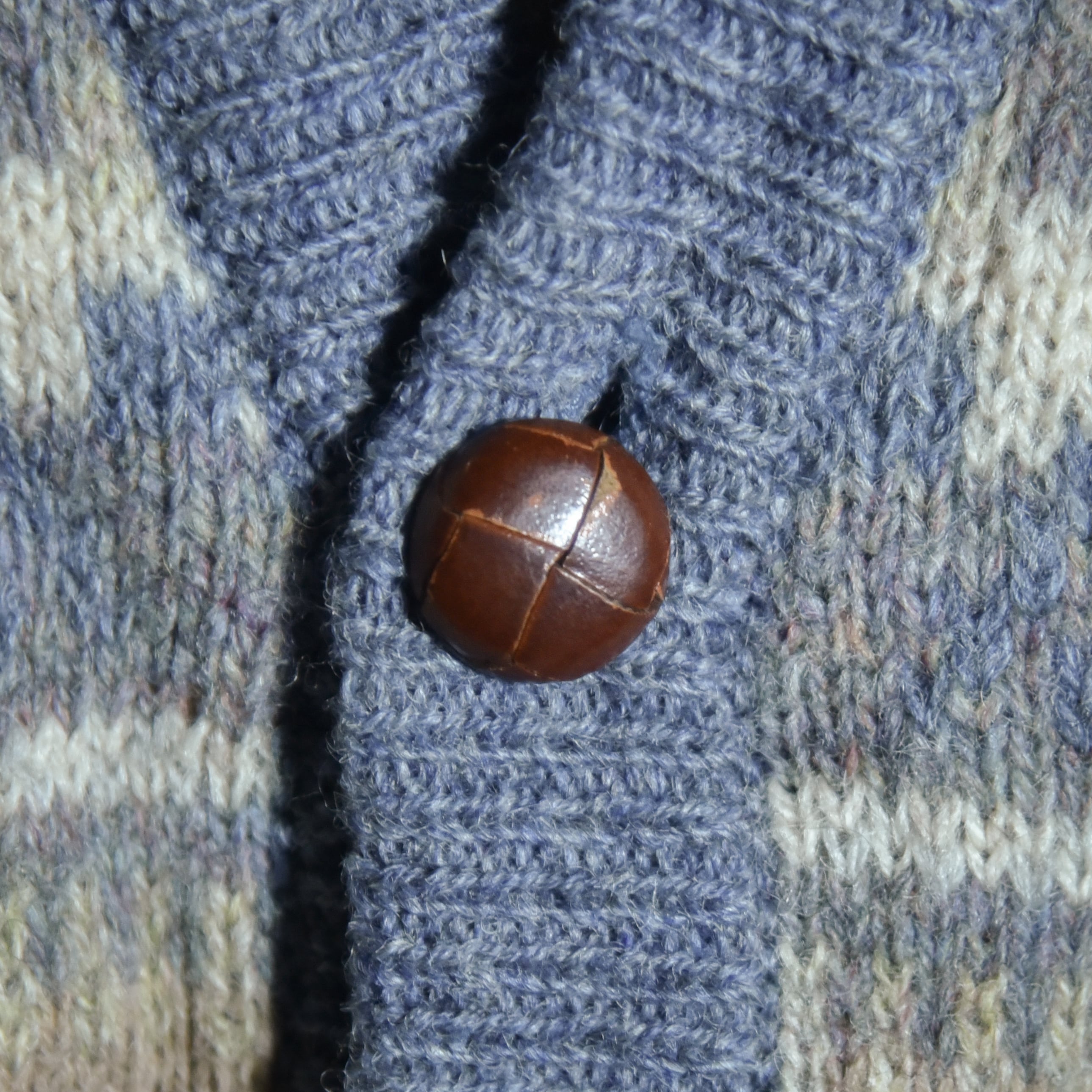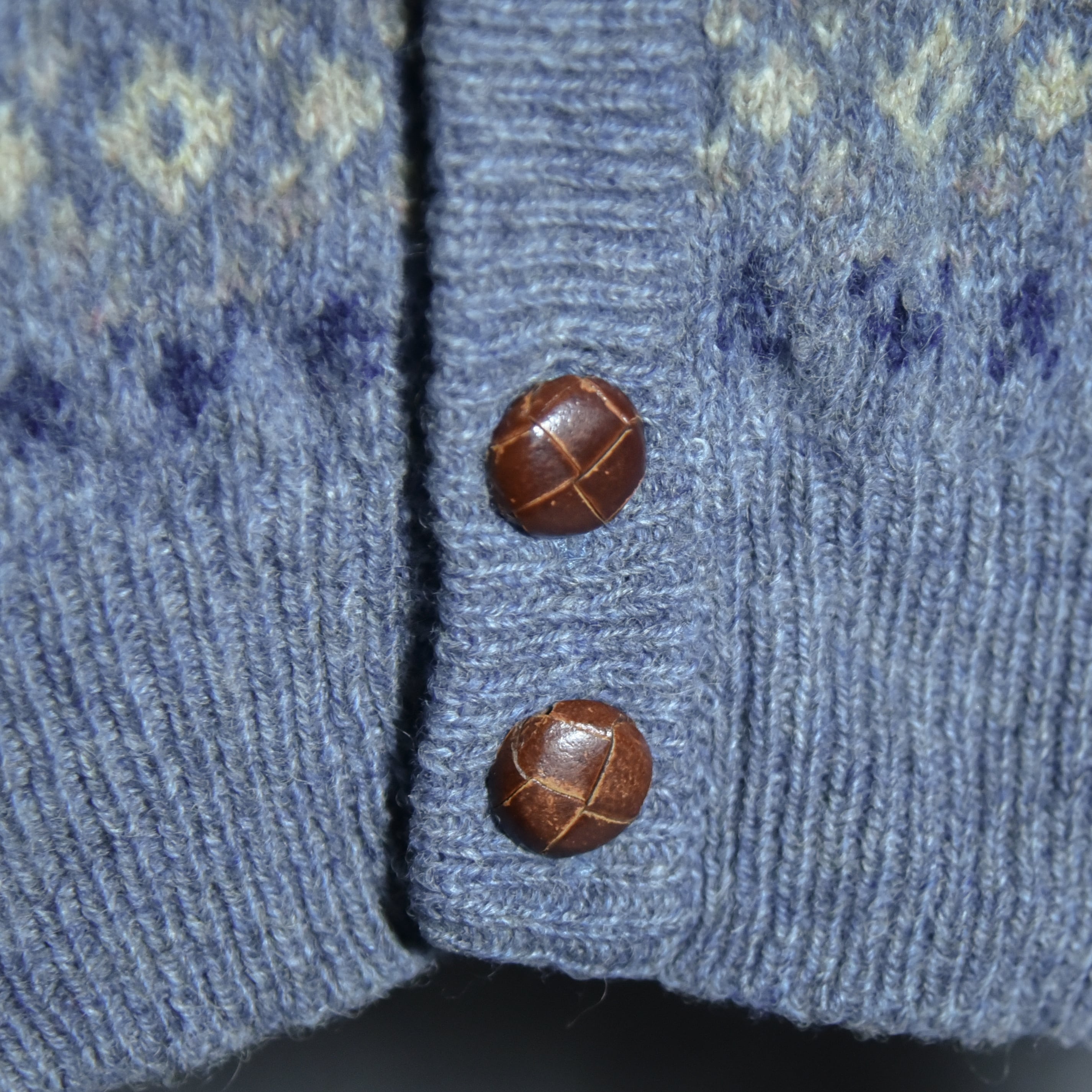おそらくフランスやイギリスなどの輸出用として作られたハイエイドなカーディガンで、緻密で繊細な柄に柔らかい配色、前立てや袖口のしっかりとしたリブ使い、本革のくるみボタンなど、素朴でありながら高級感漂う一着です。