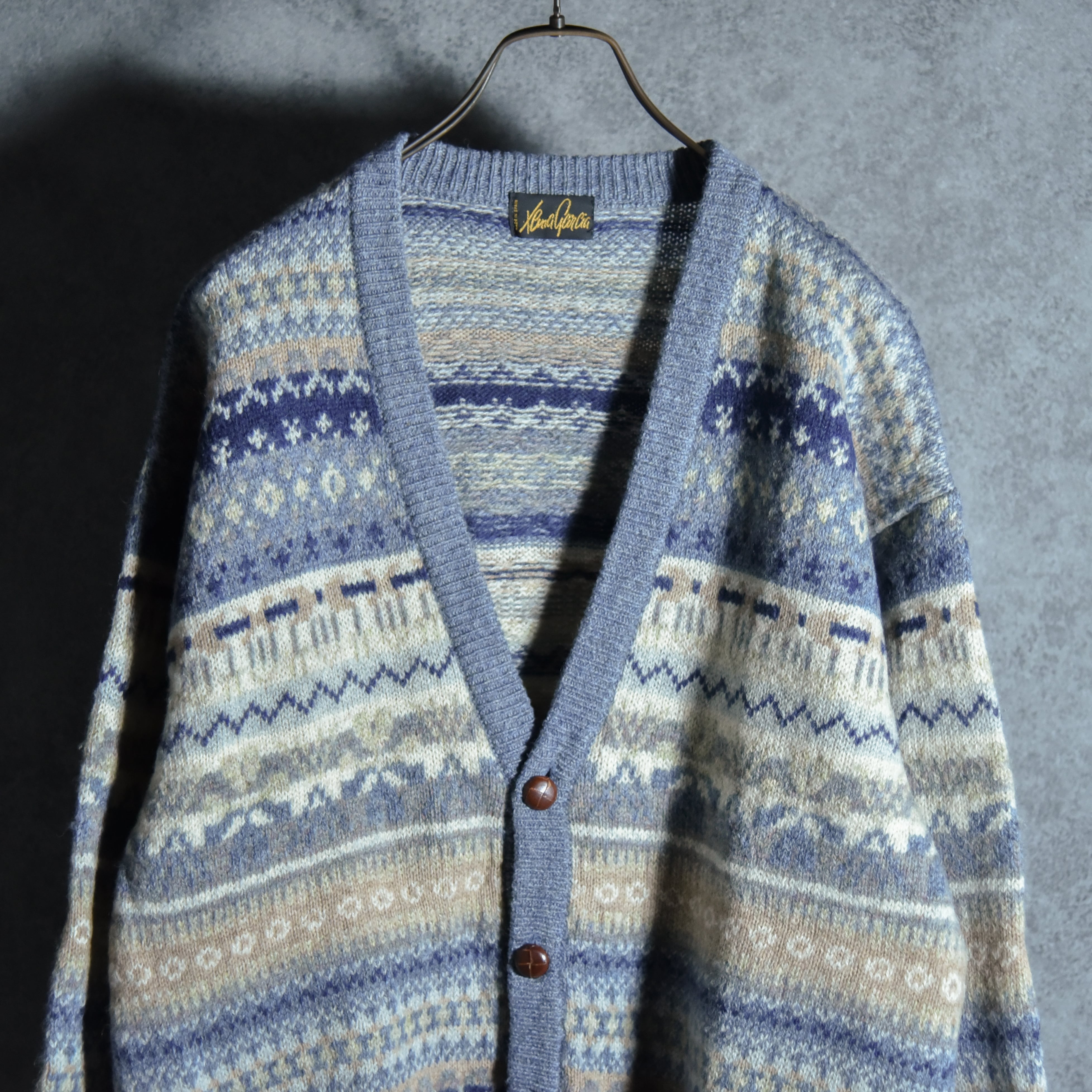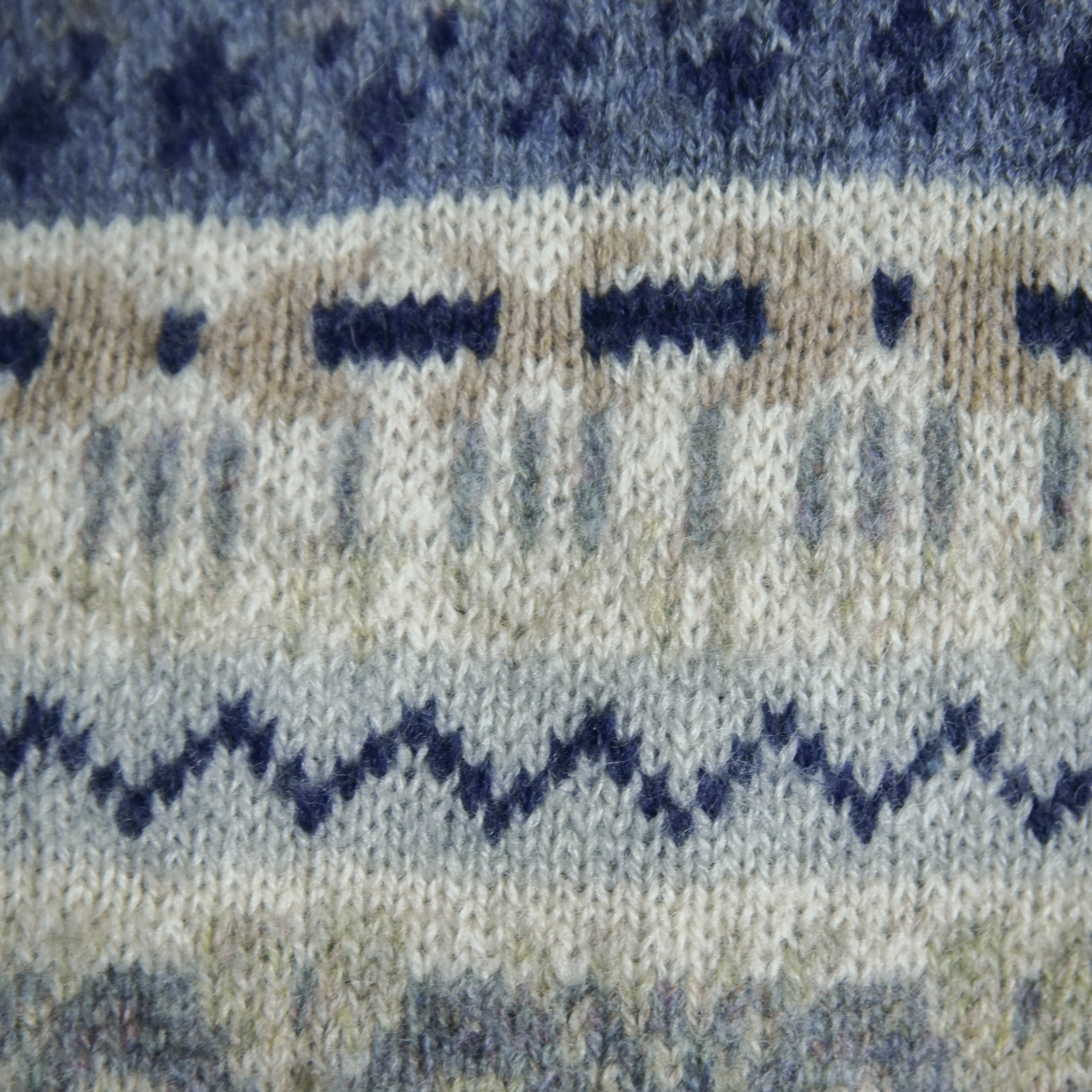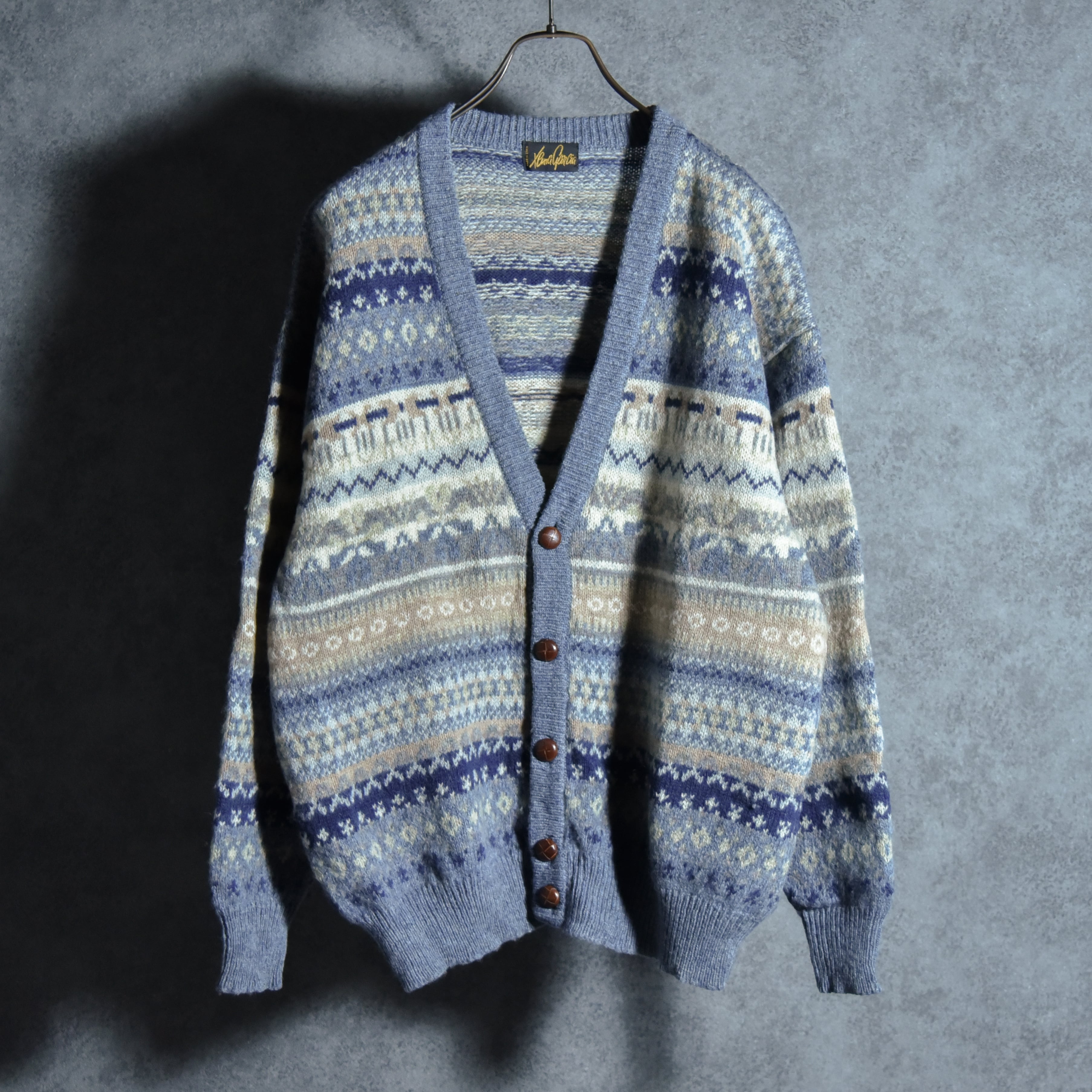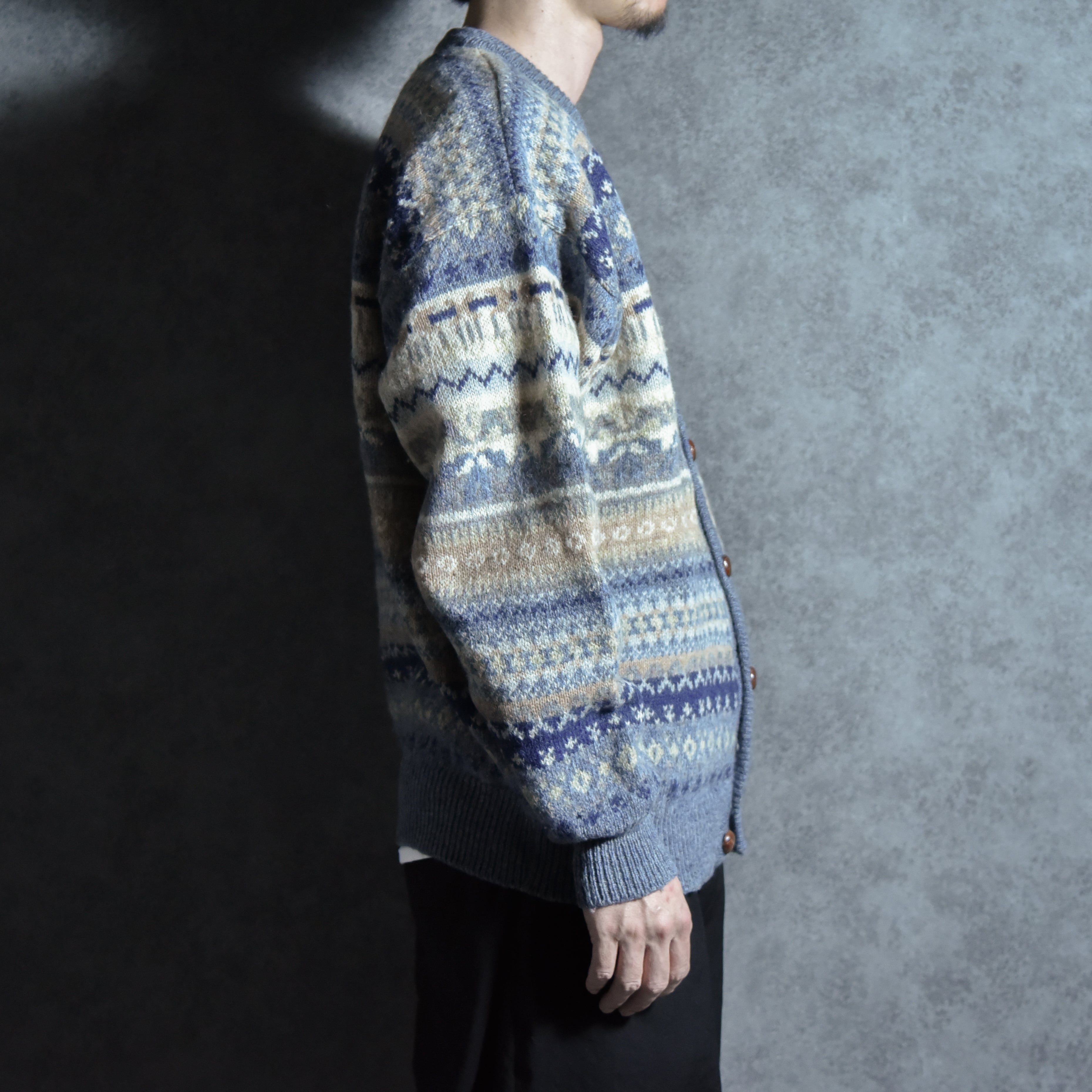 おそらくフランスやイギリスなどの輸出用として作られたハイエイドなカーディガンで、緻密で繊細な柄に柔らかい配色、前立てや袖口のしっかりとしたリブ使い、本革のくるみボタンなど、素朴でありながら高級感漂う一着です。