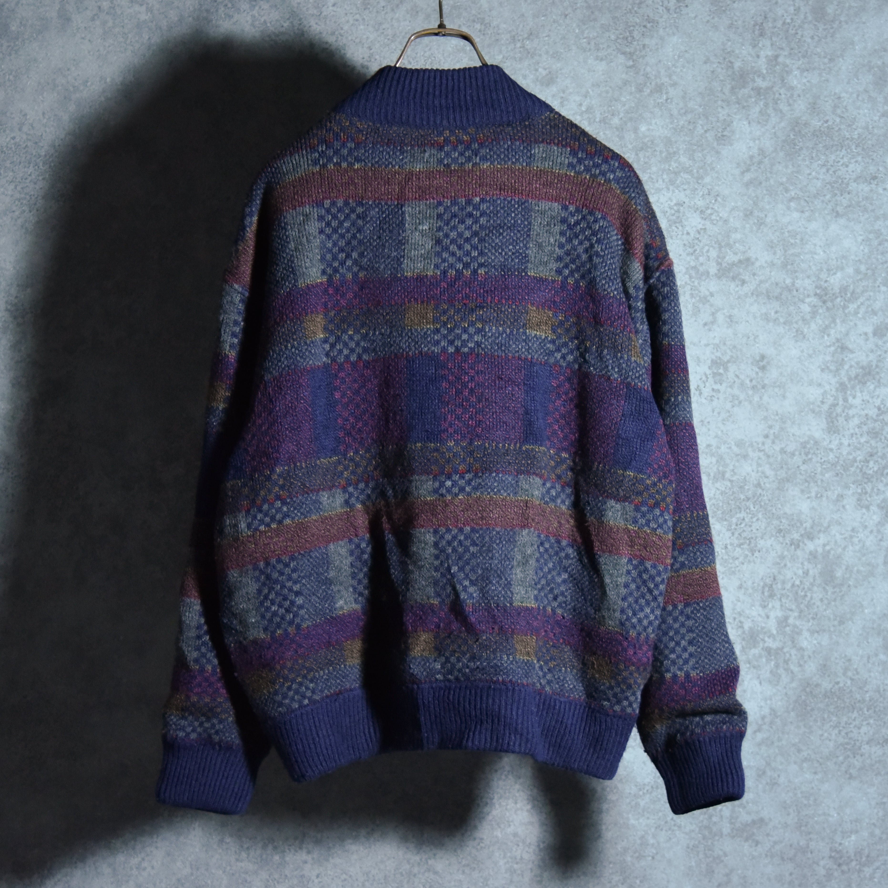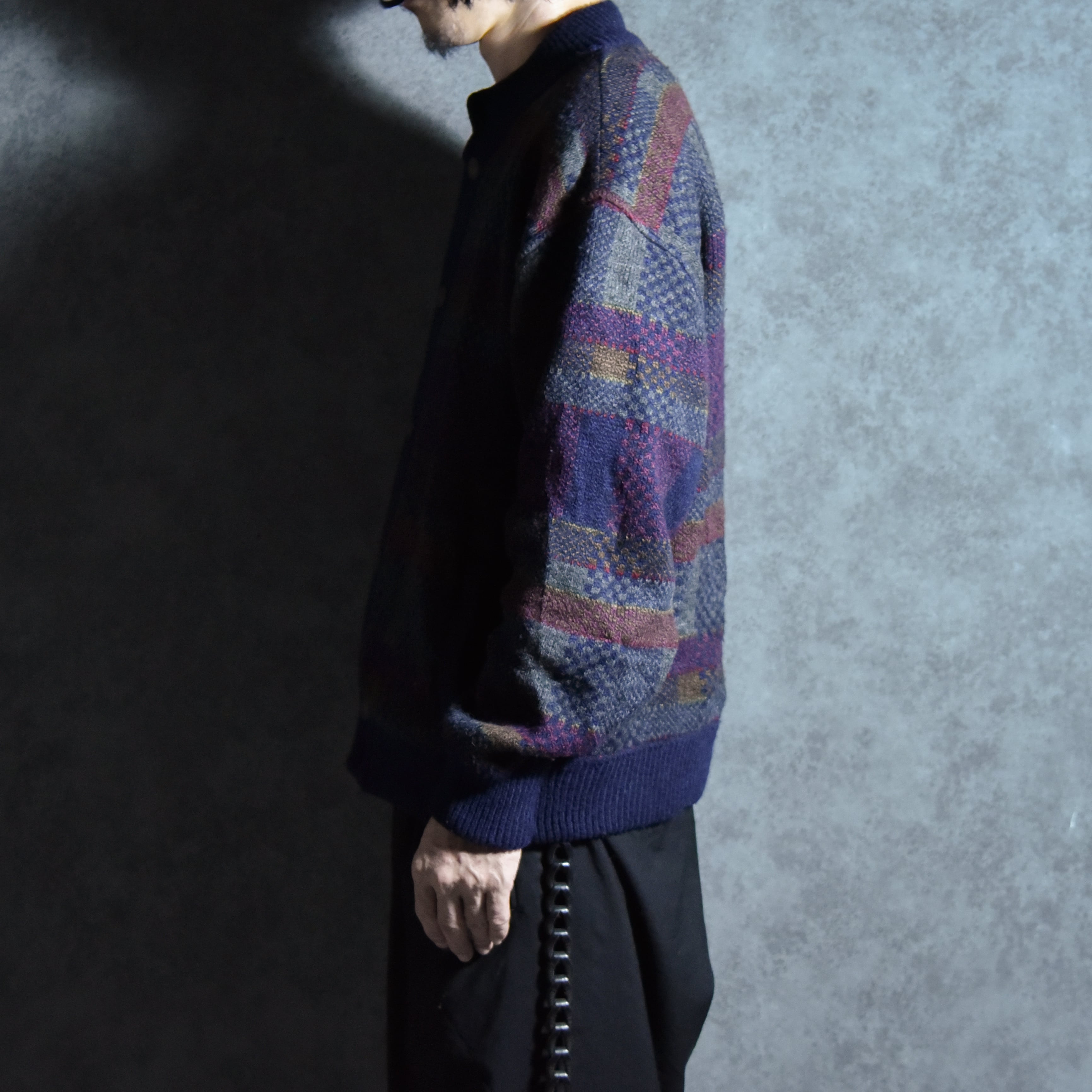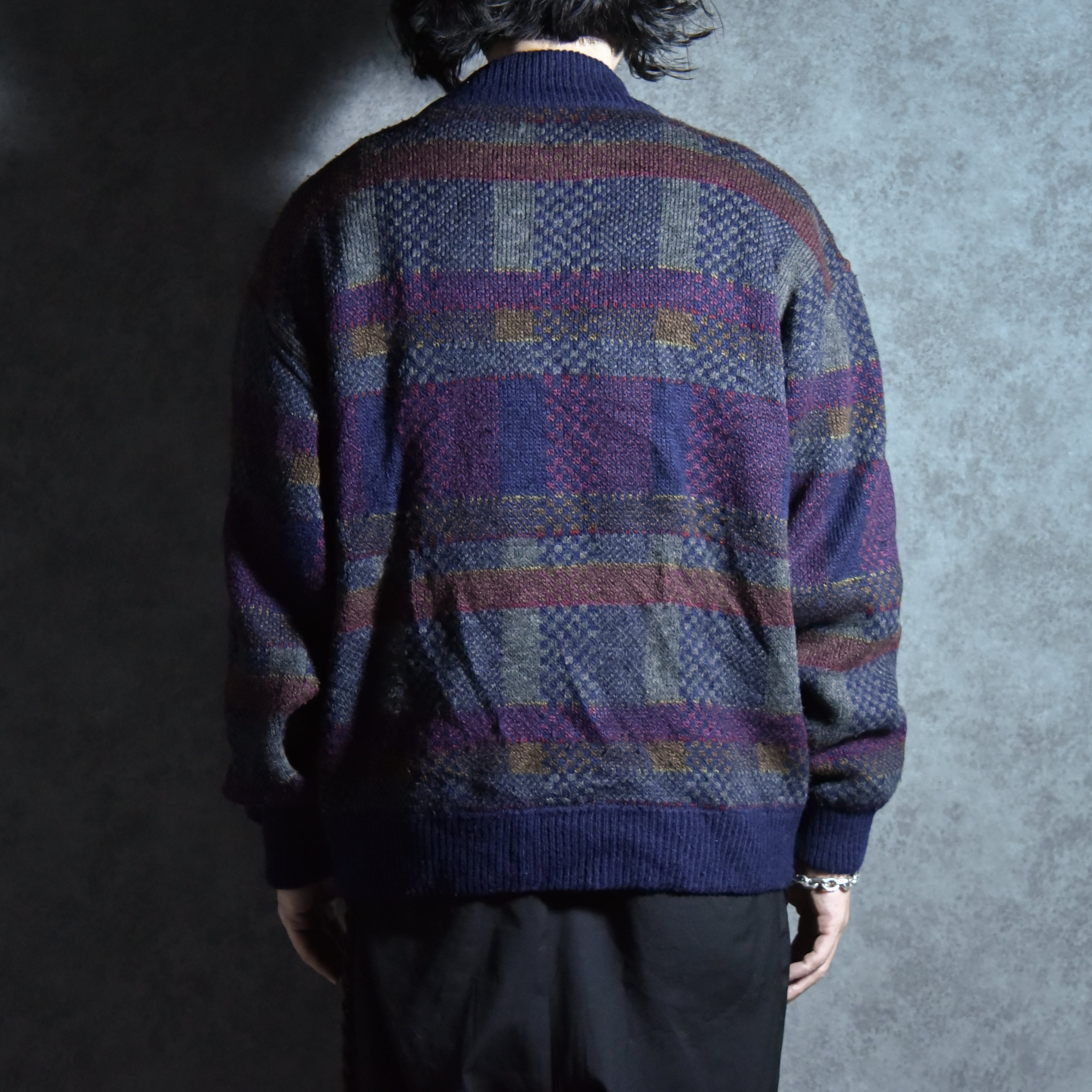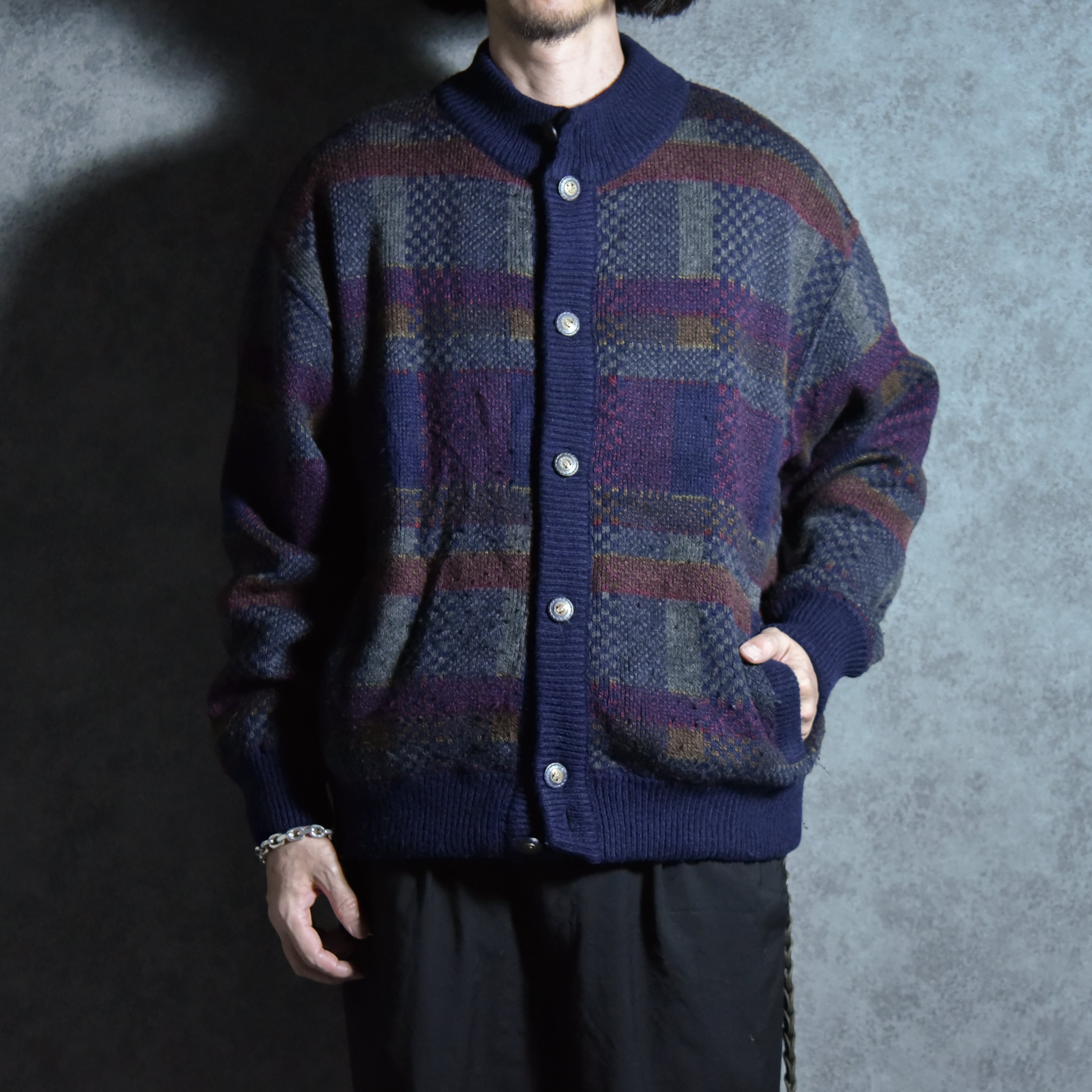サイズ感はメンズのLからXL程度ですが、この年代のニットジャケットにしては着丈が比較的短めに作られているので、非常に現代的で着やすいシルエットです。