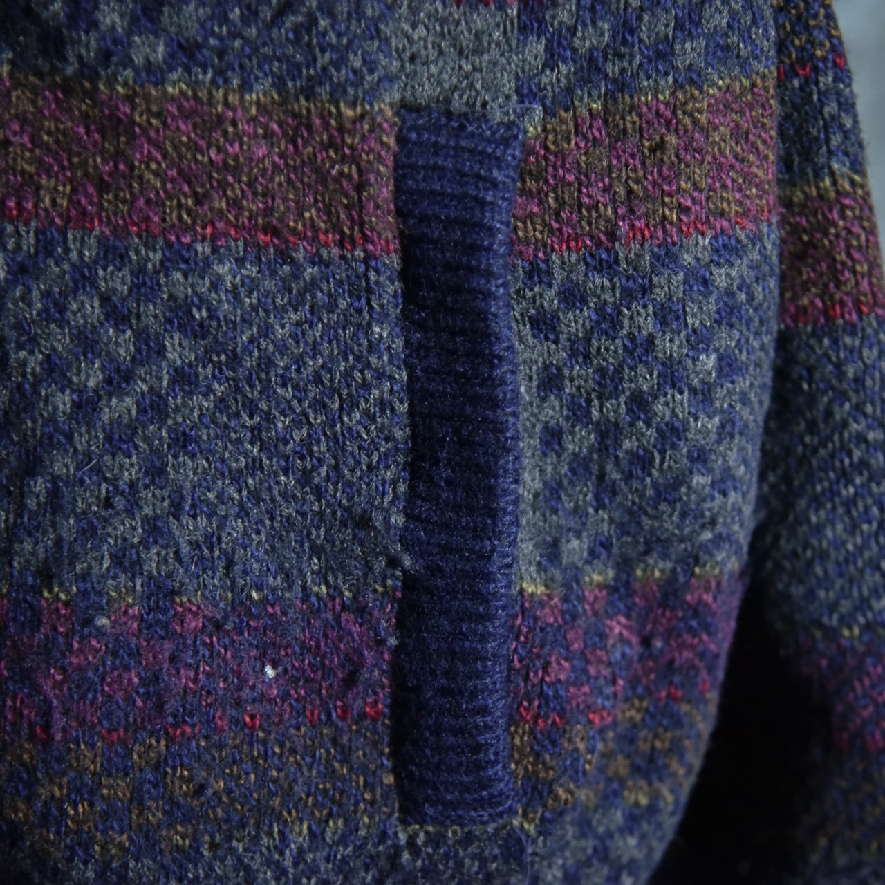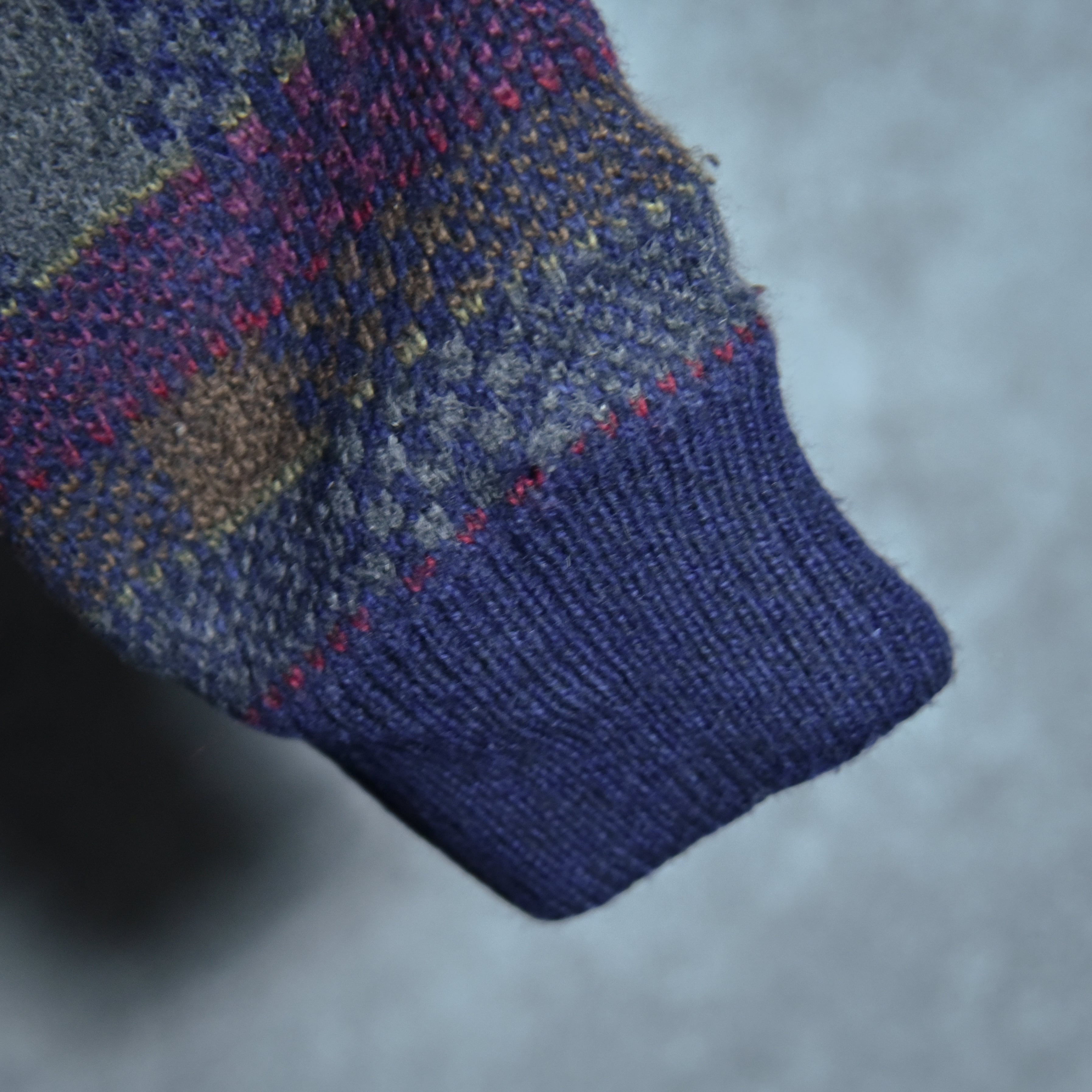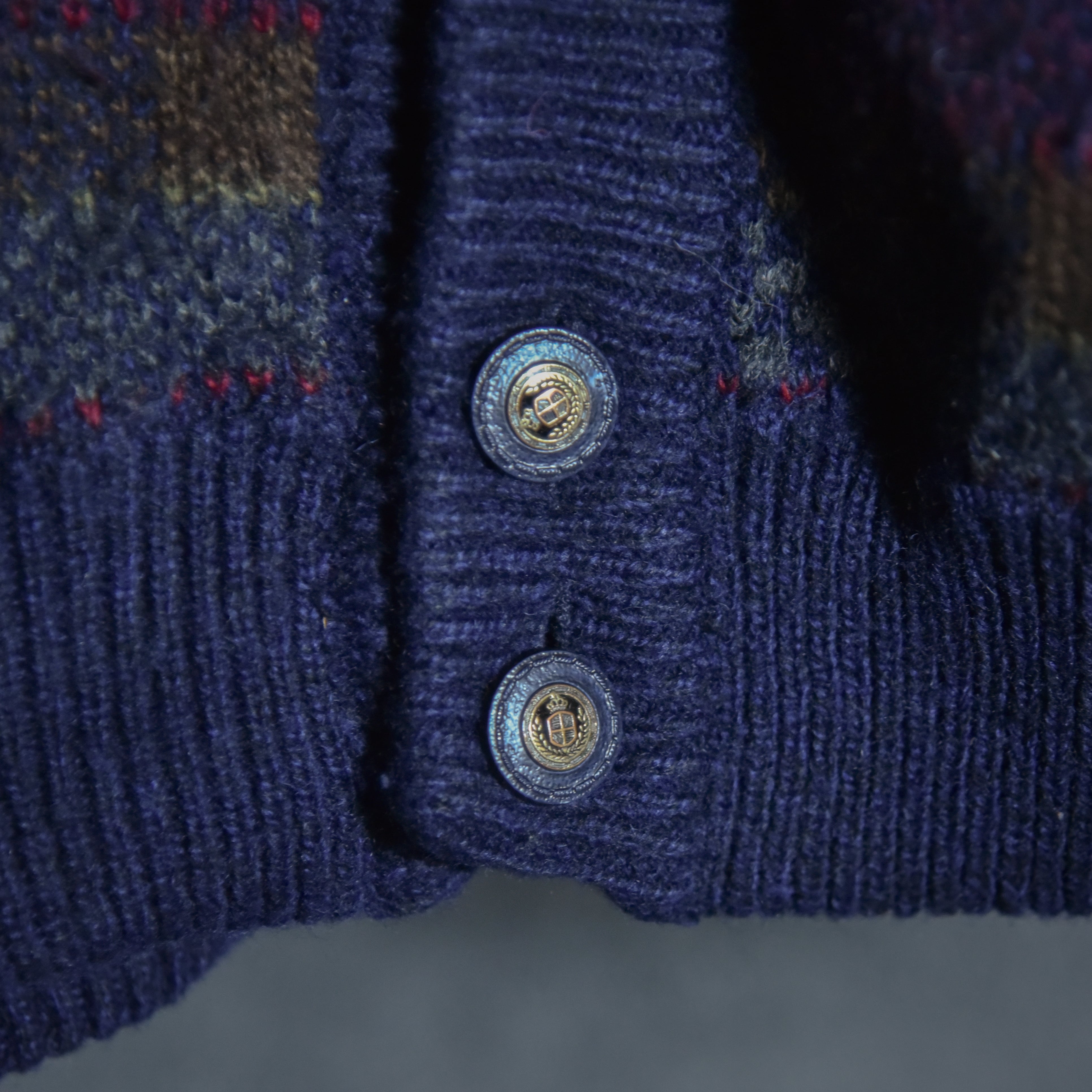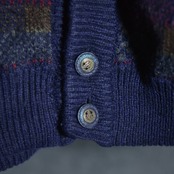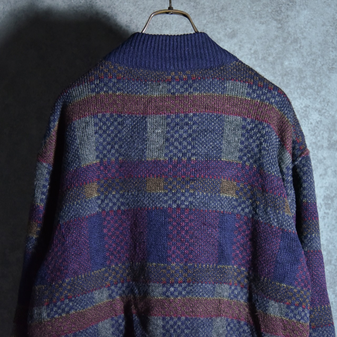 サイズ感はメンズのLからXL程度ですが、この年代のニットジャケットにしては着丈が比較的短めに作られているので、非常に現代的で着やすいシルエットです。