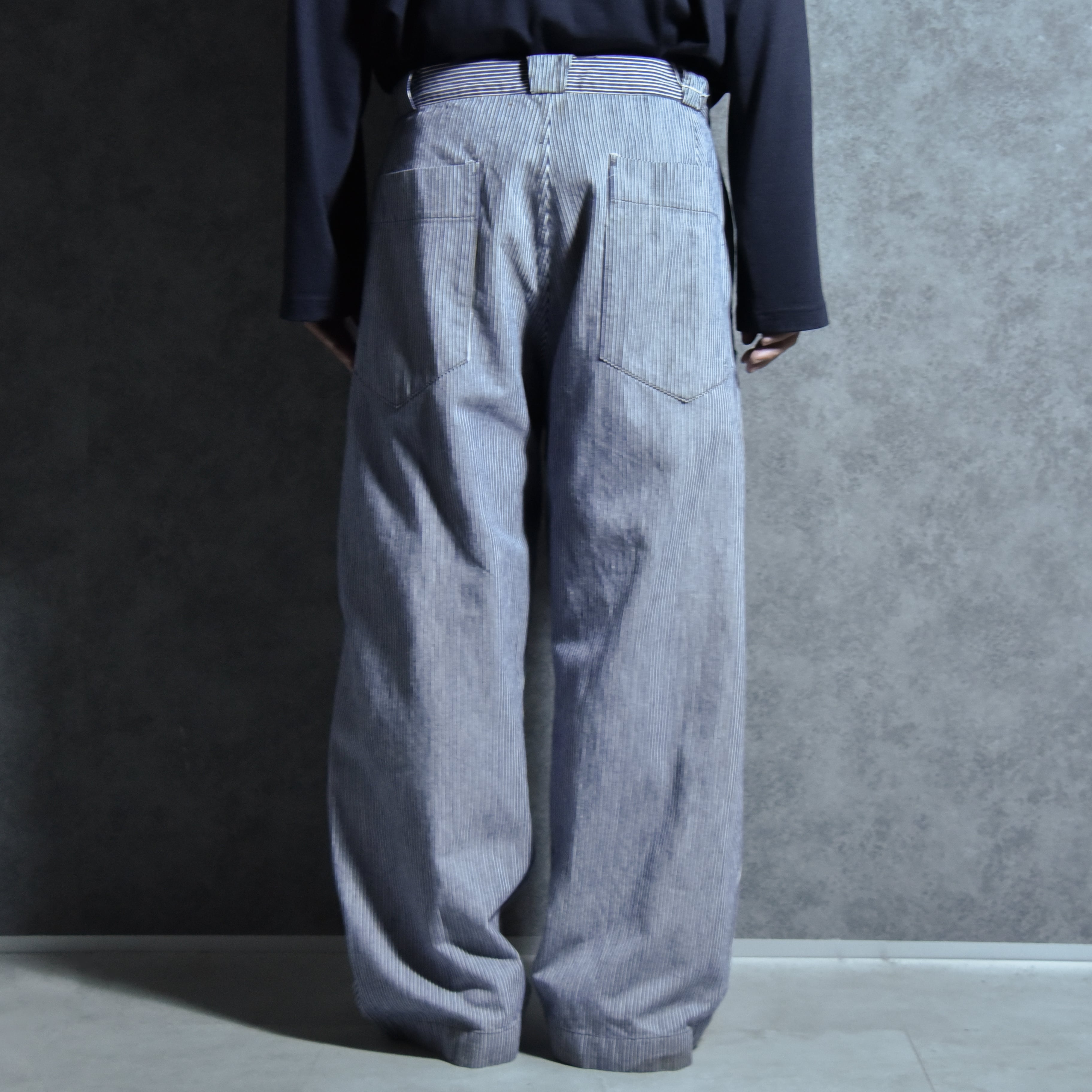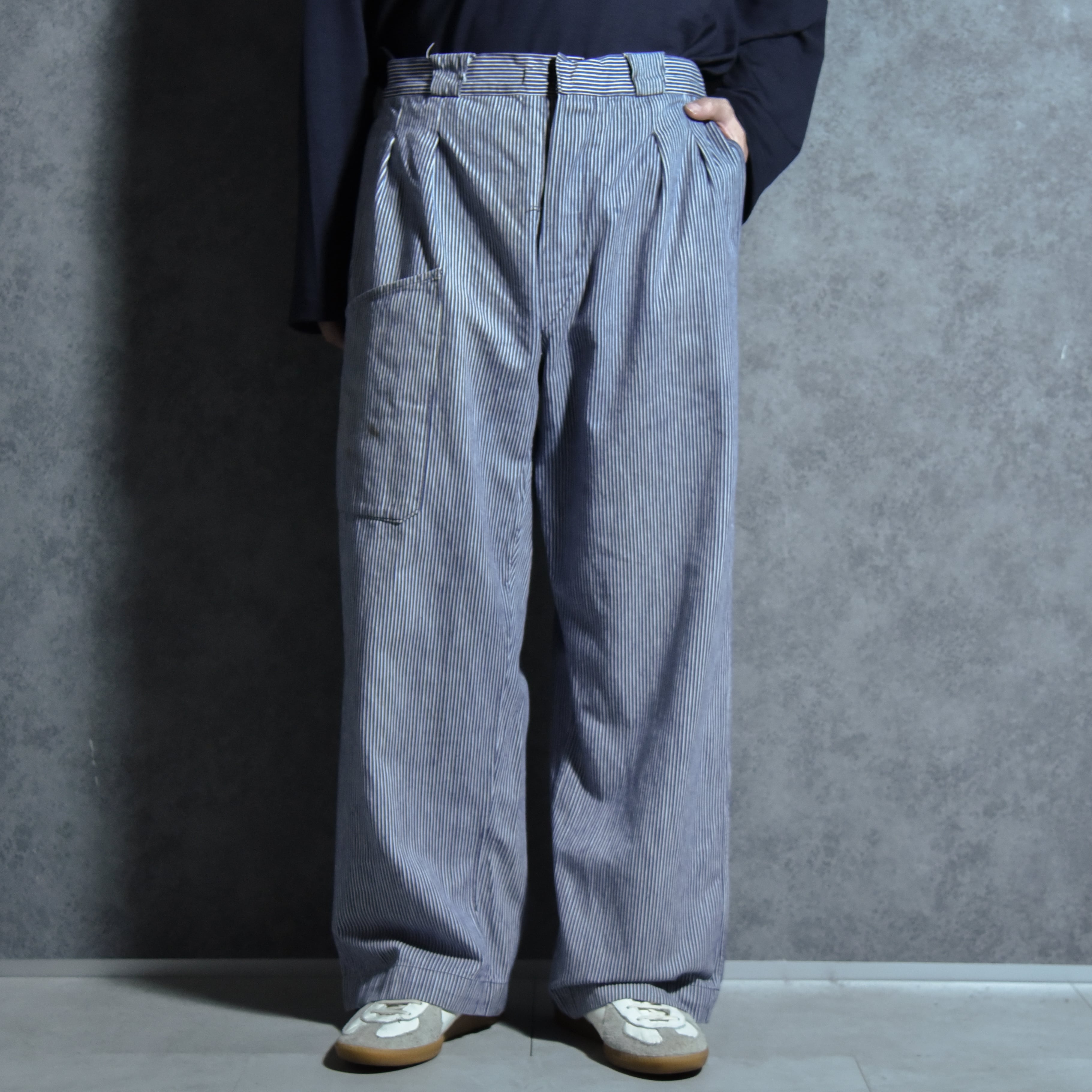 トラウザーズはフレンチワークでは珍しいワンタックでズドンと太いシルエットと、右足の大きなツールポケットが特徴で、セットアップで着用した際の存在感は格別です。