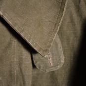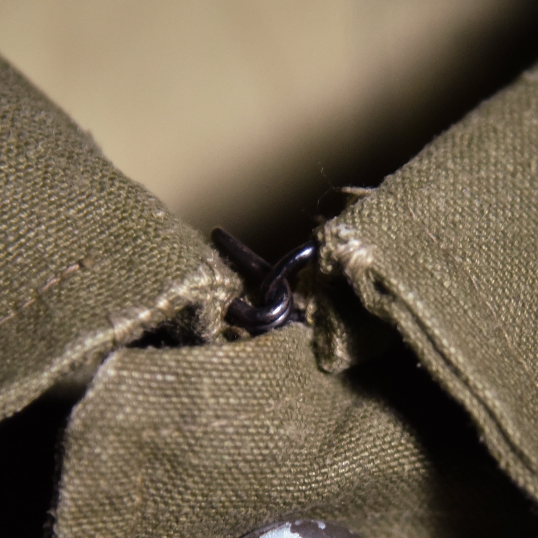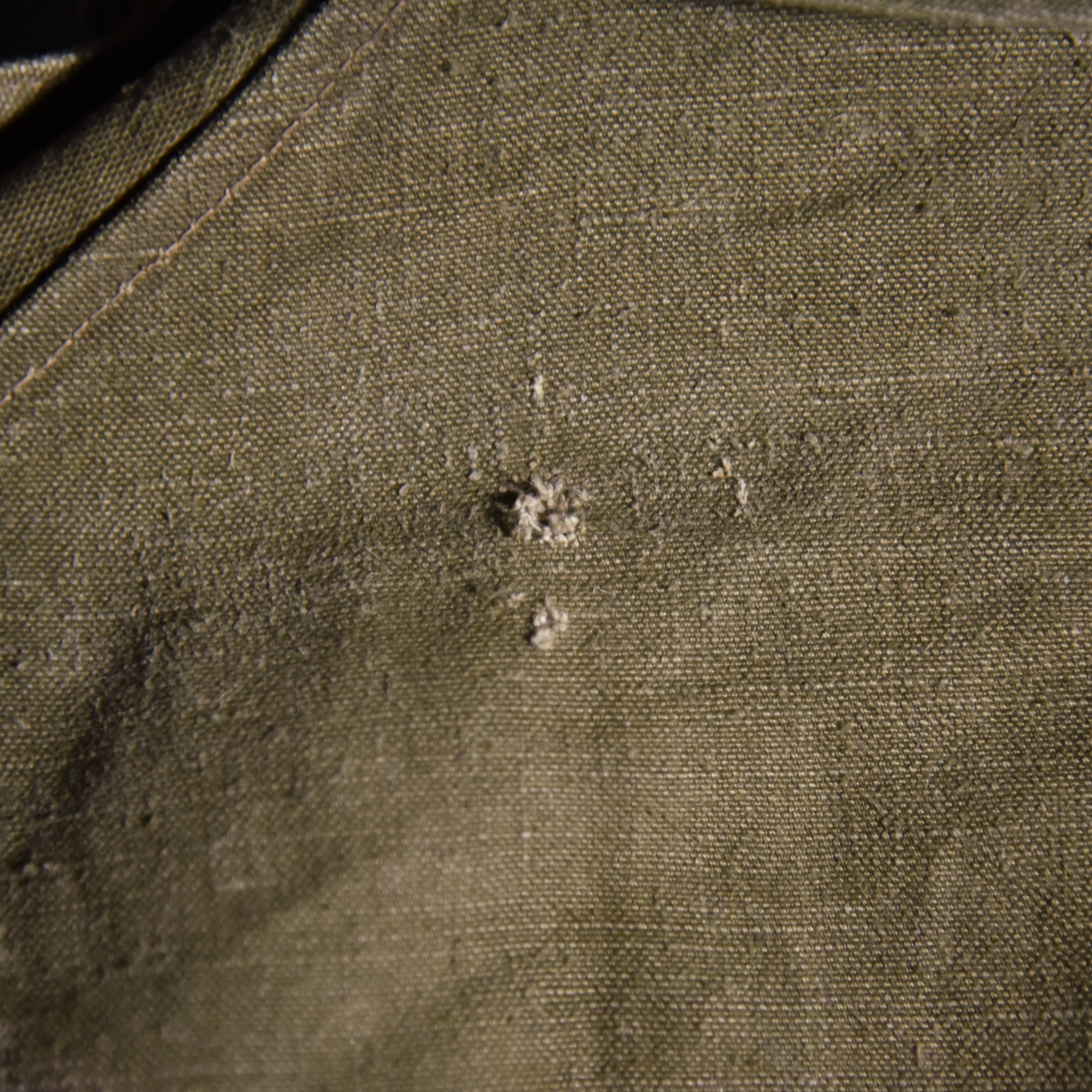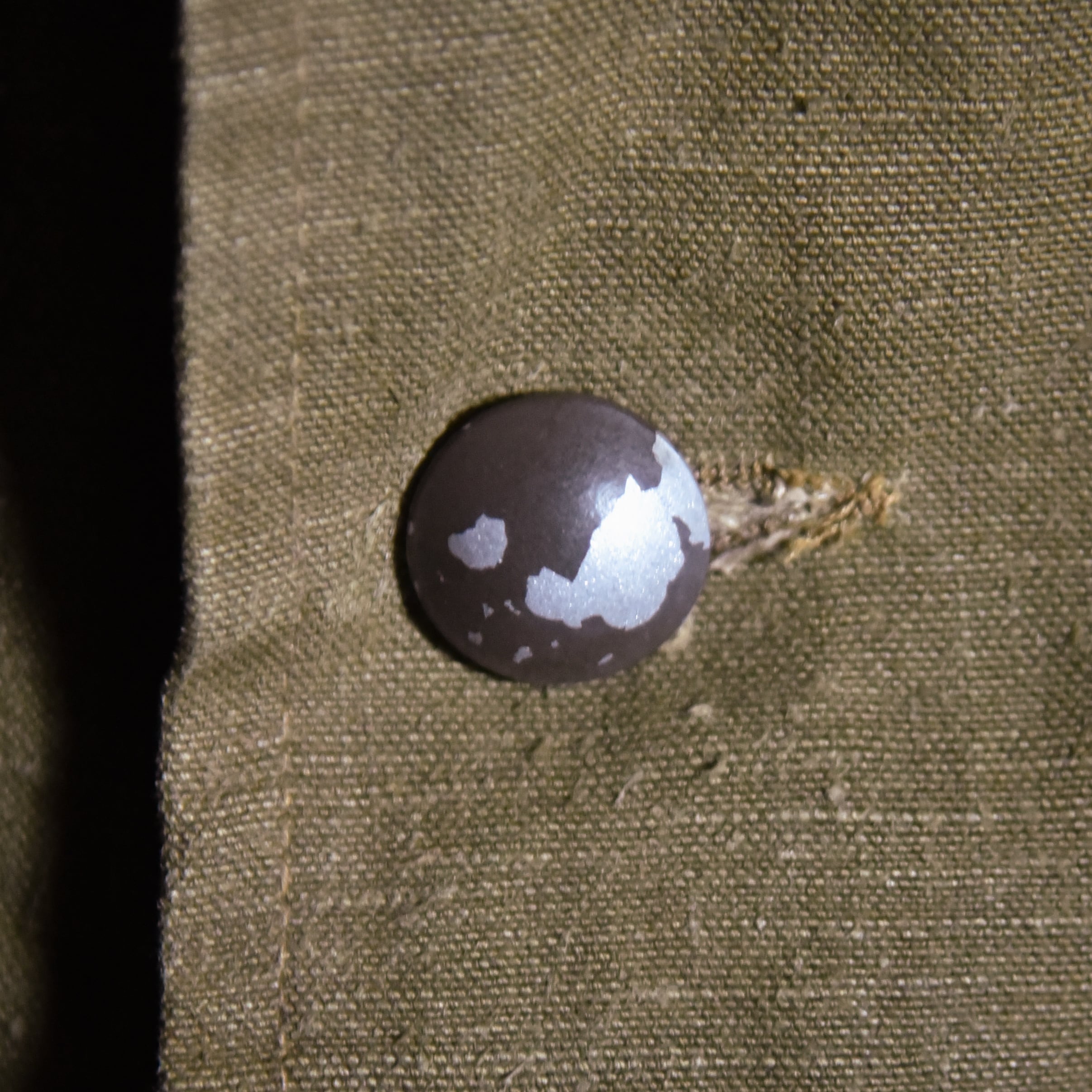 最後の写真のように後ろ見頃の肩部分には2-3mmのピンホール、フロントボタンの塗装は剥がれ等はあるものの欠損しておらず、年代を考えると状態は良好で経年変化による重厚な風合いも魅力の一つかと思います。