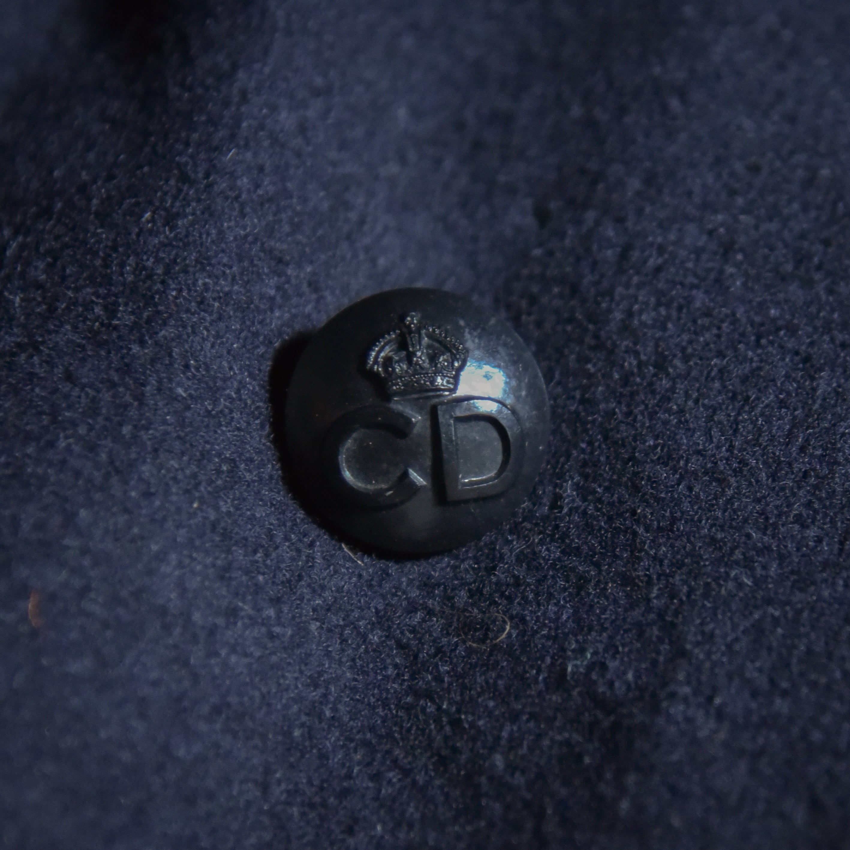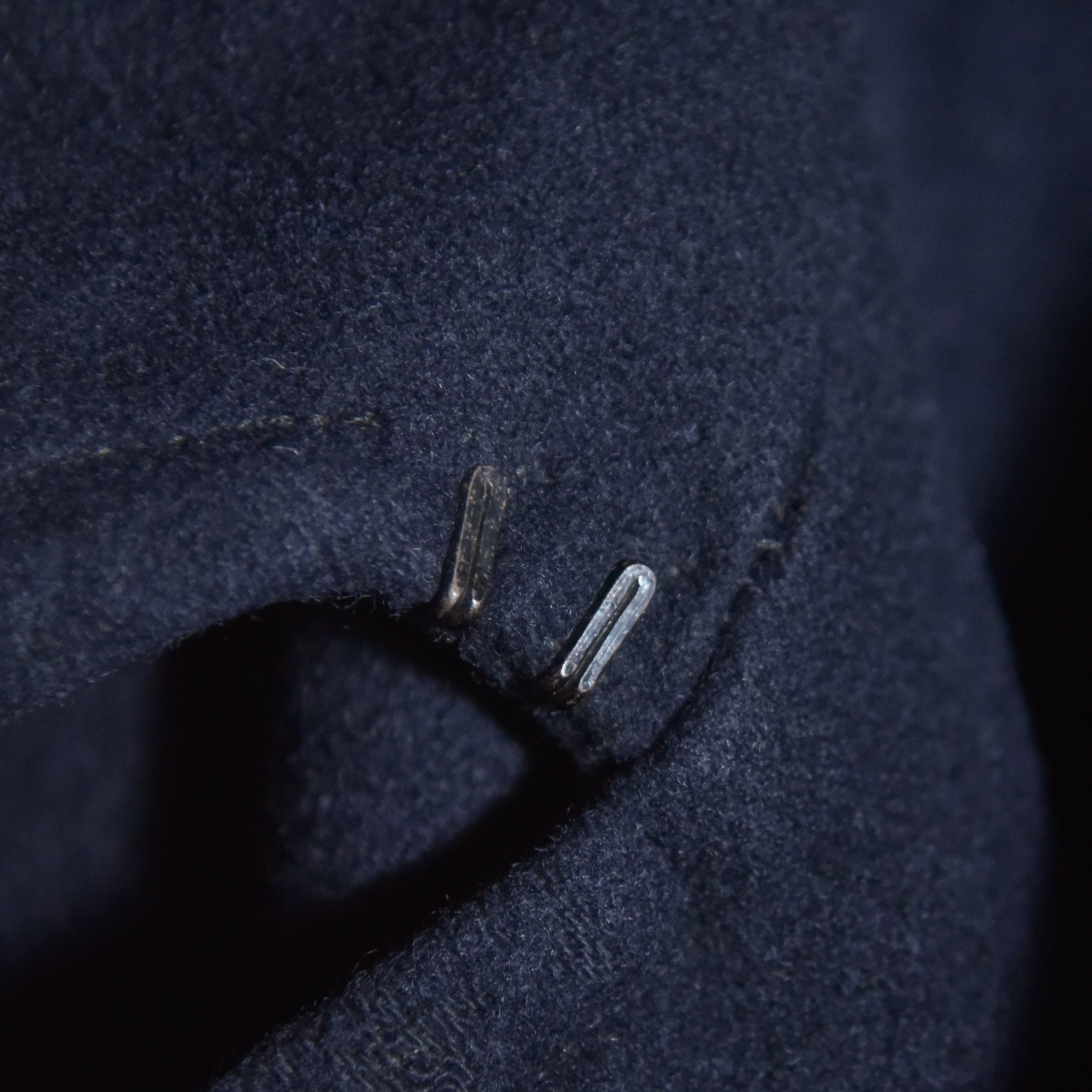 ボタンの刻印はCivil Defenseの頭文字のCD、 16枚目の写真のように見返し裏のポケットの下にはストラップがボタンによって配置されており、こちらは襟を立てて着用する際、襟裏のボタンで使えるようなギミックの効いたユニークな仕様となっています。