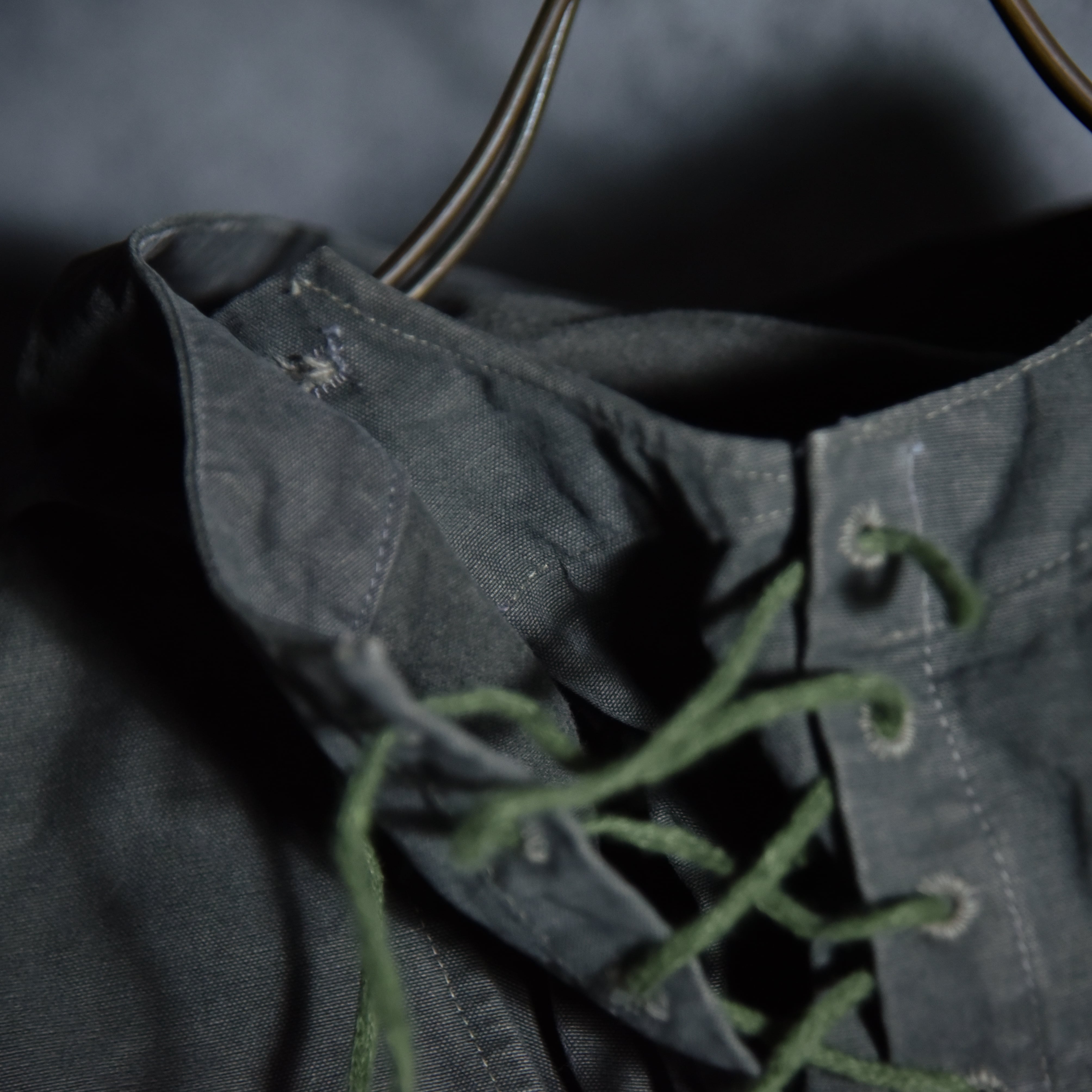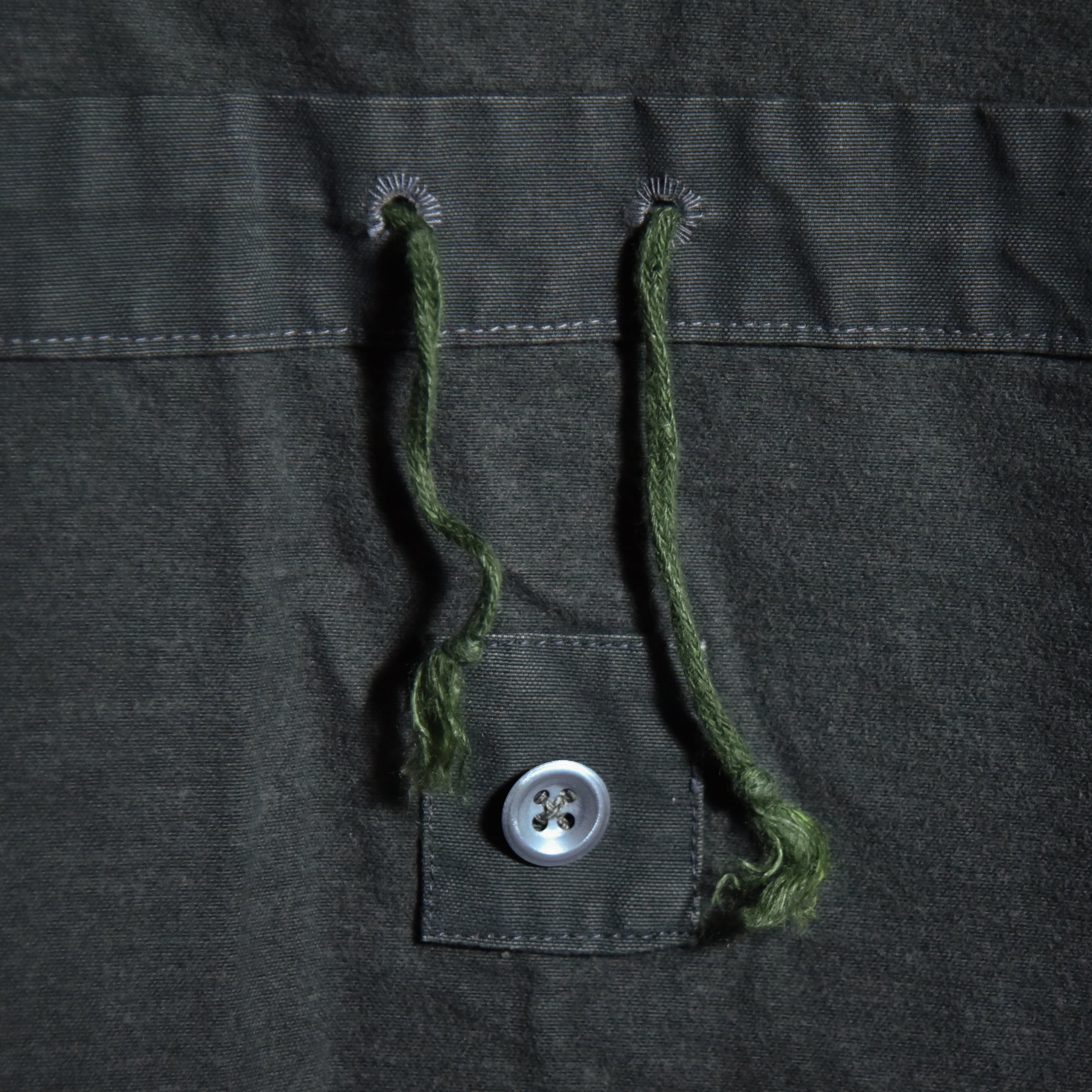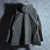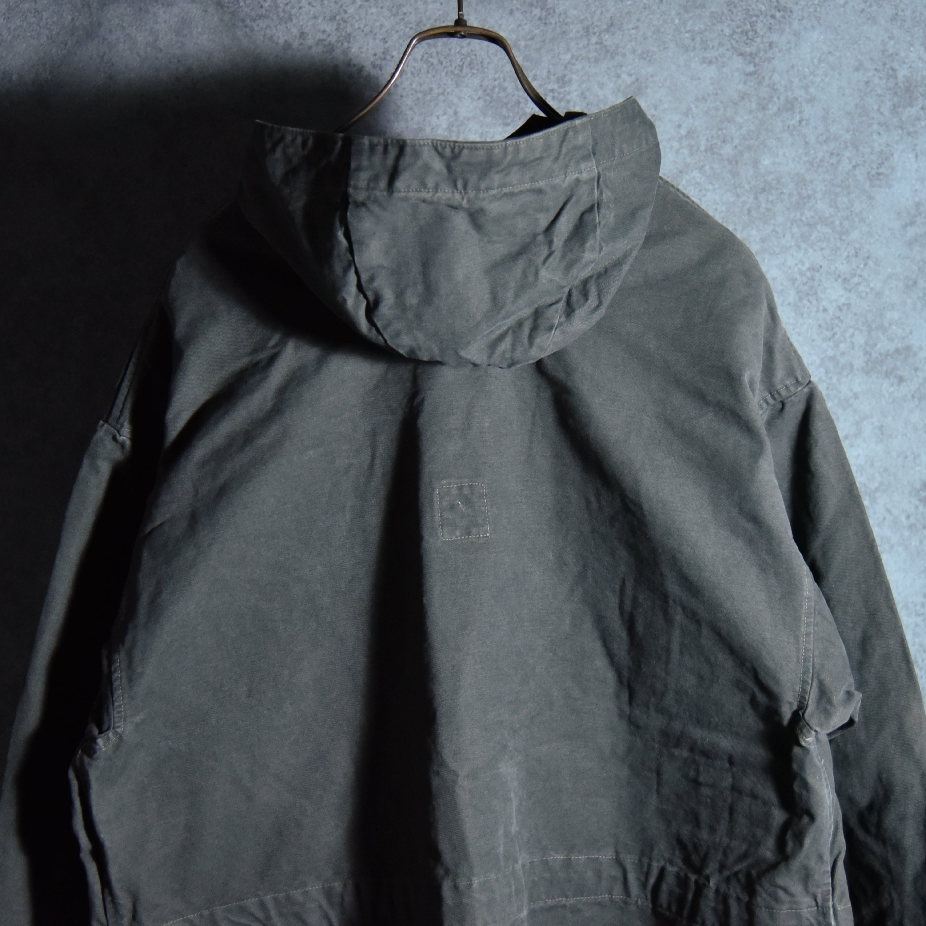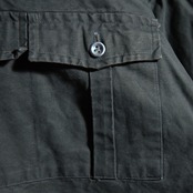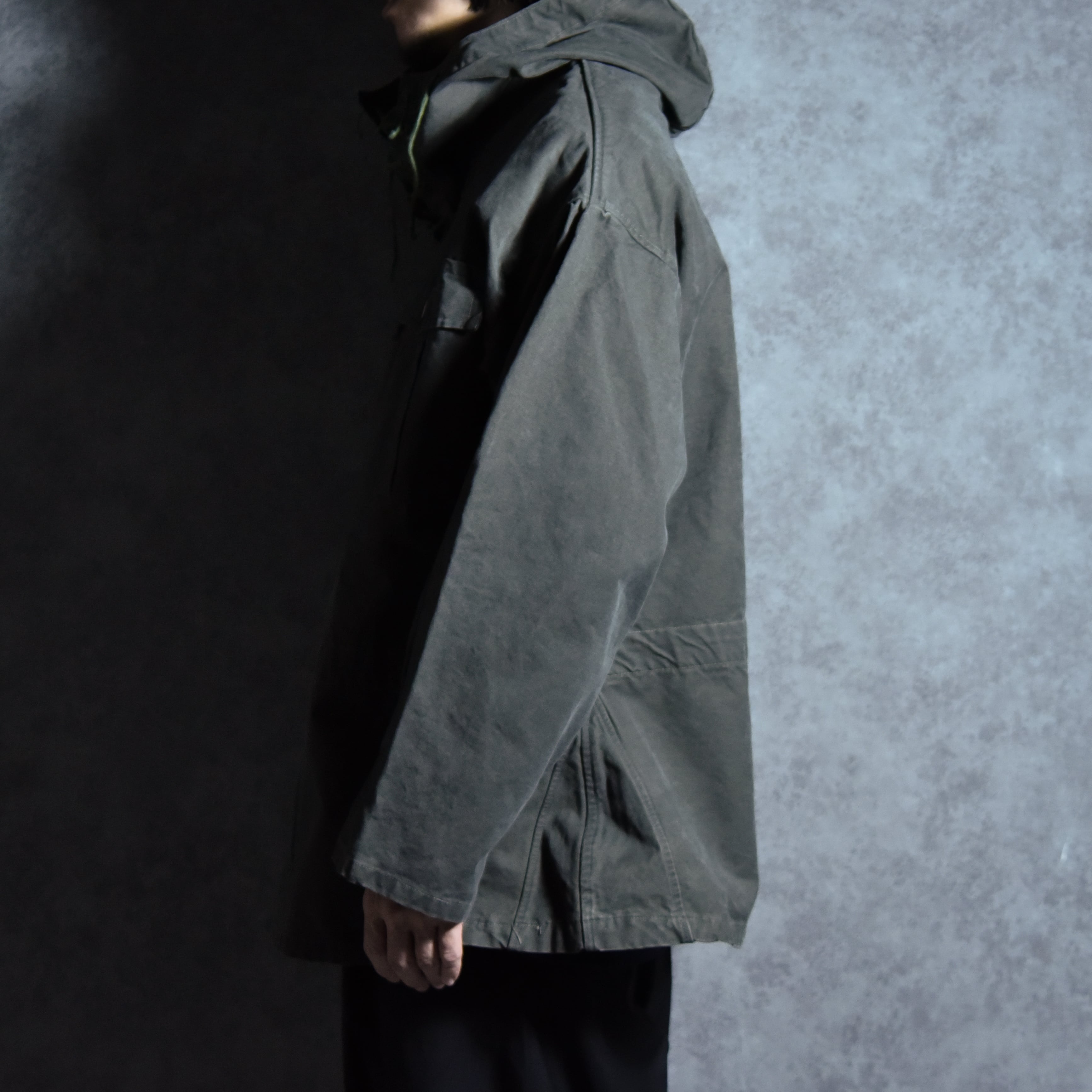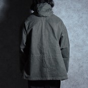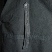 ひときわ目を惹くフロントに並んだスリーパッチポケットはM42とほぼ同じデザインで、首元はレースアップとその裏にボタン開閉が可能なウィンドストッパー機能を有する持ち出し、ウエストの内側にとフードにはドローコードが付き、両サイドの裾には大きな三角マチ、他にも袖口のアジャストタブや、後身頃の裏側にボタン留めで収納された股に通して固定できるストラップなど、同年代のミリタリーならではのディテールフルな作りになっています。
