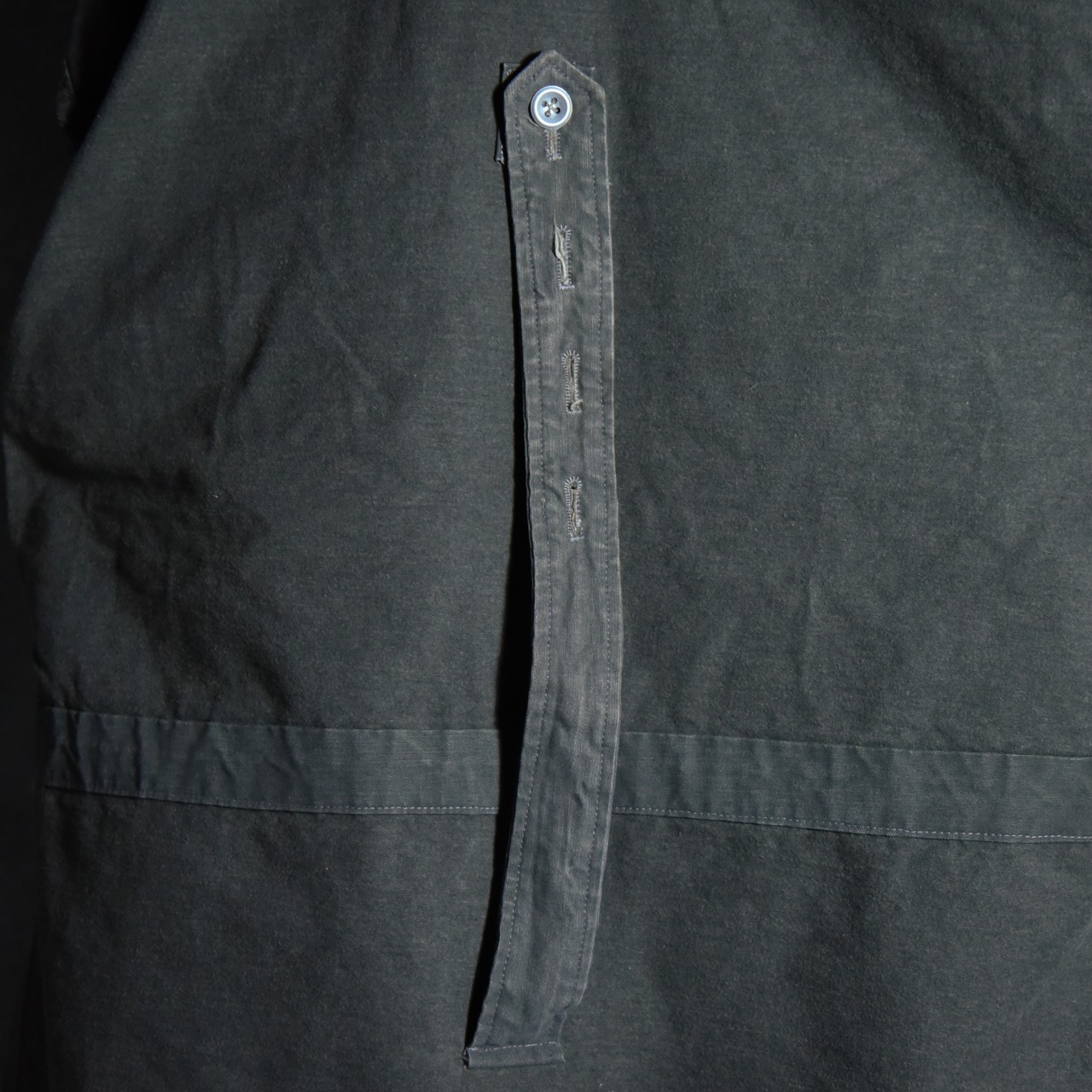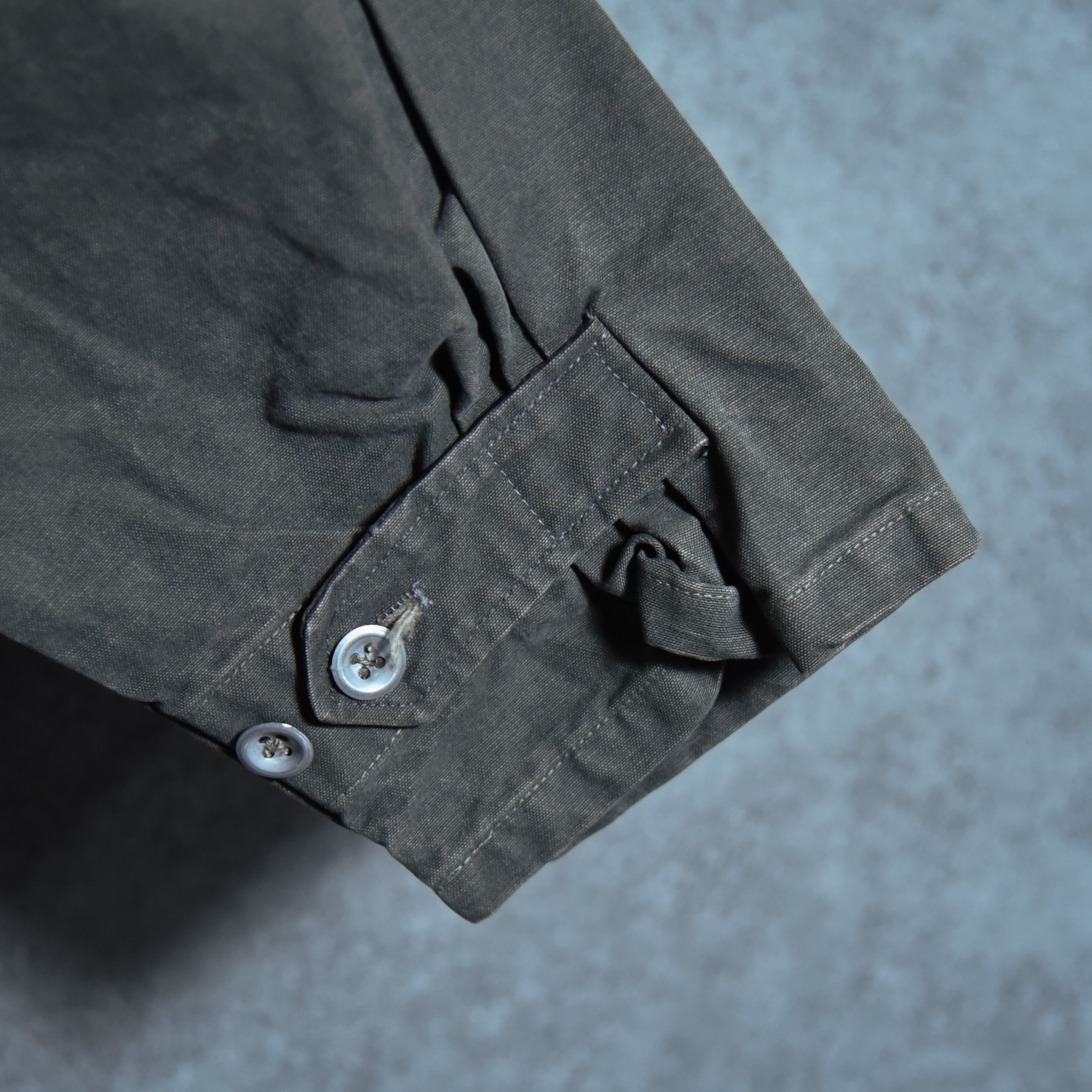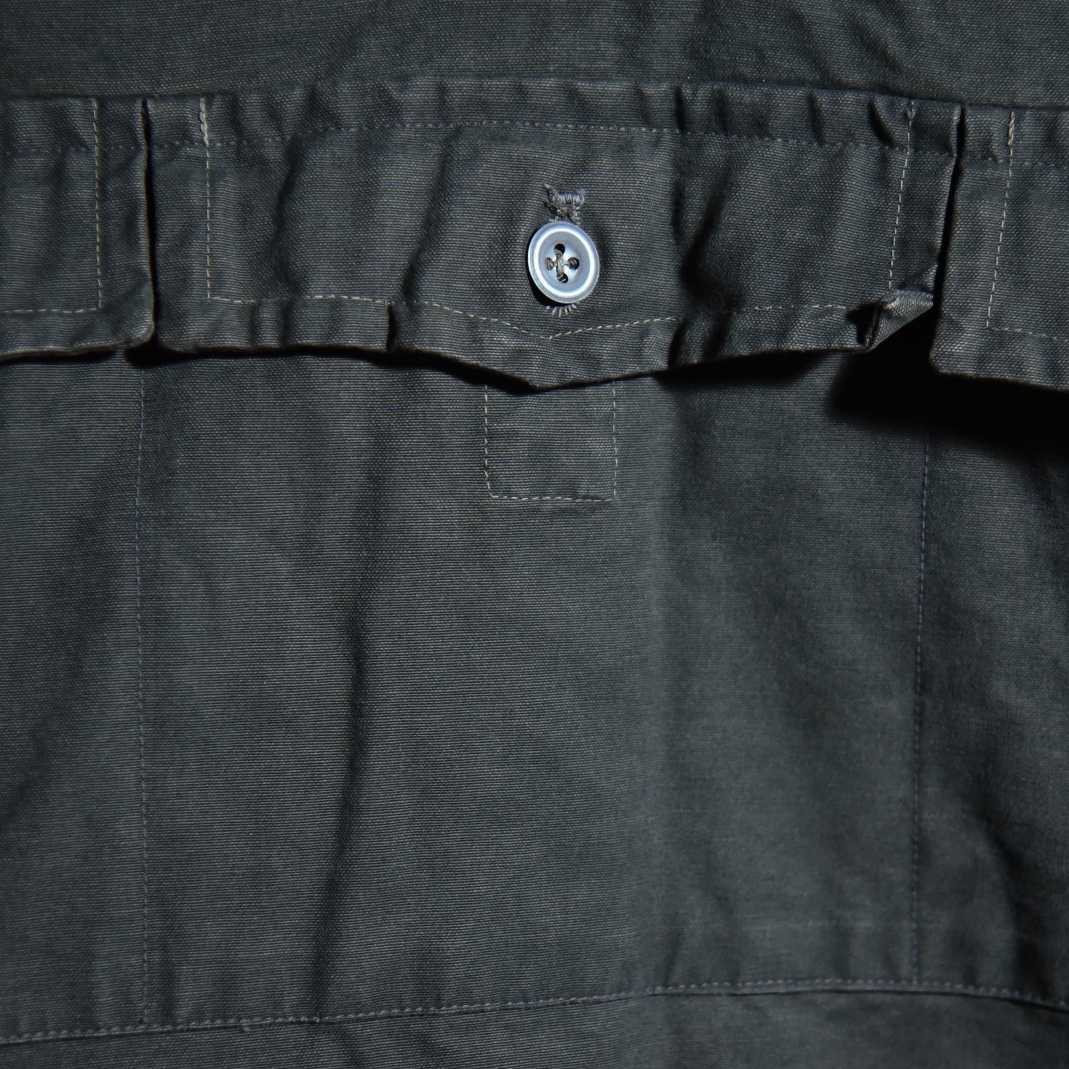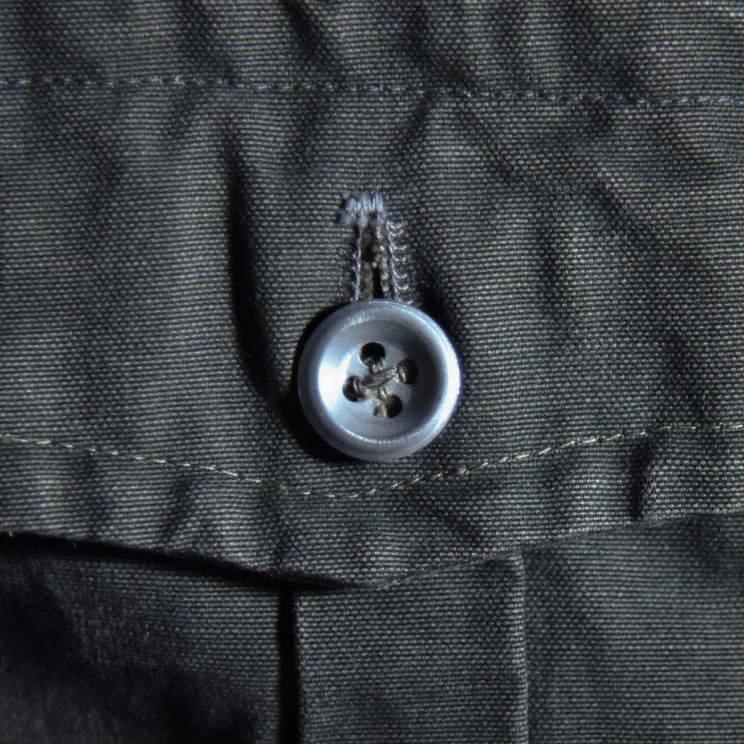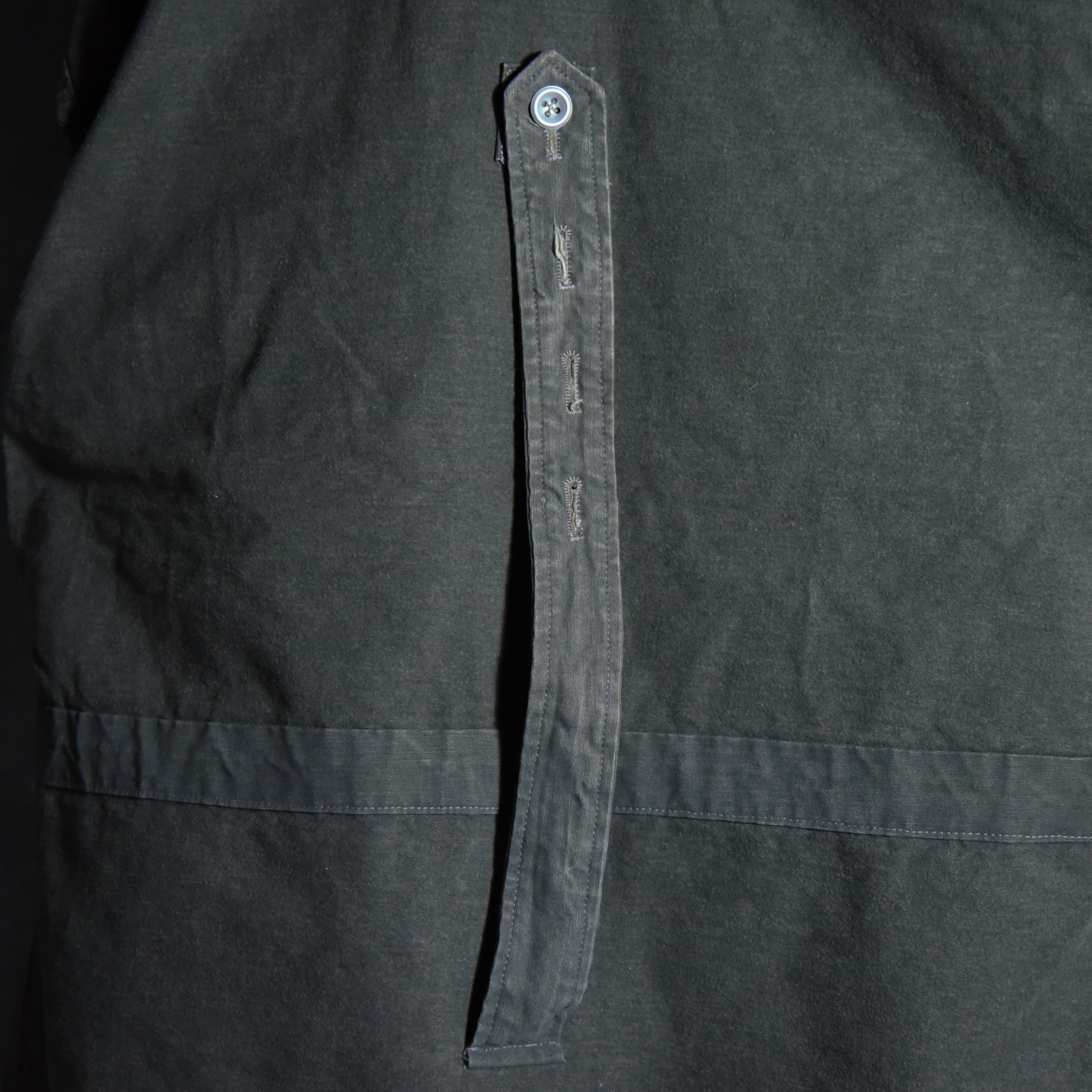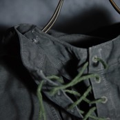 ボタンはアルパインアイテムにはほとんど見られないメタルボタンですが、同様のものが40年代のドイツ軍のテントなどで使われており、ボタンホールや菊穴は全て手縫い、カラーはオリーブを黒染めした際に染まりきらずに僅かに緑味が残ったブラックといった色味ですが、コットンのステッチが黒く染まっていないことから後染めでないオリジナルカラーであることが明白な点、その他生地感や縫製など総合的に判断すると、テストサンプルや、生産されたものの納入されなかったアイテム、もしくは40年代の僅かな期間のみ生産されていた個体であると推察できます。
