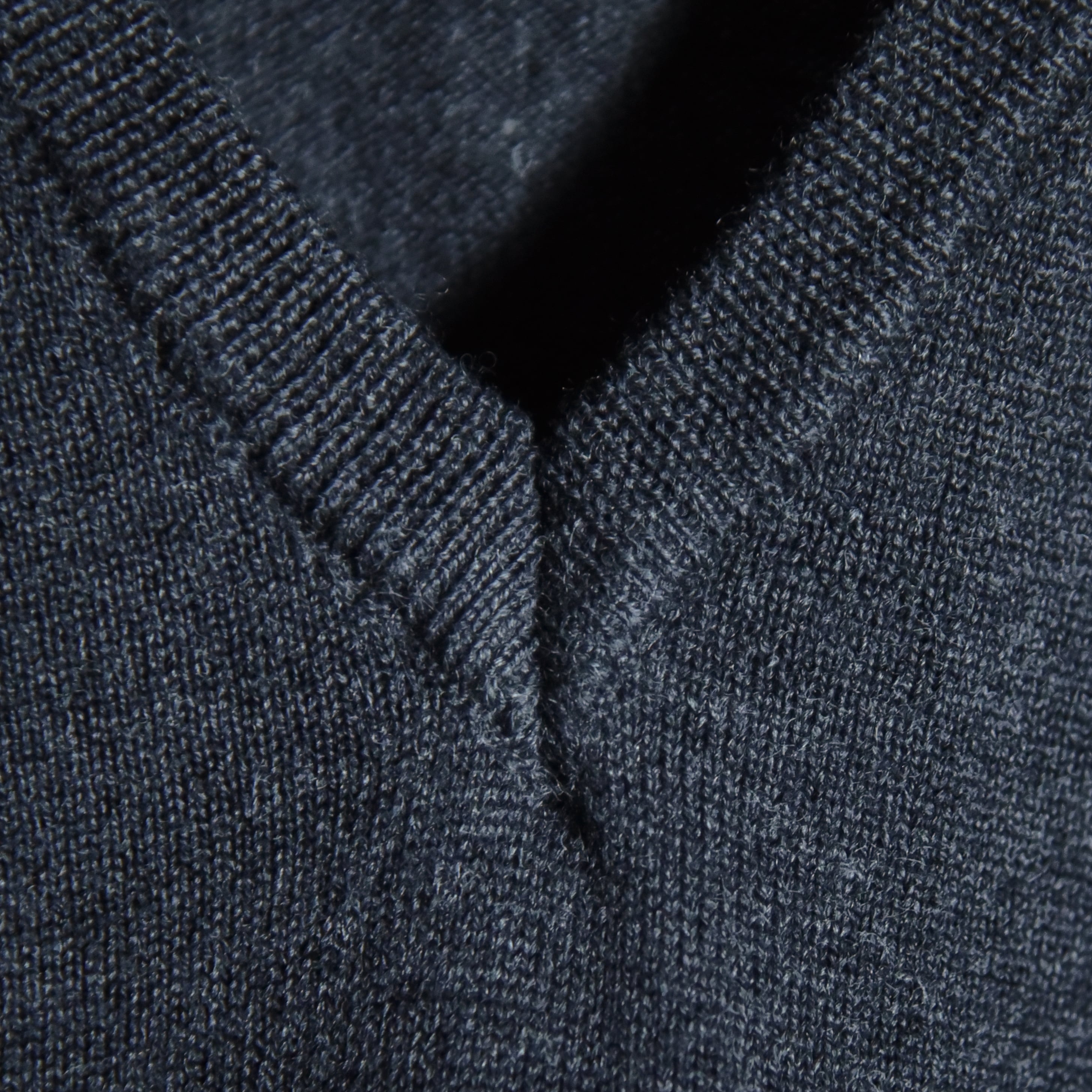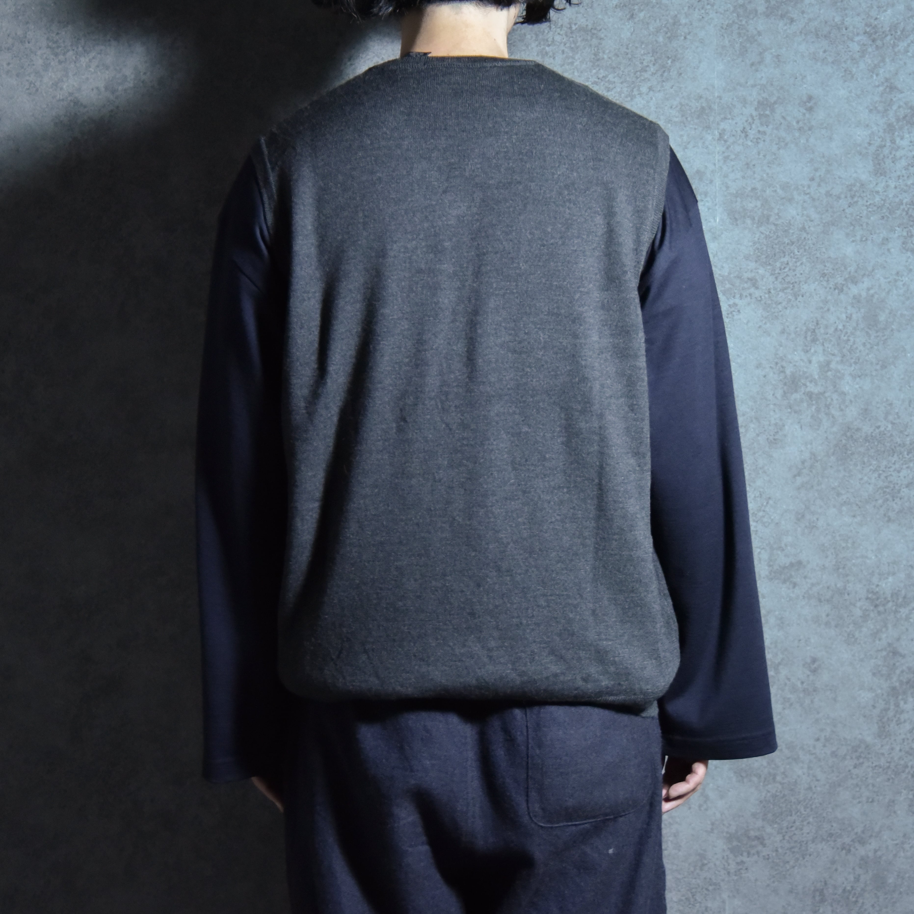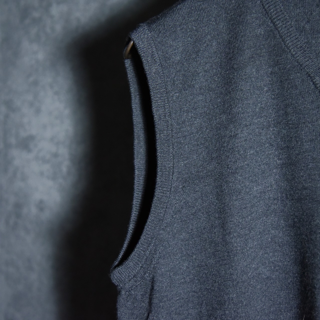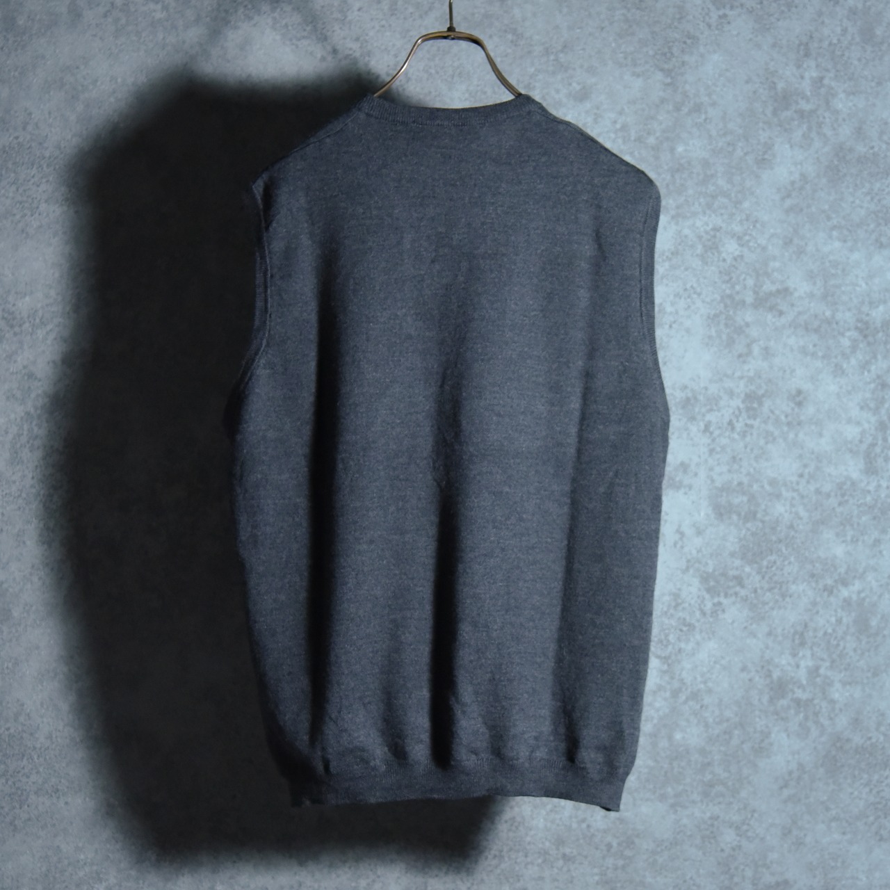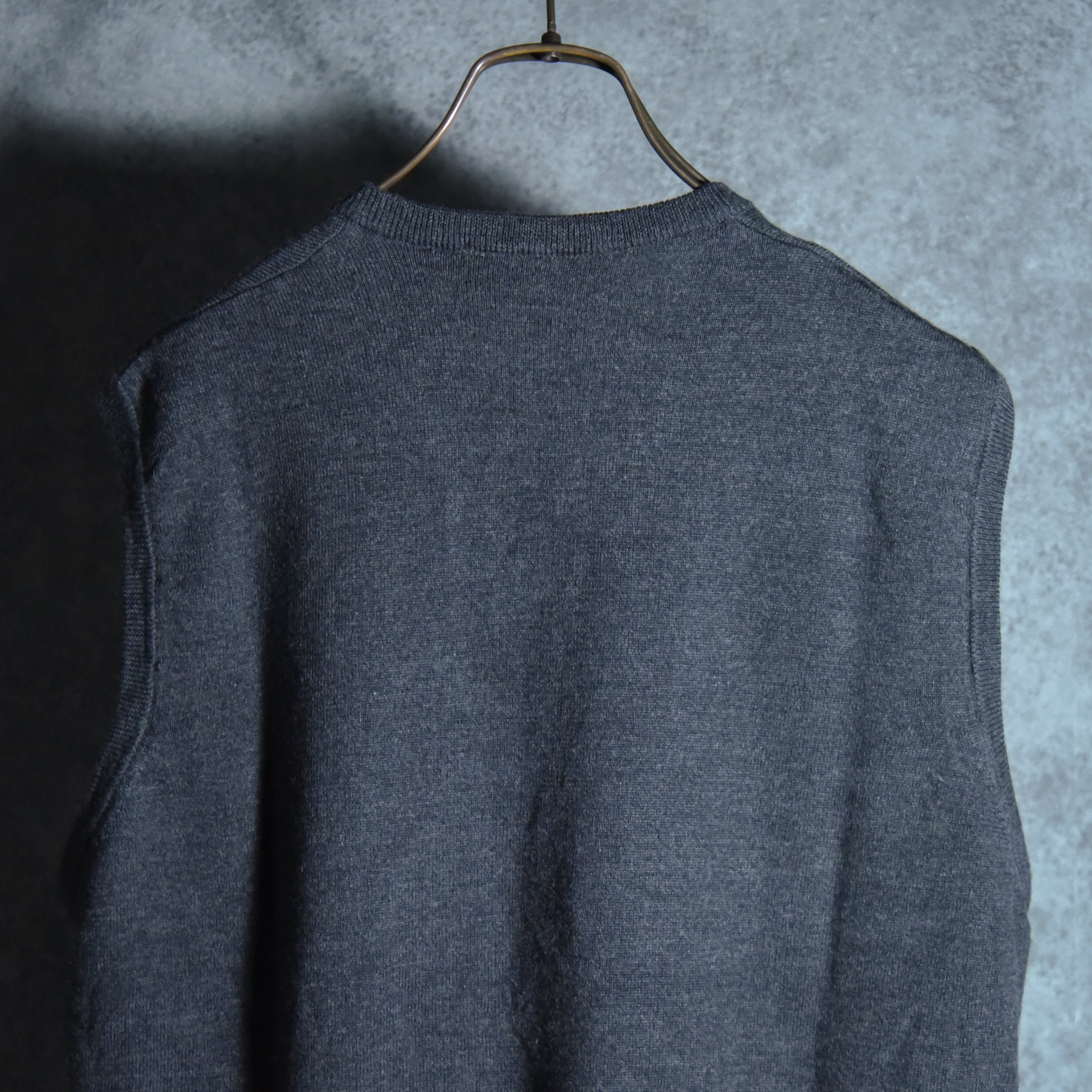シンプルな天竺編みのニットベストで、襟周りとアームホール、裾はリブ仕様になっており、ベーシックなチャコールグレーのカラーも相まってコーディネートの幅が広い一着です。