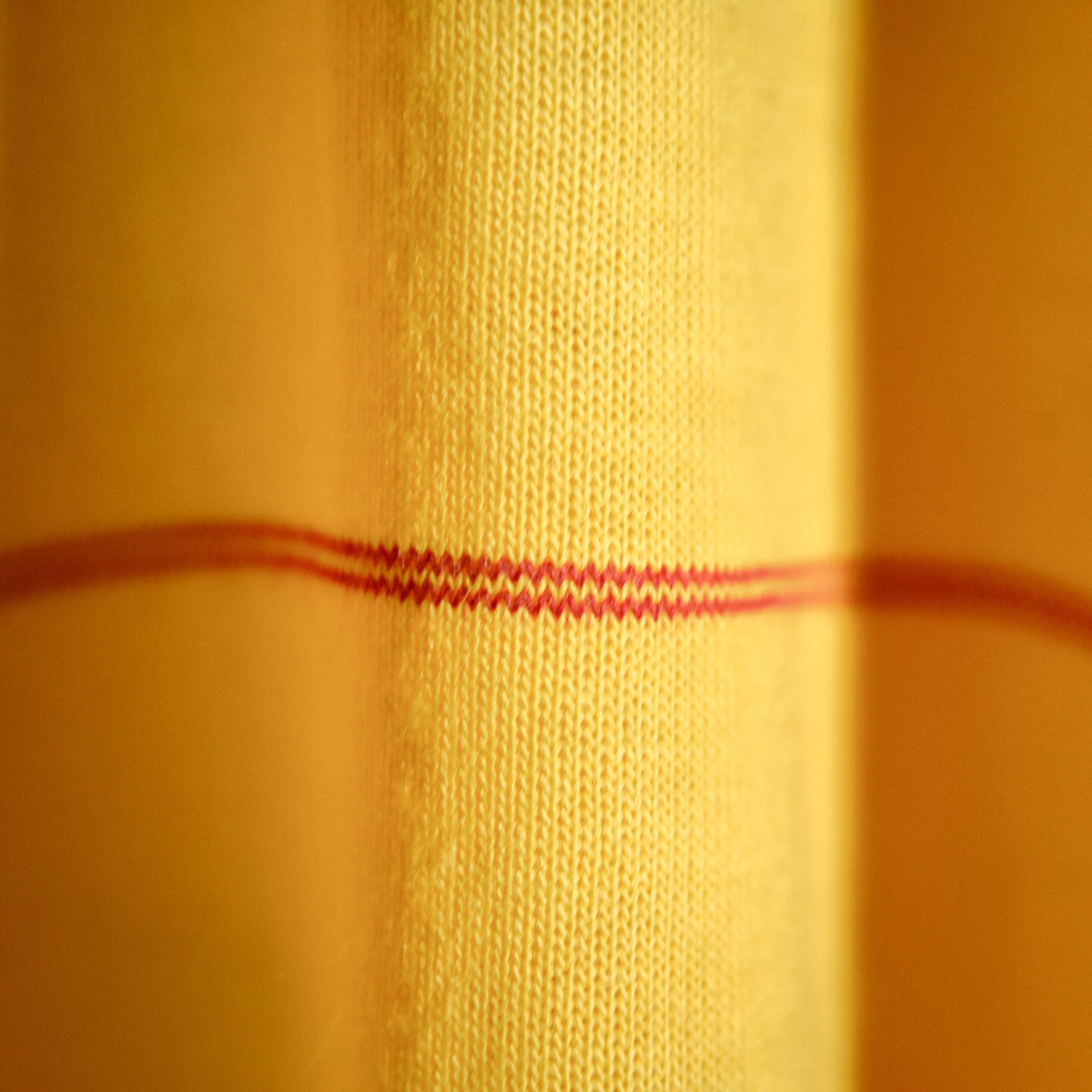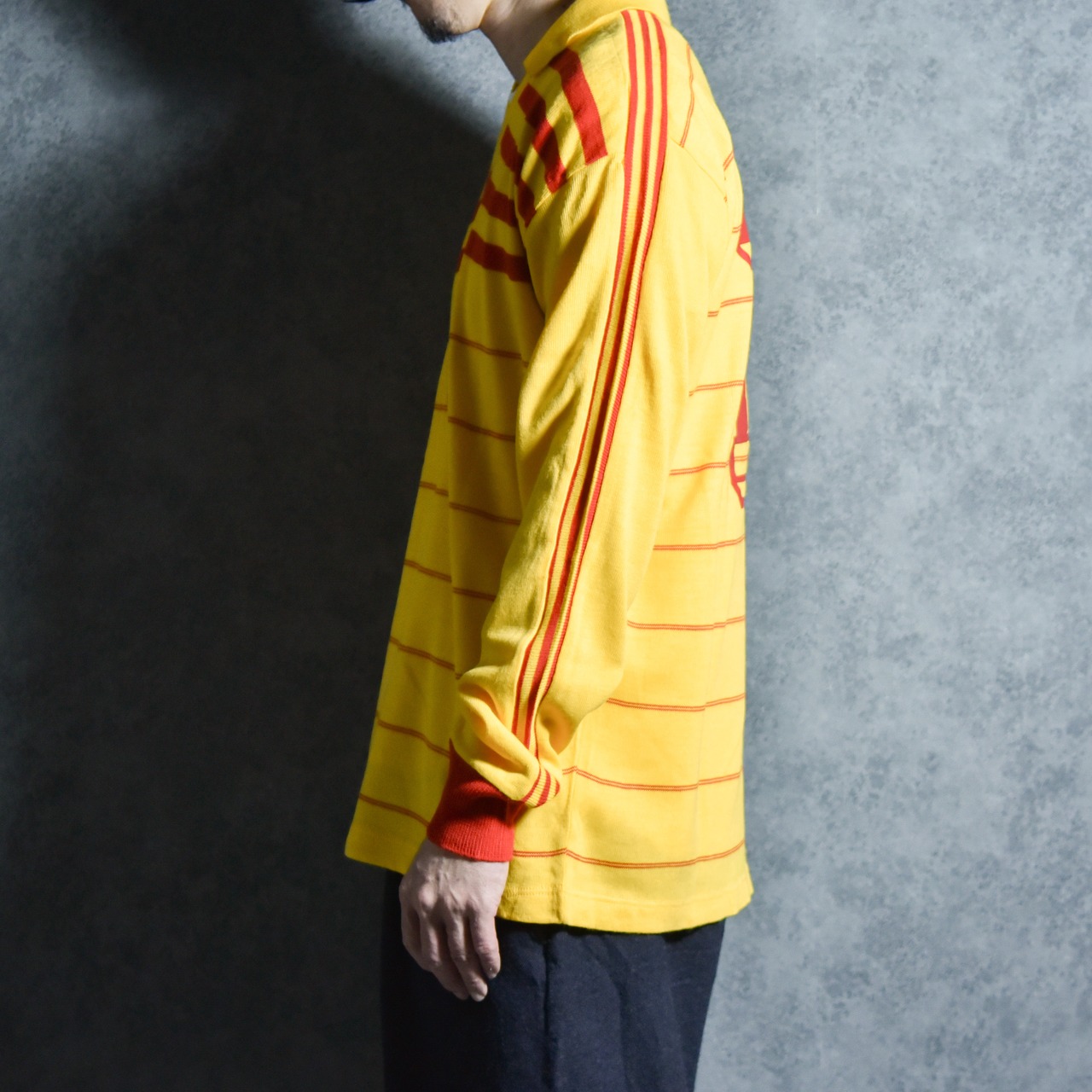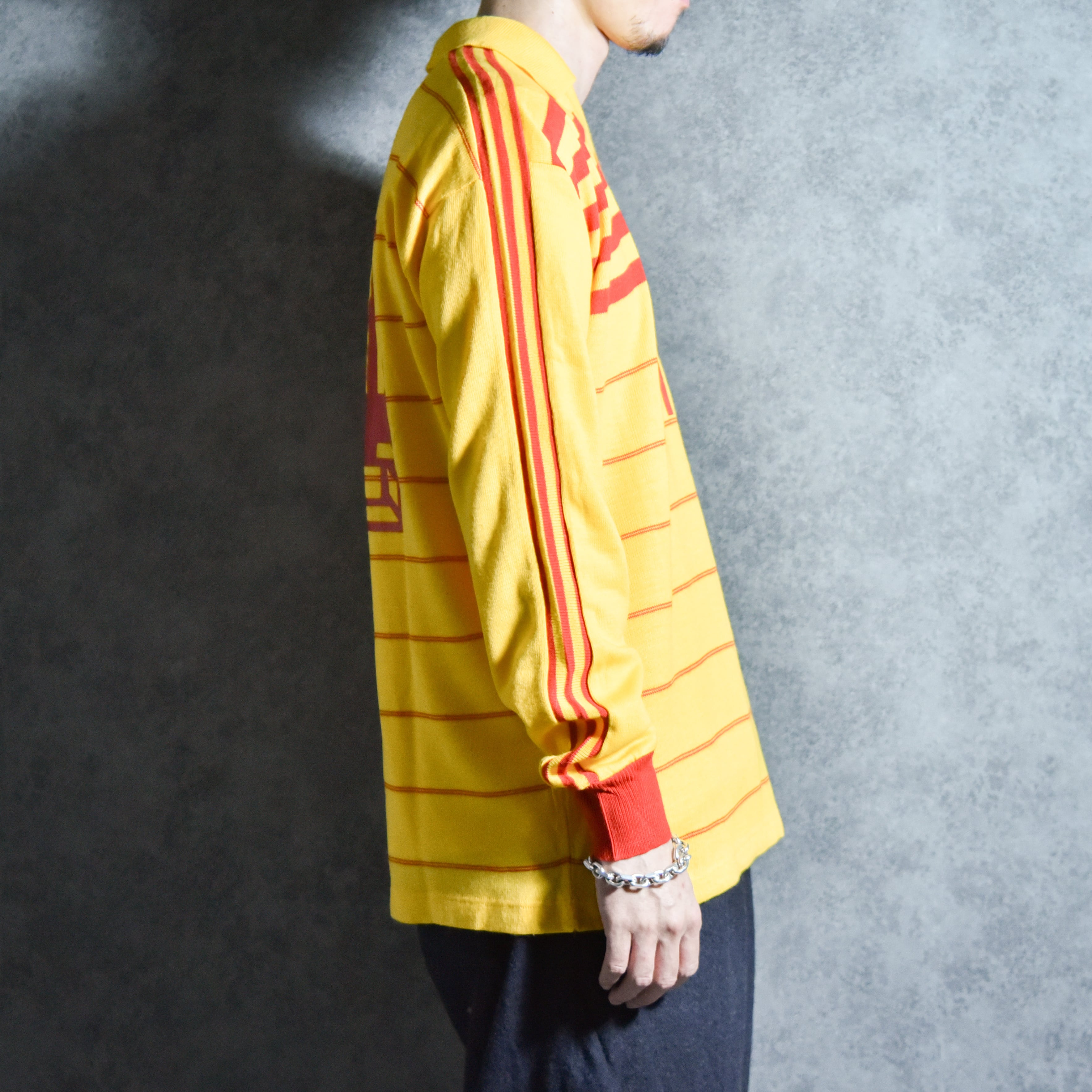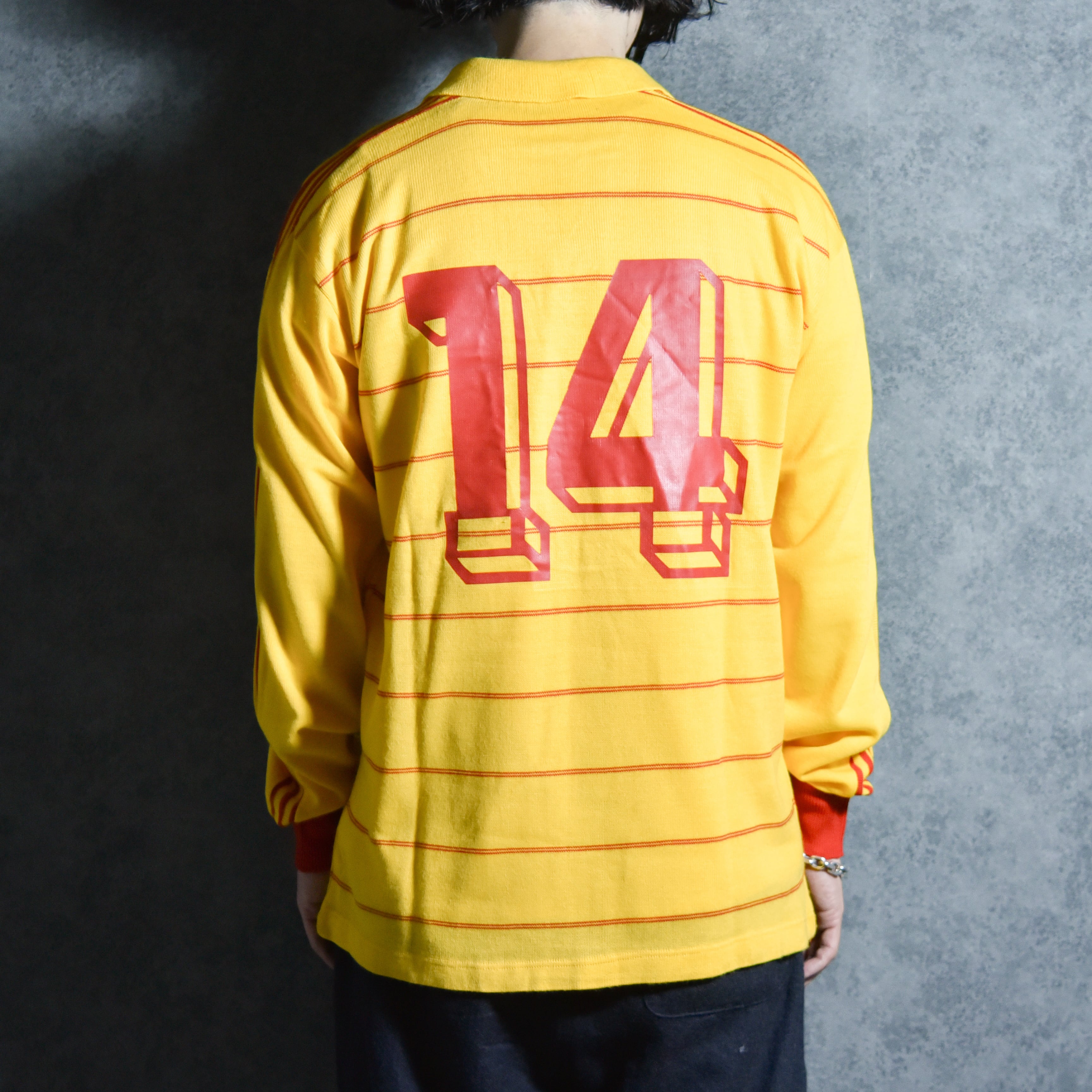ディテールはVネックに小さい襟が付き袖口はリブ仕様、肩から胸にかけては太ピッチ、胸から下は細ピッチのボーダーで、袖にも3本のラインが入り、企業ロゴと背番号はフォントの異なるラバープリントのグッドデザインです。