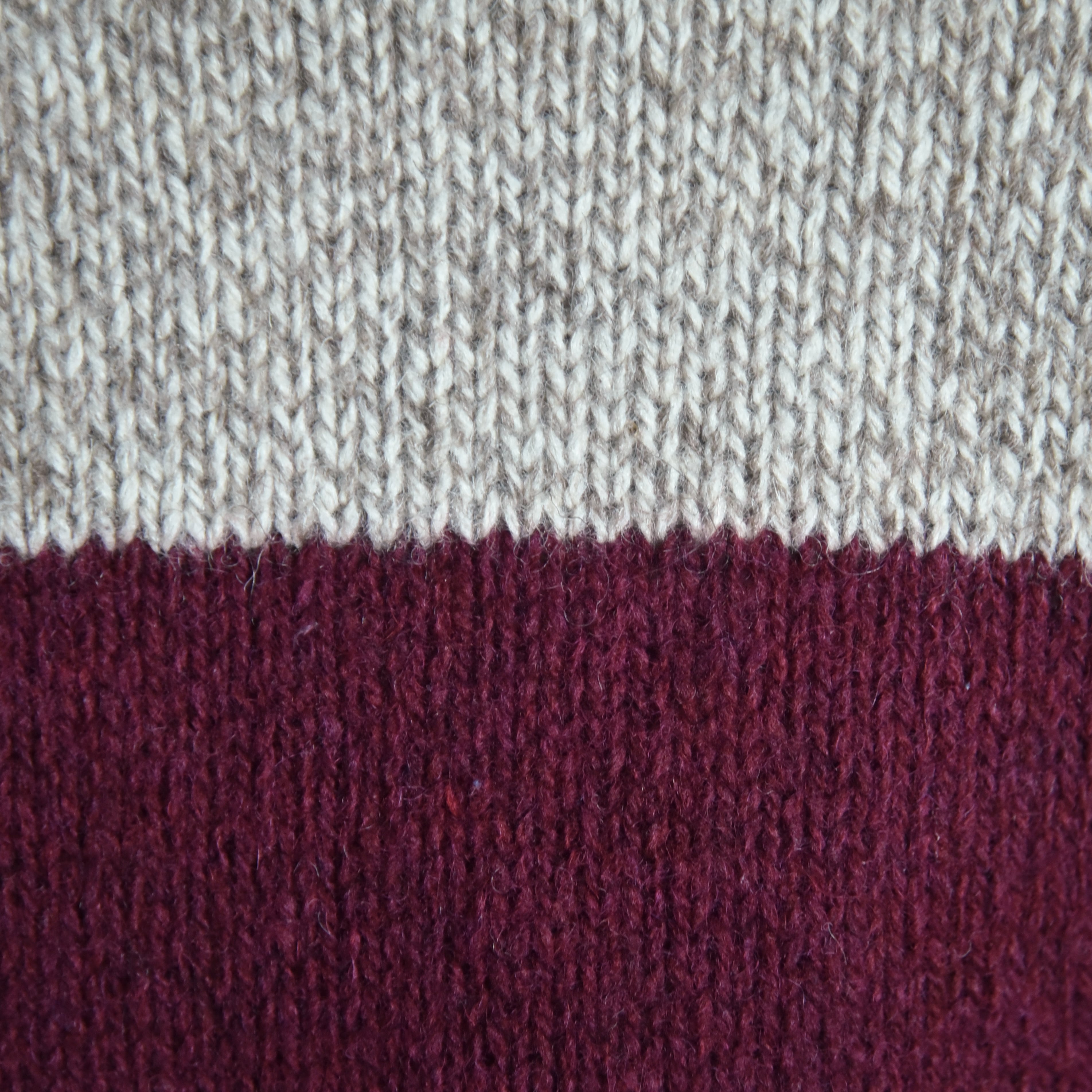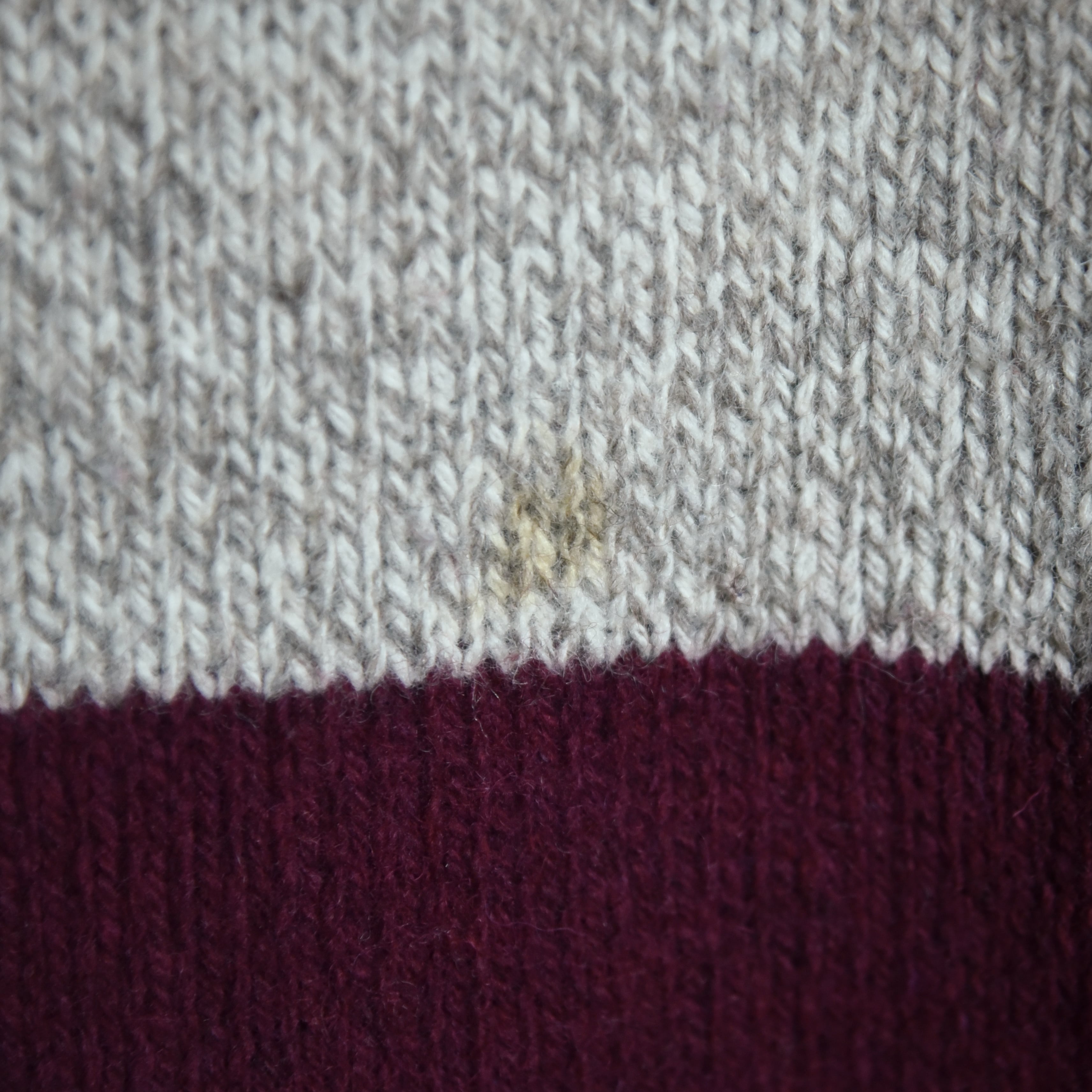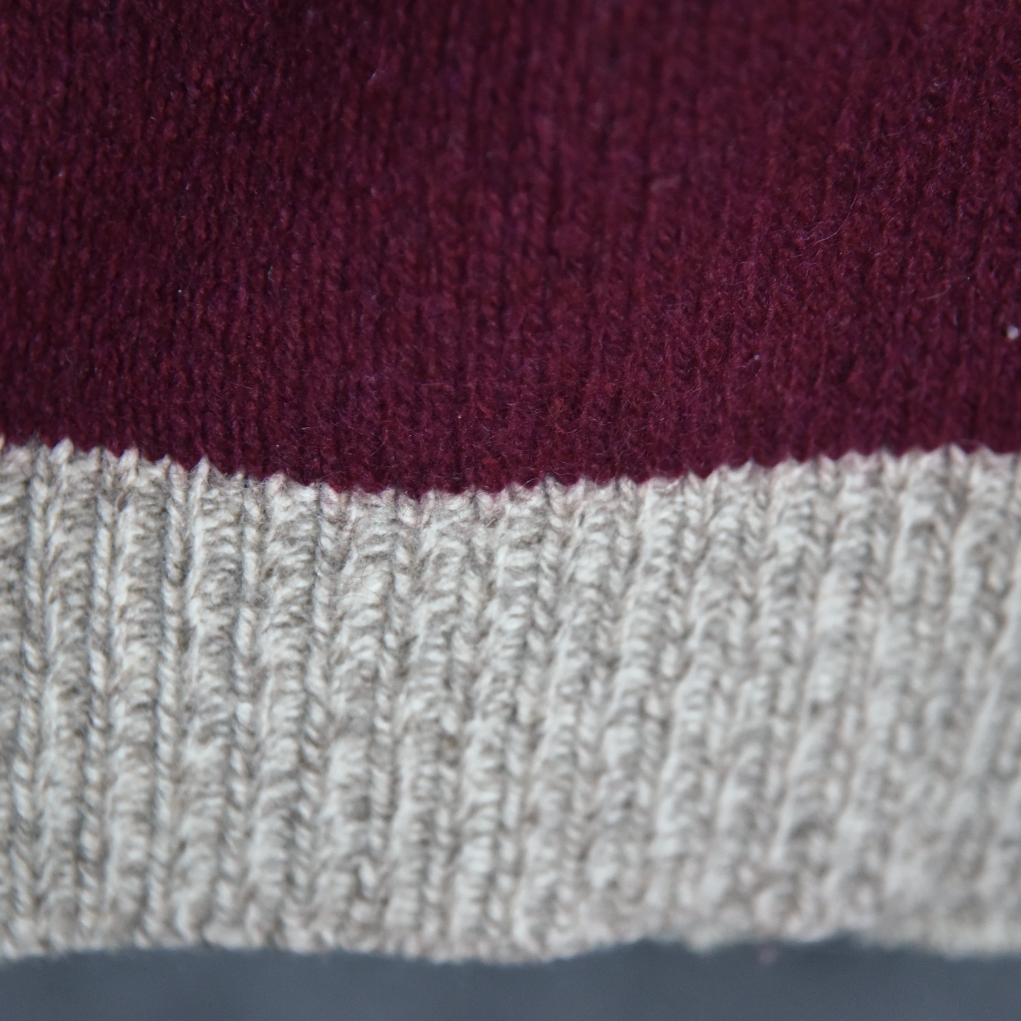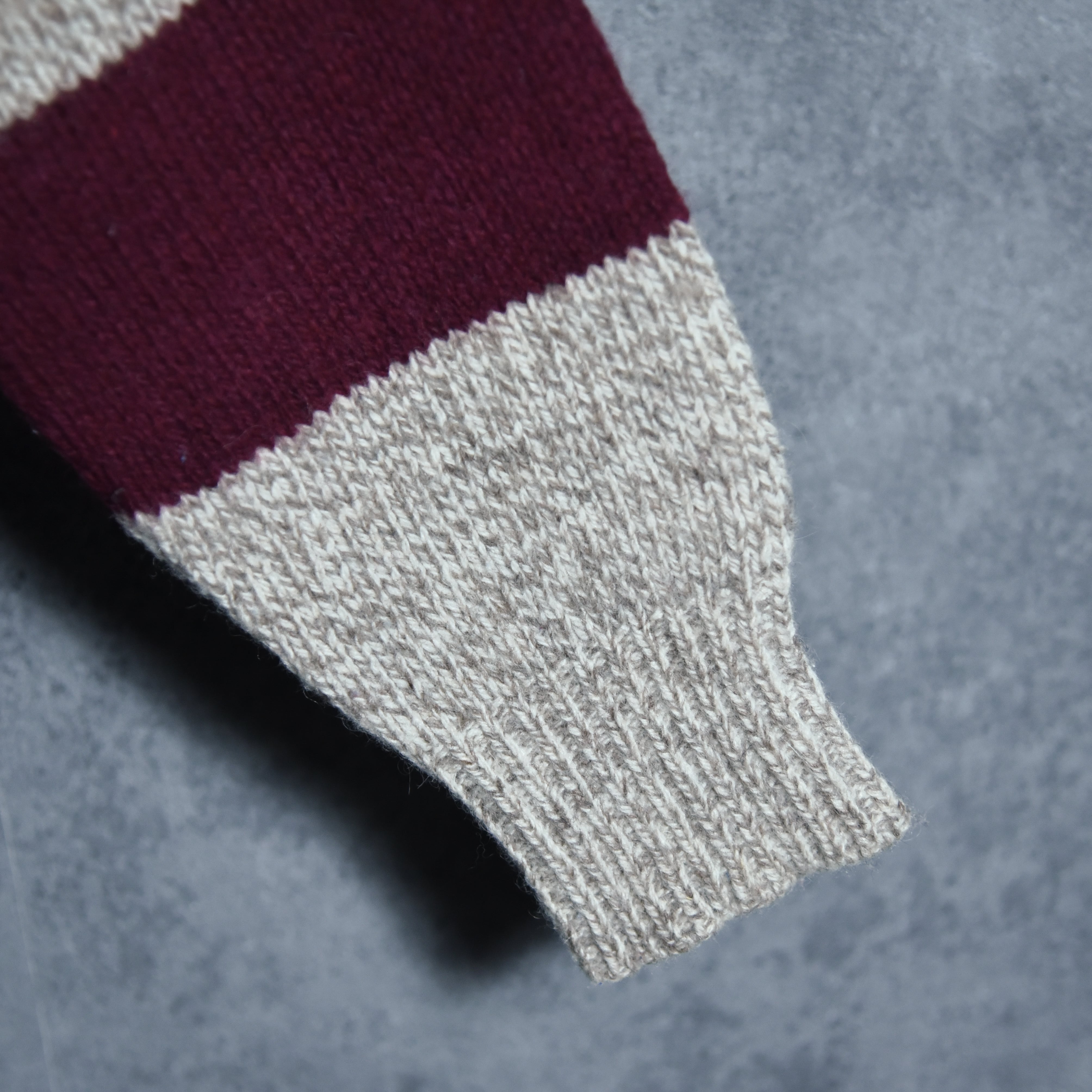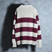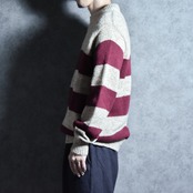 ボーダーのカットソーなどは統一感覚のボーダーを言葉通り裁断して縫い合わせるのに対して、ニットは一着づつのバランスで編み上げるため、ボーダーではあるもののも首周りにベースカラーの余白を大きく取るなどカットソーではできないデザインにしているニットらしいアイテム。