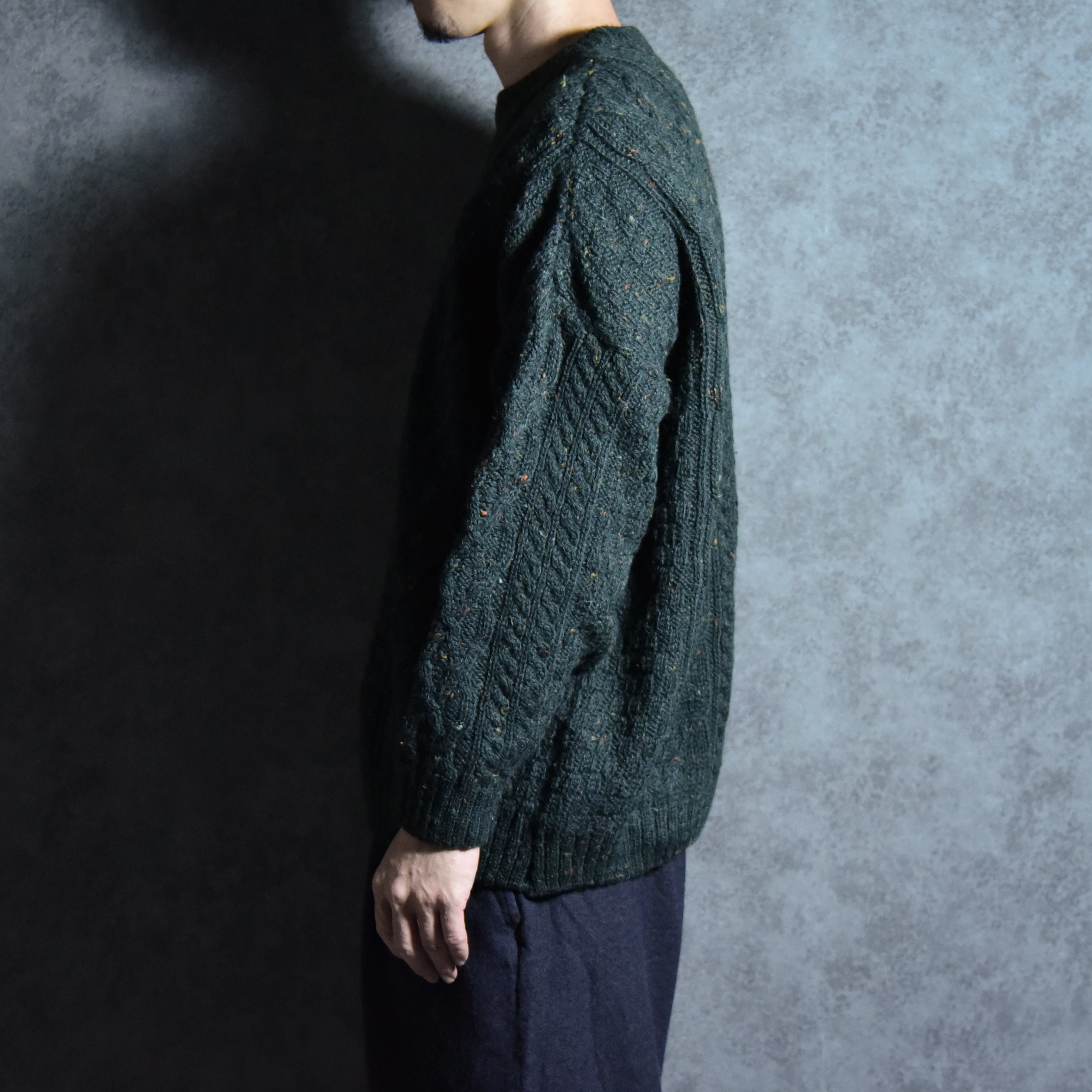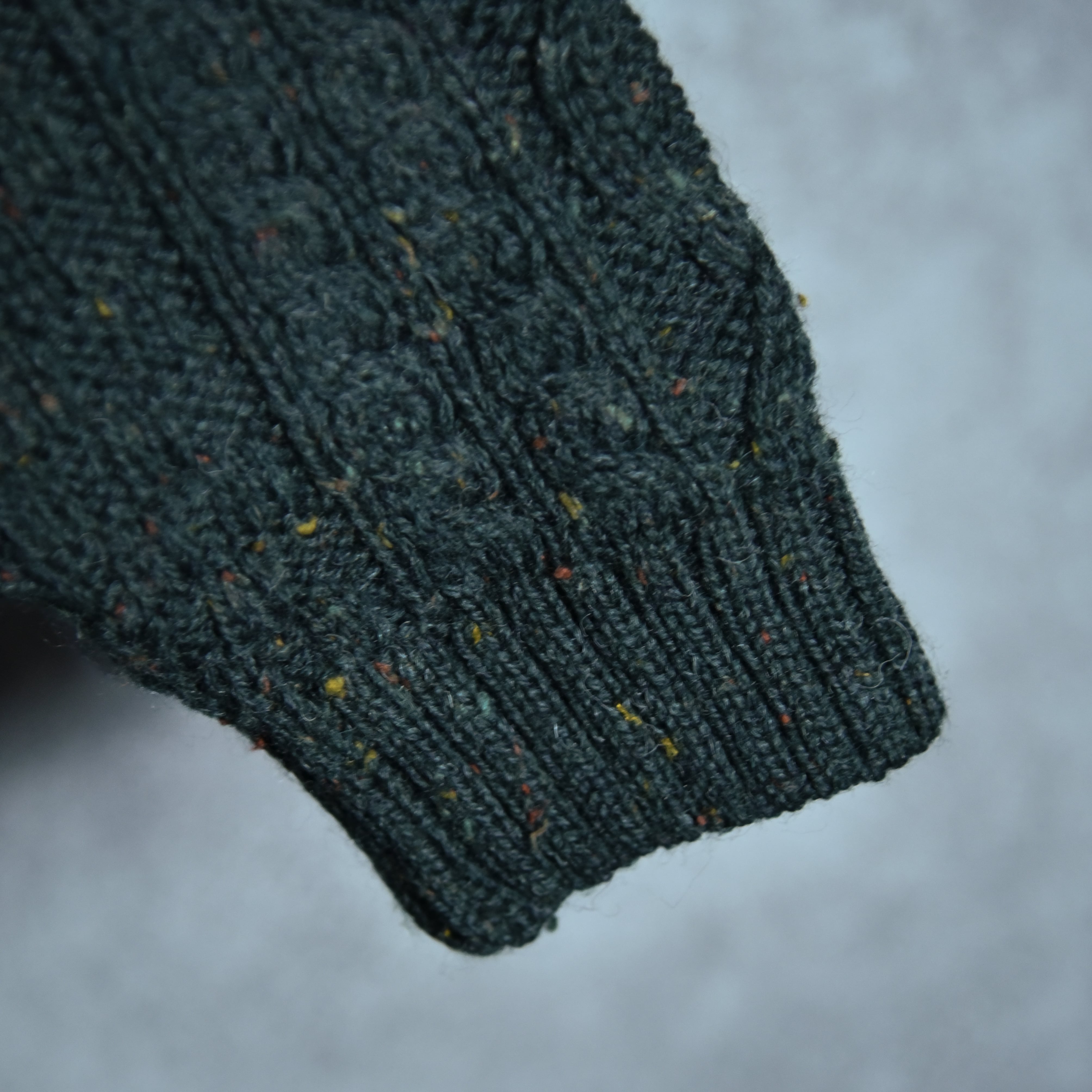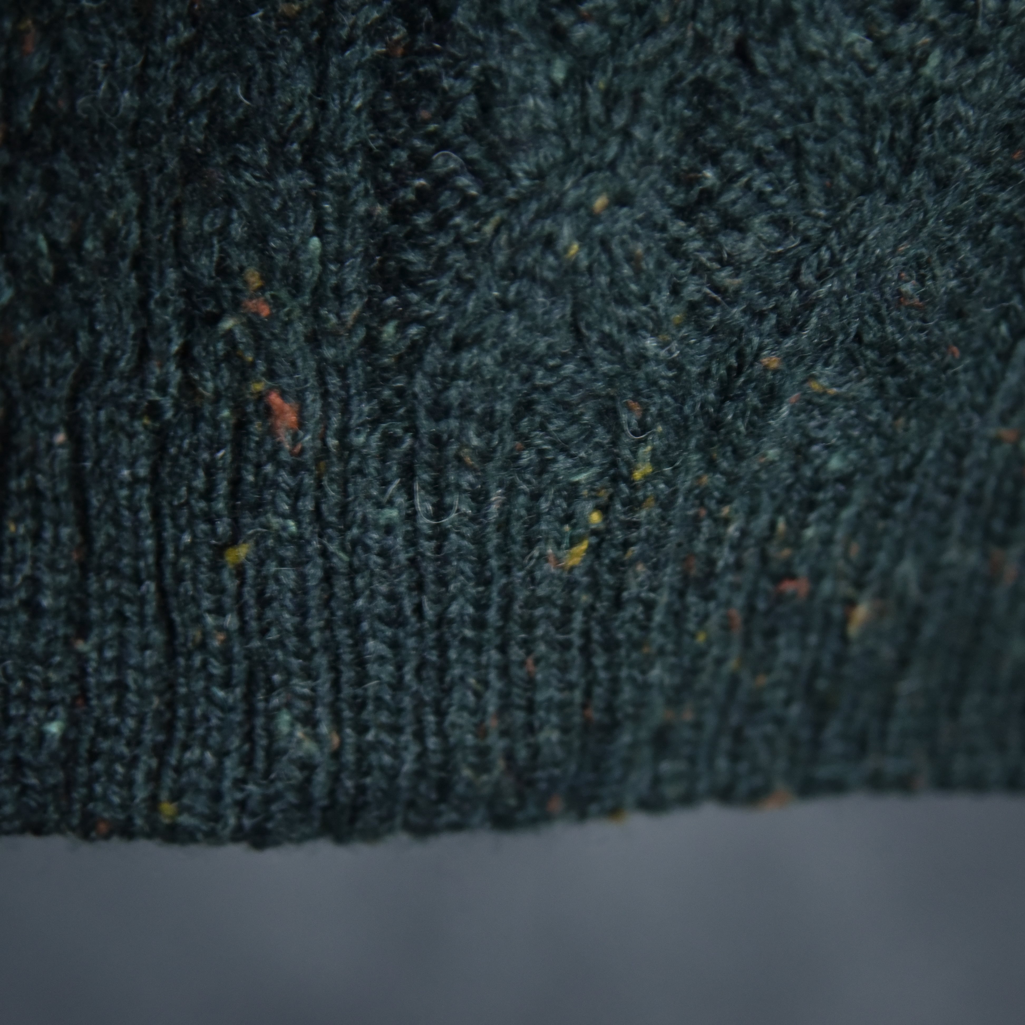 立体的で肉厚なな編み柄と、襟はダブルリブ、裾袖はシングルリブ、グリーンをベースに散りばめられた暖色カラーネップなど、作りとセンスの良さが感じられるグッドピース。
