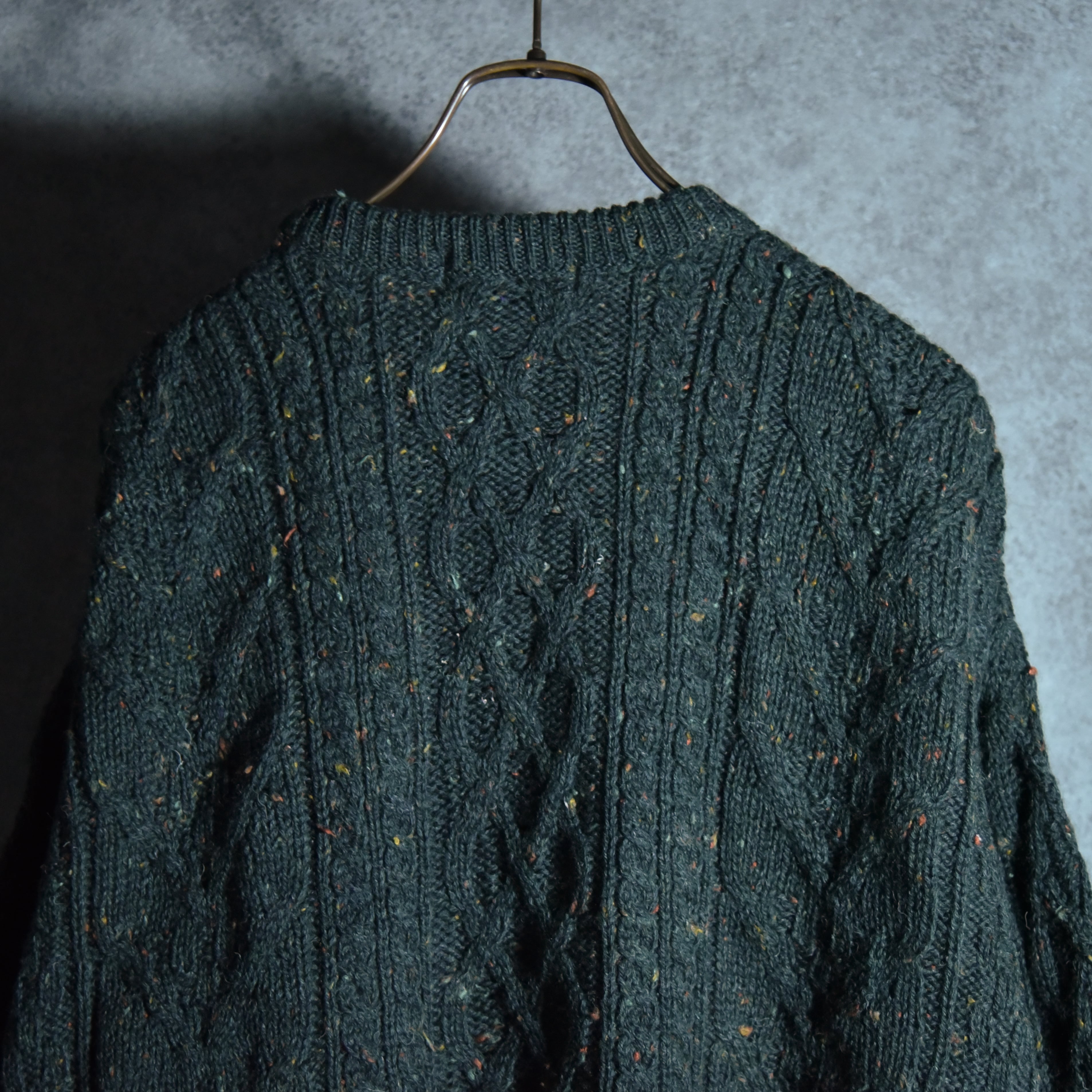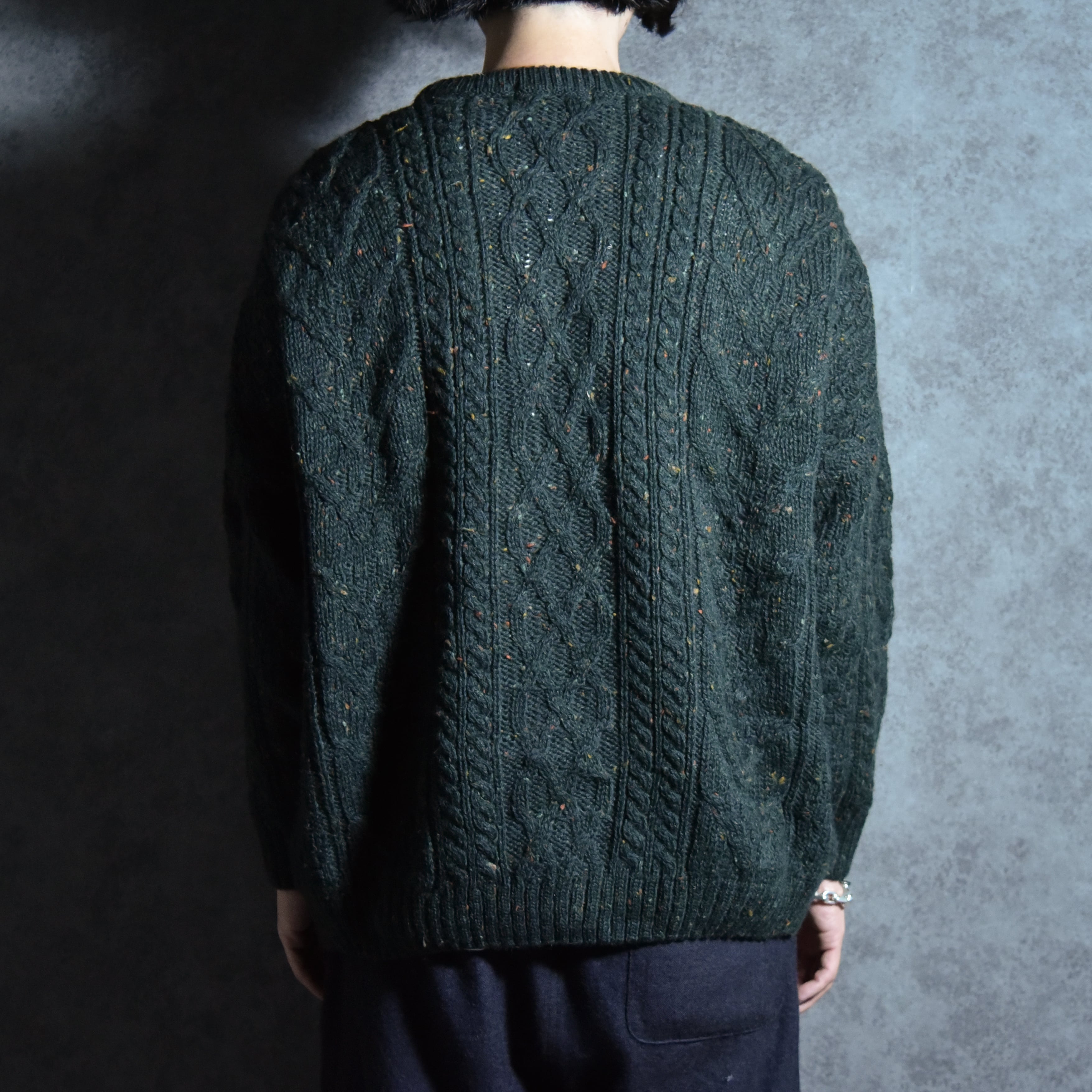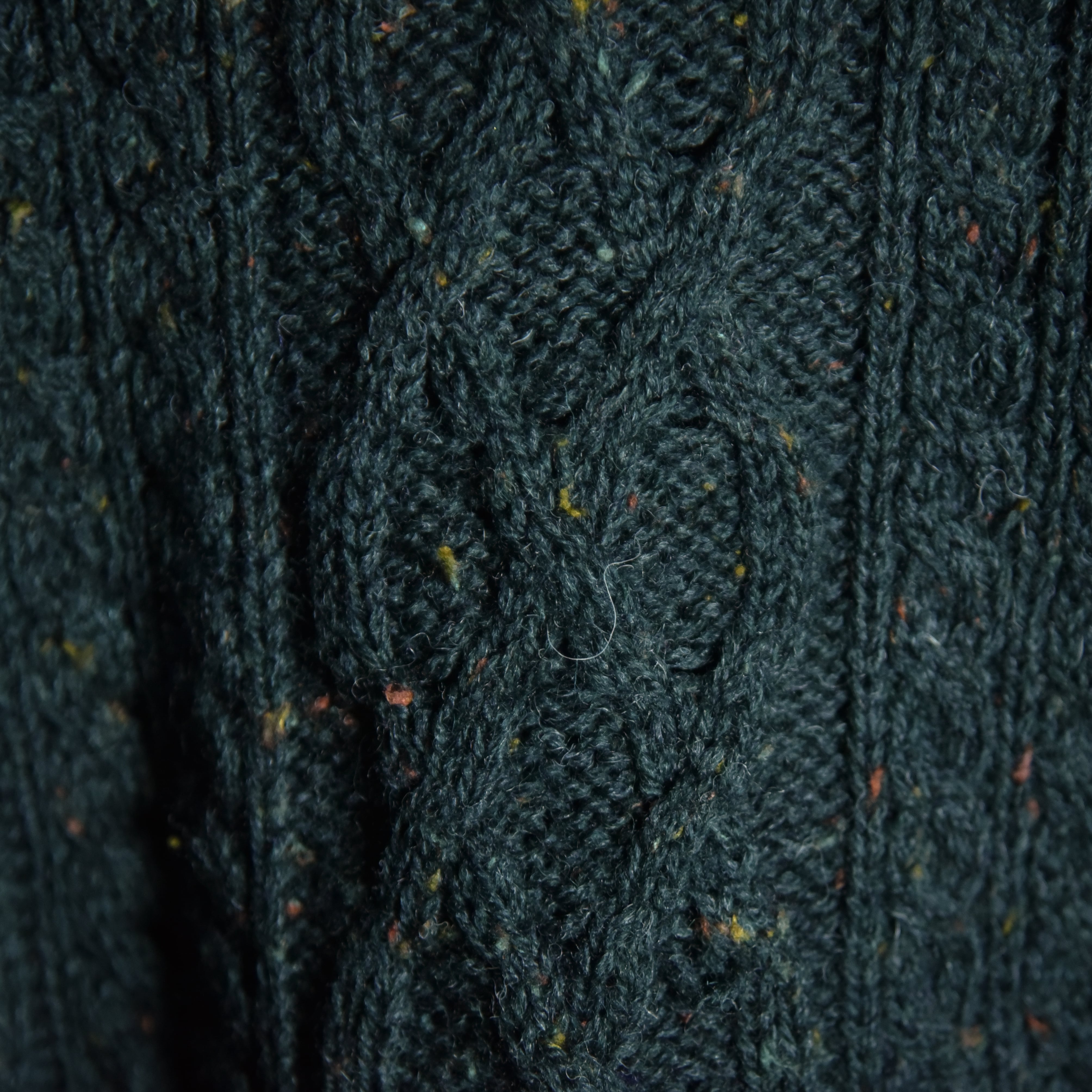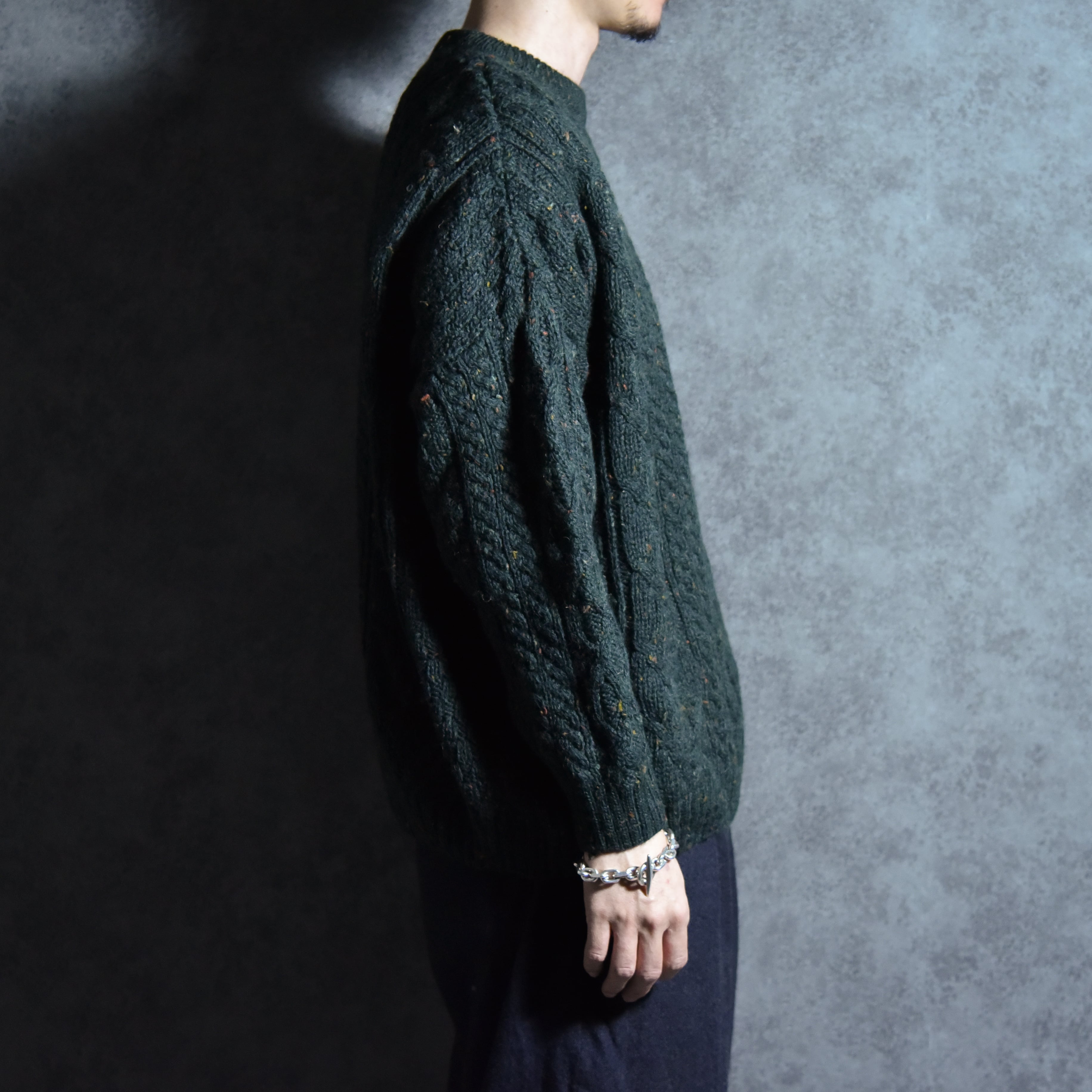 立体的で肉厚なな編み柄と、襟はダブルリブ、裾袖はシングルリブ、グリーンをベースに散りばめられた暖色カラーネップなど、作りとセンスの良さが感じられるグッドピース。