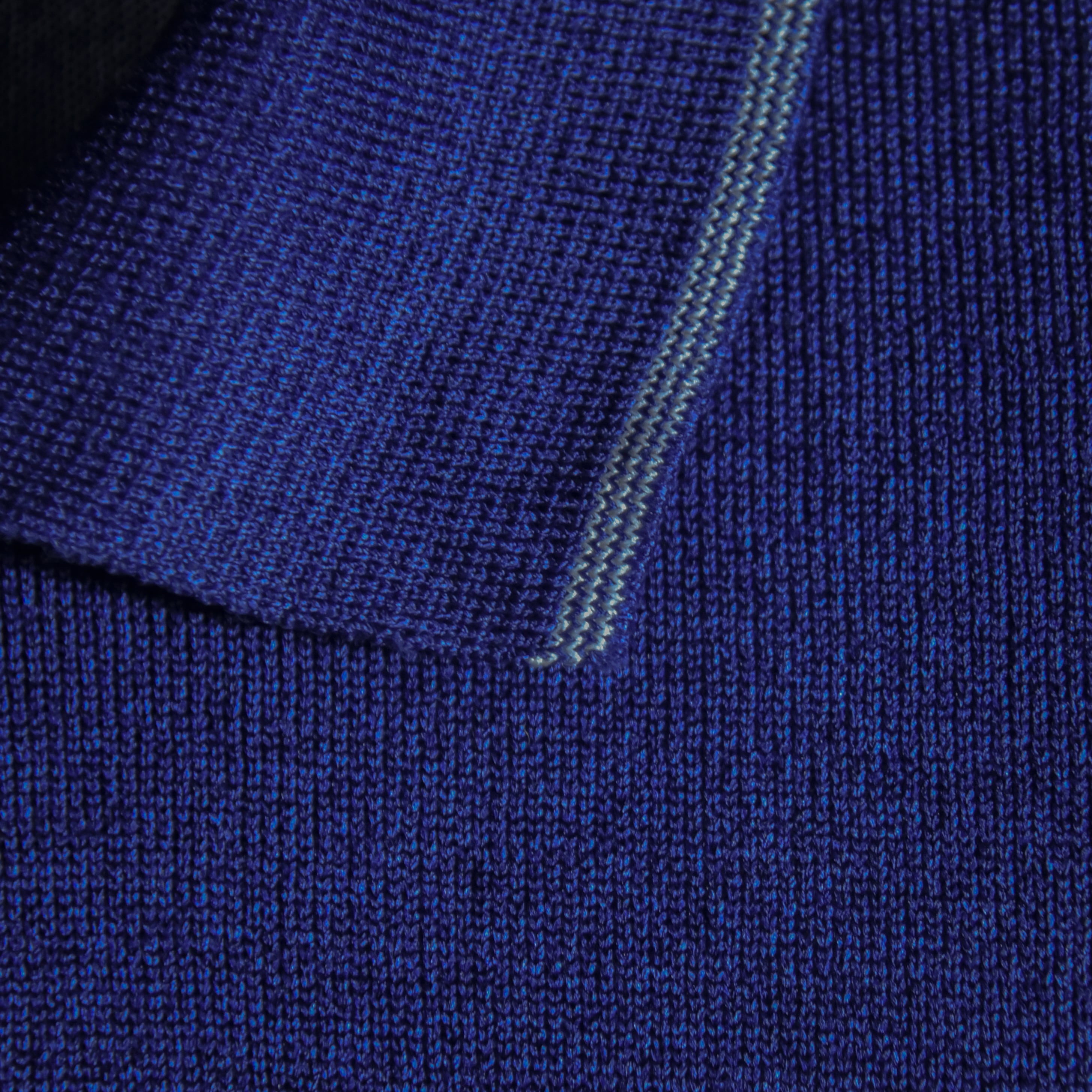襟、前立て、ポケット部分はホワイトのラインの編み出しの総針パーツが使われており、ネイビーのボディのアクセントとして機能している合理的なデザイン。