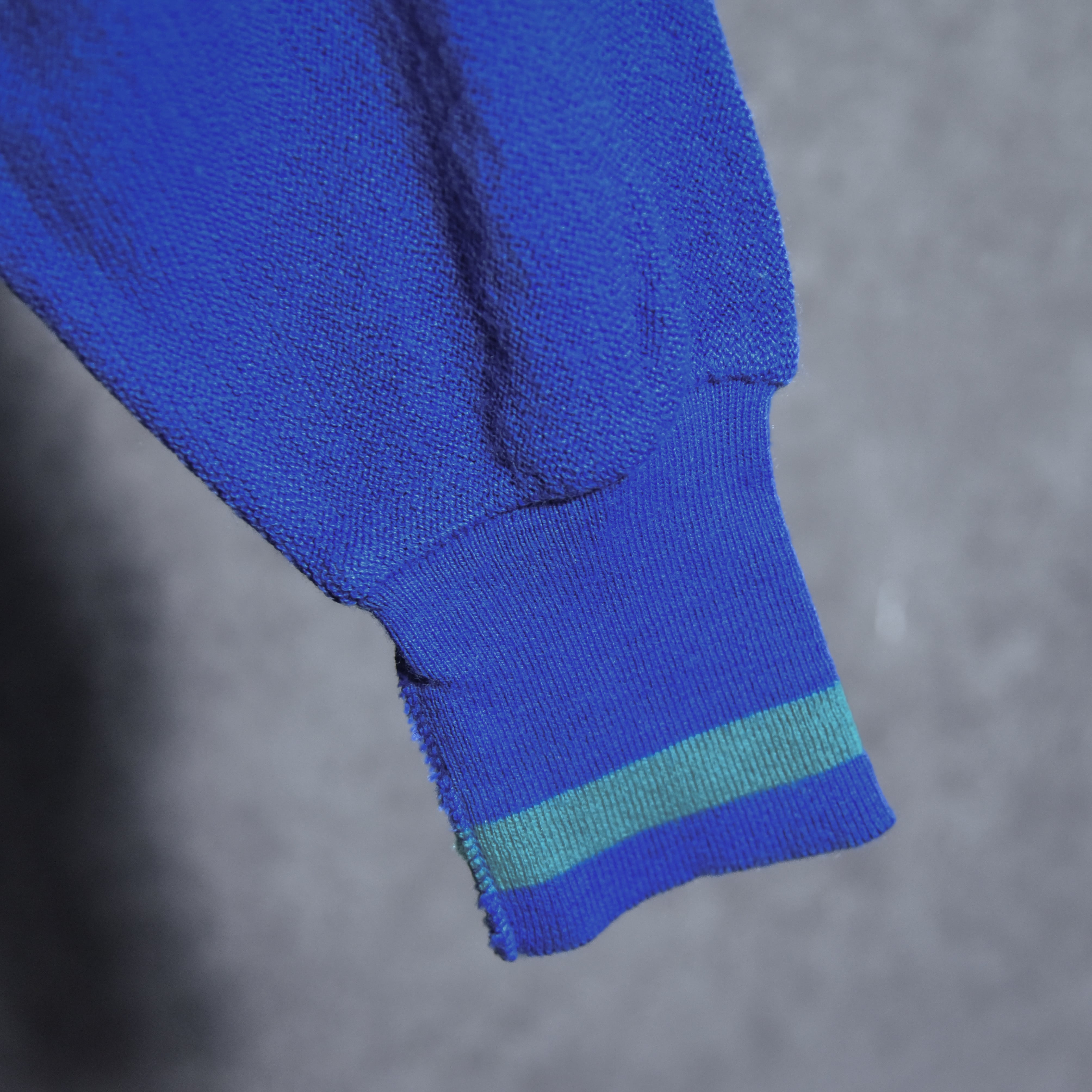 襟元、袖、裾のリブにはブルーのボディにグリーンのラインがアクセントとして入ったチルデンニットのようなブランドを象徴するようなデザインで、上品ながら力の抜けたプレッピーな一着。