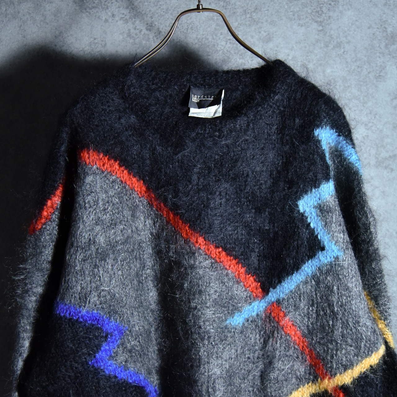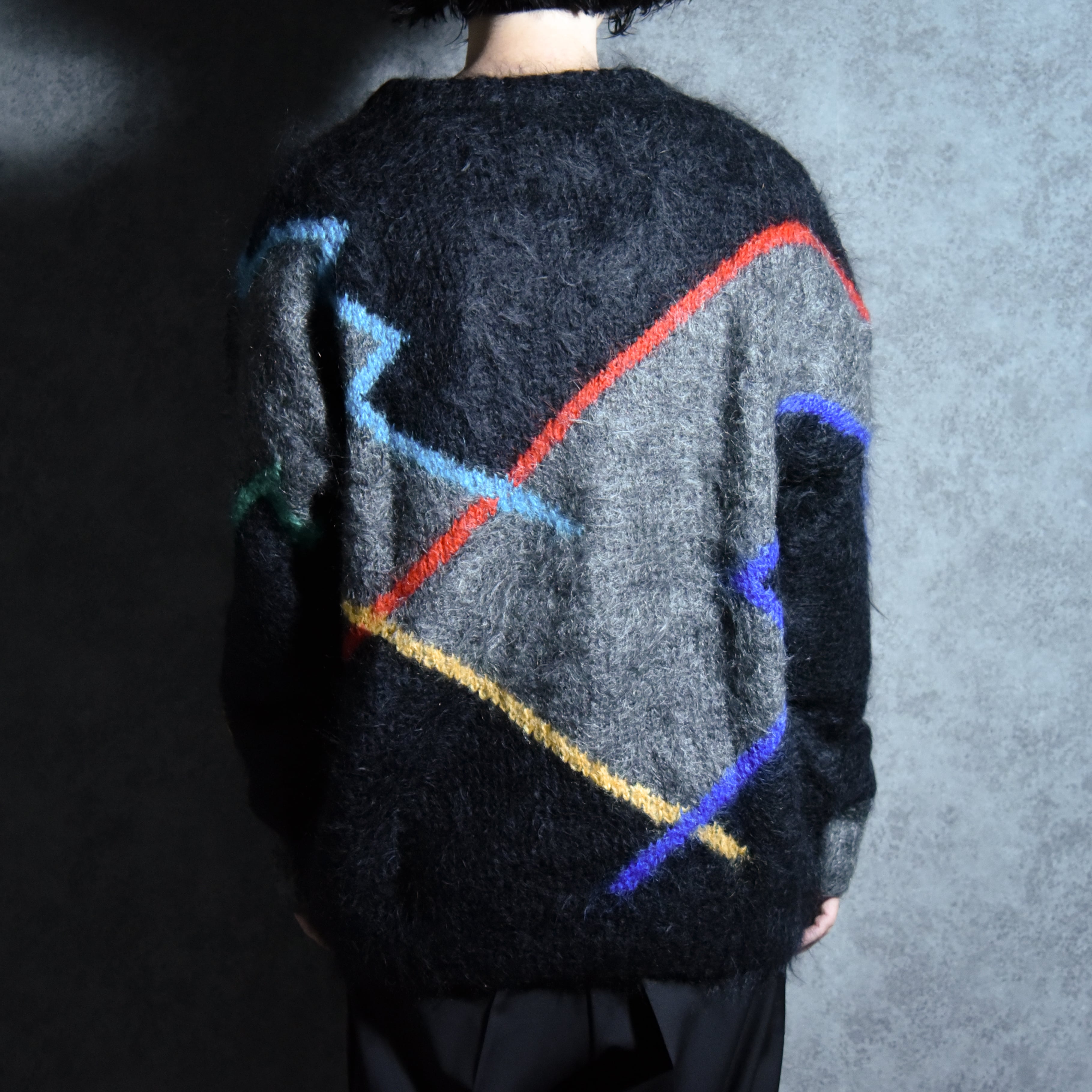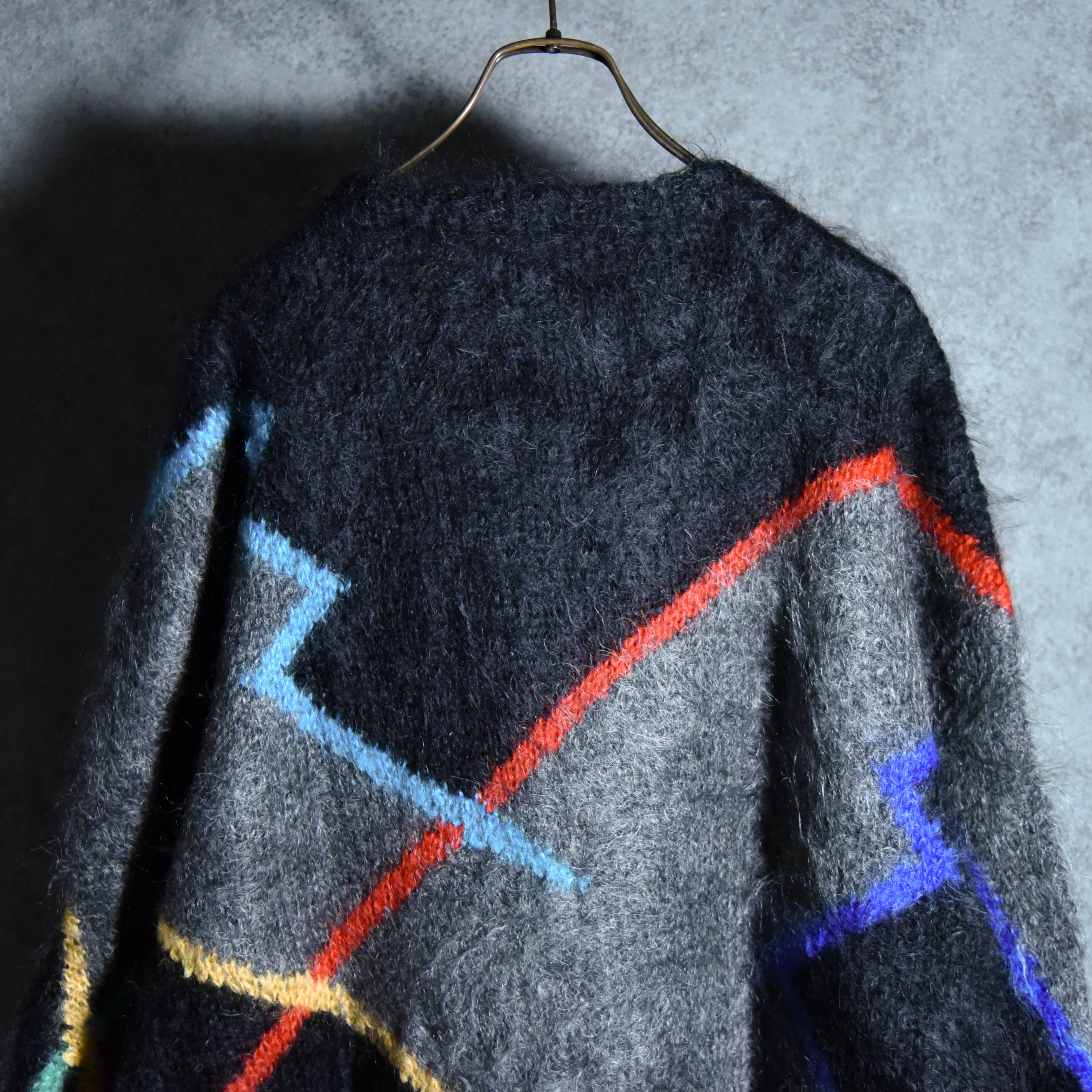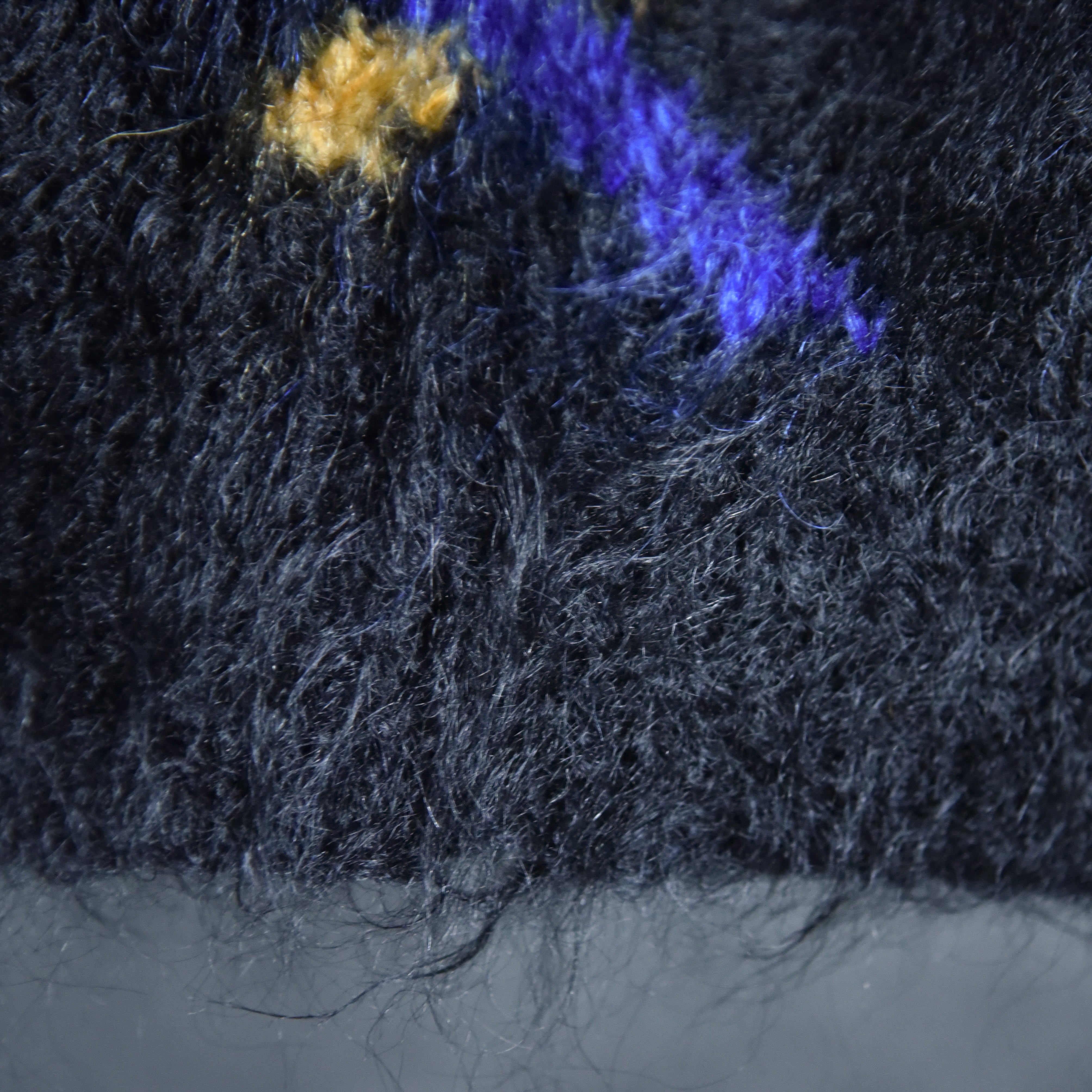 モヘヤ78%の高混率によるこの年代ならではの贅沢な毛足の長い素材感、ややモードな雰囲気のアブストラクトな幾何学柄で原色を効かせたカラーリングは80年代らしい雰囲気ながら古さを感じないアートピースのようなセンスのある一着。