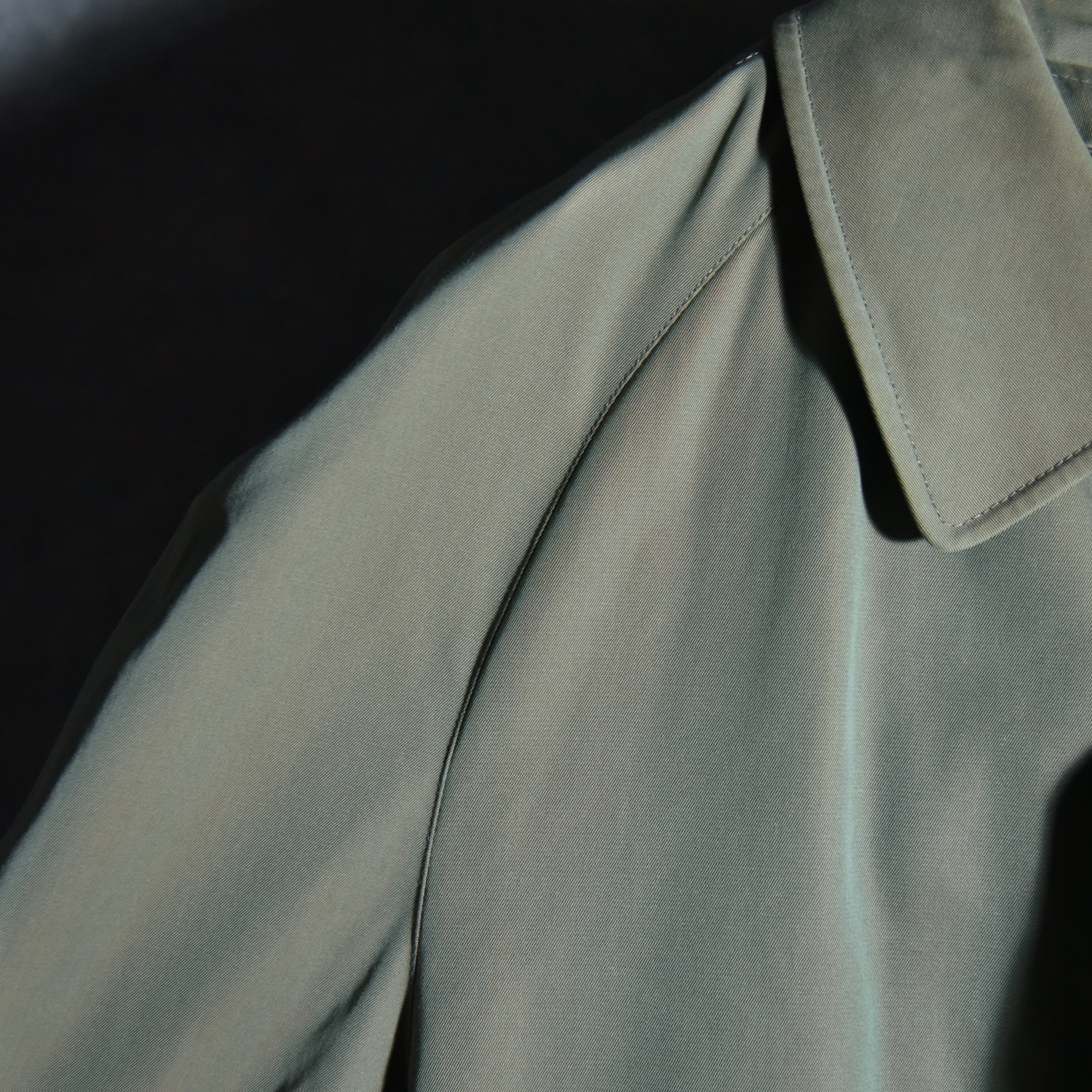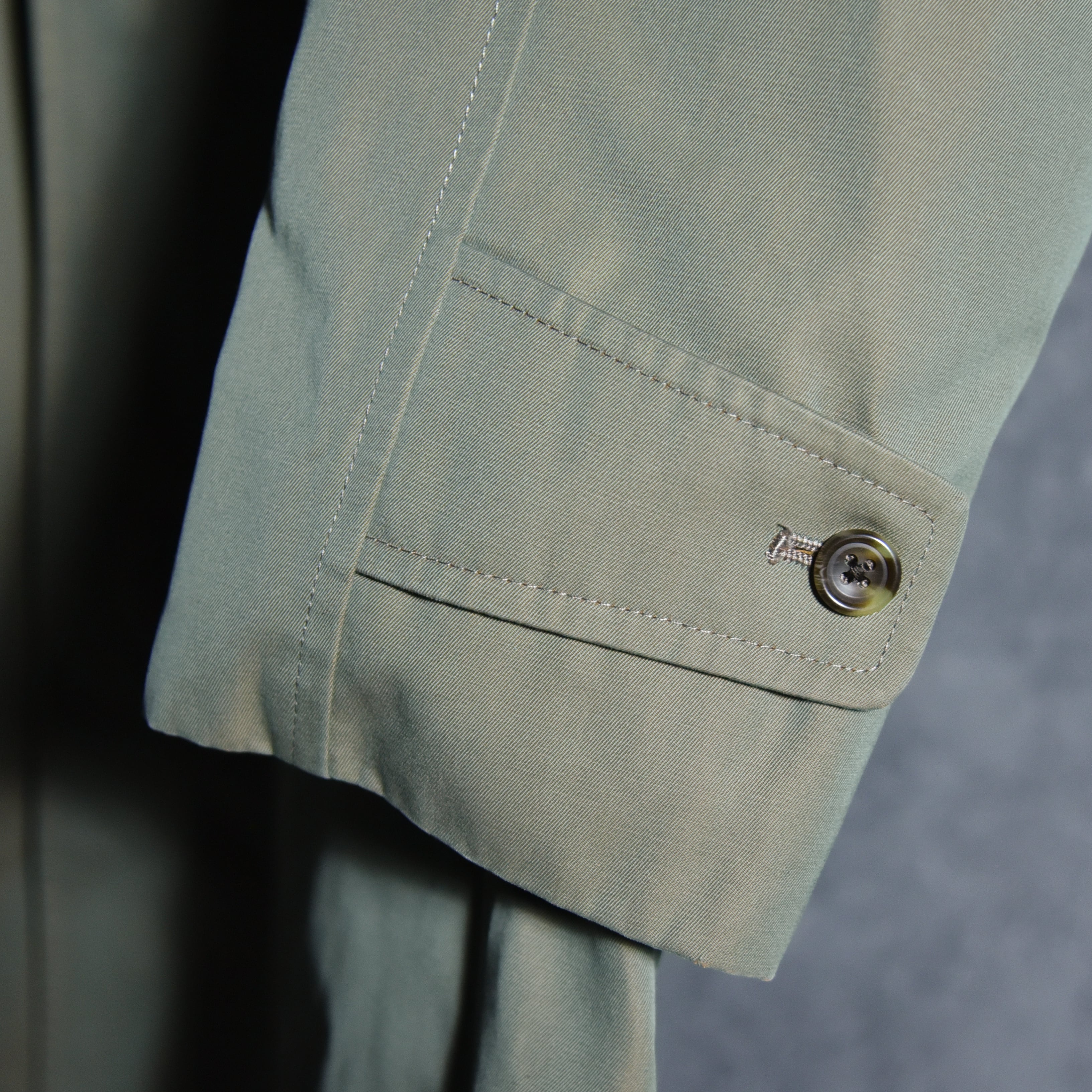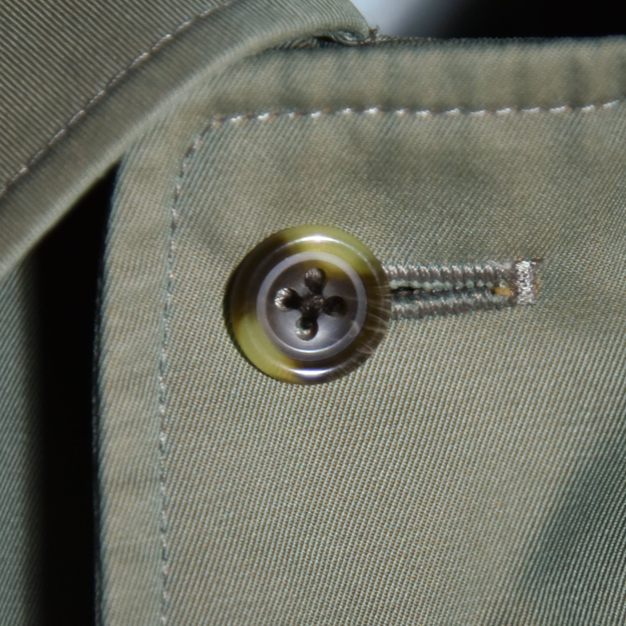 生地はこの年代らしいソラーロ、いわゆる玉虫色で経糸にオリーブなどのカーキ系、緯糸にオレンジを用いた綾織生地で、捕色に近い関係の色合いで角度によってパッと色が変わる感覚になるユニークな生地。