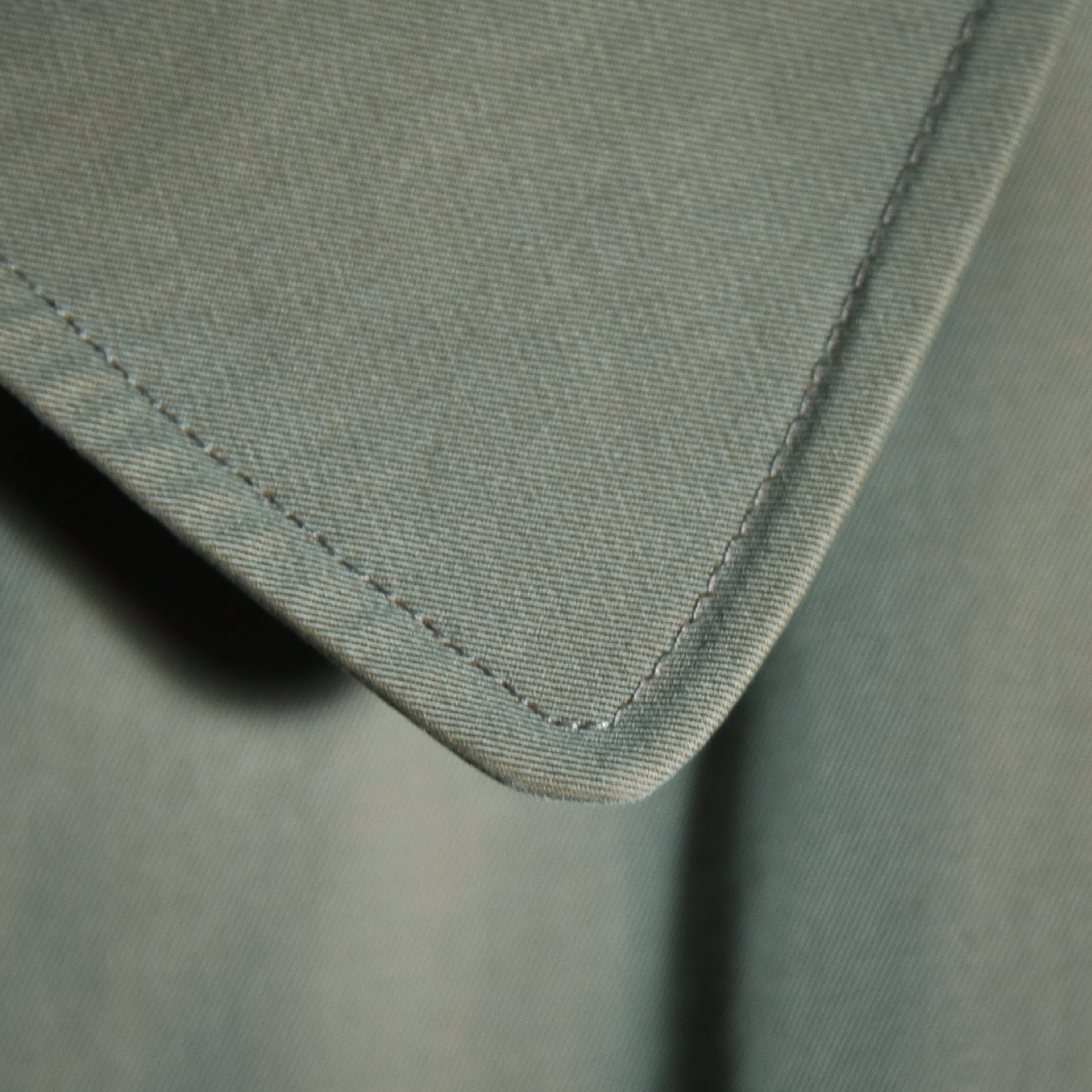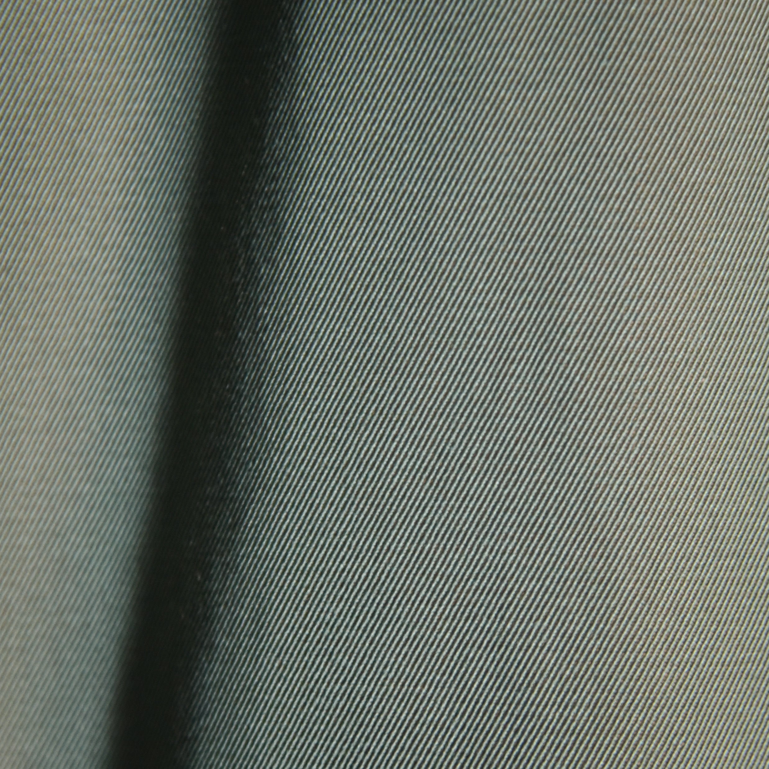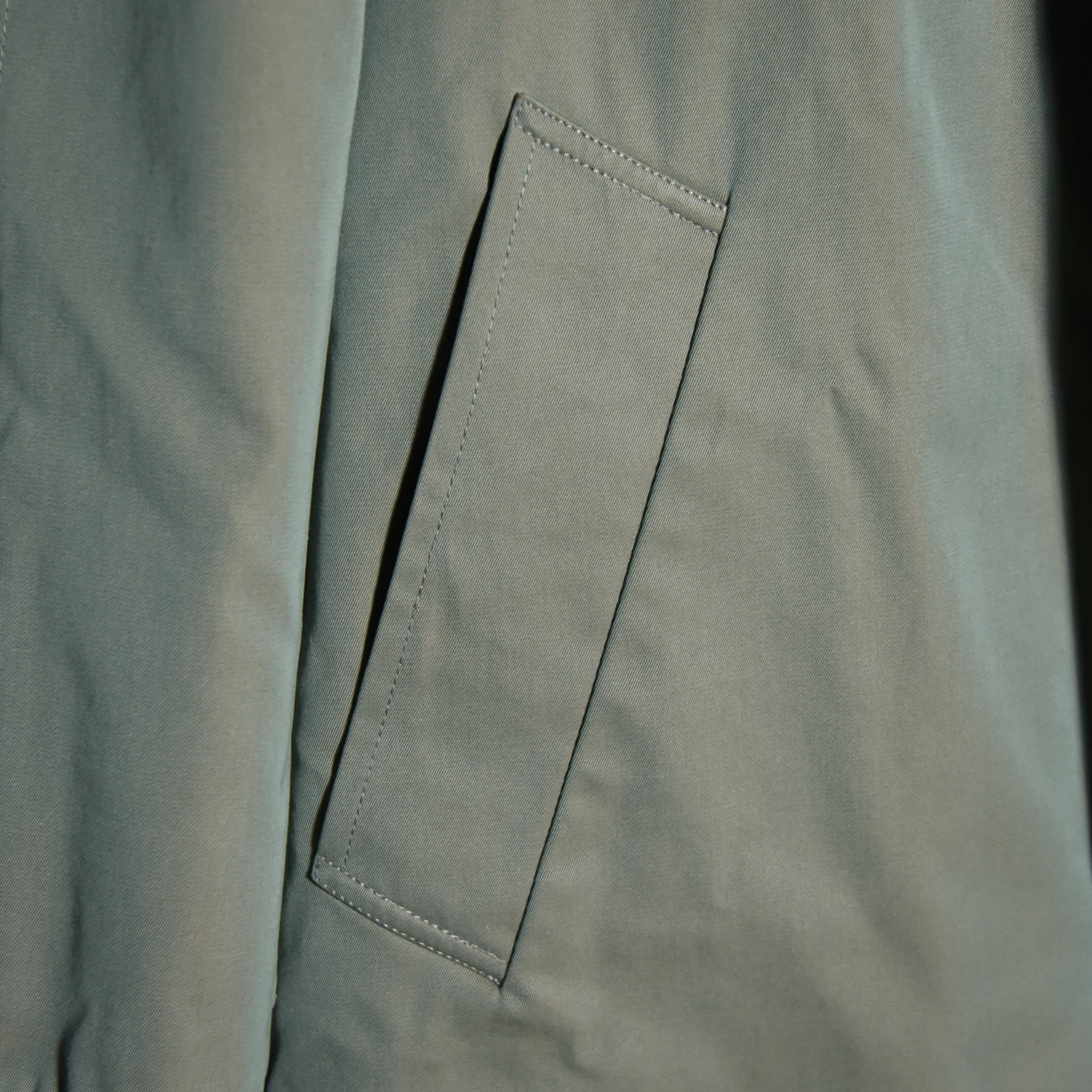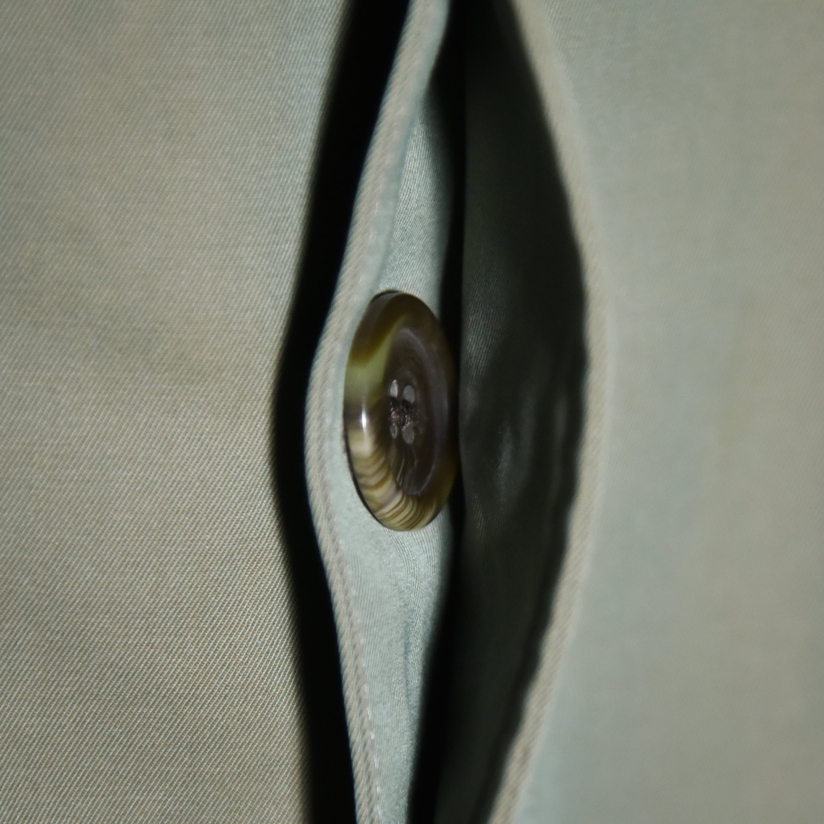 生地はこの年代らしいソラーロ、いわゆる玉虫色で経糸にオリーブなどのカーキ系、緯糸にオレンジを用いた綾織生地で、捕色に近い関係の色合いで角度によってパッと色が変わる感覚になるユニークな生地。