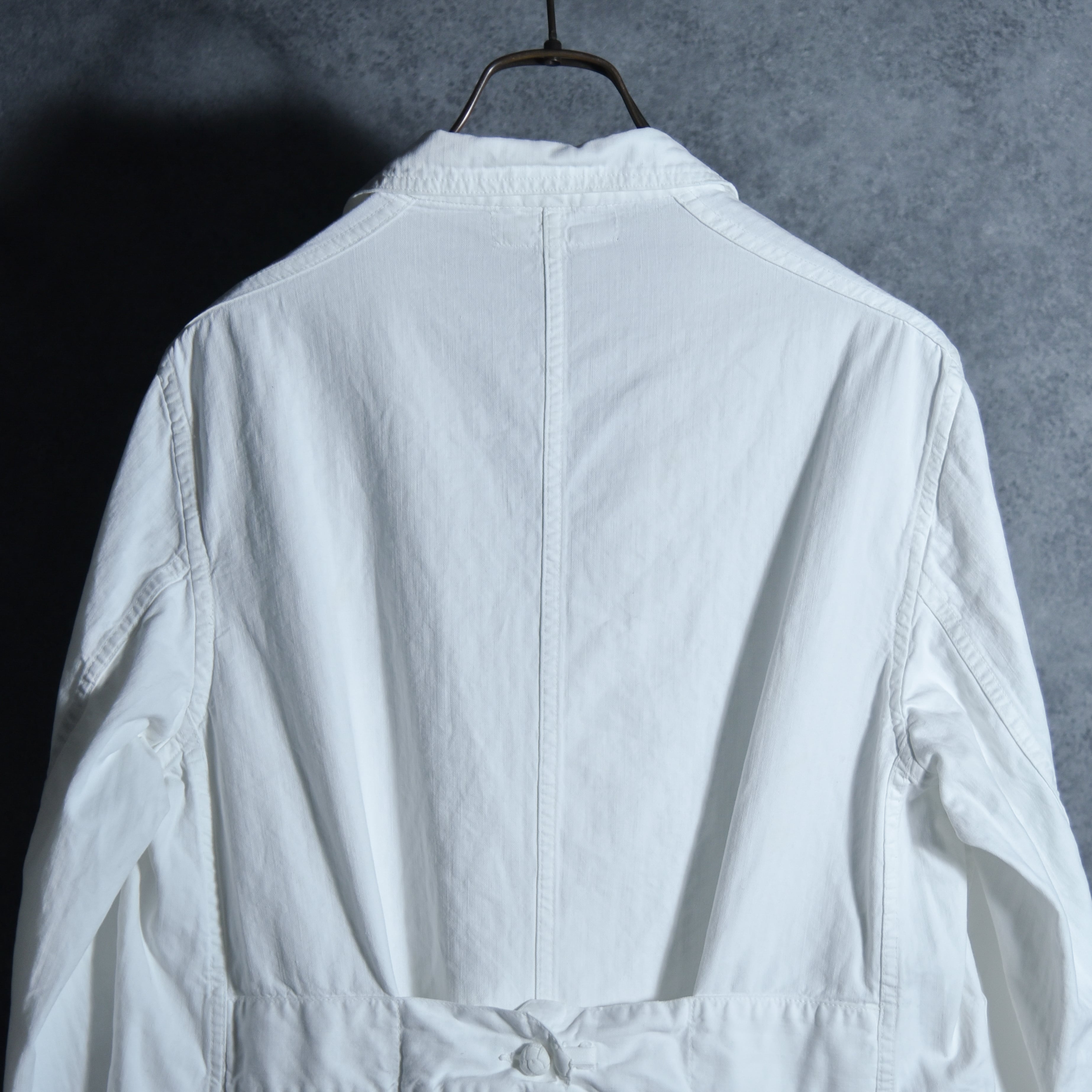 フロントとベルトにはチャイナボタンのような生地テープを編んだボタンが配され、ラペル仕様の襟元にスリーパッチポケット、サイドにはパンツやインナージャケットのポケットに直接アクセスできる便利な貫通ポケットが付くなど、シンプルでありながらなかなか見かけないディテールが組み合わされたユニークな一着。
