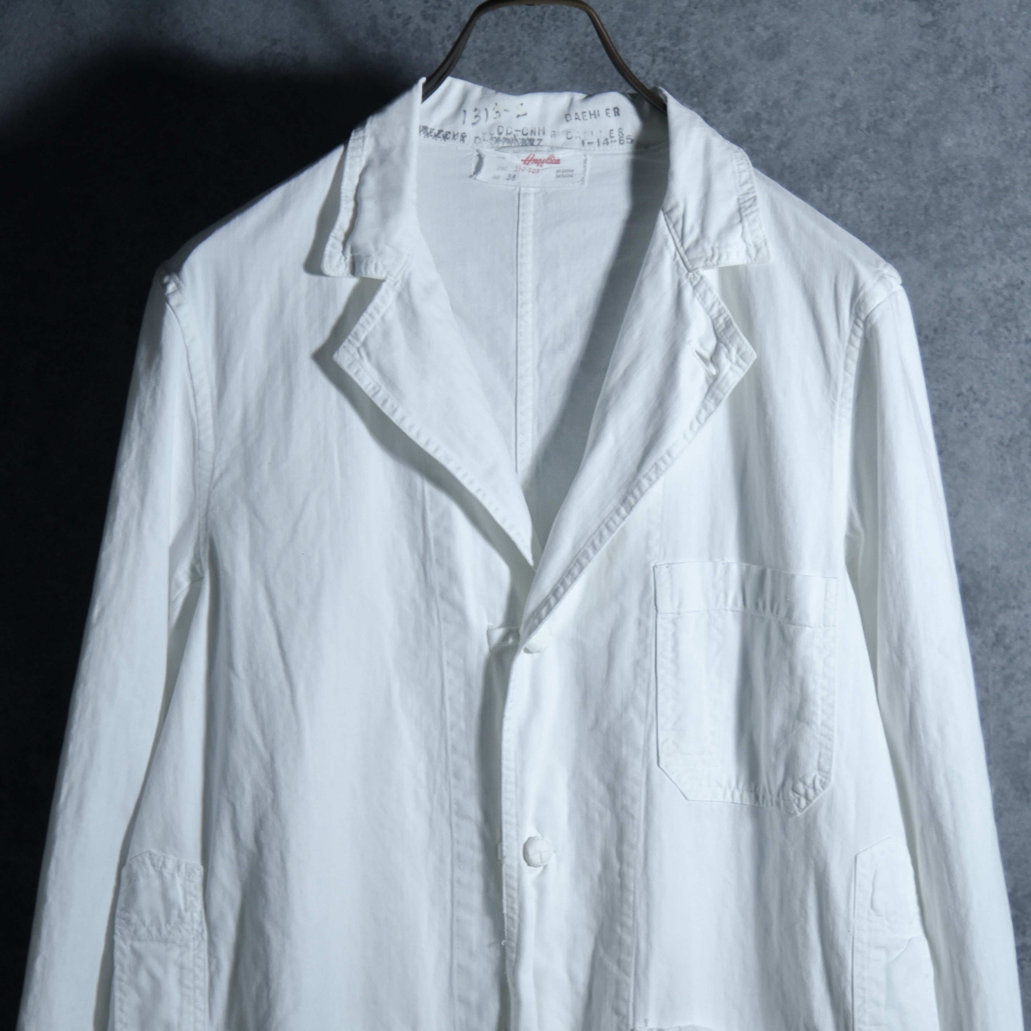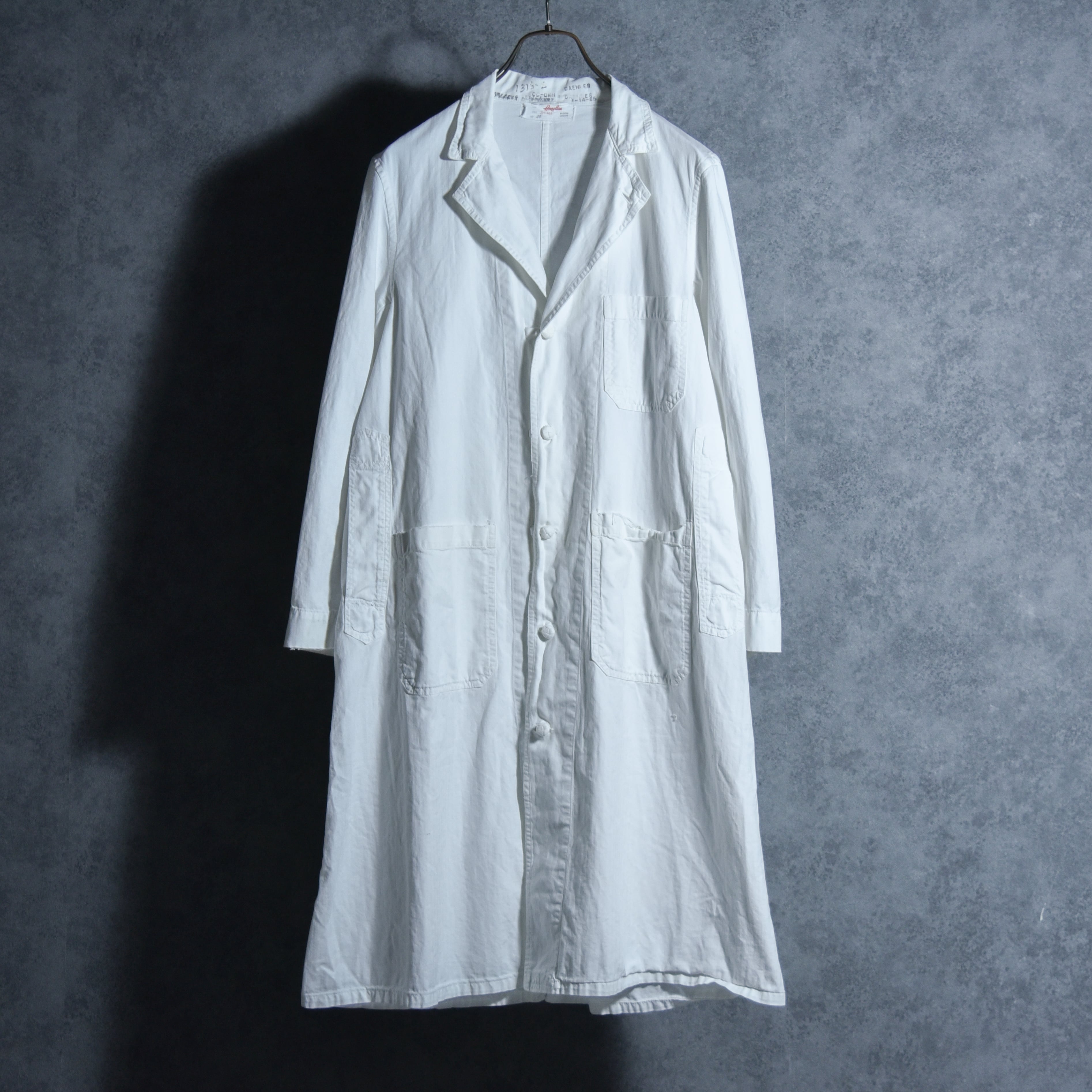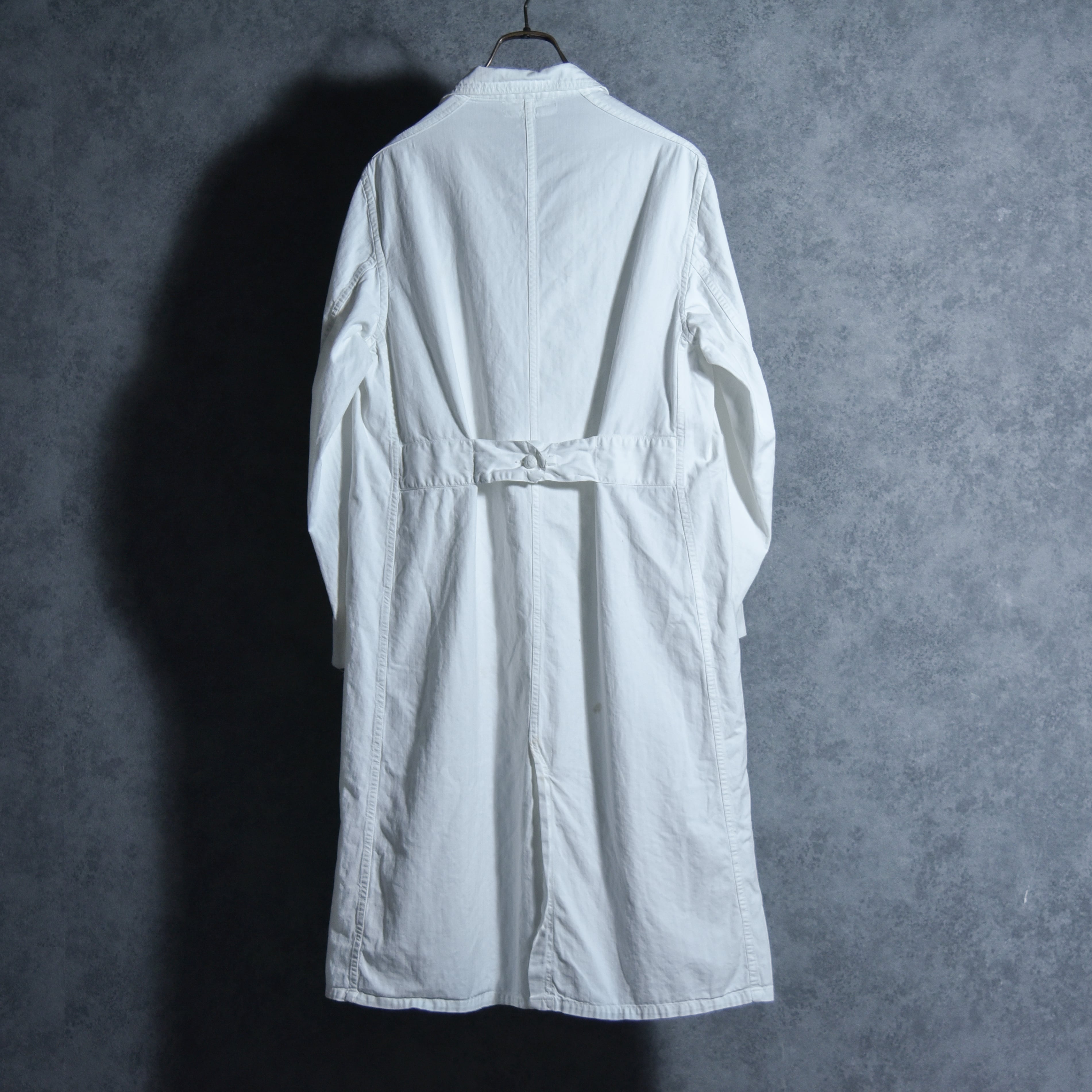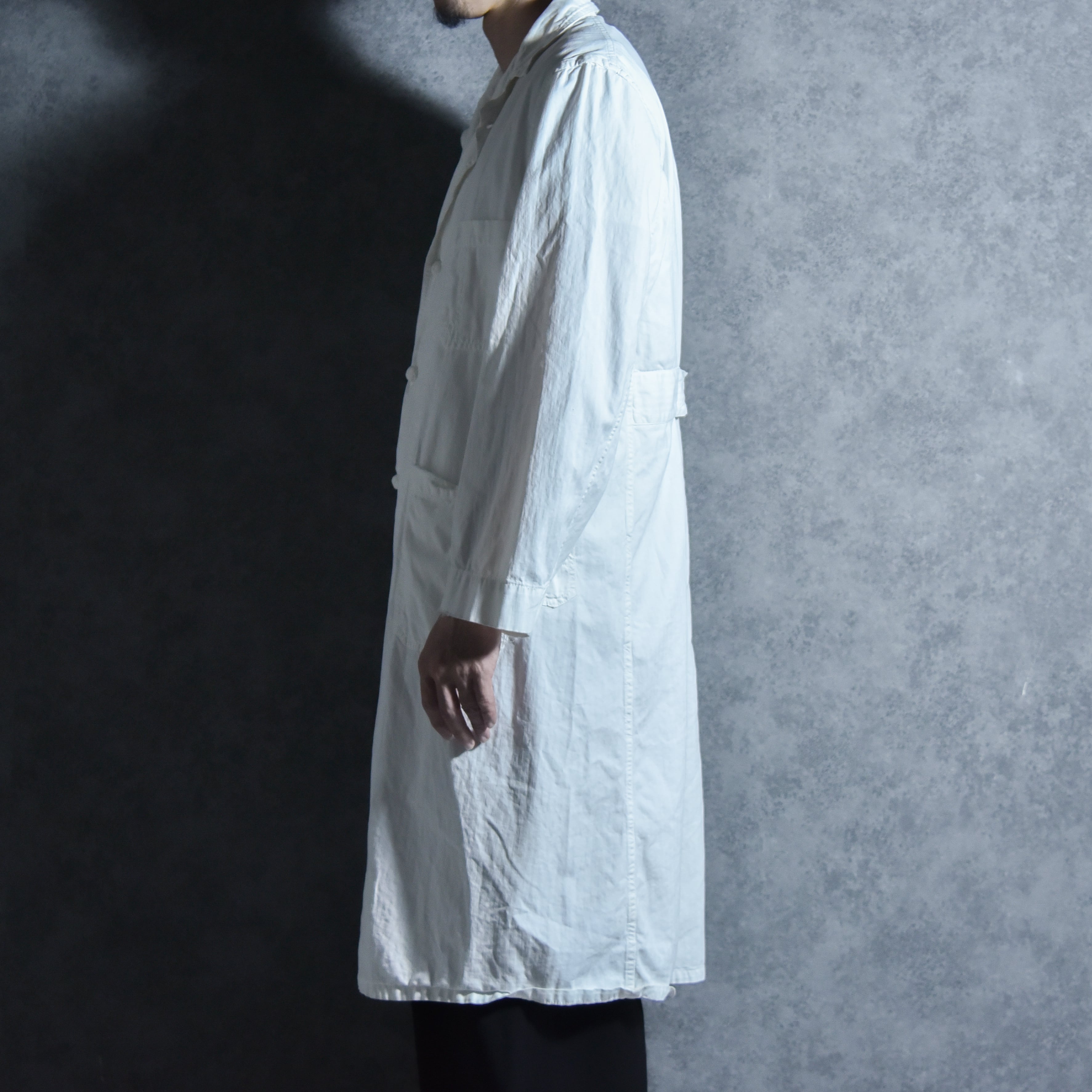 生地はコートとしてはやや薄手のコットンヘリンボーンで、アイテムの特性上汚れやダメージが多いものがほとんどですが、今回入荷した個体はごく僅かなシミや袖口のスレなどは見られるものの、年代や用途を考えるとコンディションは良好です。