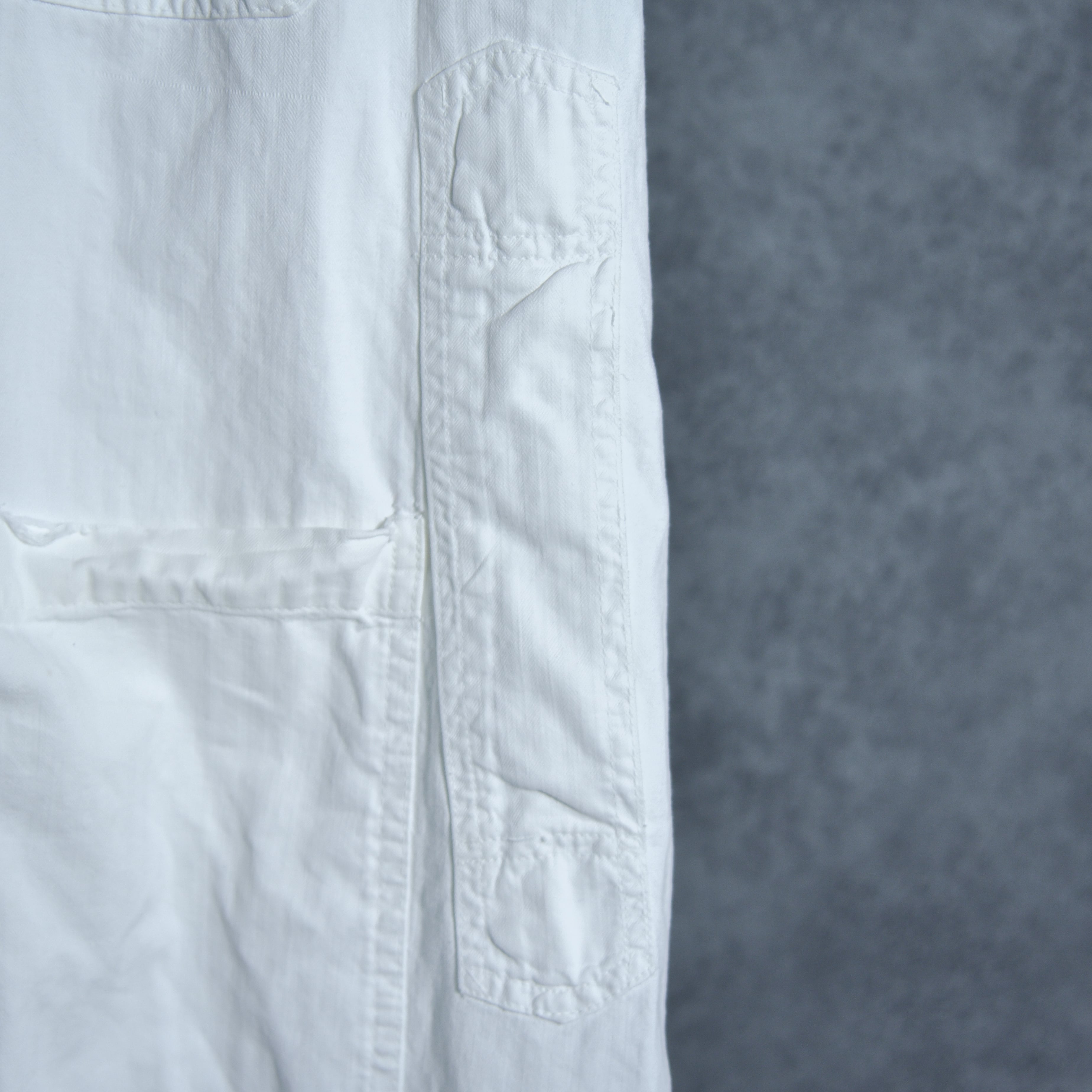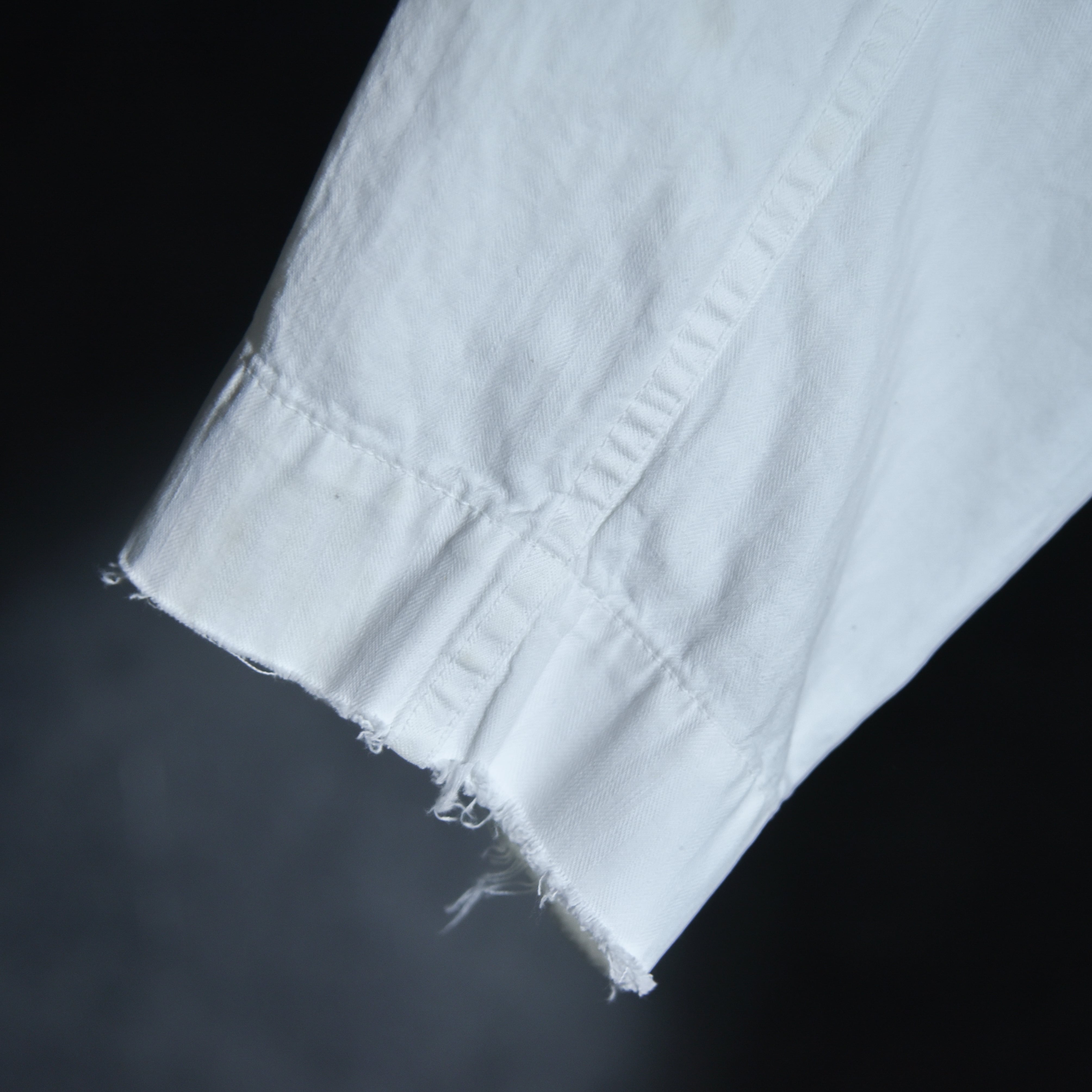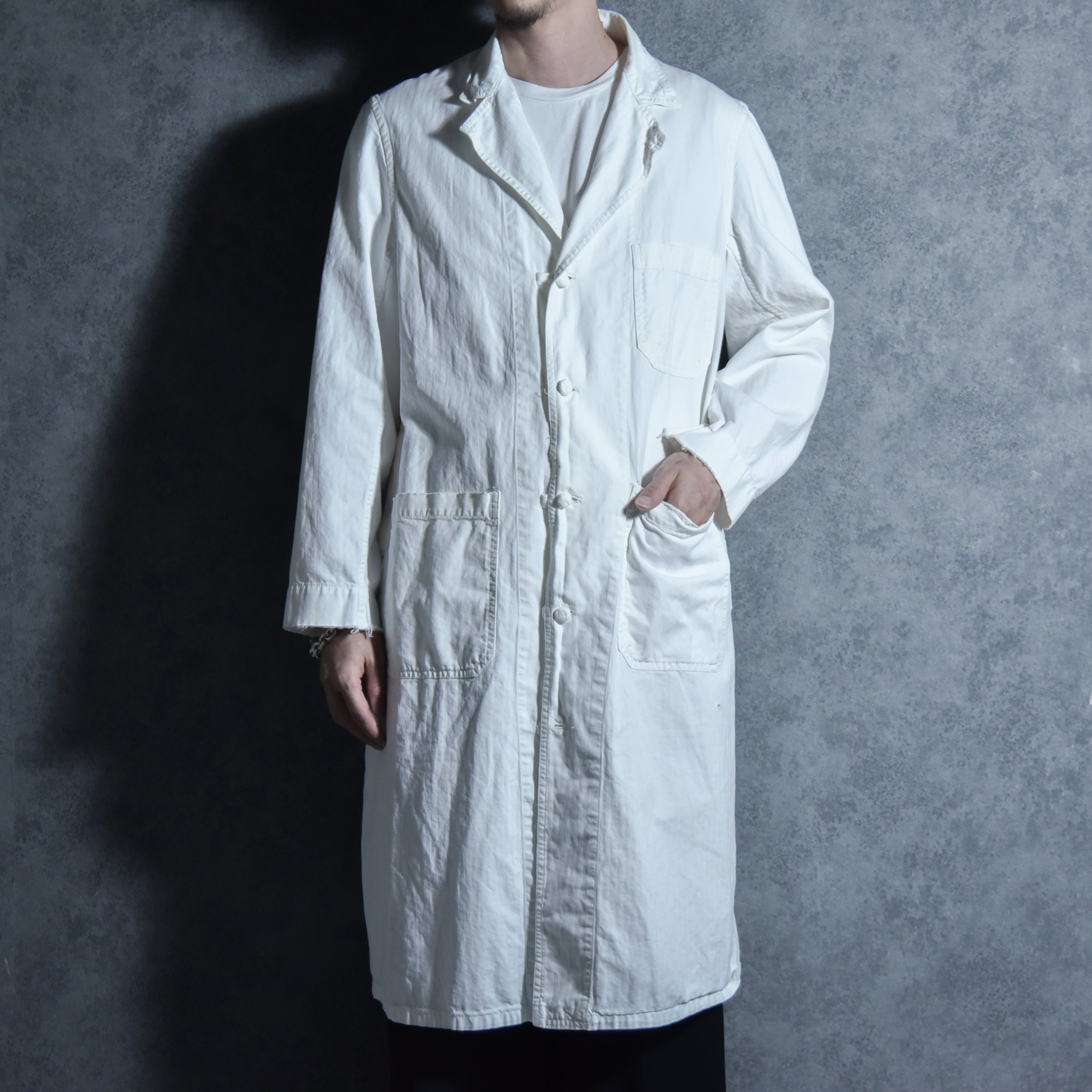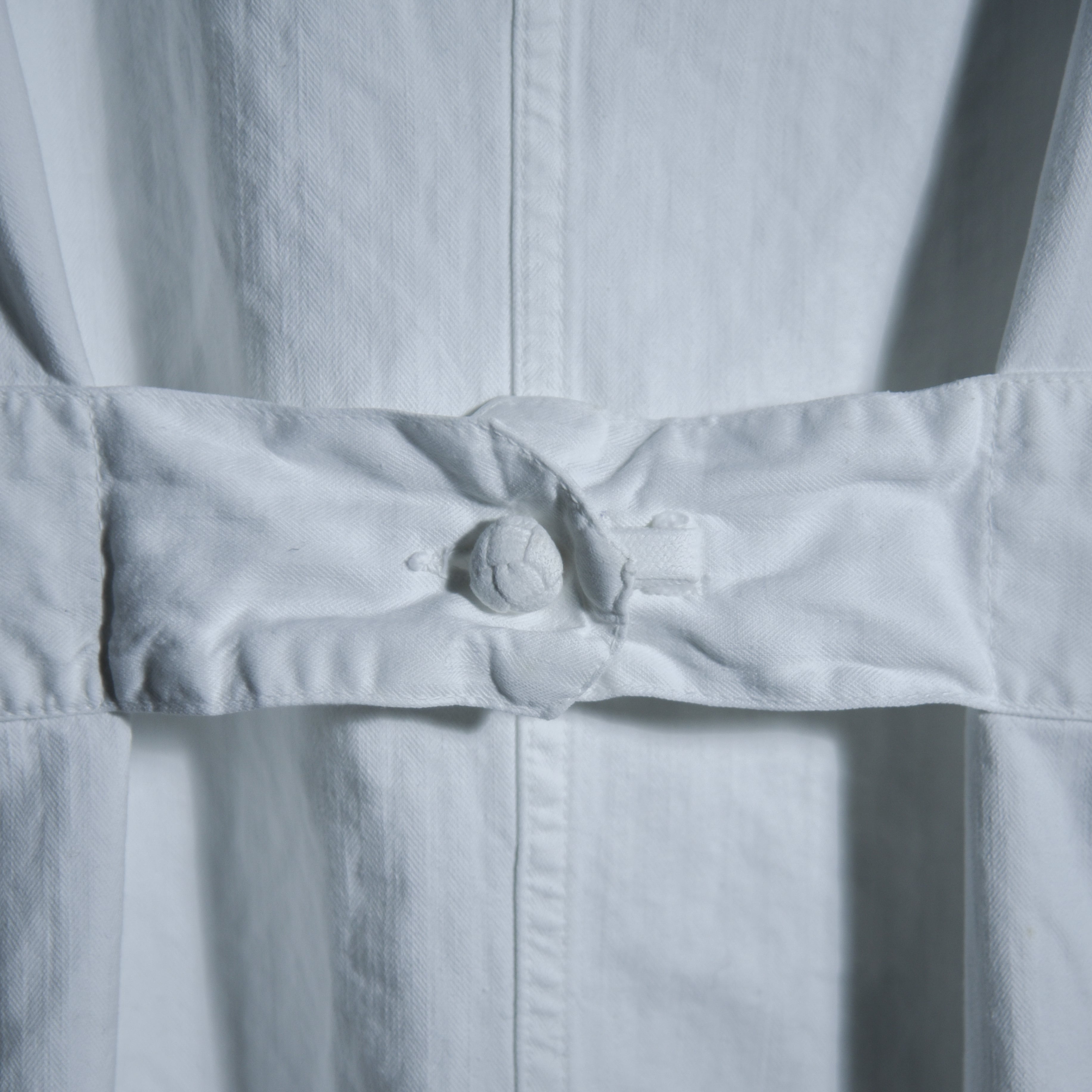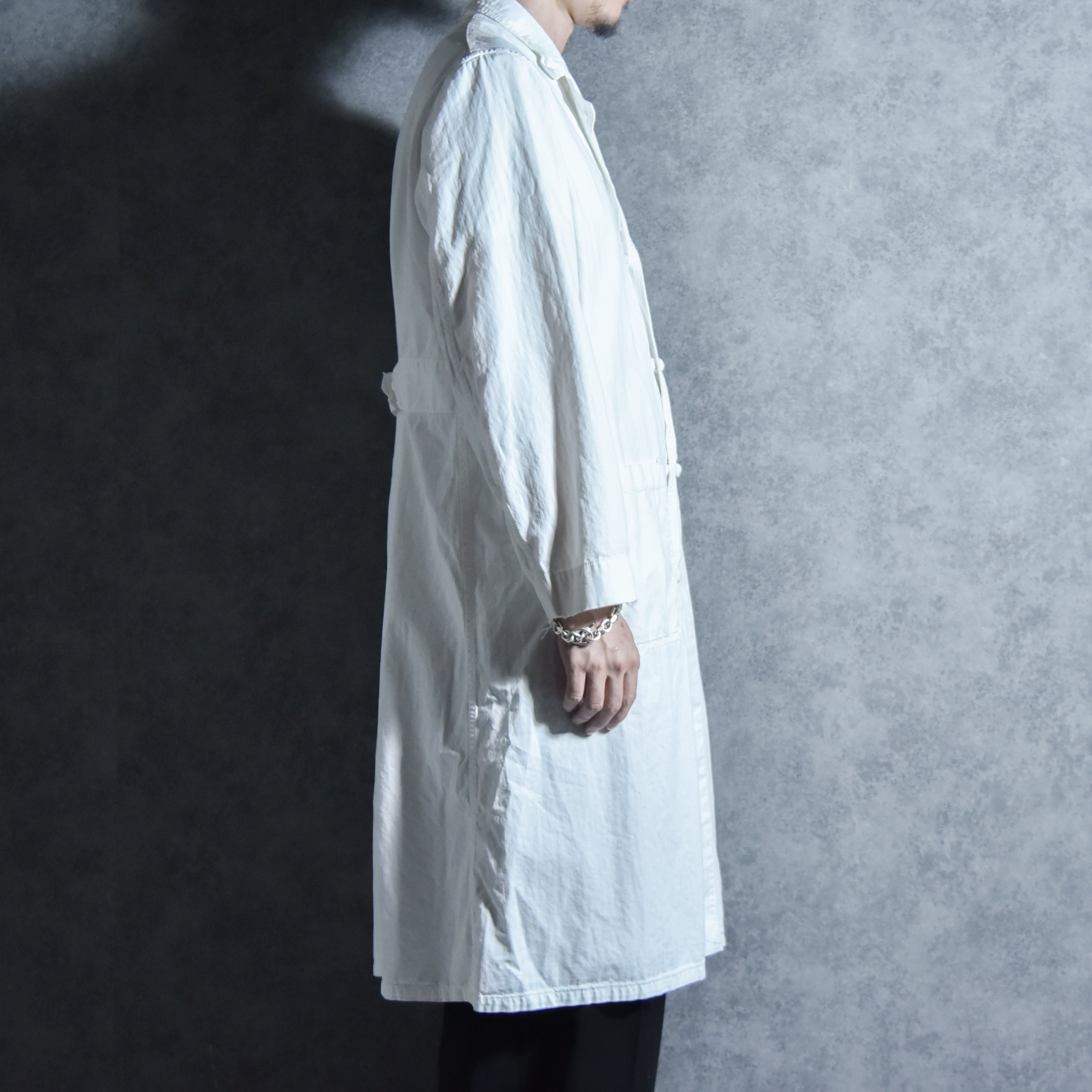 生地はコートとしてはやや薄手のコットンヘリンボーンで、アイテムの特性上汚れやダメージが多いものがほとんどですが、今回入荷した個体はごく僅かなシミや袖口のスレなどは見られるものの、年代や用途を考えるとコンディションは良好です。