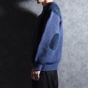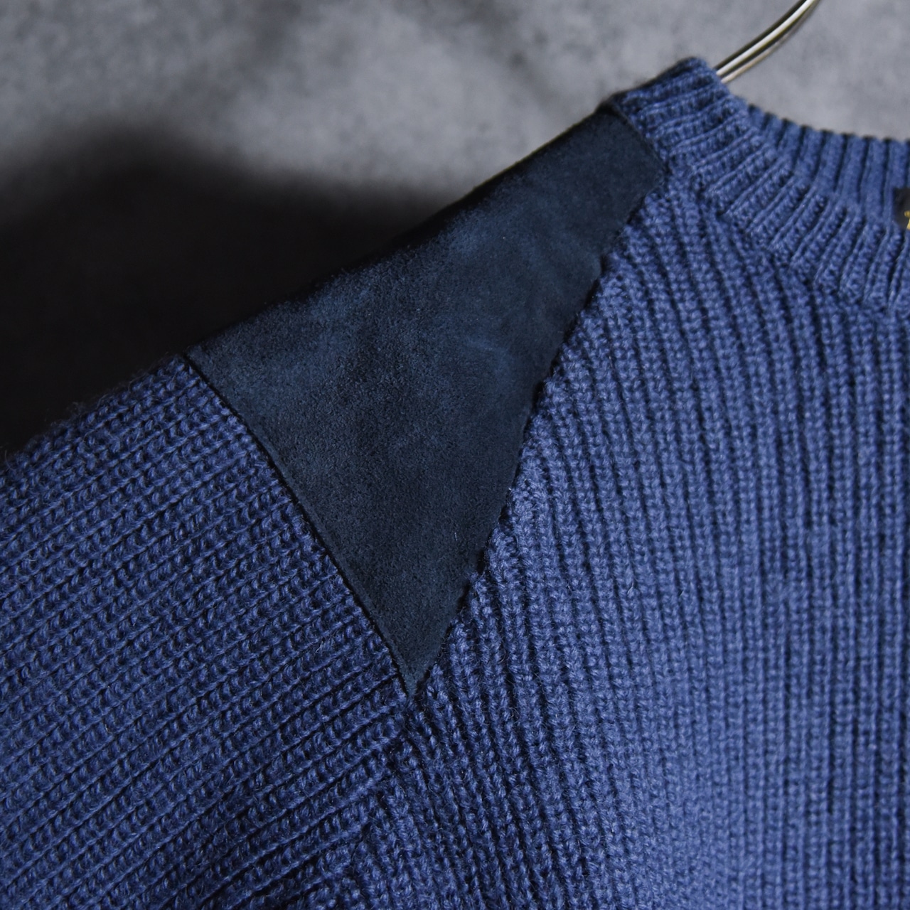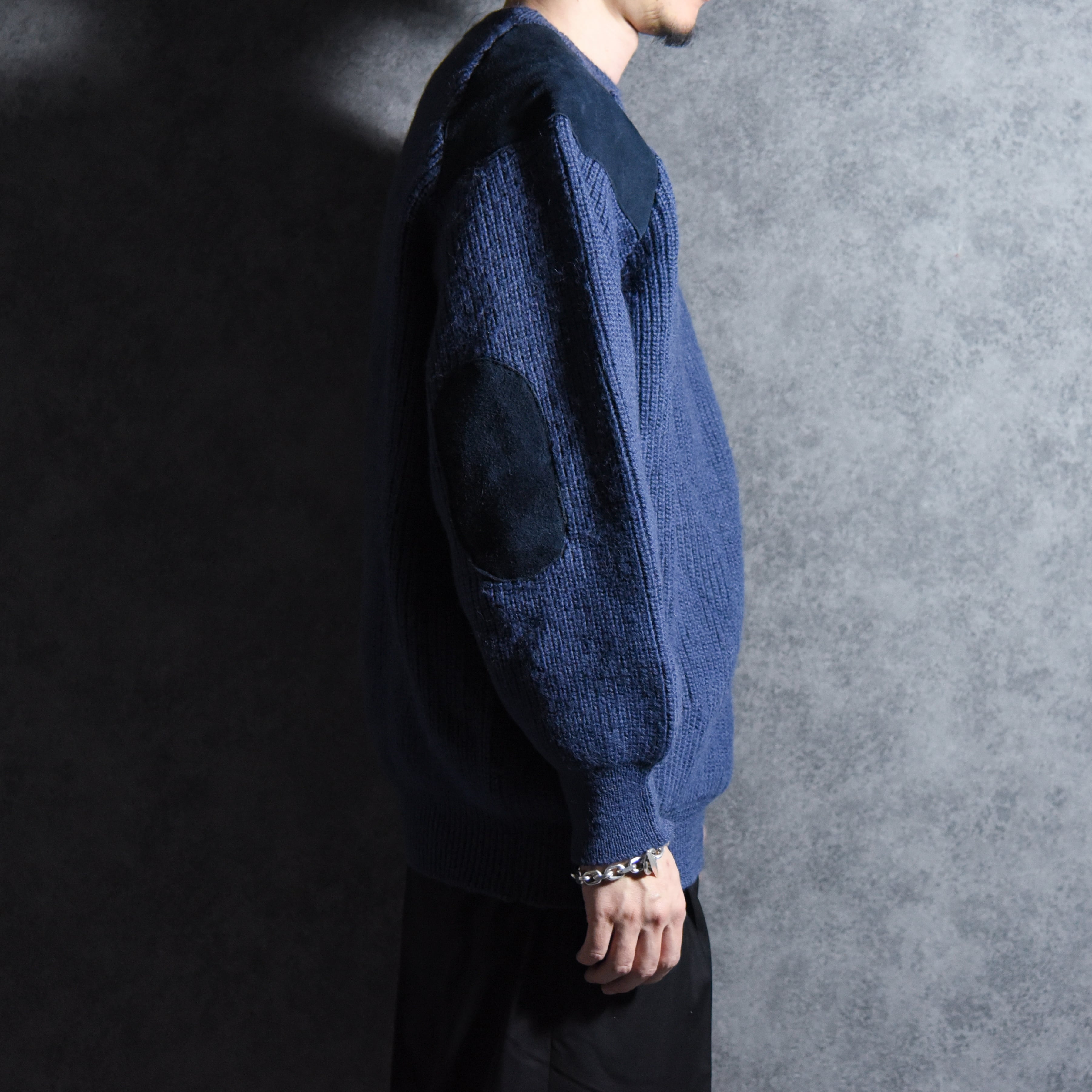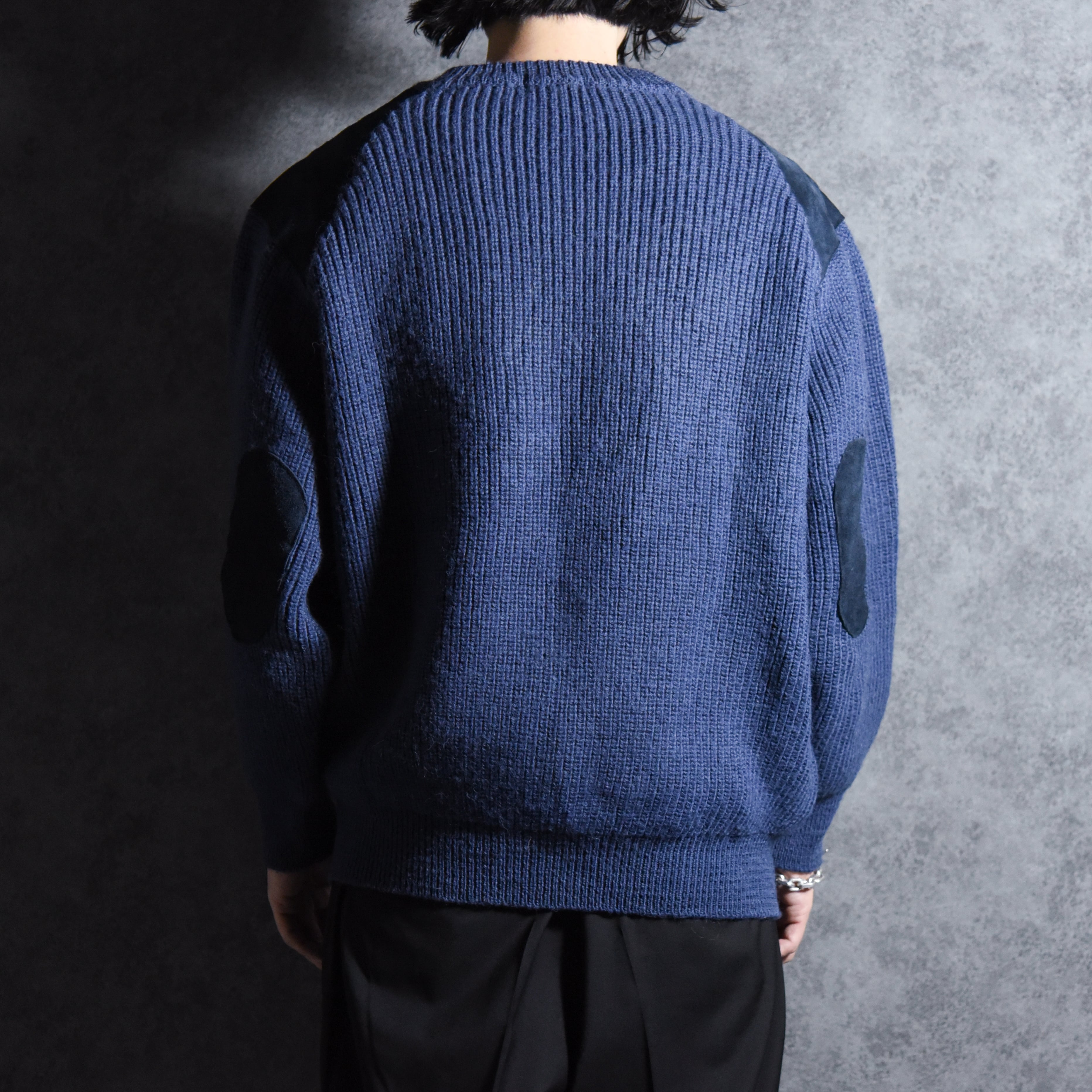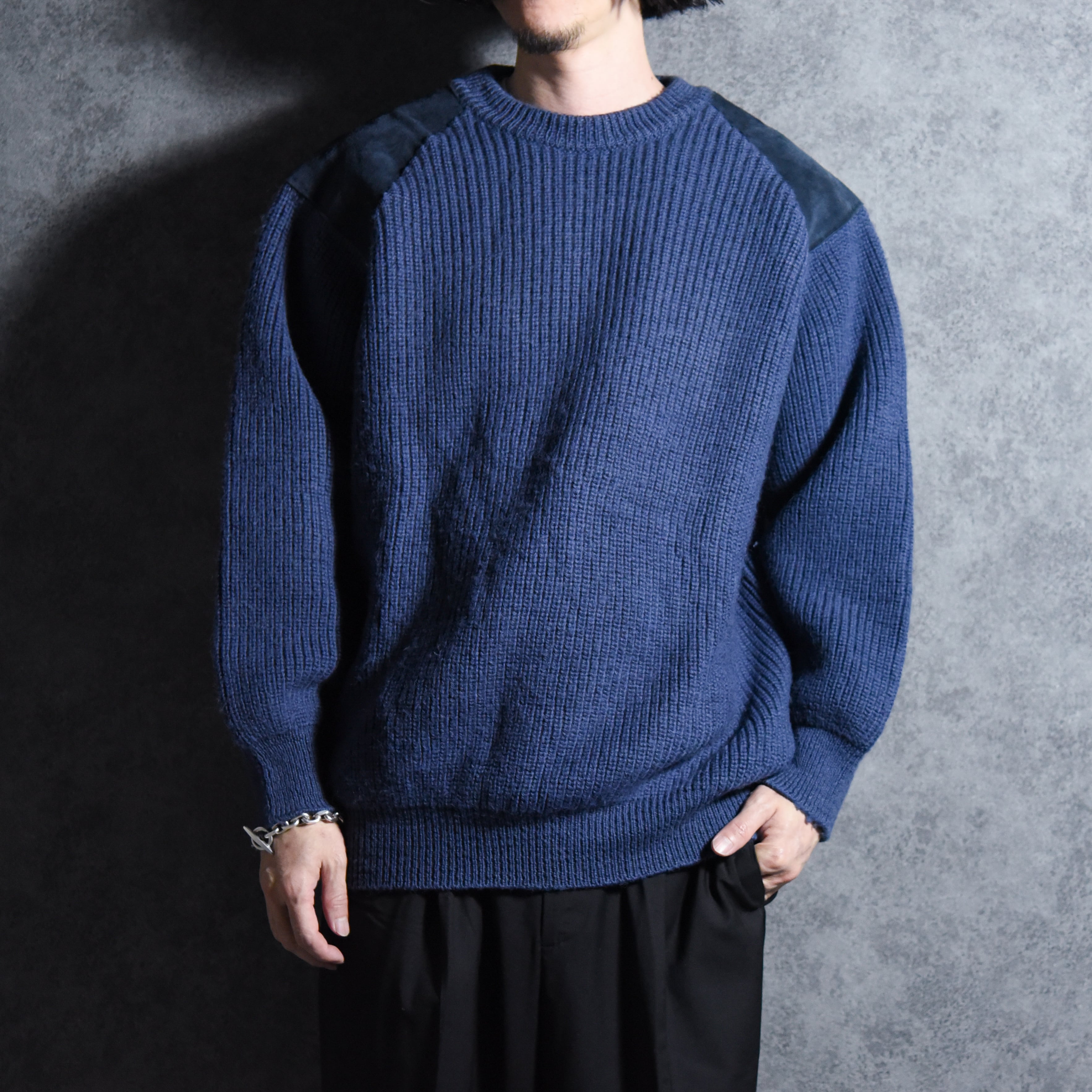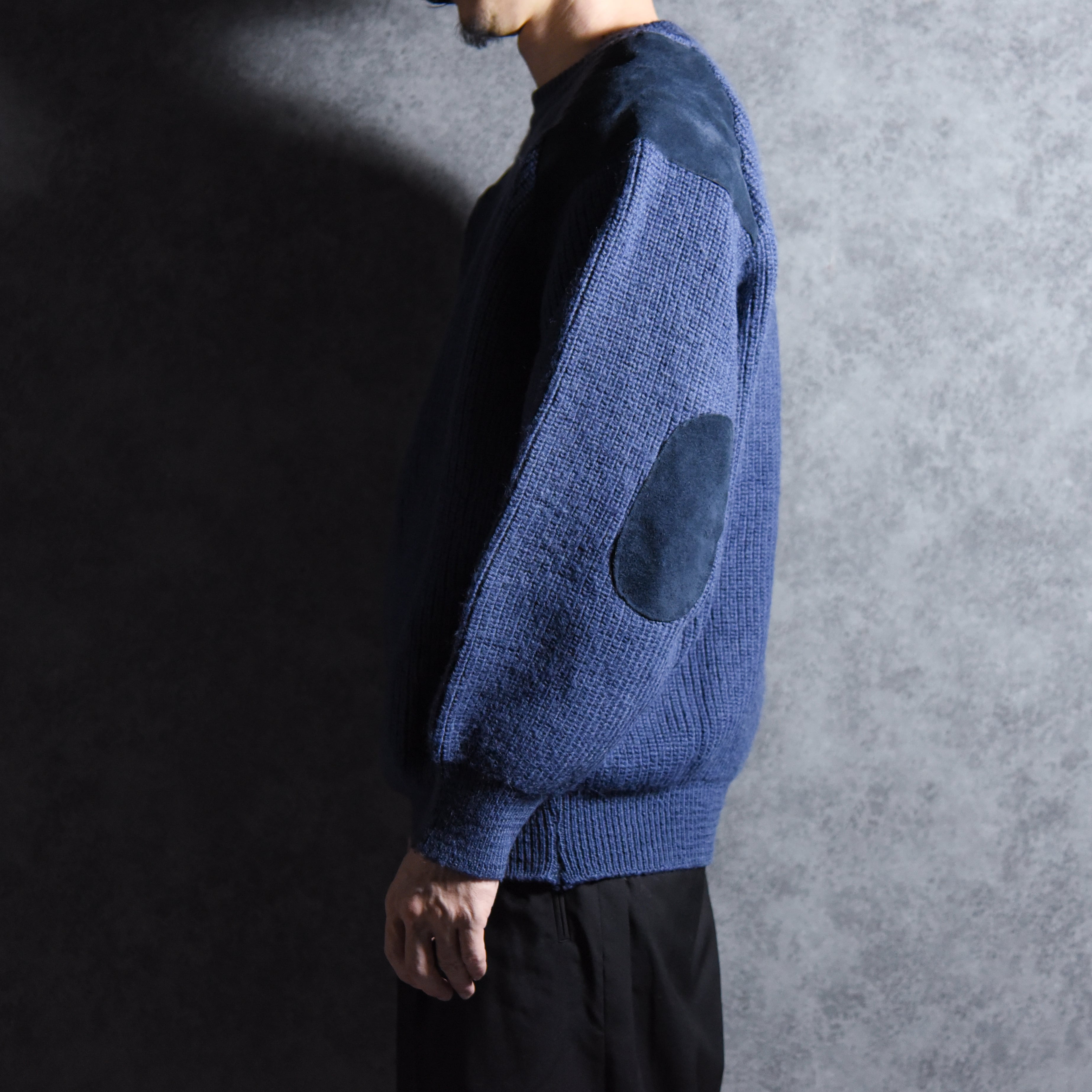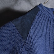 ミリタリーのコマンドセーターベースのデザインでラグラン仕様のパターン、ショルダーとエルボー部分にはスエードが配置されているミニマルながらデザイン製の高い一着。