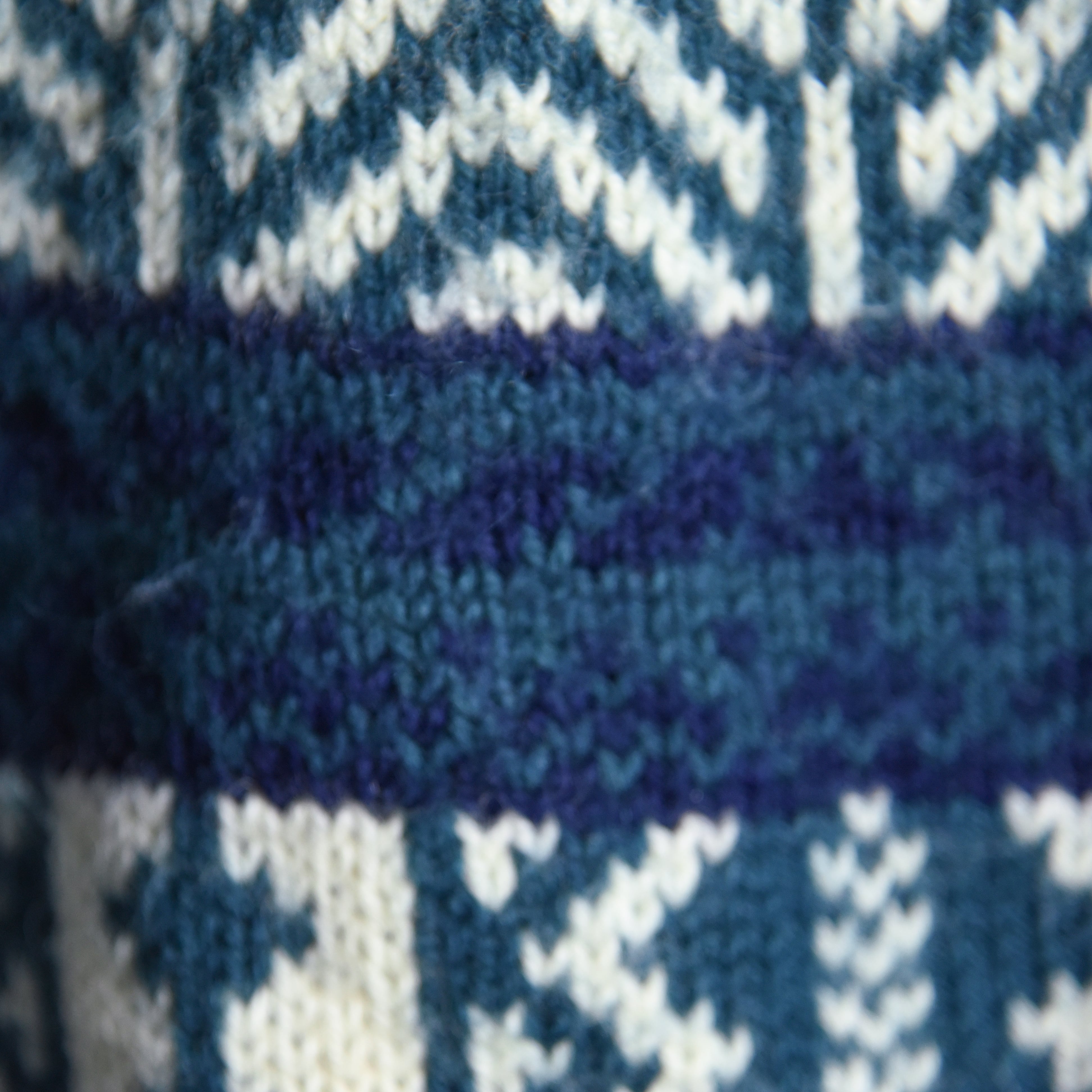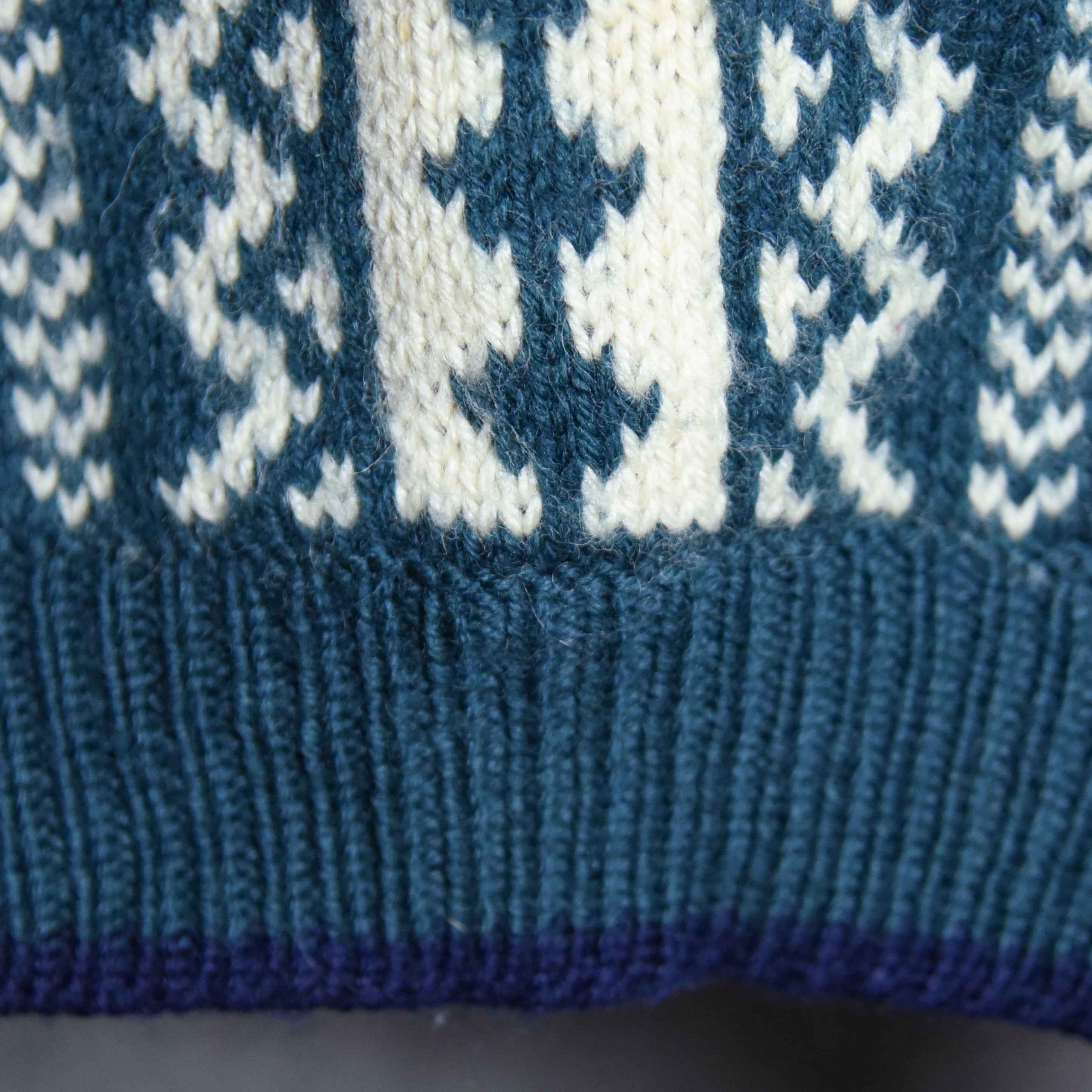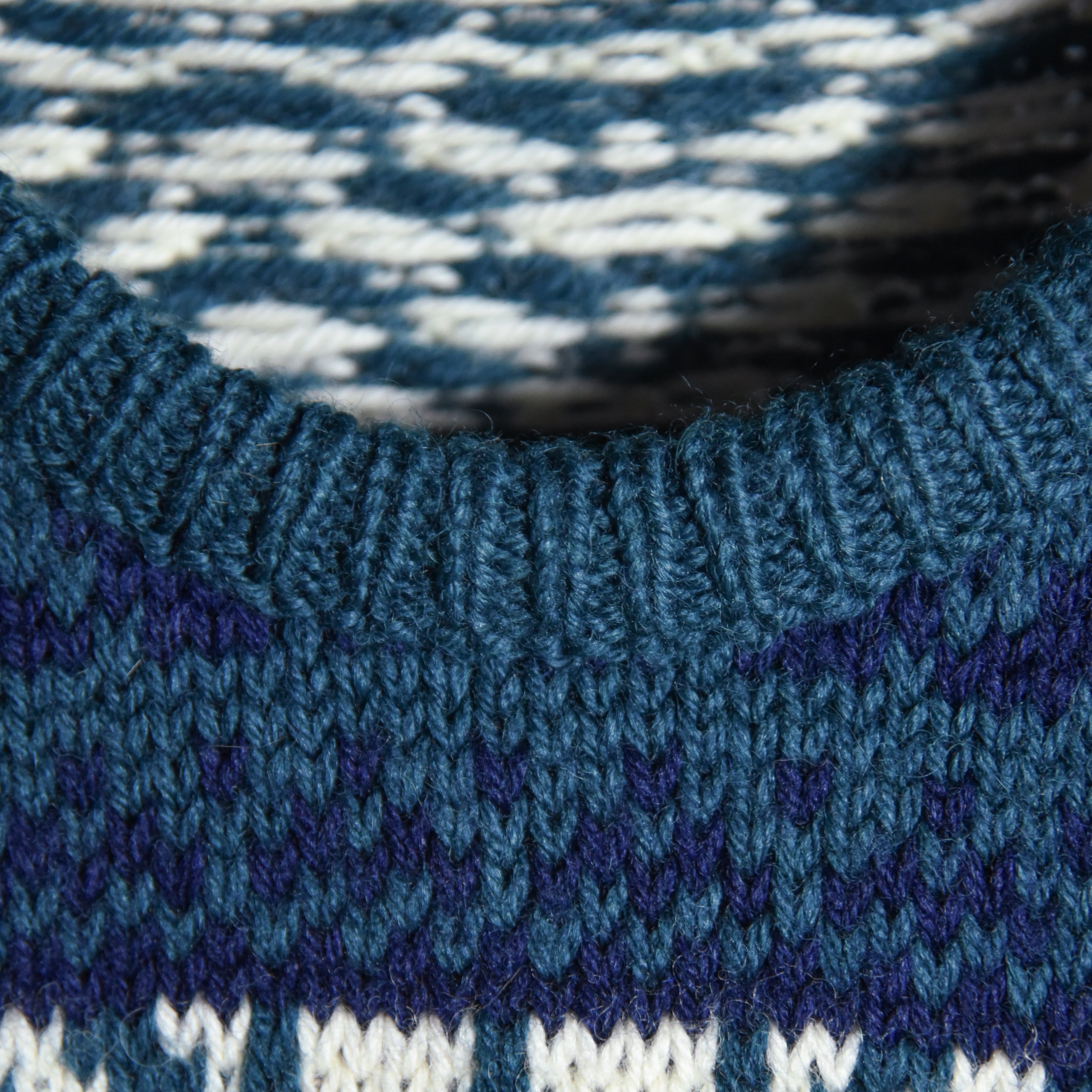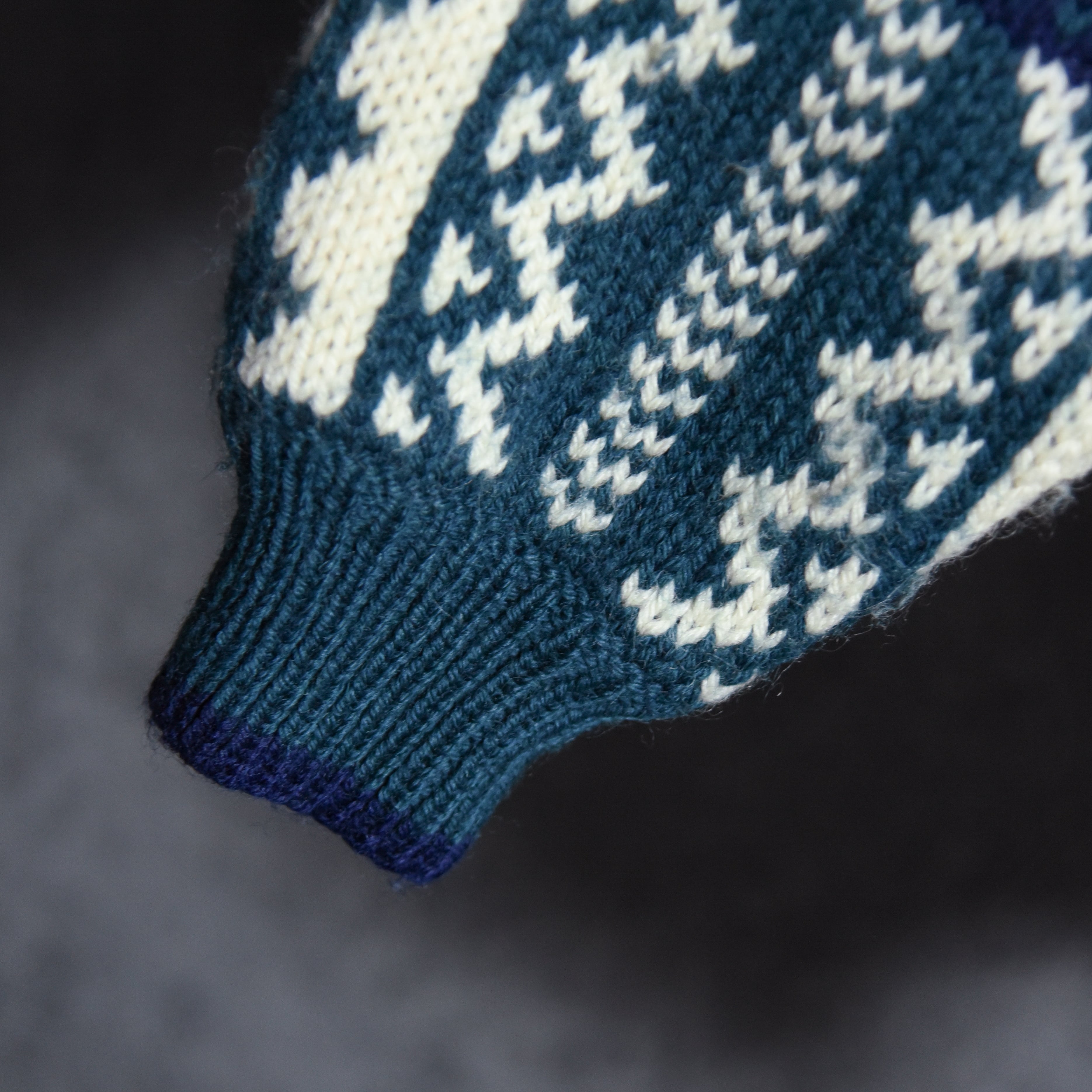 トラディショナルなフェアアイル柄をベースにカラーはグリーンとブルーの間のフランスの伝統色のようなカラー、ネイビー、オフホワイトなどモダンなカラーリングが採用されています。