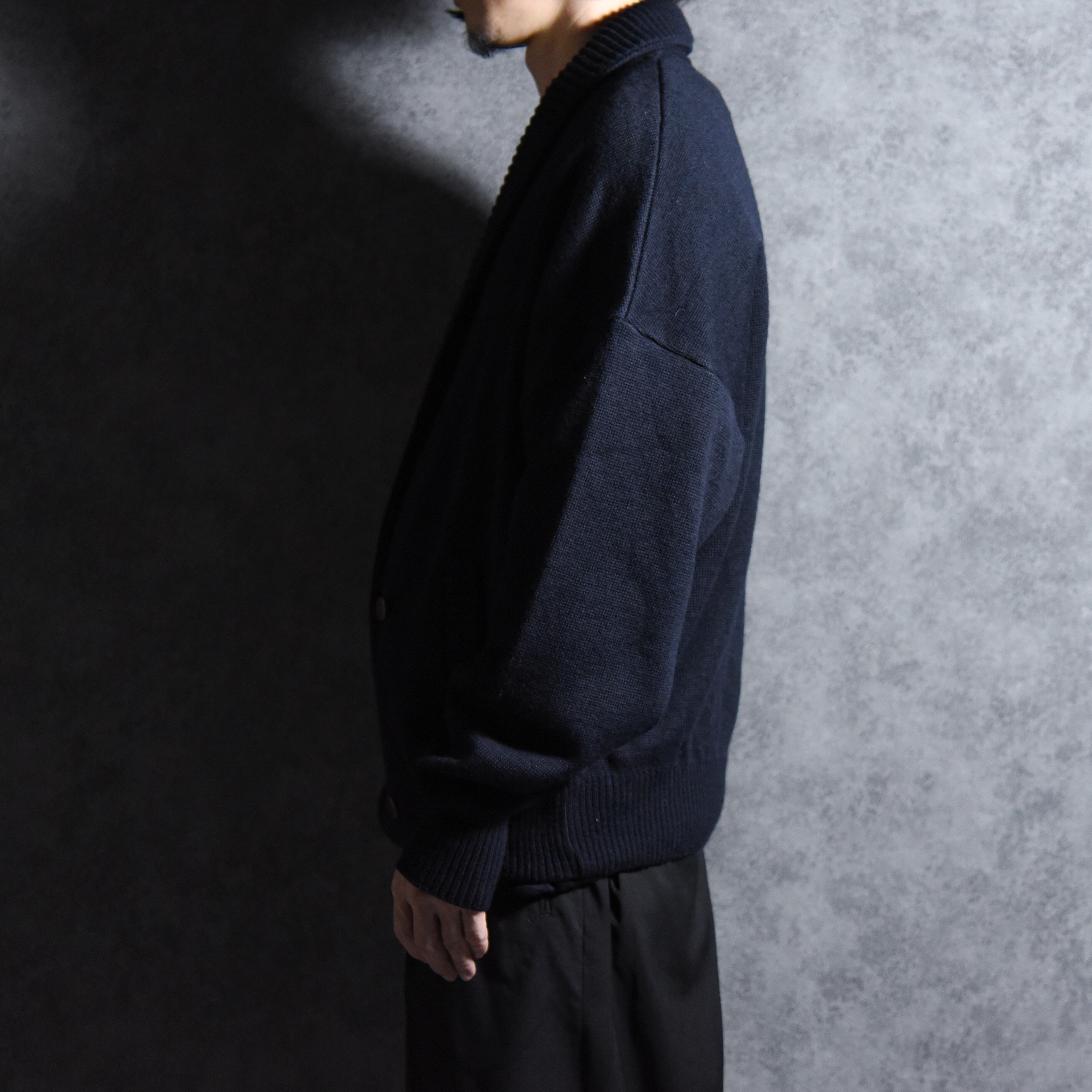 身幅や肩幅に余裕はあるものの着丈は長すぎず雰囲気の良いボックスシルエット、ショールカラーやダブルブレストのディテールなど上品で肩の力の抜けたバランスの良いニットジャケットです。