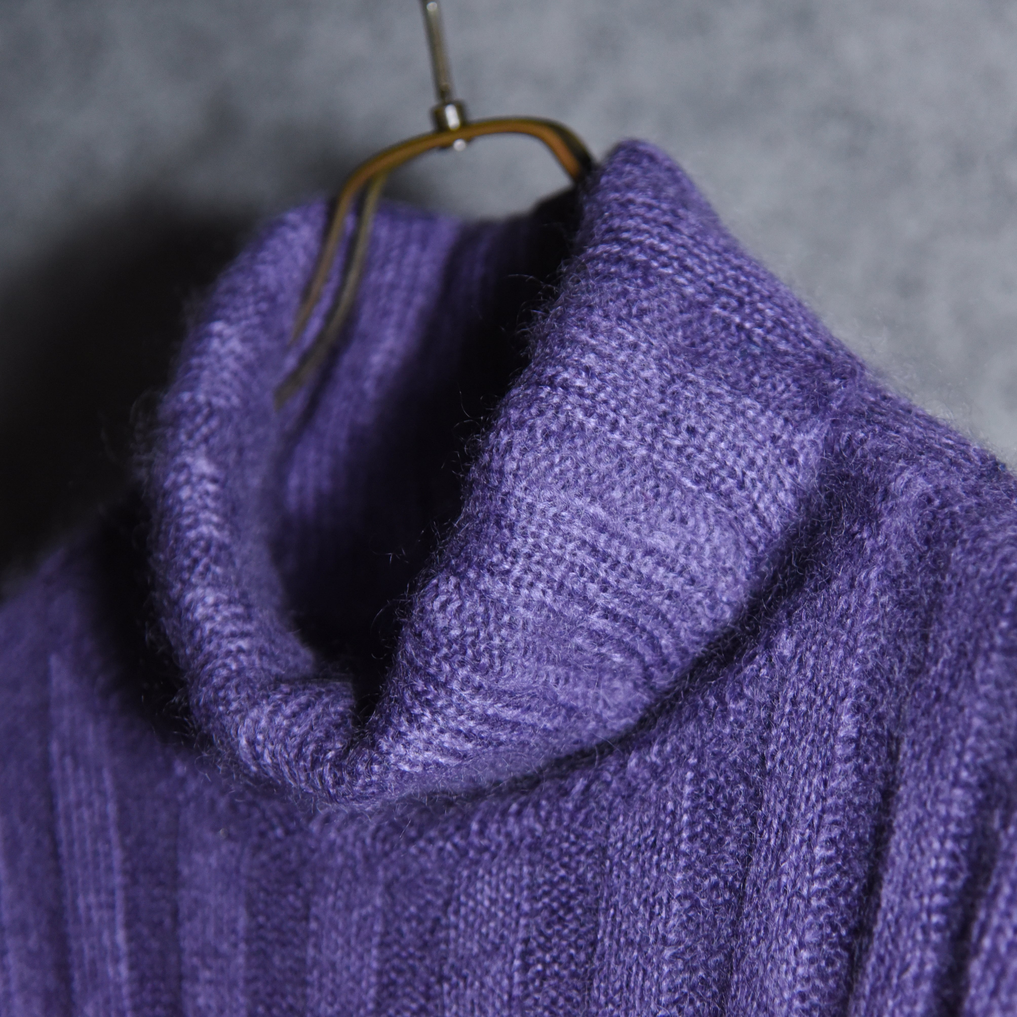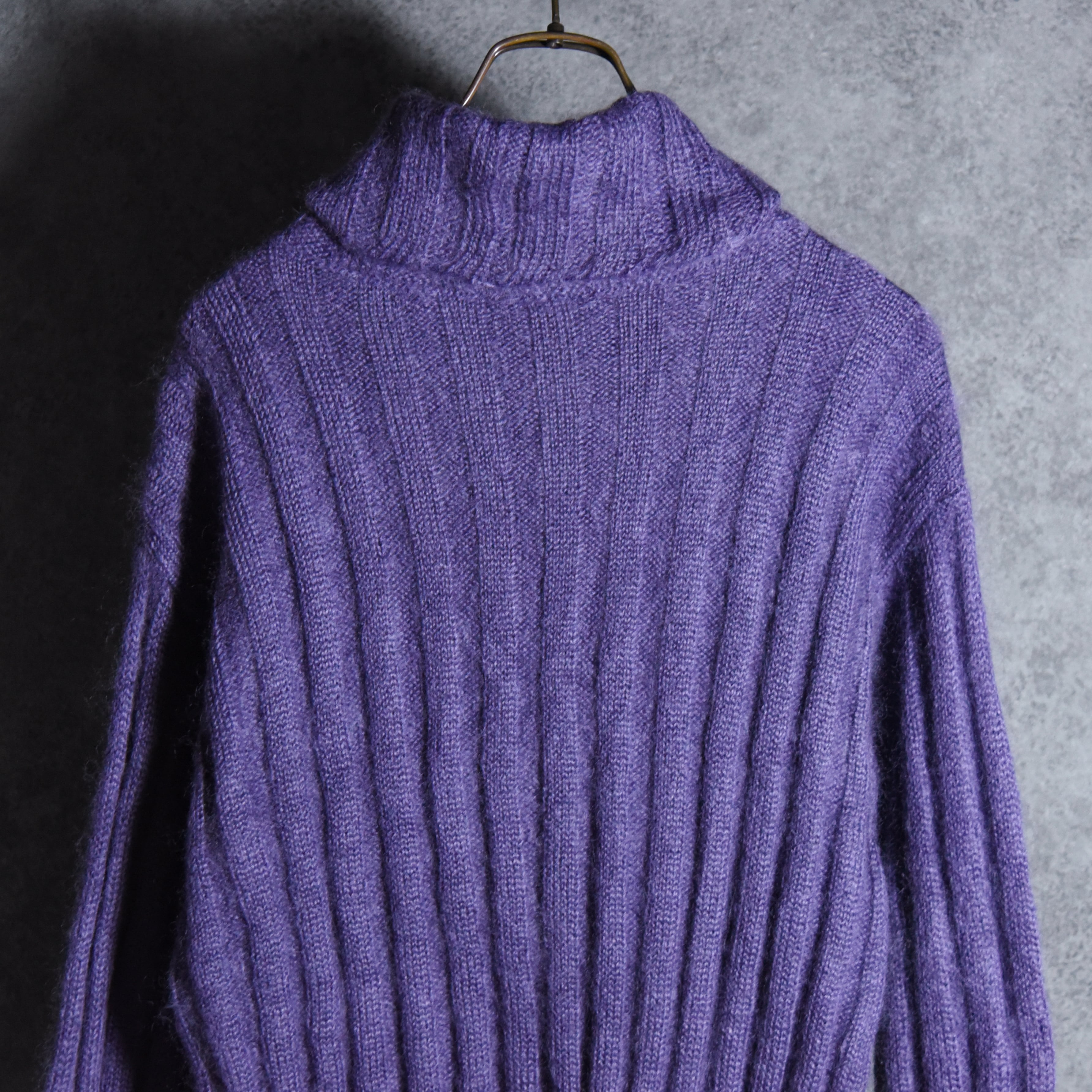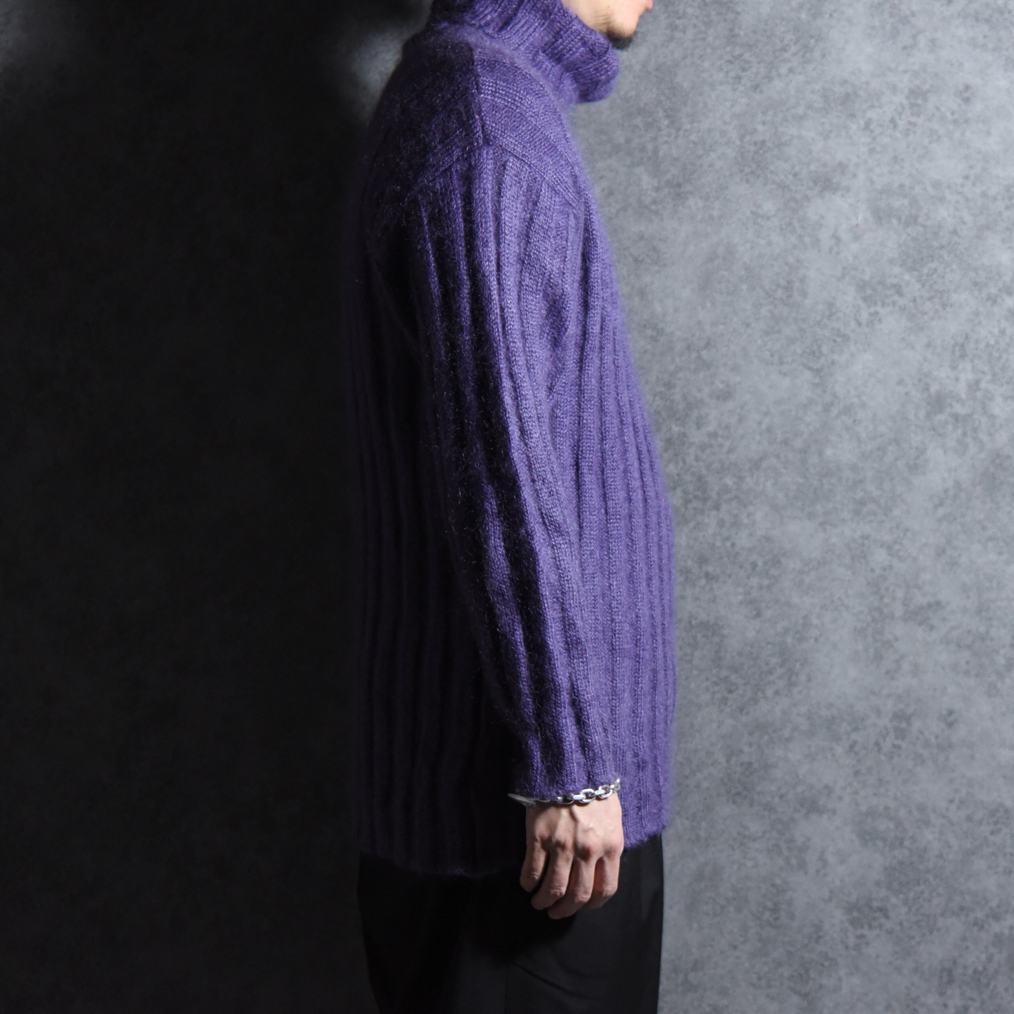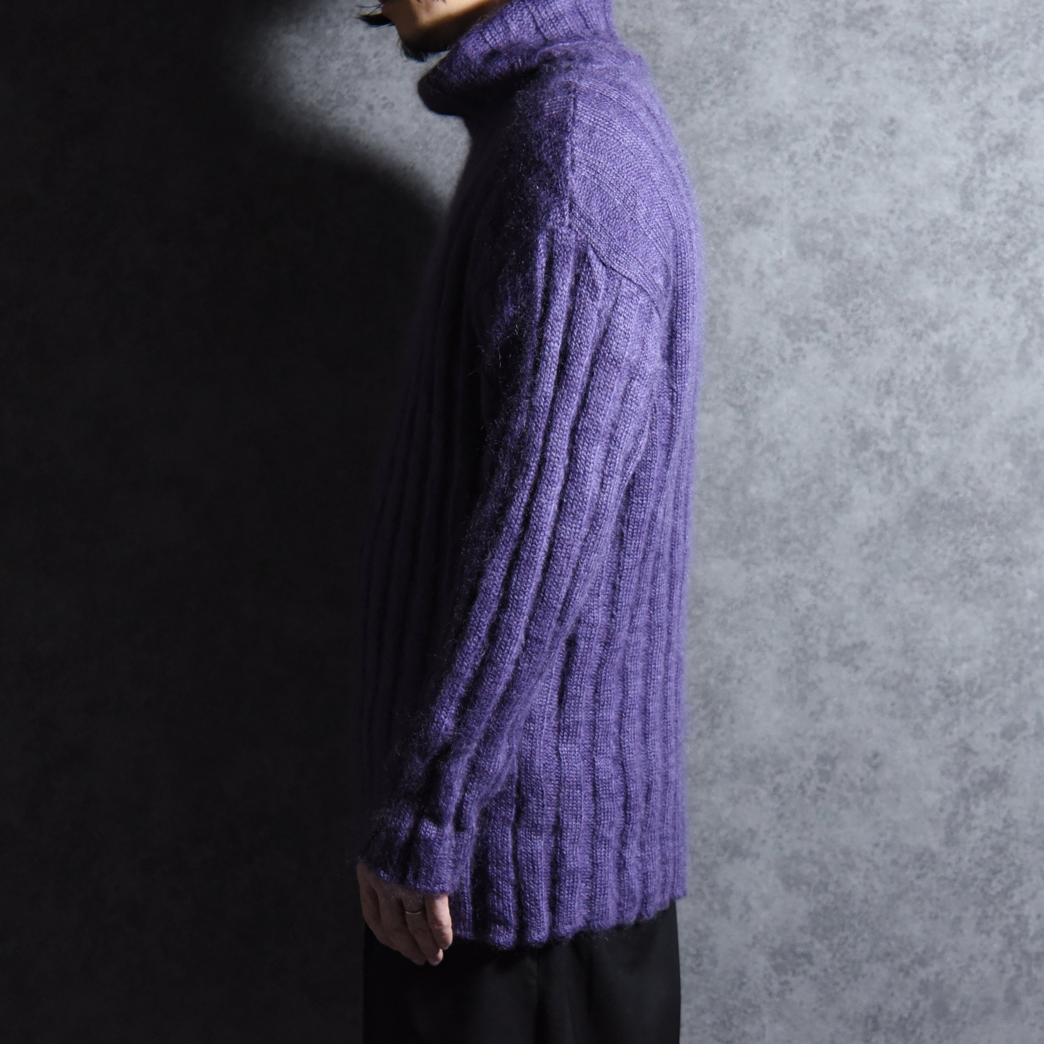 ユニセックスな雰囲気の太めのピッチで編まれたリブが、モヘアの毛足の長さを引き立て、奥行きのある表情、鮮やかでありながら深みのあるパープルは、コートやジャケットの着用時にも襟元がアクセントとなりコーディネートのバランスもとりやすい実用性も高いアイテム。