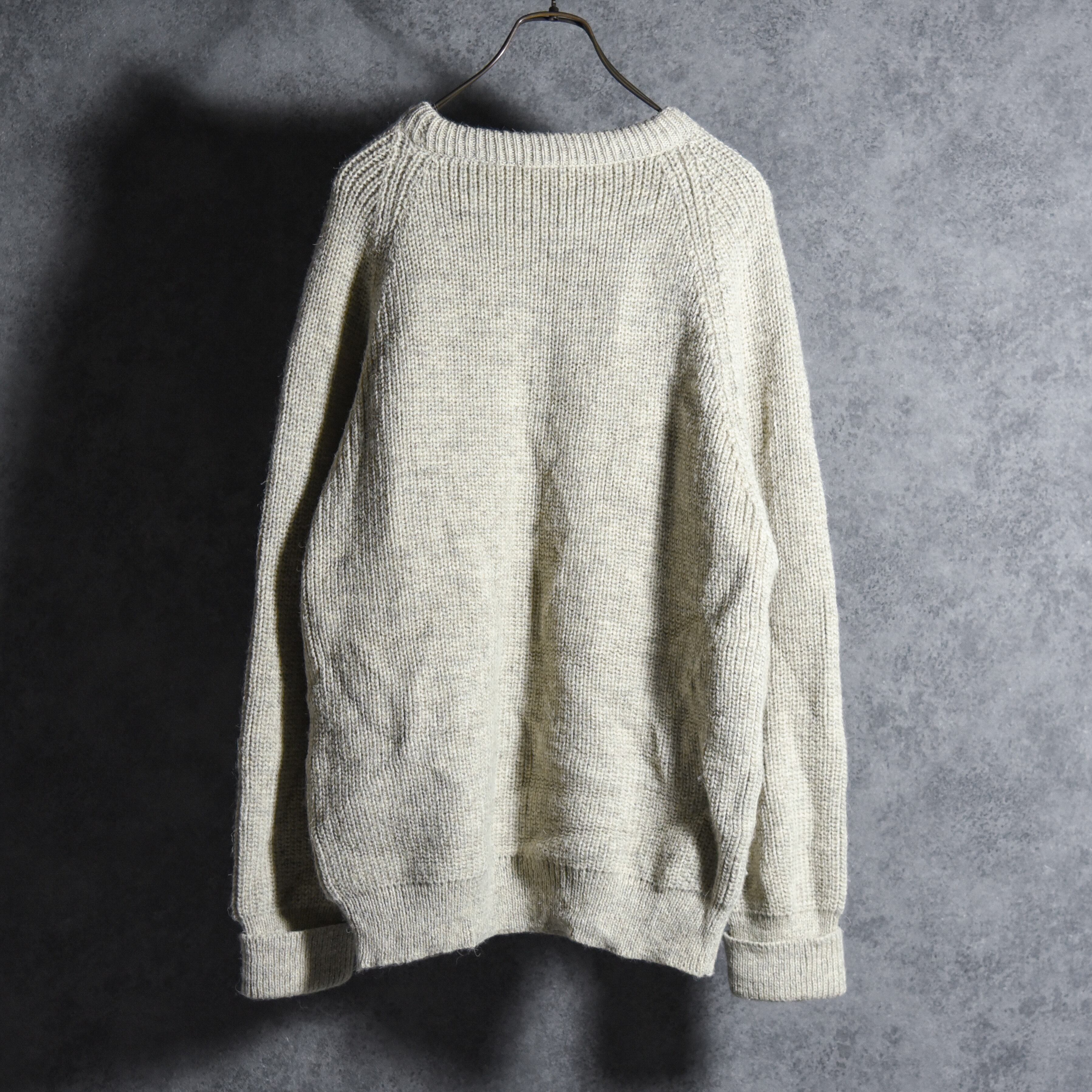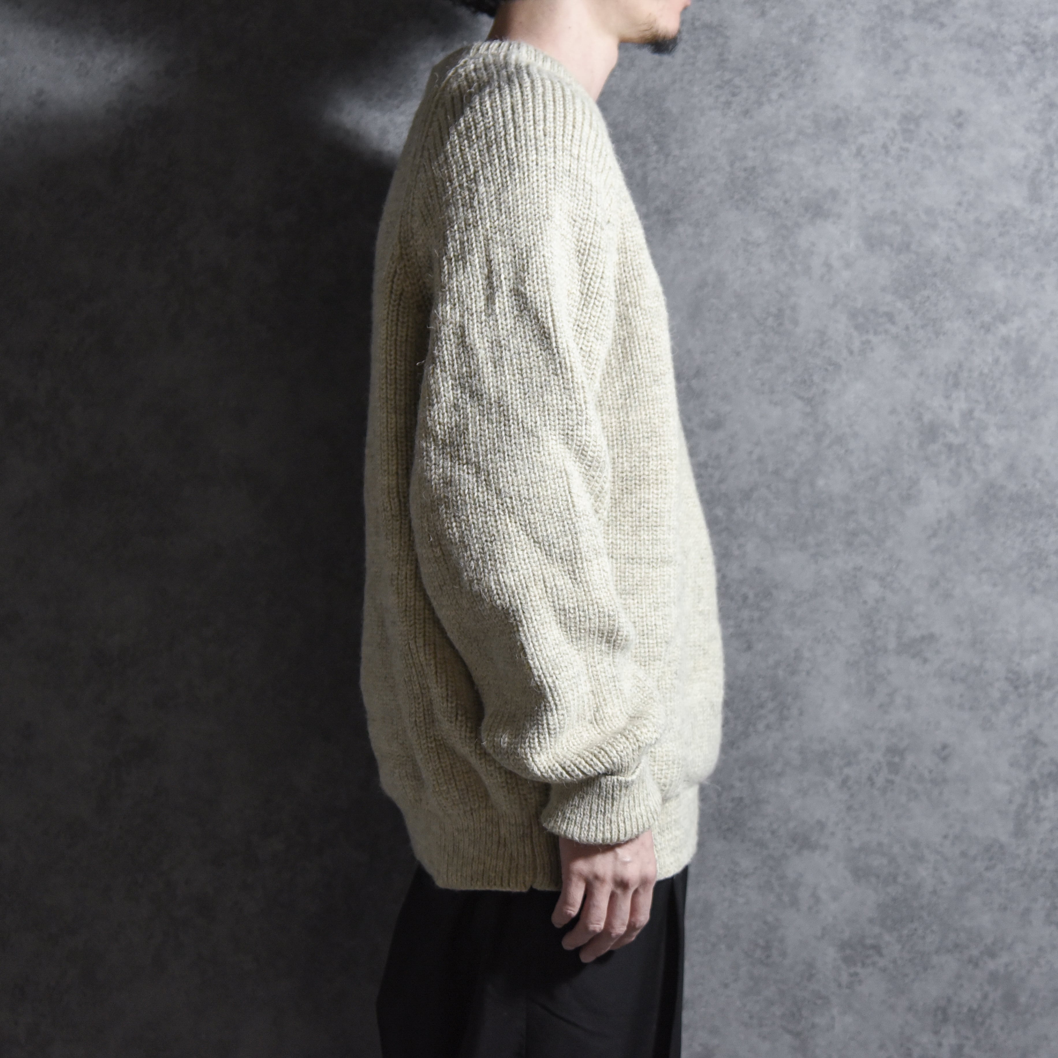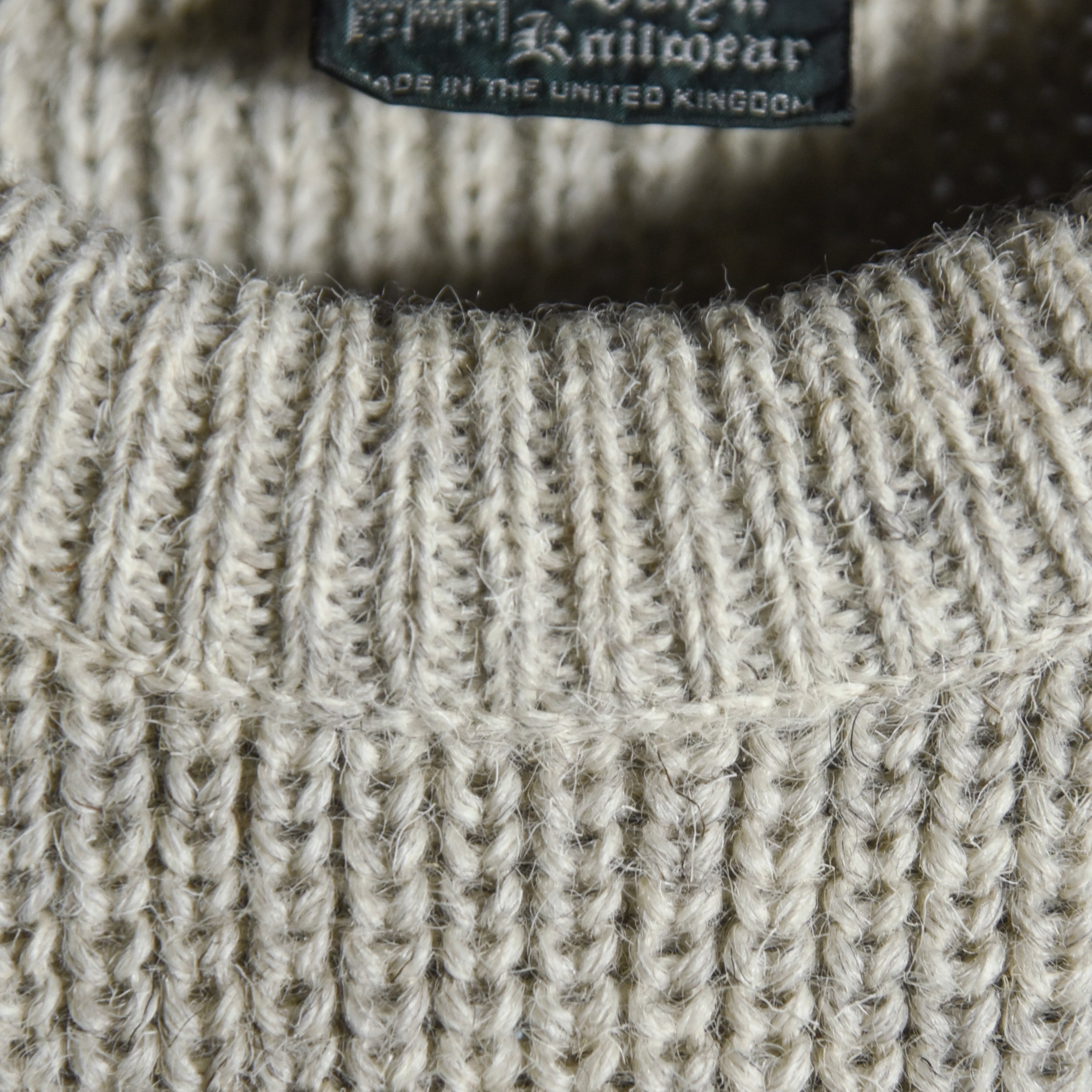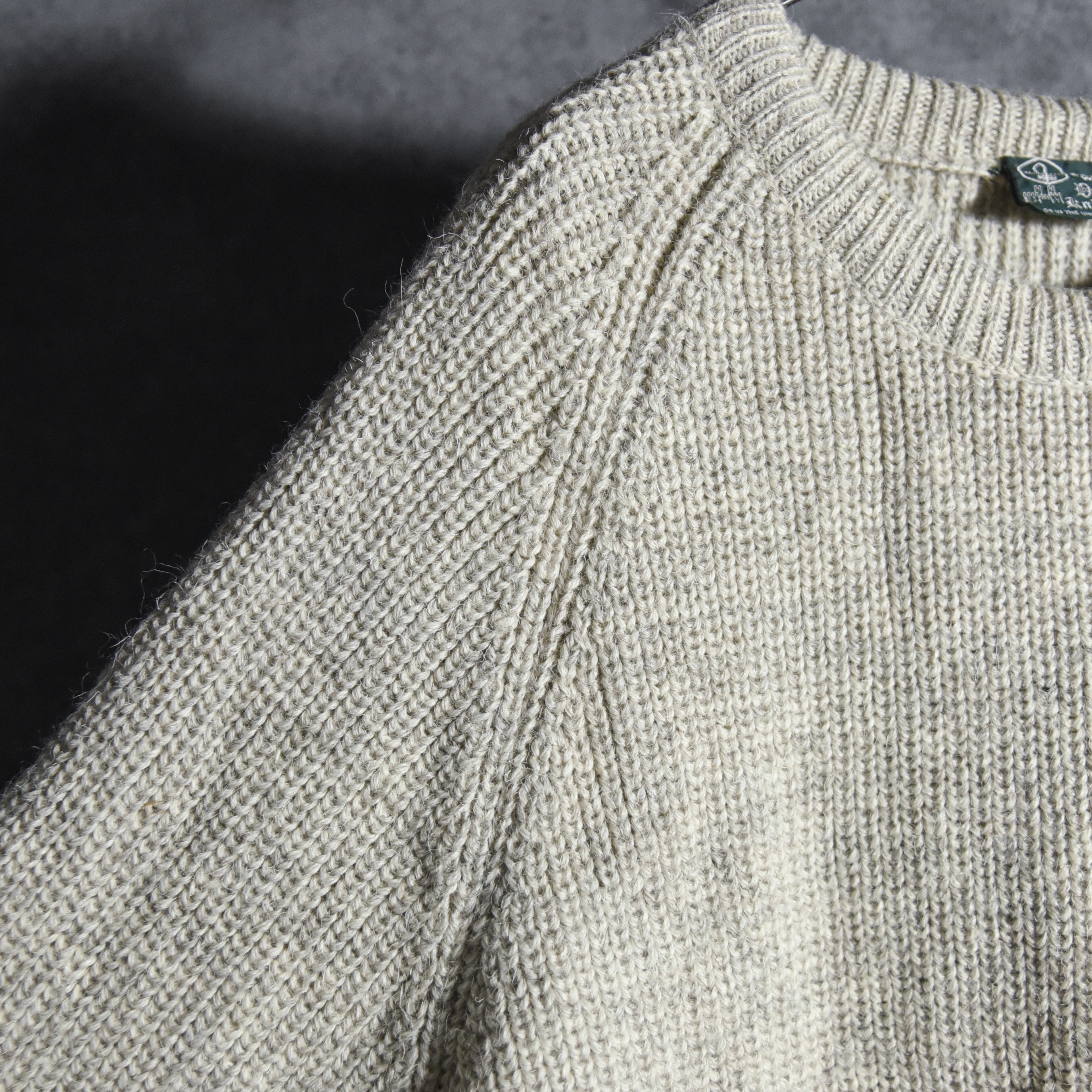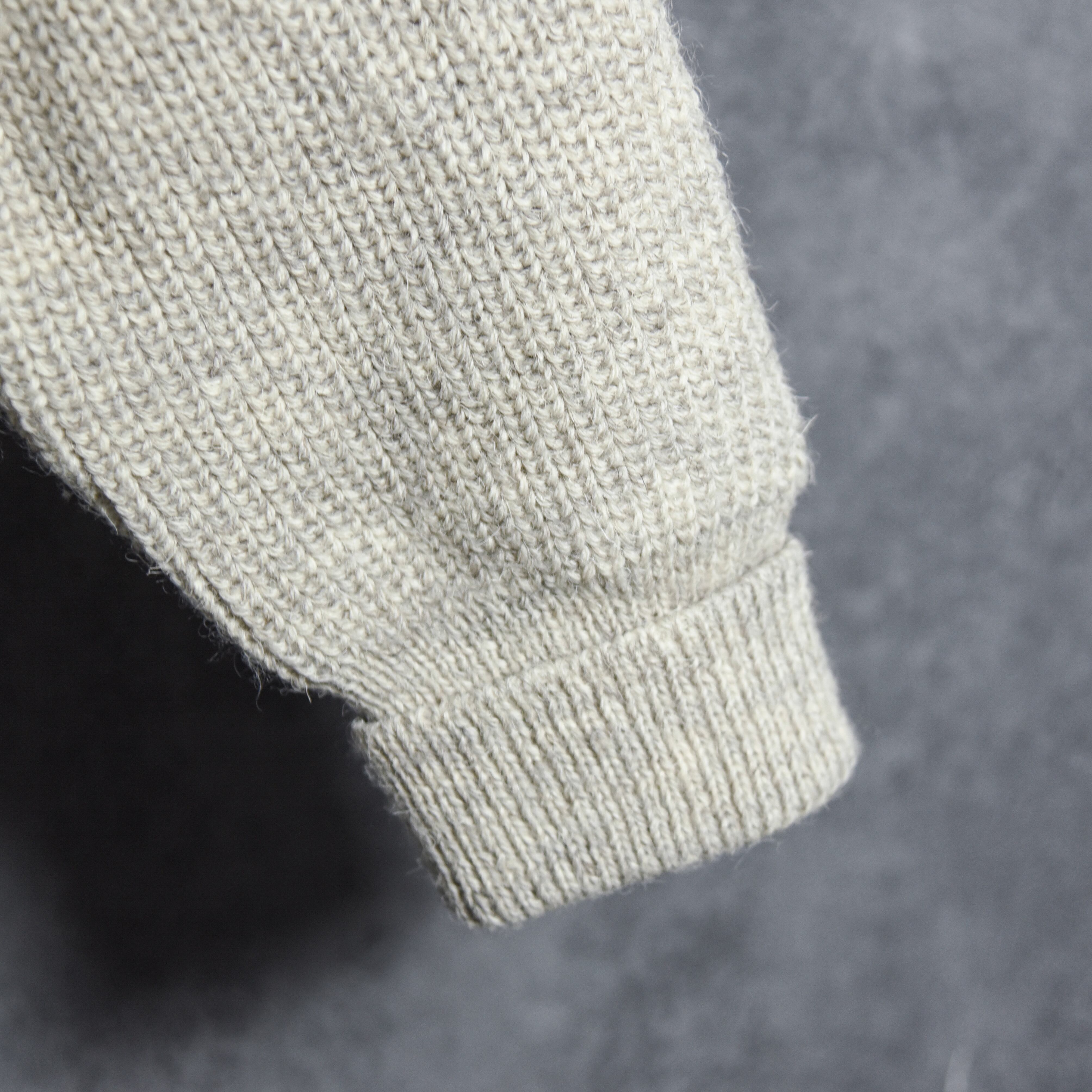 5G程度のローゲージに近い糸で編み上げられた生地は厚手で少しゴワつきがあり、当時の質実剛健なブリティッシュ・ウールを象徴している特徴とも言えます。