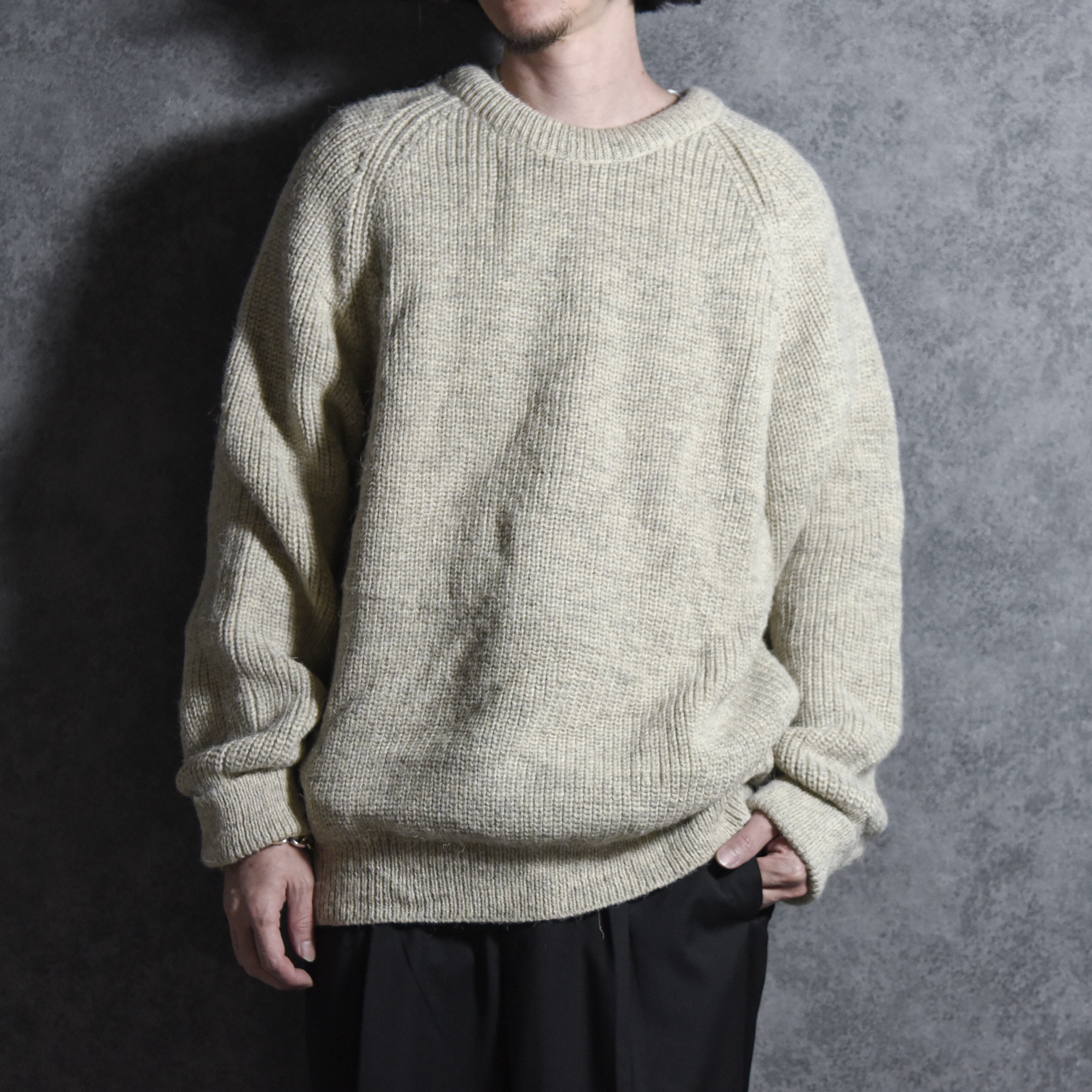 いわゆるフルファッションのラグランスリーブのリブニットで特に肩のラインがきれいなパターンでお手本のような王道のディテール。