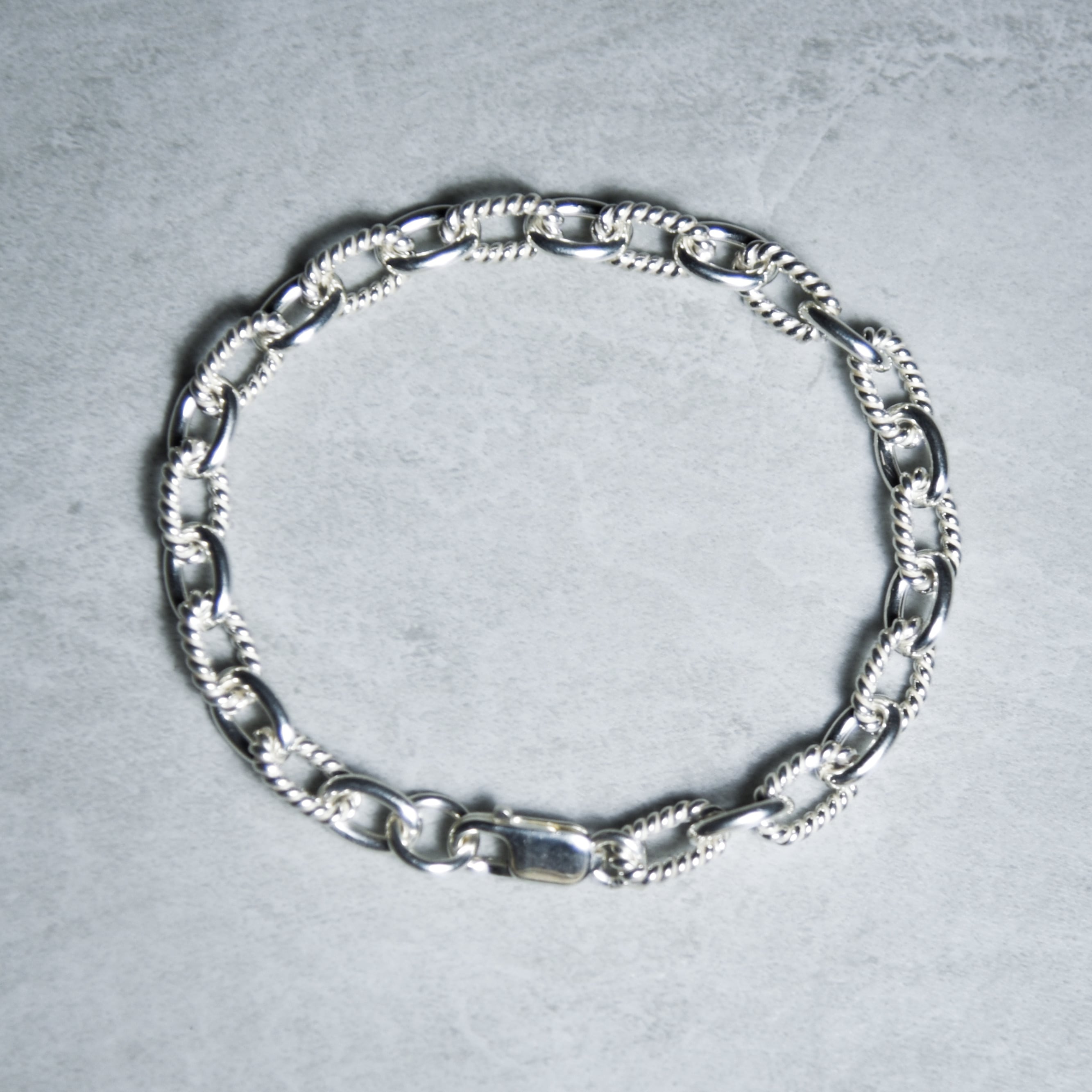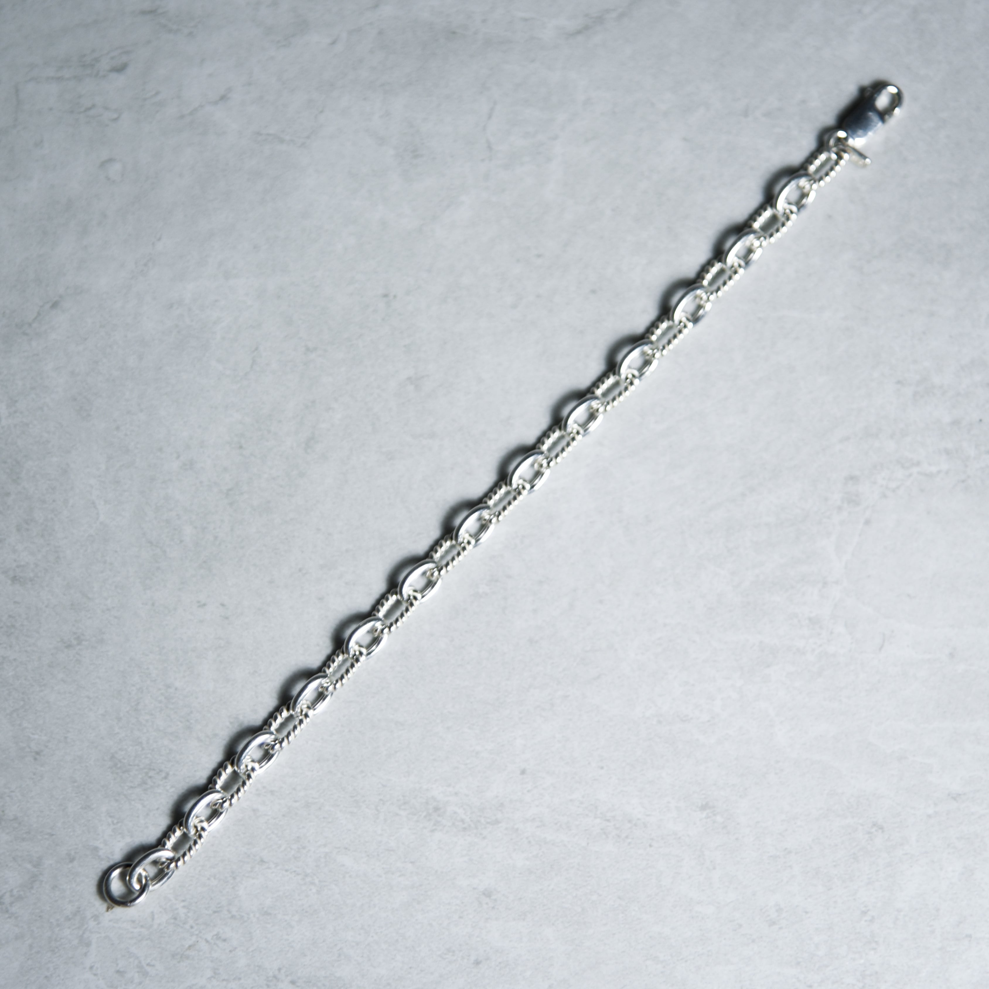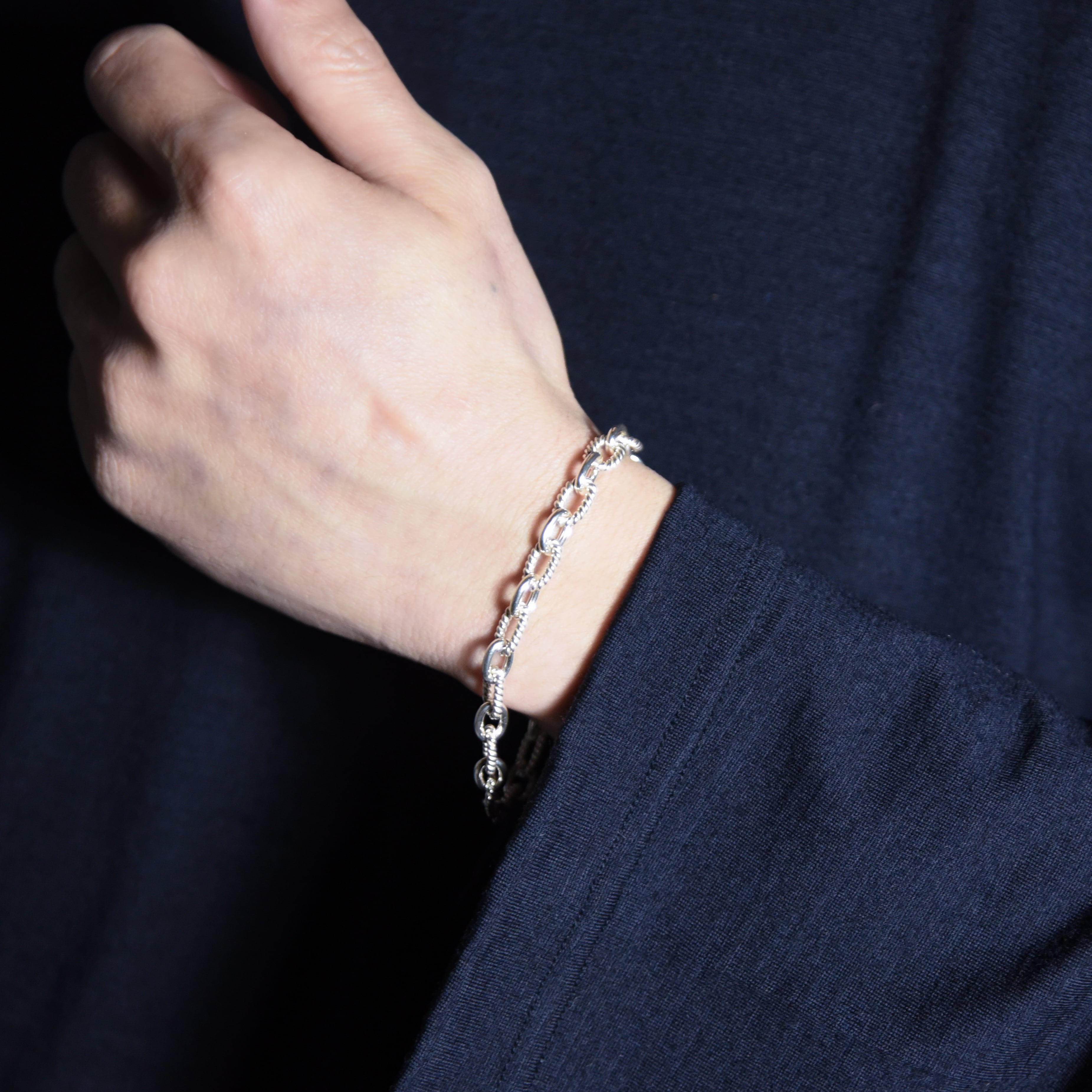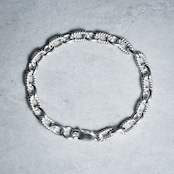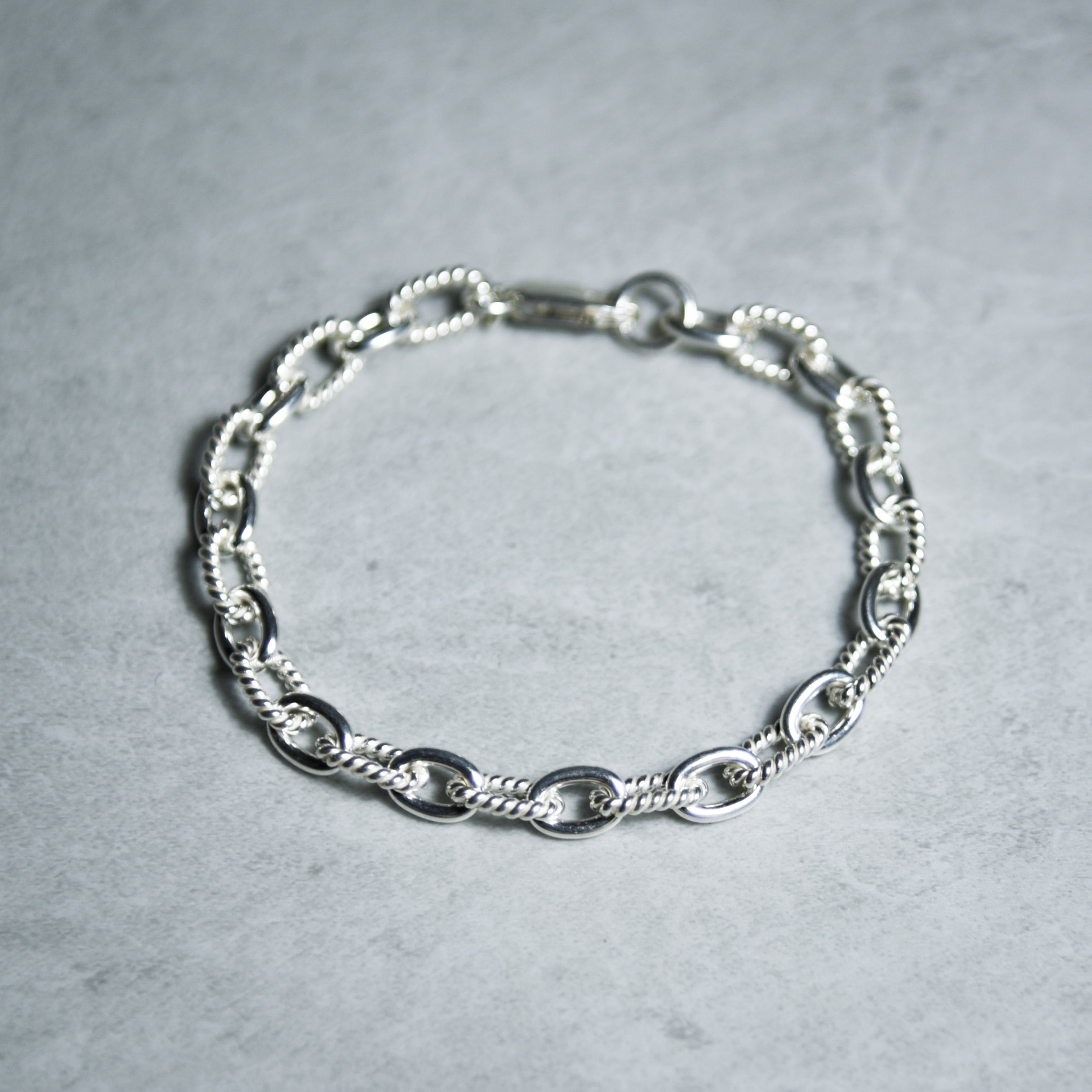 オーバルパーツとロープテクスチャーの対称的なパーツが交互に組み合わされたブレスレット。