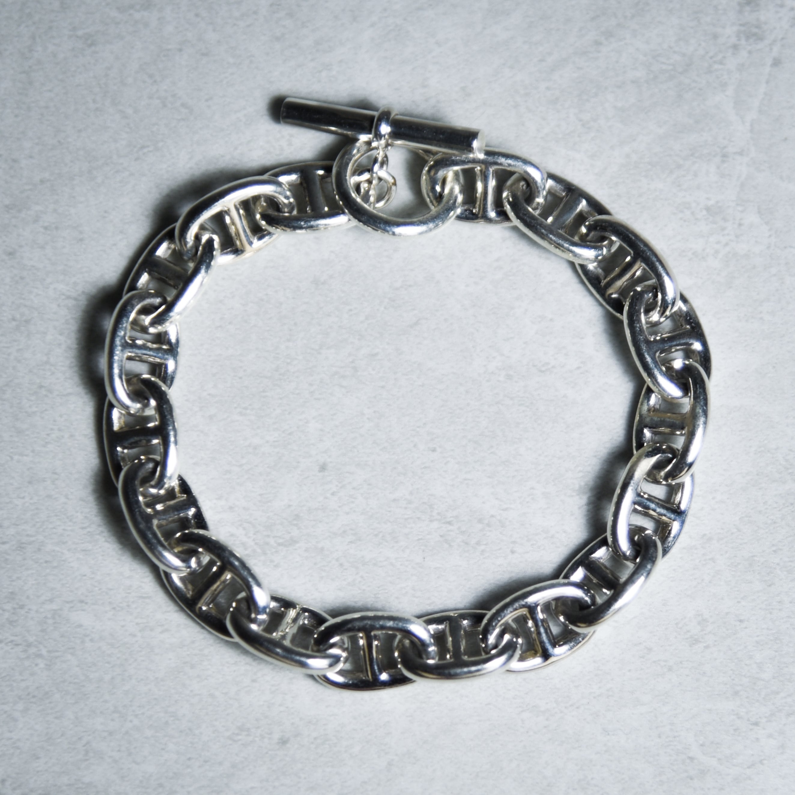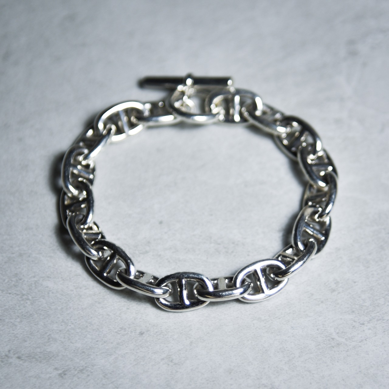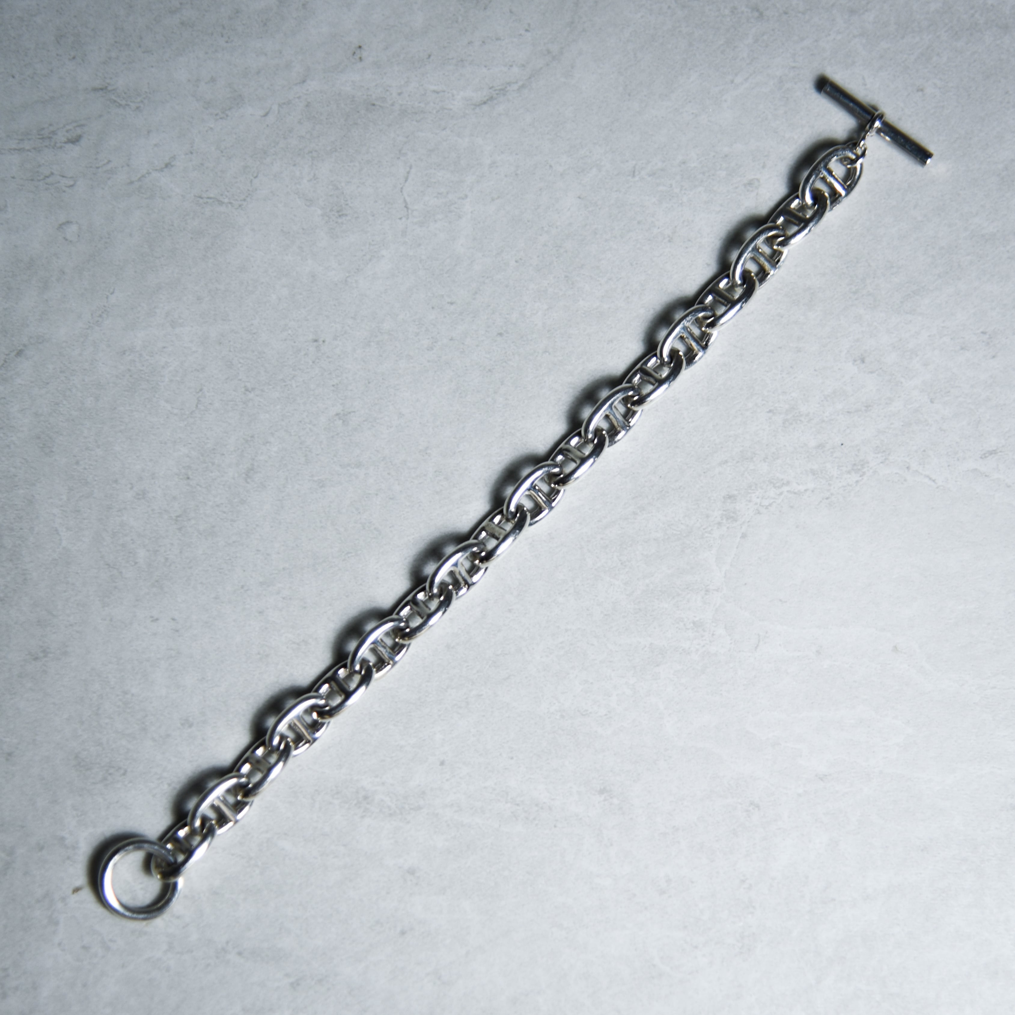 アンカーチェーンをオーバルのコマで連結したデザイン性の高いブレスレット。