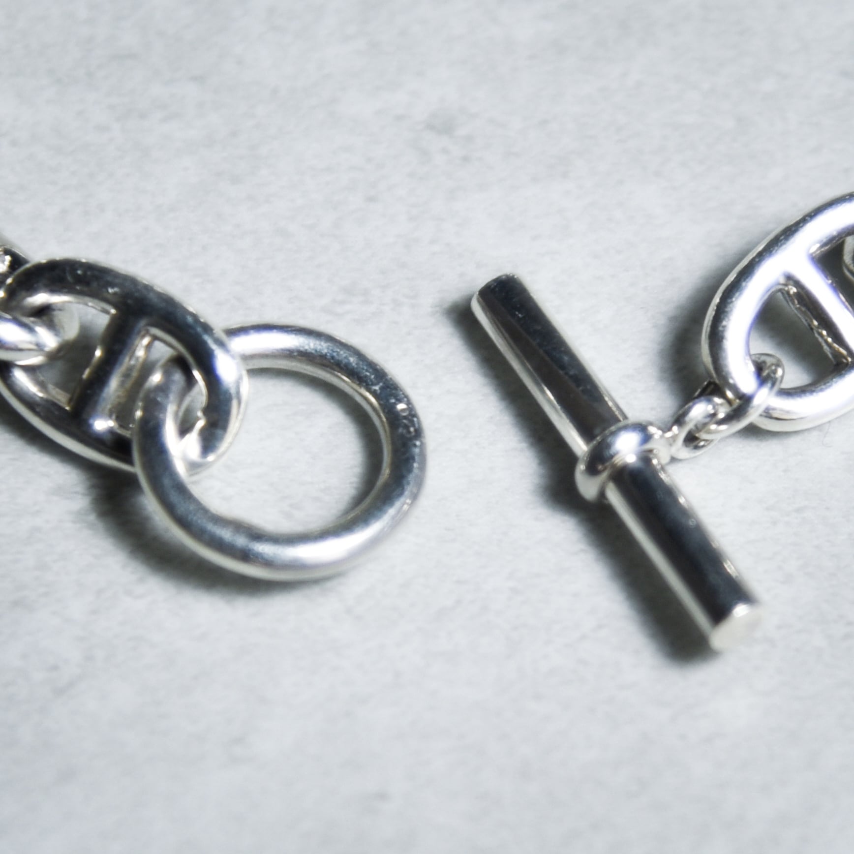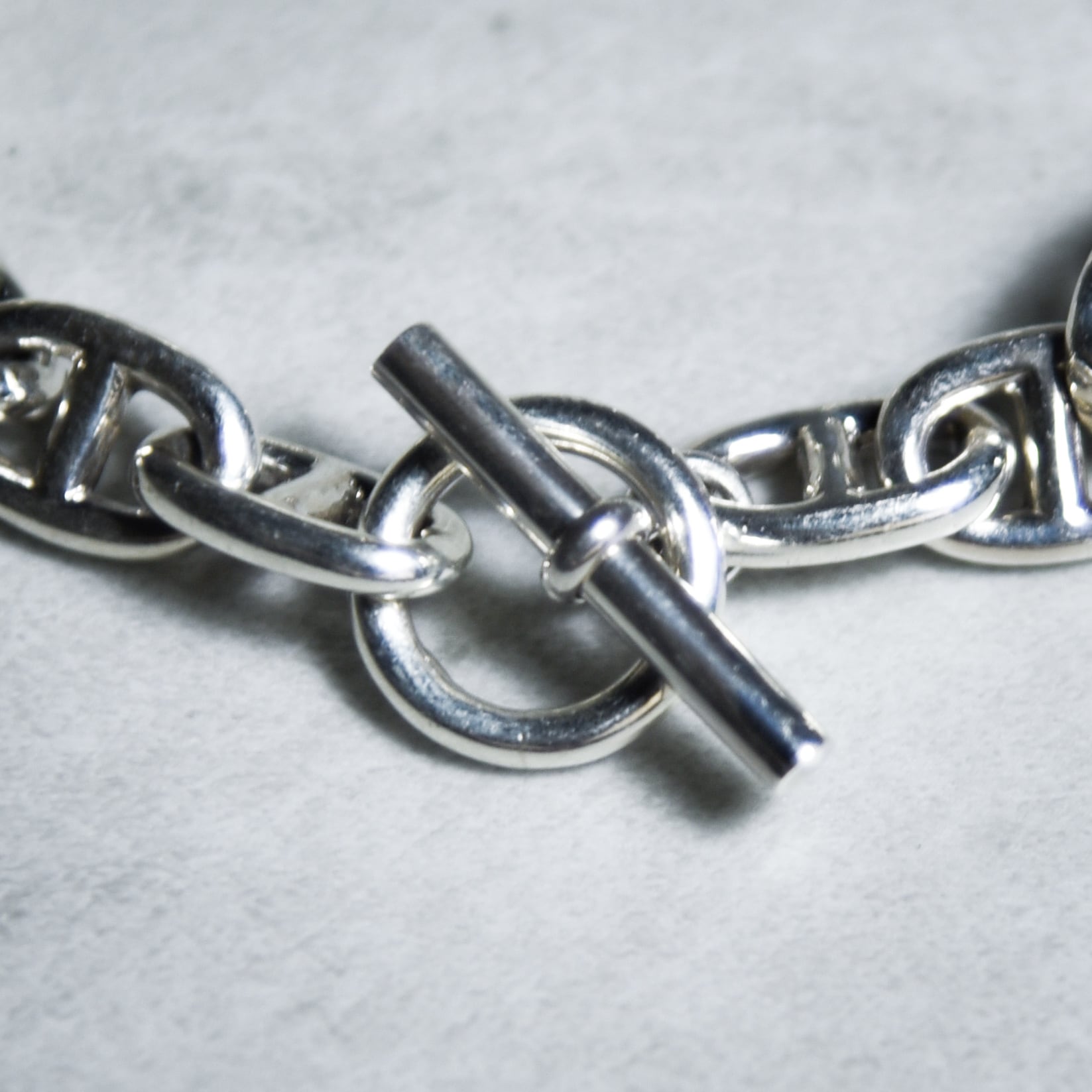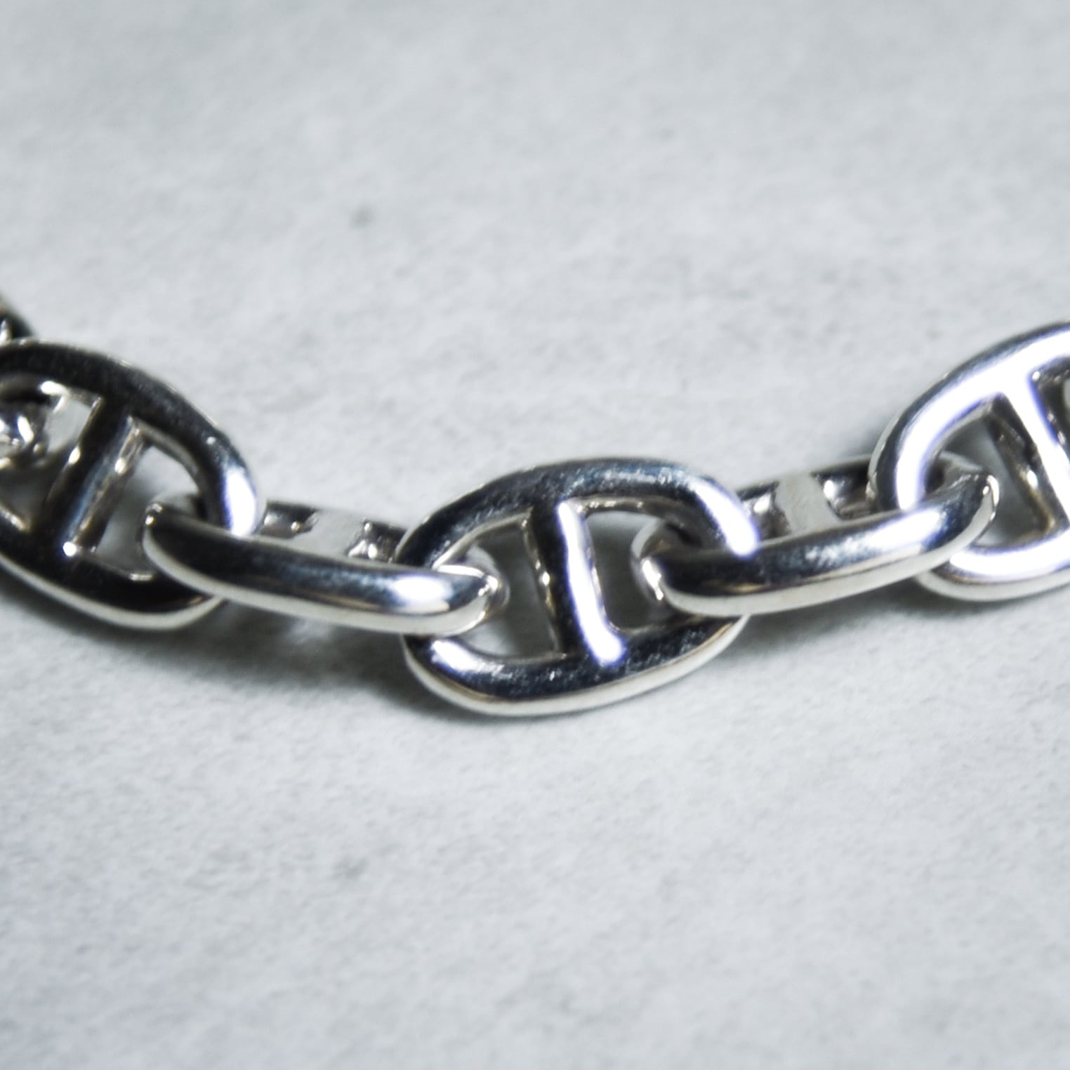 アンカーチェーンをオーバルのコマで連結したデザイン性の高いブレスレット。