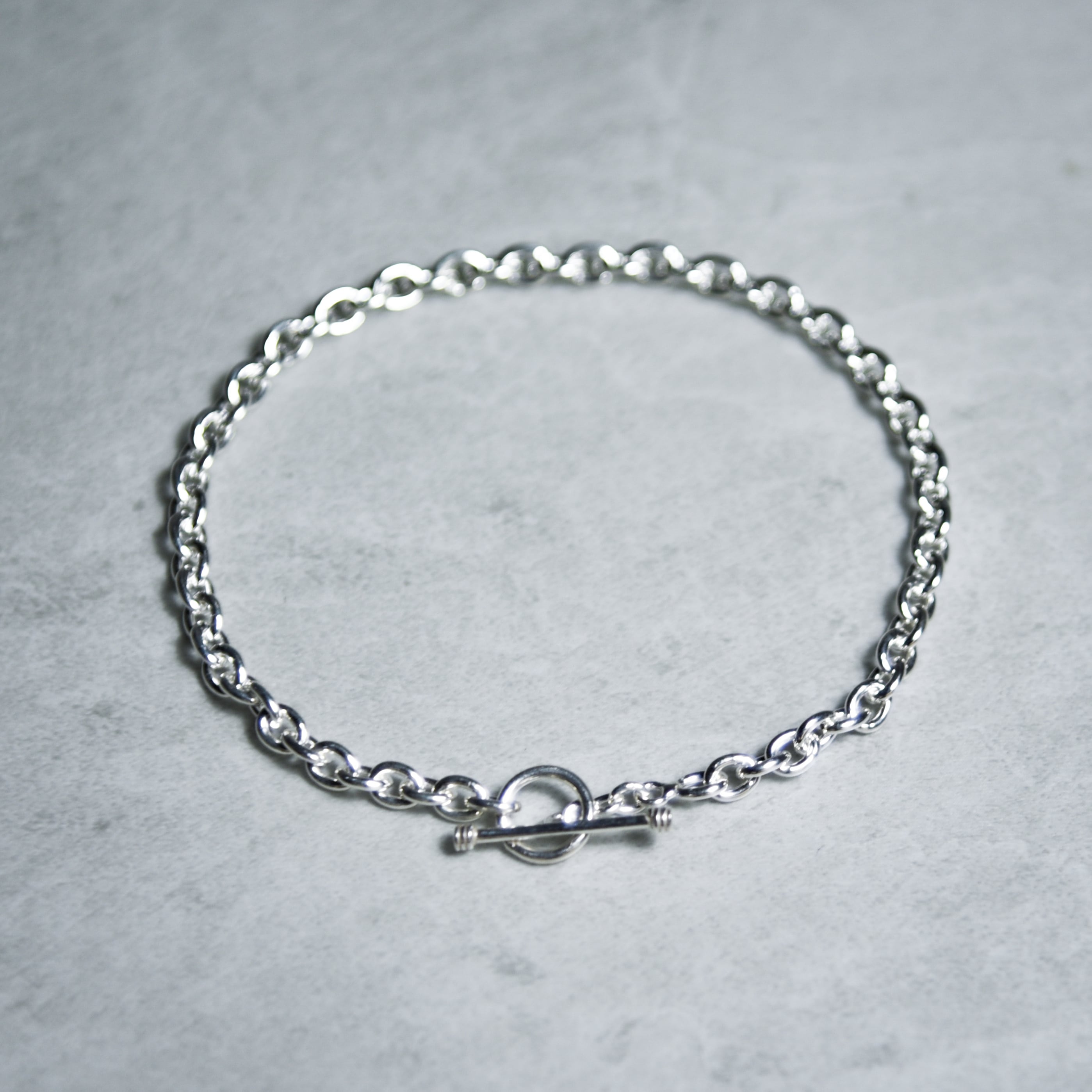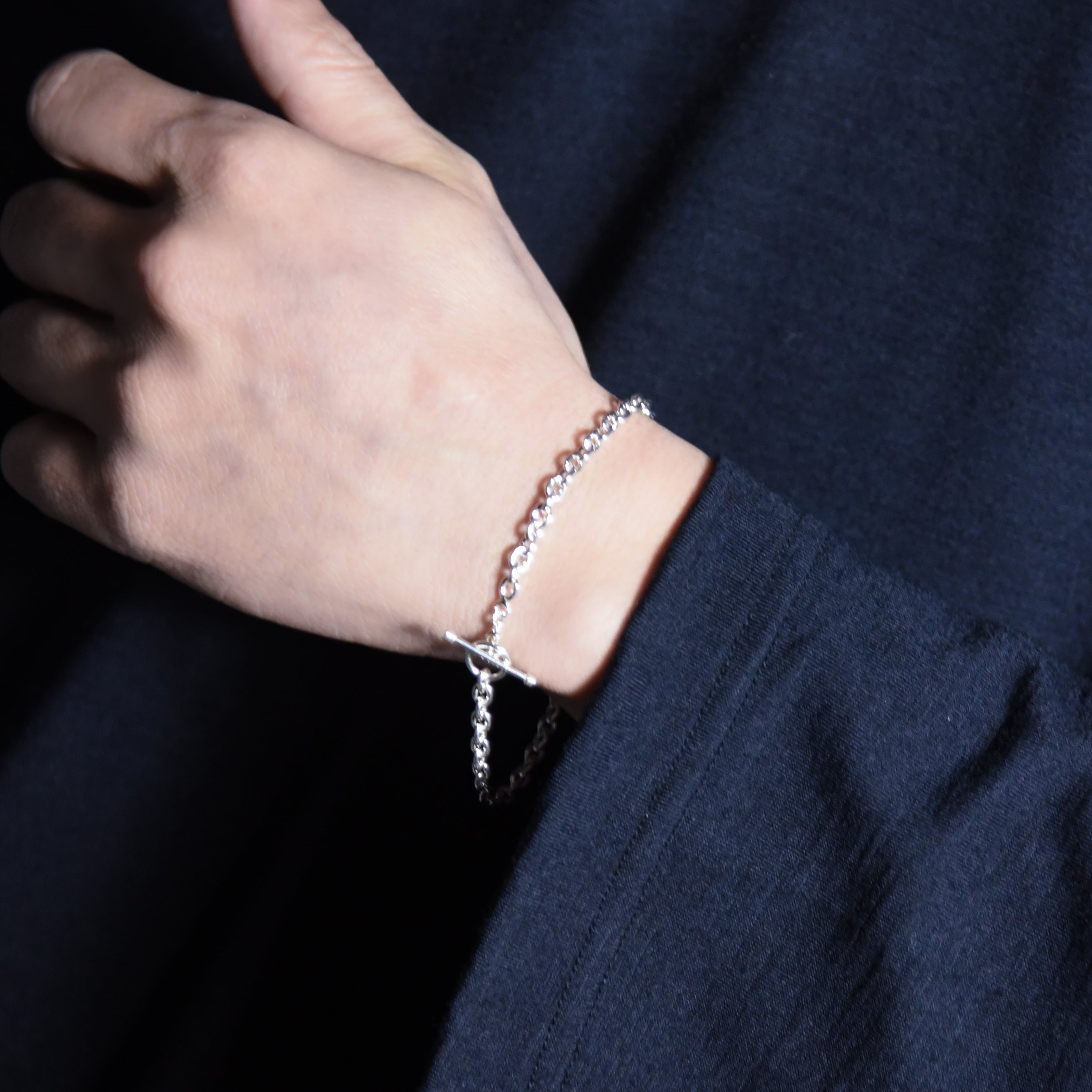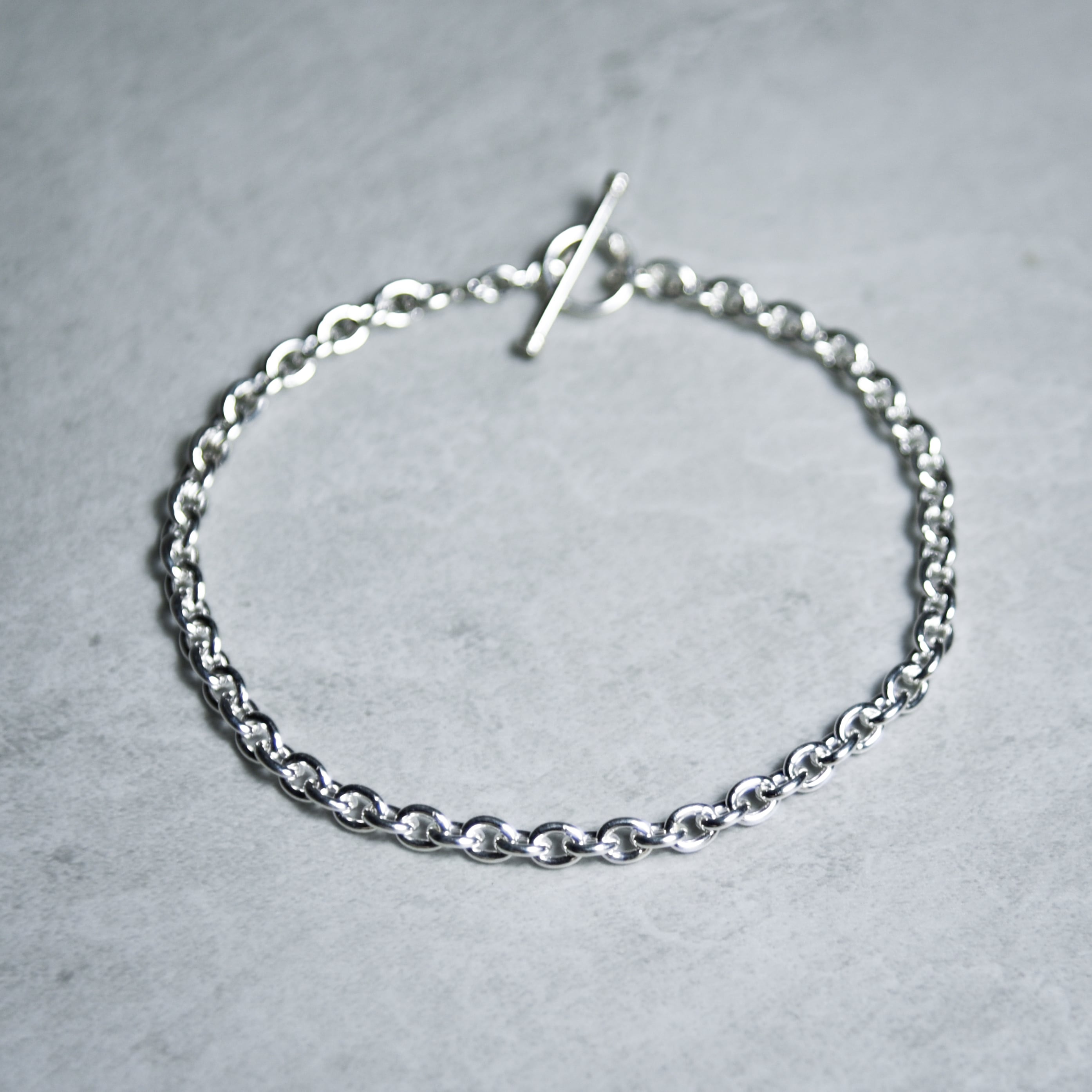 オーバル型とリンクとTバーとトグルのエンドパーツで構成されたミニマルな印象を受けるブレスレット。