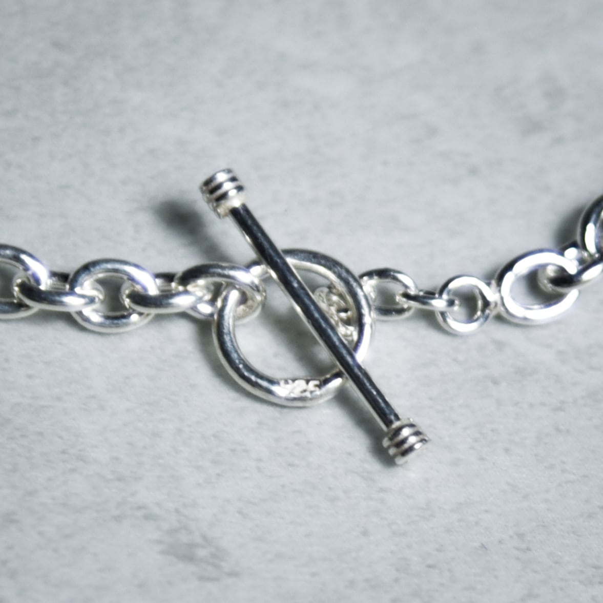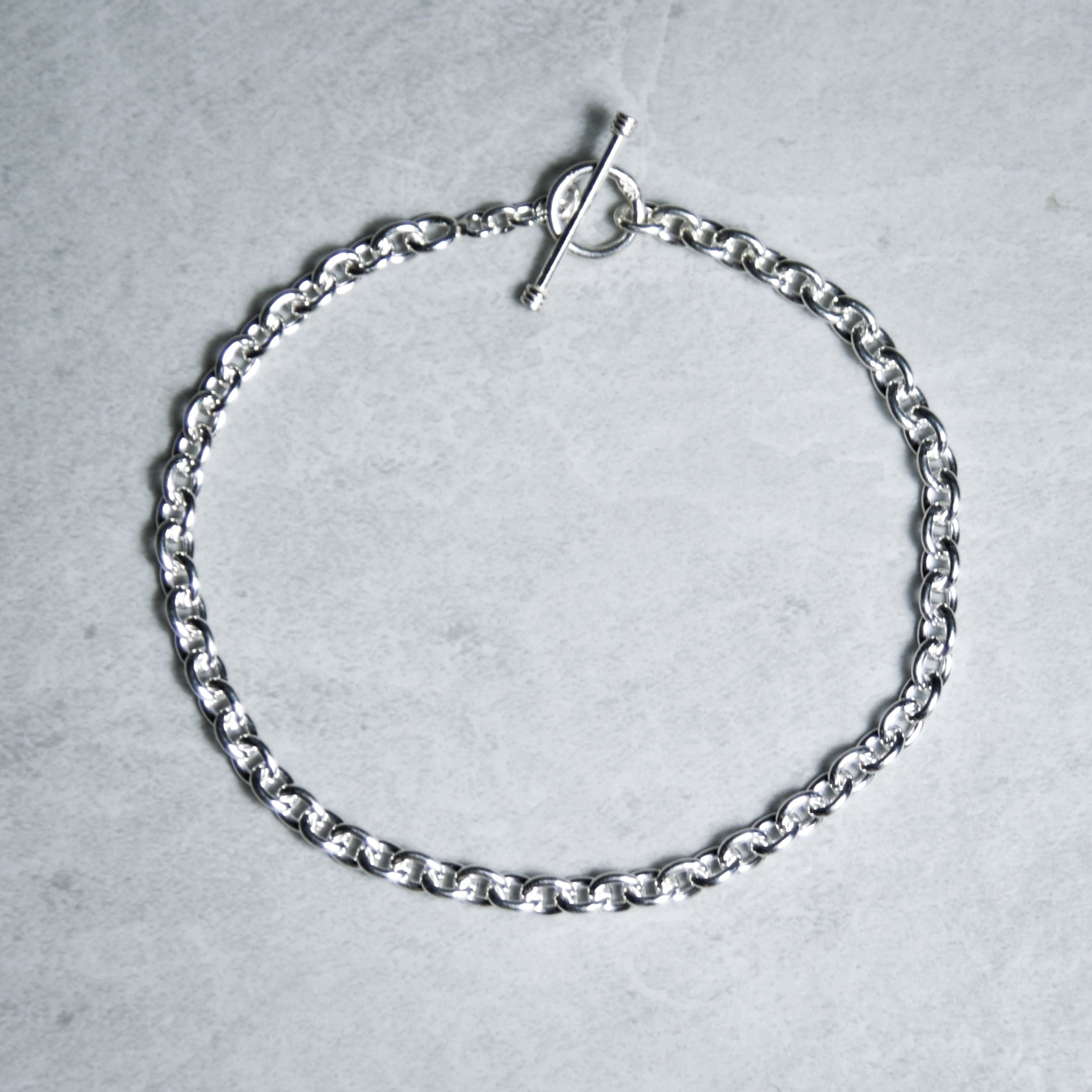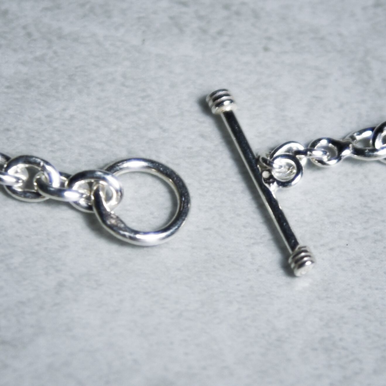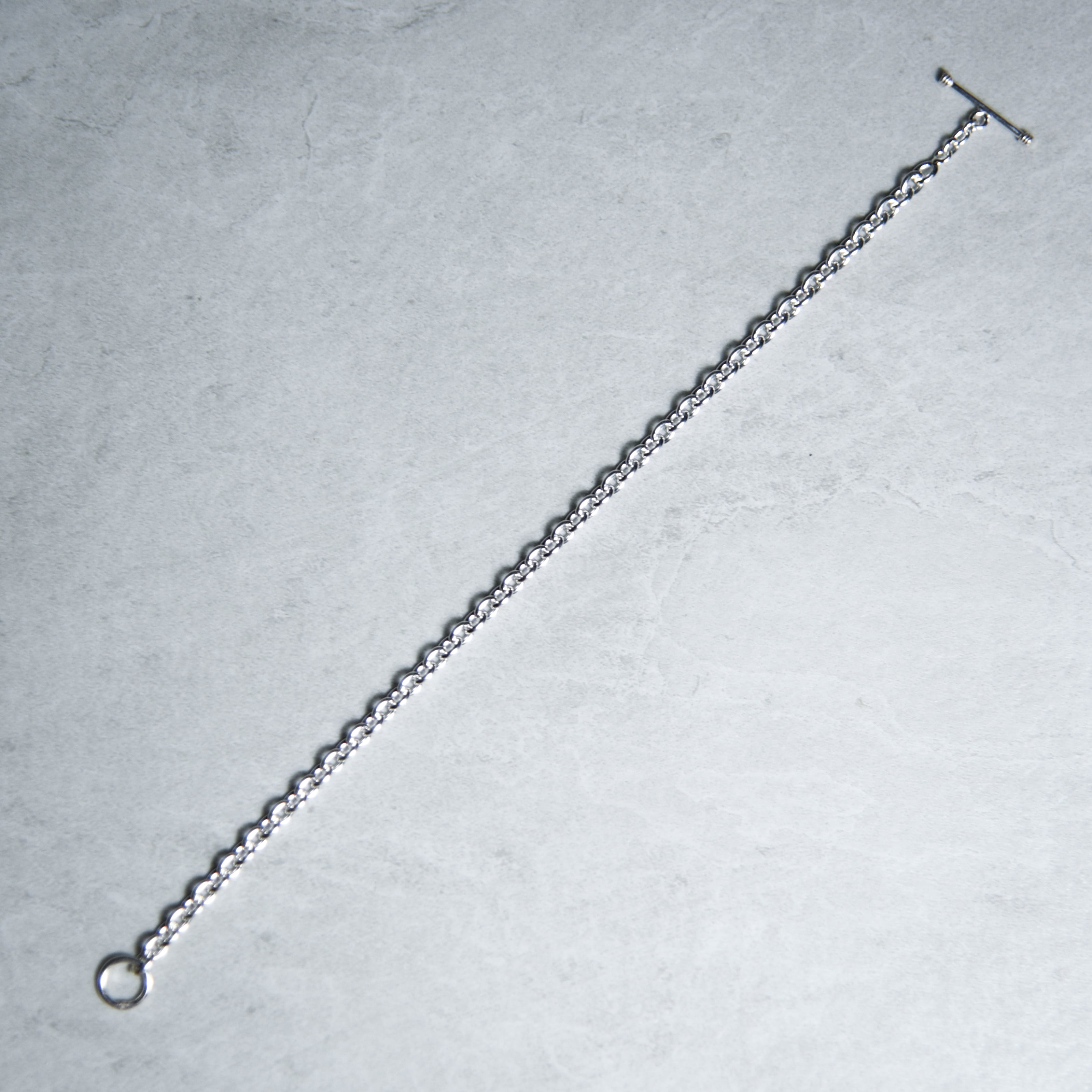 オーバル型とリンクとTバーとトグルのエンドパーツで構成されたミニマルな印象を受けるブレスレット。