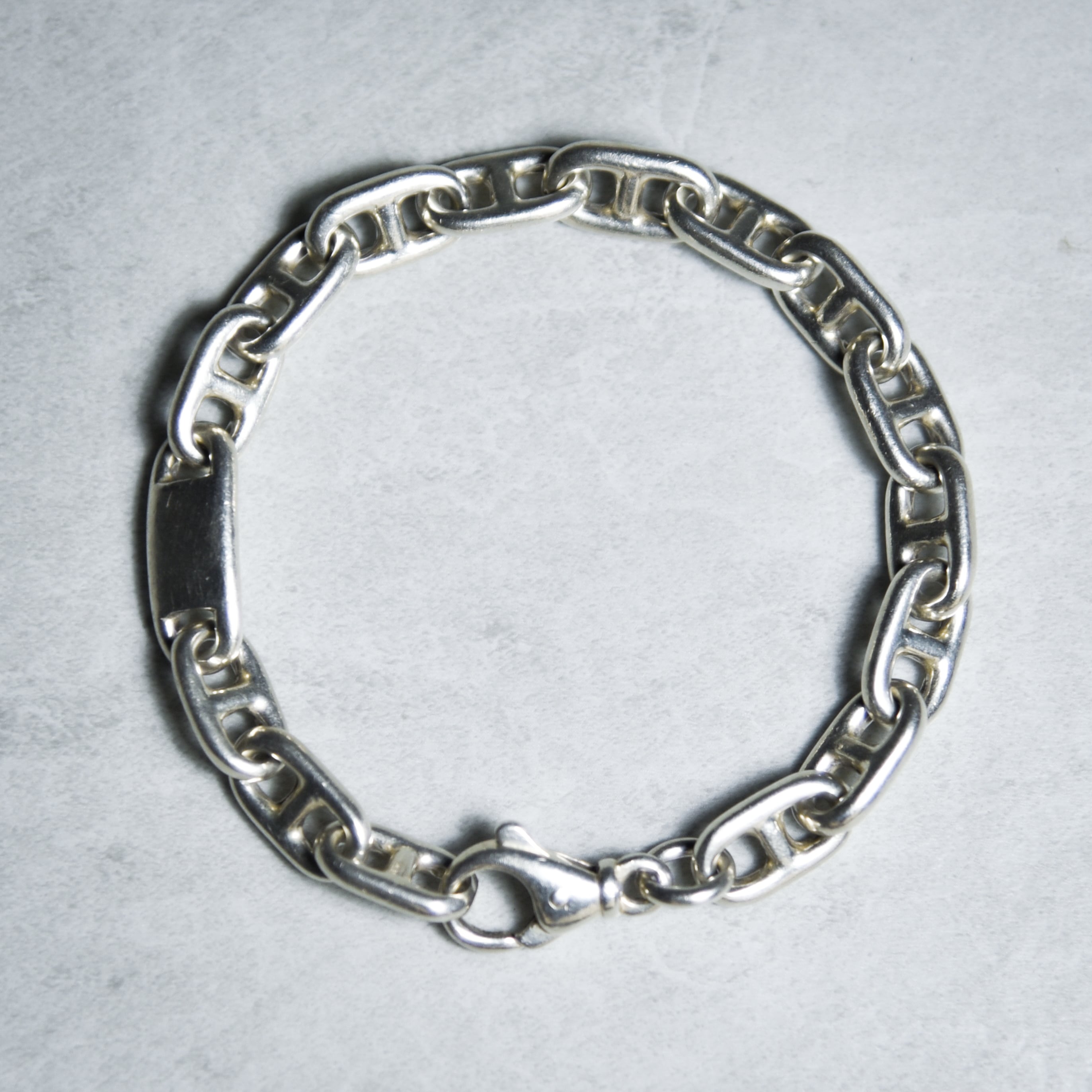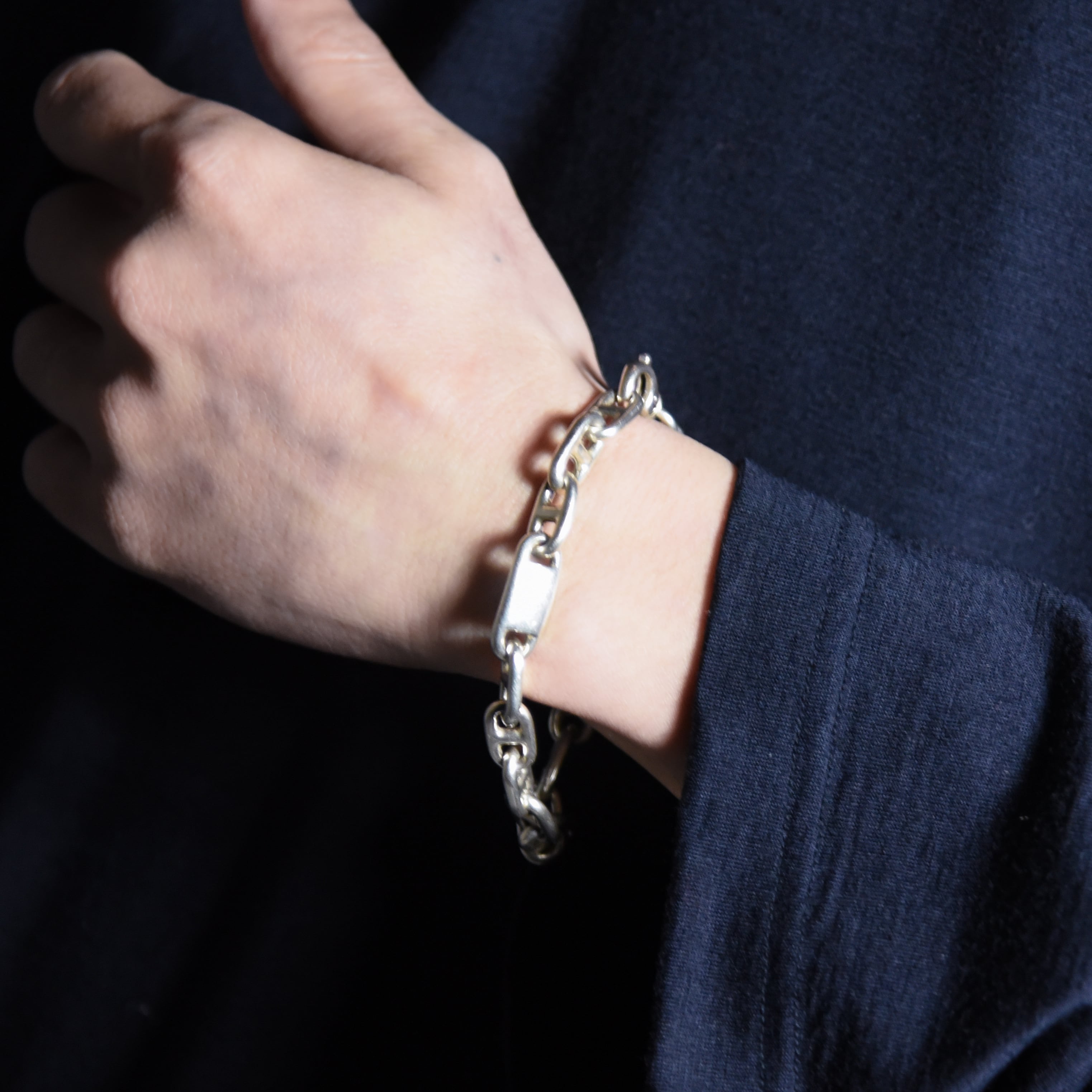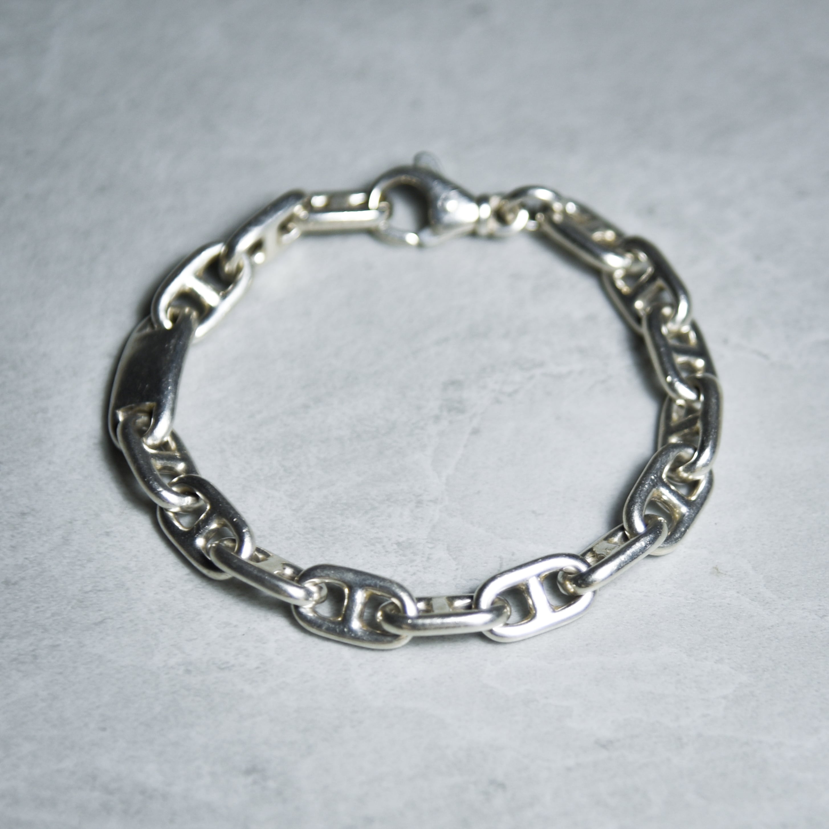 アンカーチェーンをオーバルのコマで連結したデザイン性の高いブレスレット。