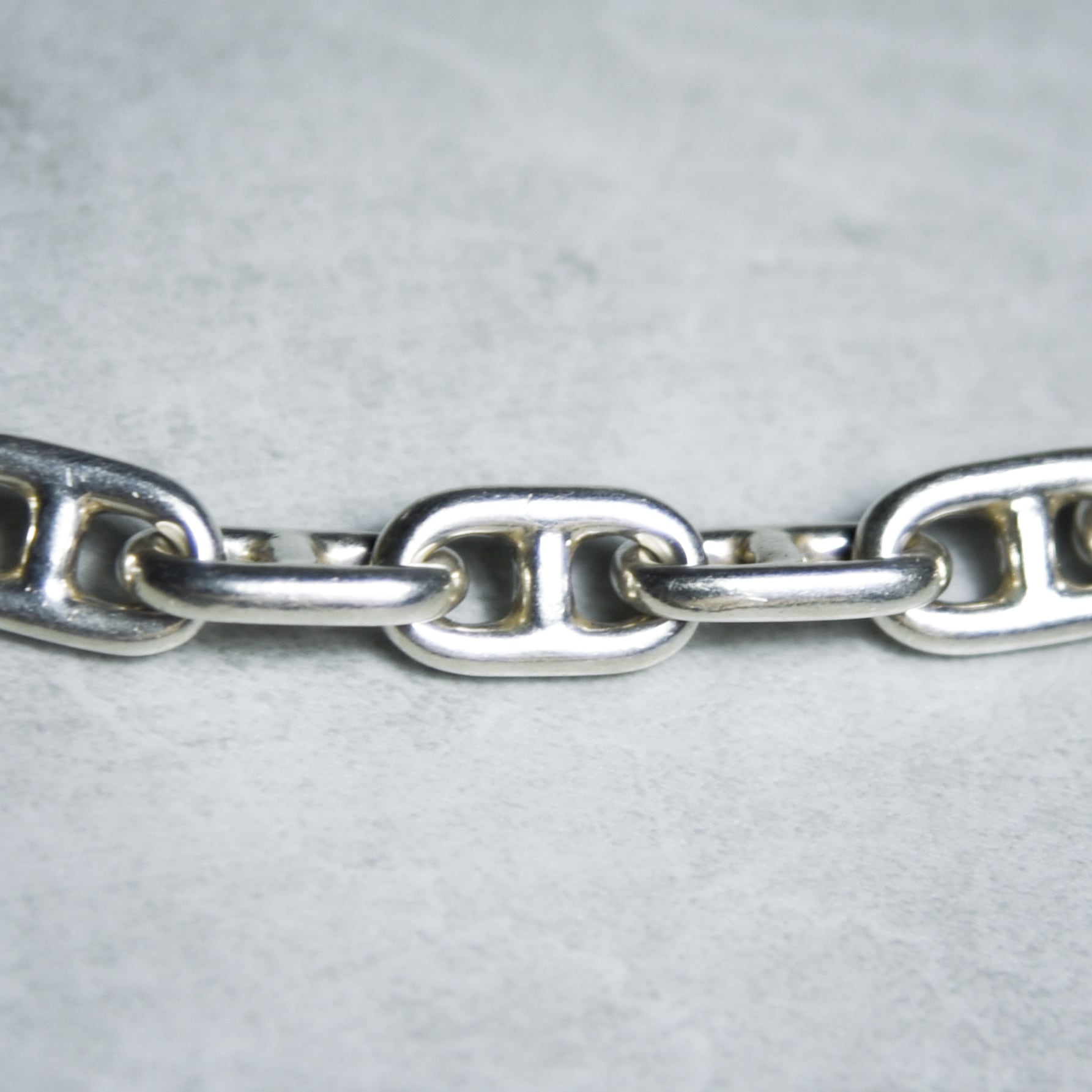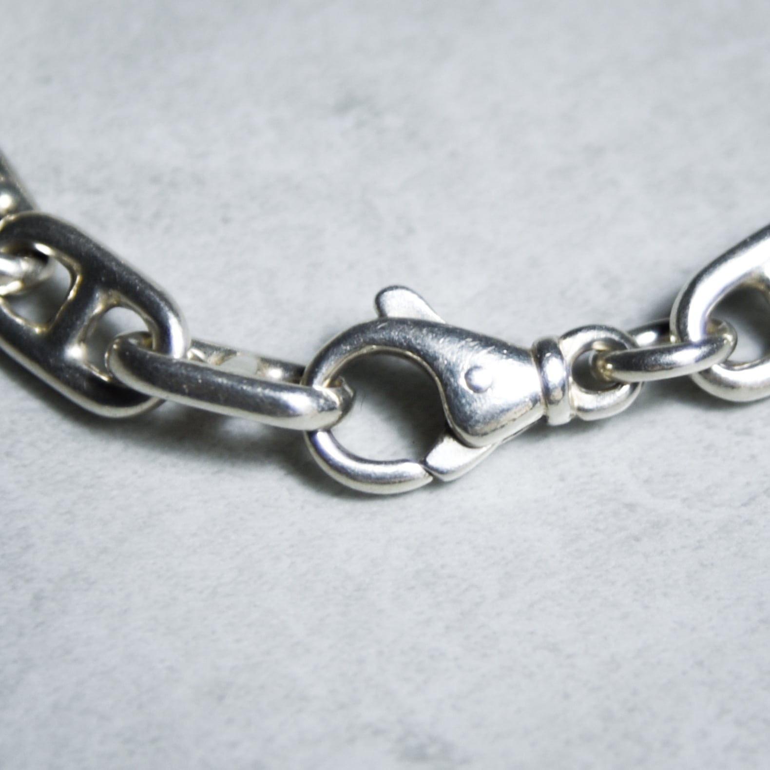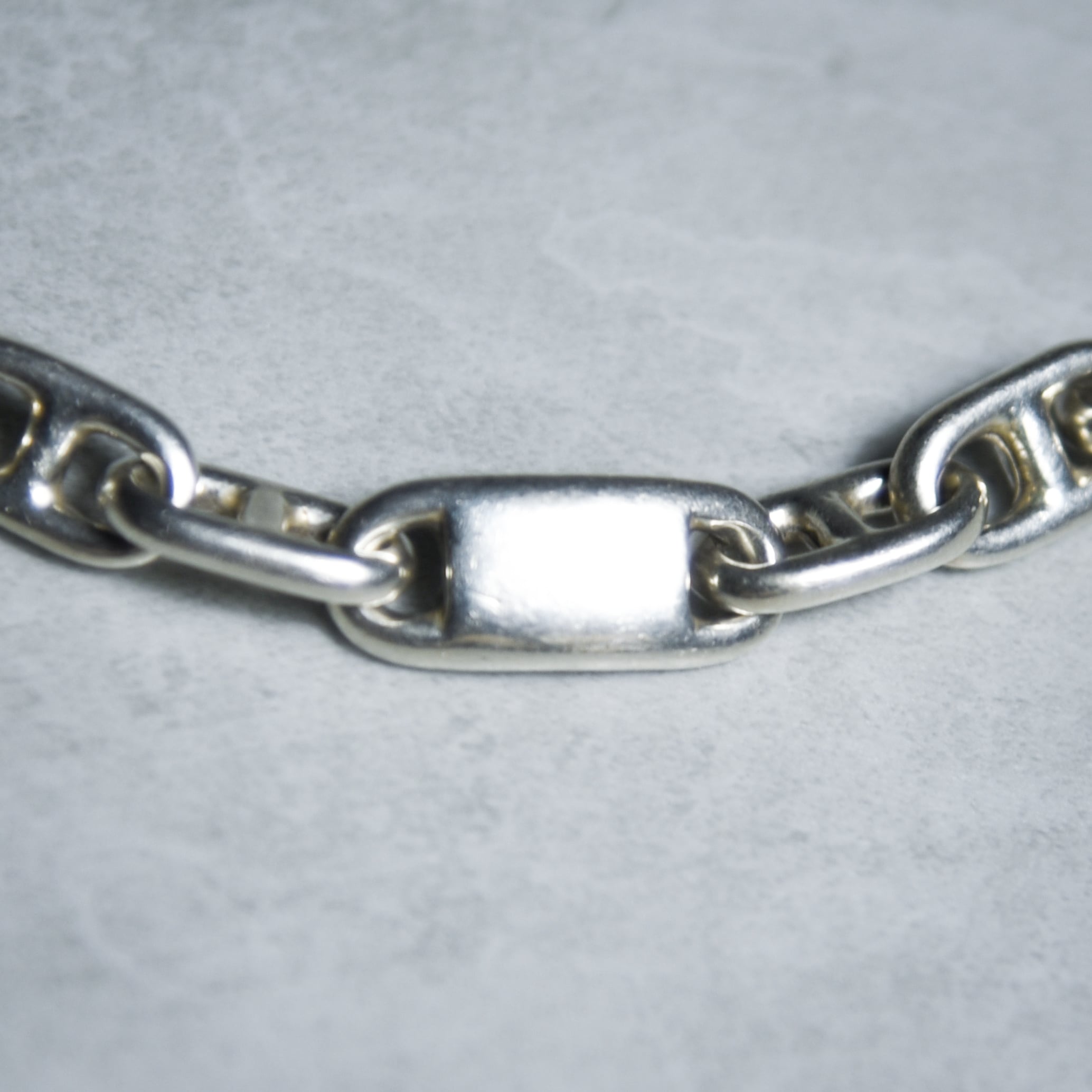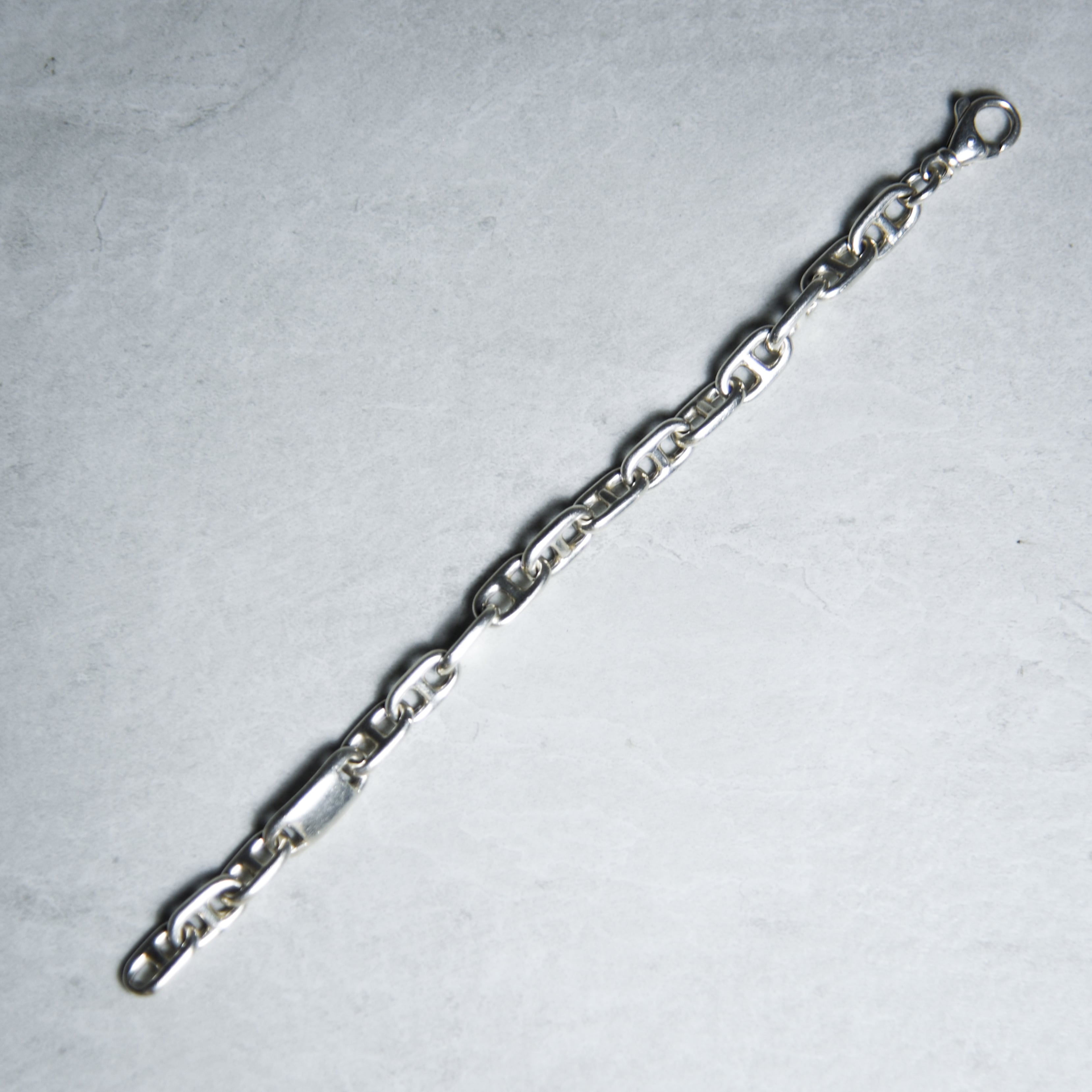 アンカーチェーンをオーバルのコマで連結したデザイン性の高いブレスレット。