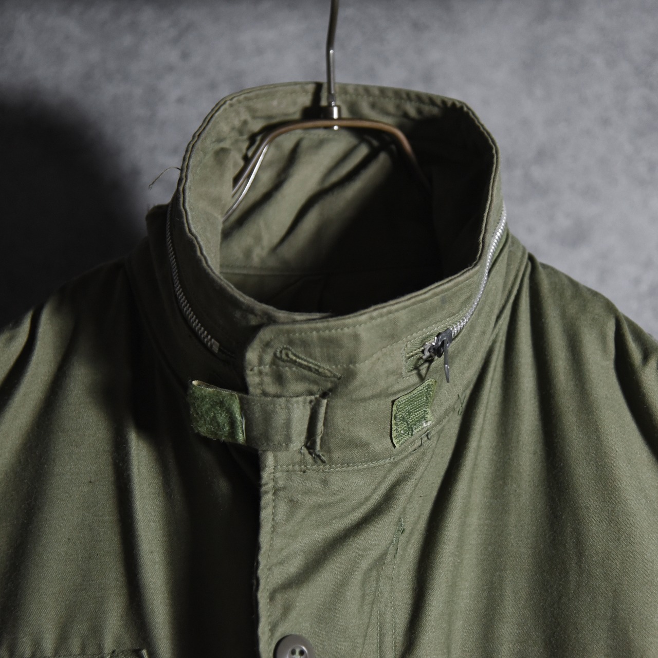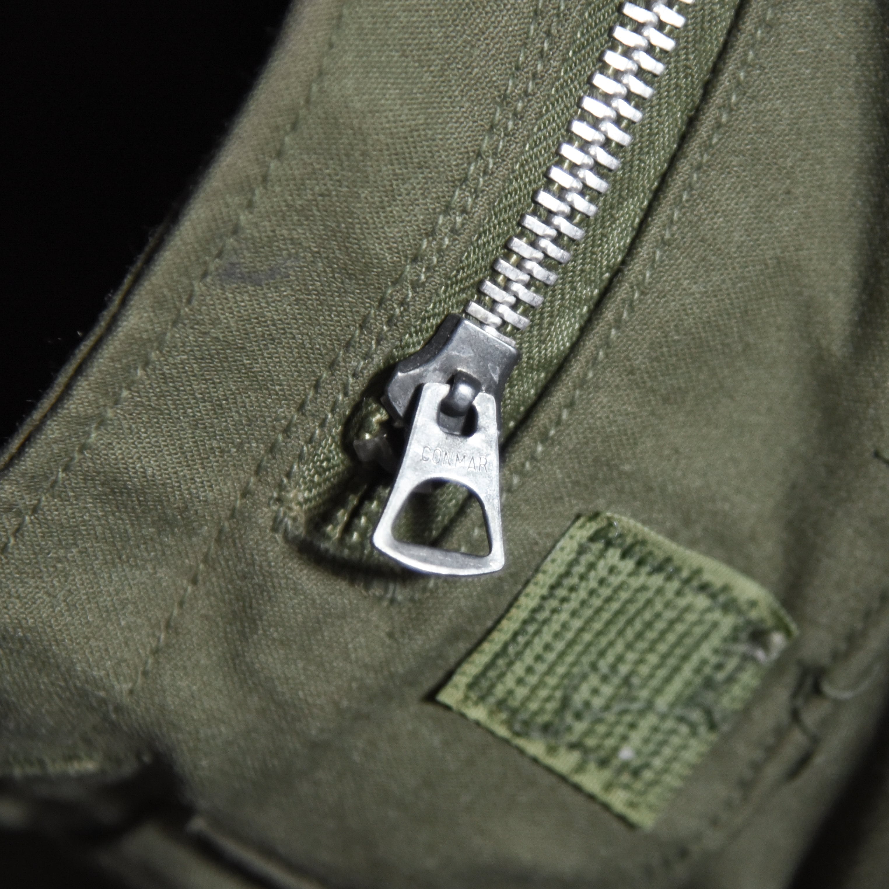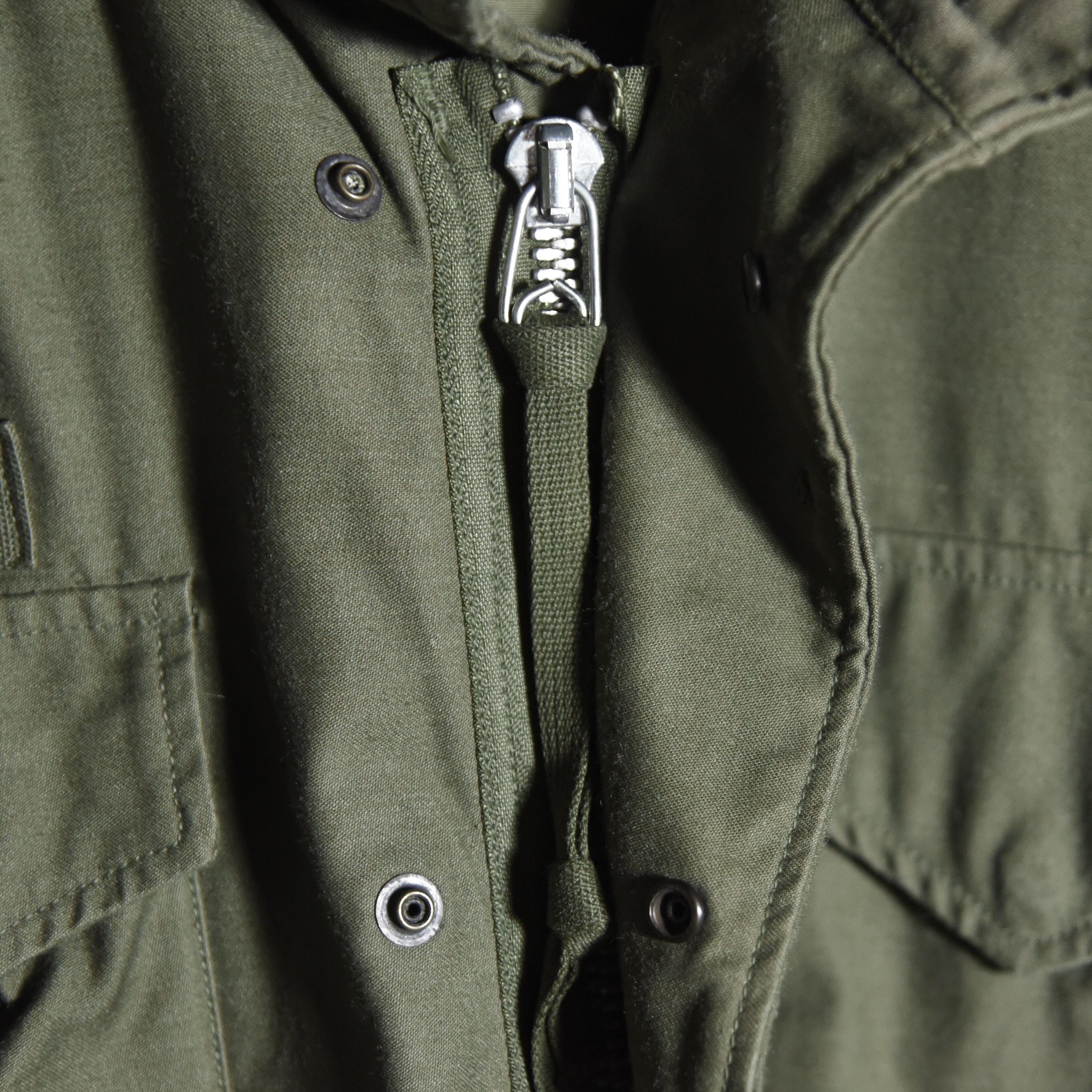ジップはもちろんアルミジッパーで、着込まれたオリーブドラブの色味に鈍く輝くシルバーカラーのジッパーのディテールは非常に魅力的です。