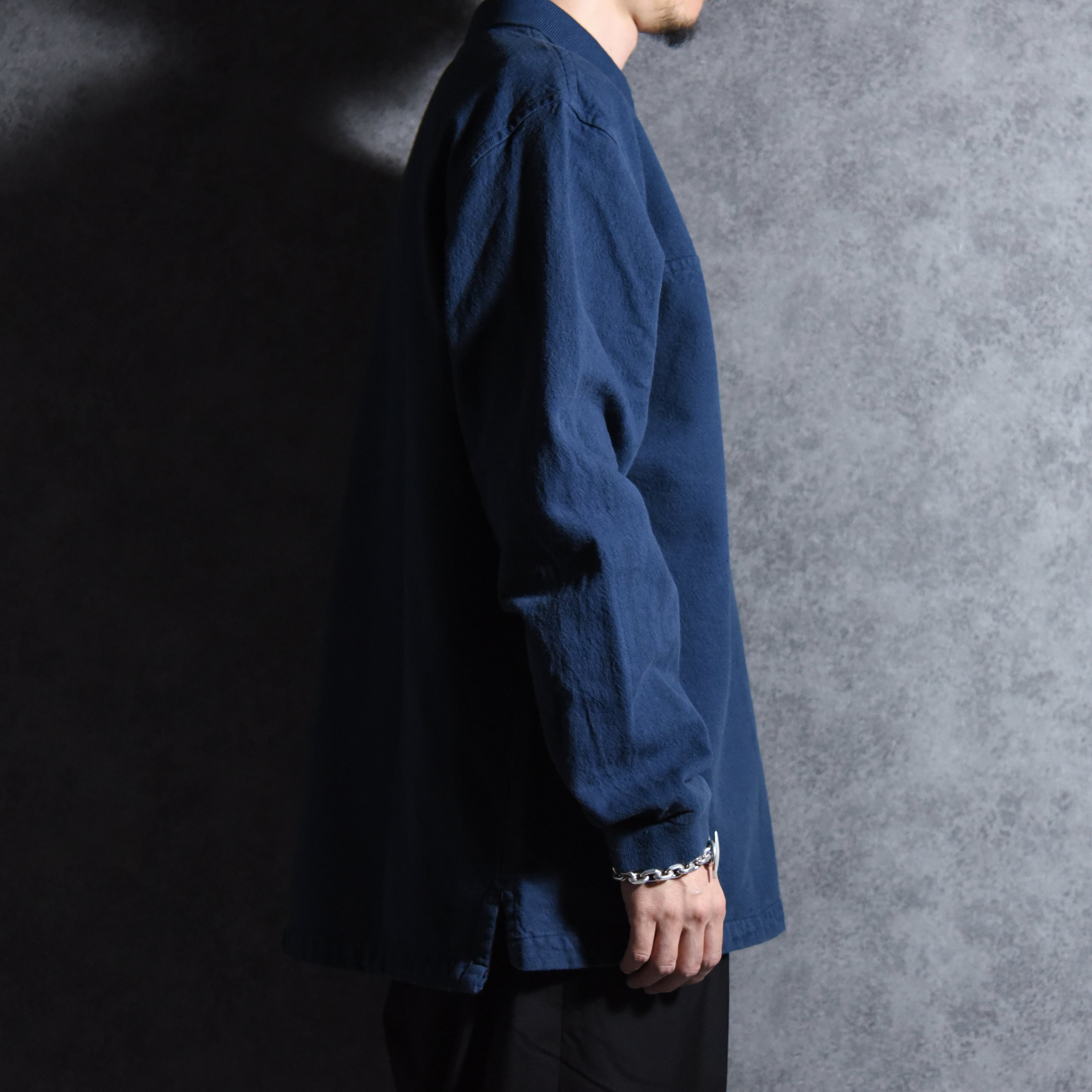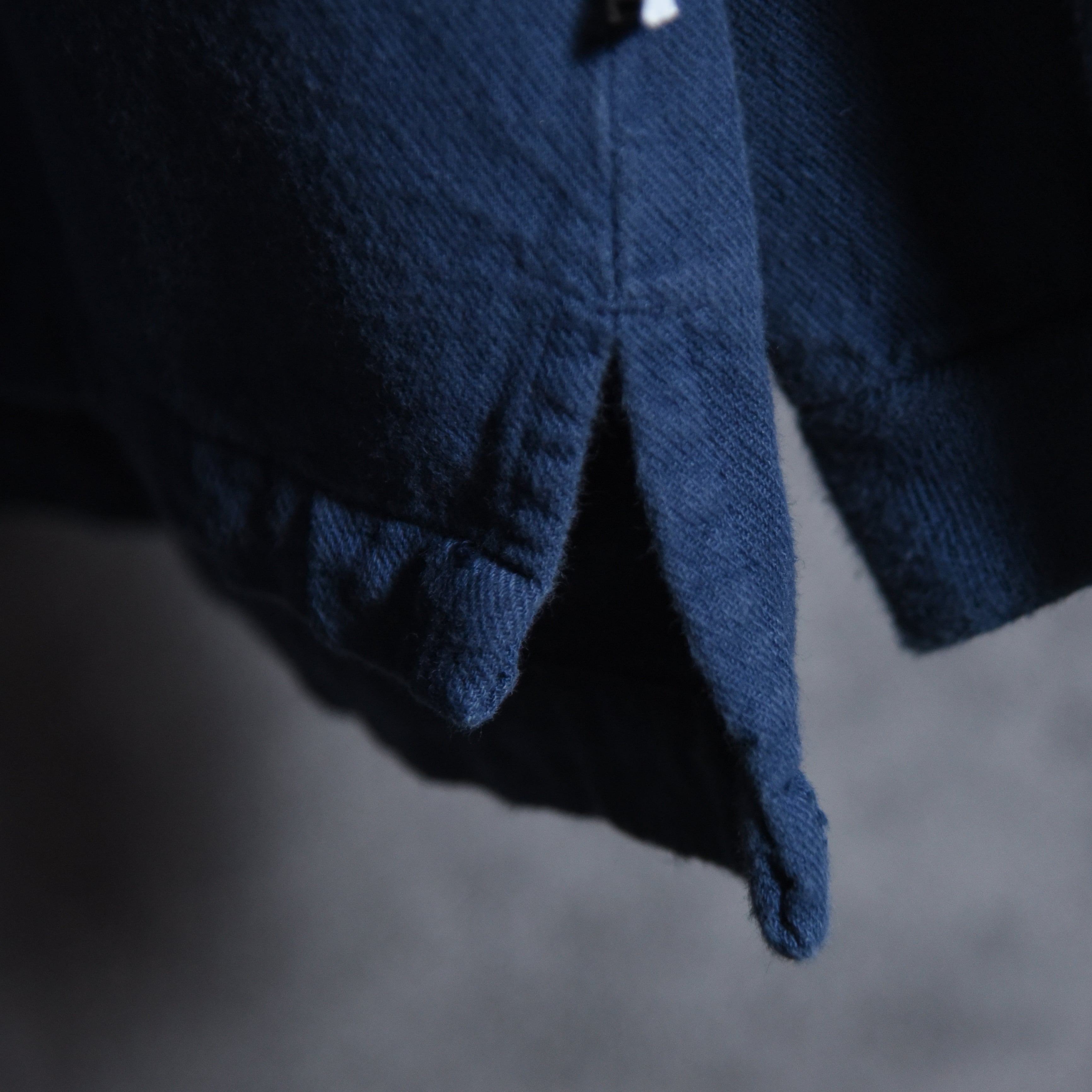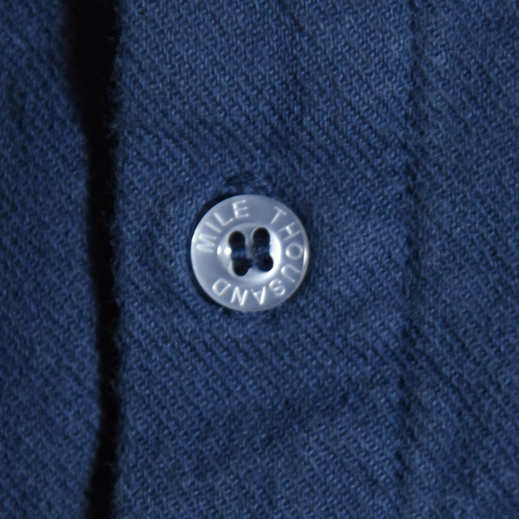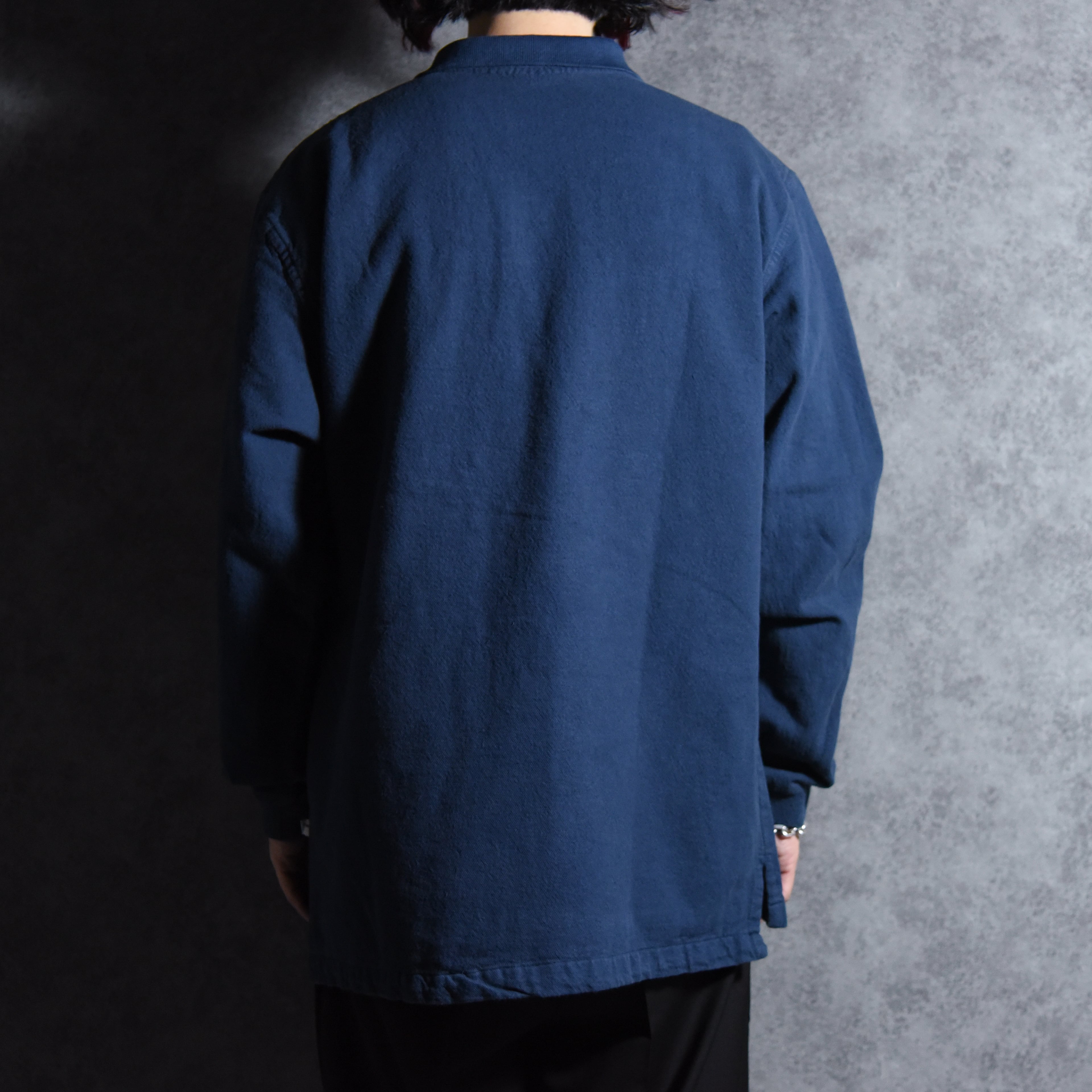 厚手のガシッとした生地感が特徴の布帛素材でワークウェアやミリタリーウェアにみられるタフな雰囲気ながら、ポロシャツのような衿のディテール、スリットなどバランスの良いデザインです。