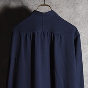 生地の柔らかさとドレープ感を強調させるヨーク下と袖口のギャザー、下から2つのボタンだけを隠した半比翼仕立て、後ろを3cmだけで伸ばしてスリットを入れたスクエアカットの裾など、特徴的なディテールを取り入れつつ、全体のデザインはどんなスタイルにも取り入れやすい、シンプルなレギュラーカラーシャツに仕上げています。
