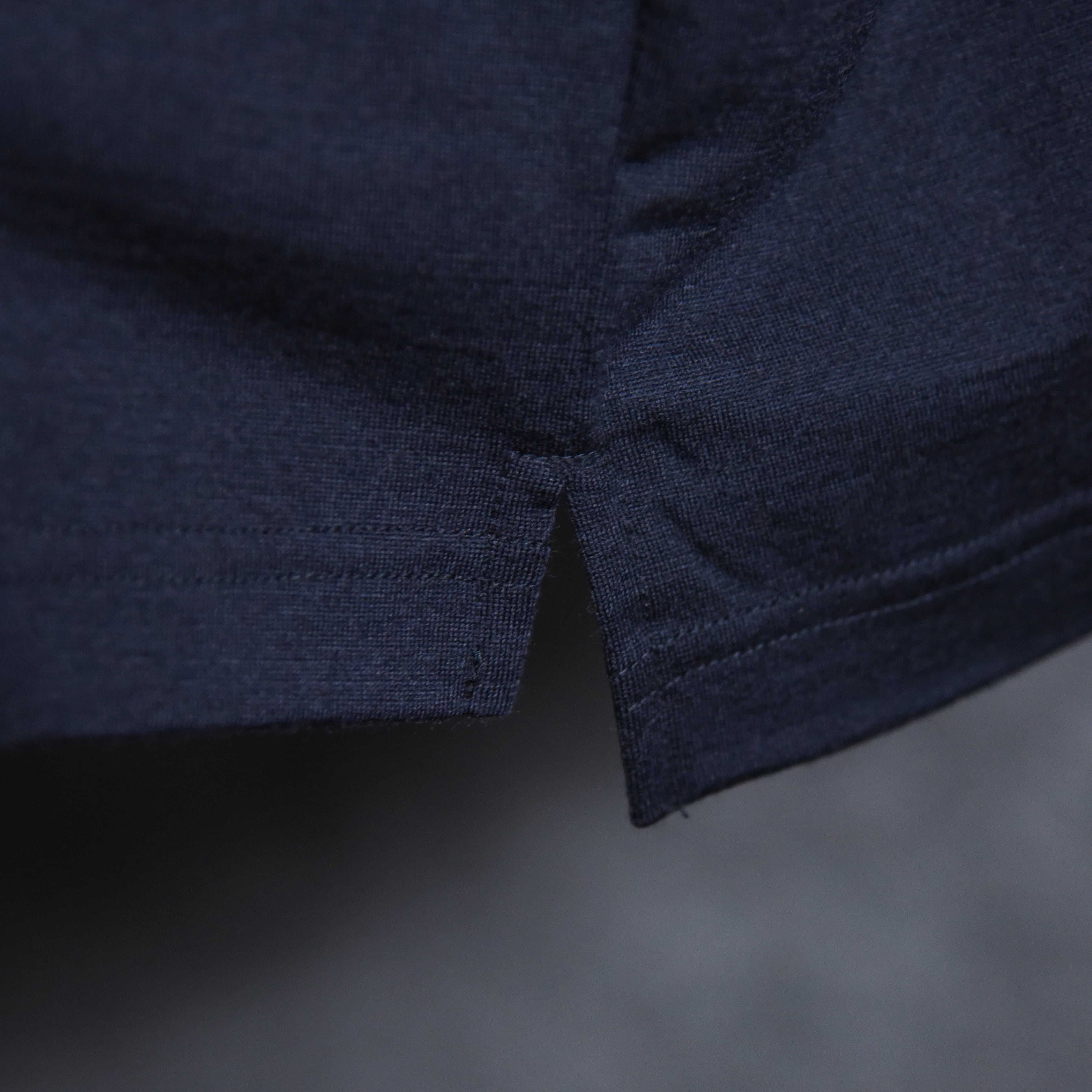 カットソーでは一般的な縫製仕様ですが、サンプル段階で何種類もの縫い方を試し、ミシンの速度を落とすなど生産効率を度返しして、柔らかいウール地の風合いを活かしつつ、最も綺麗に縫える方法が追及されています。